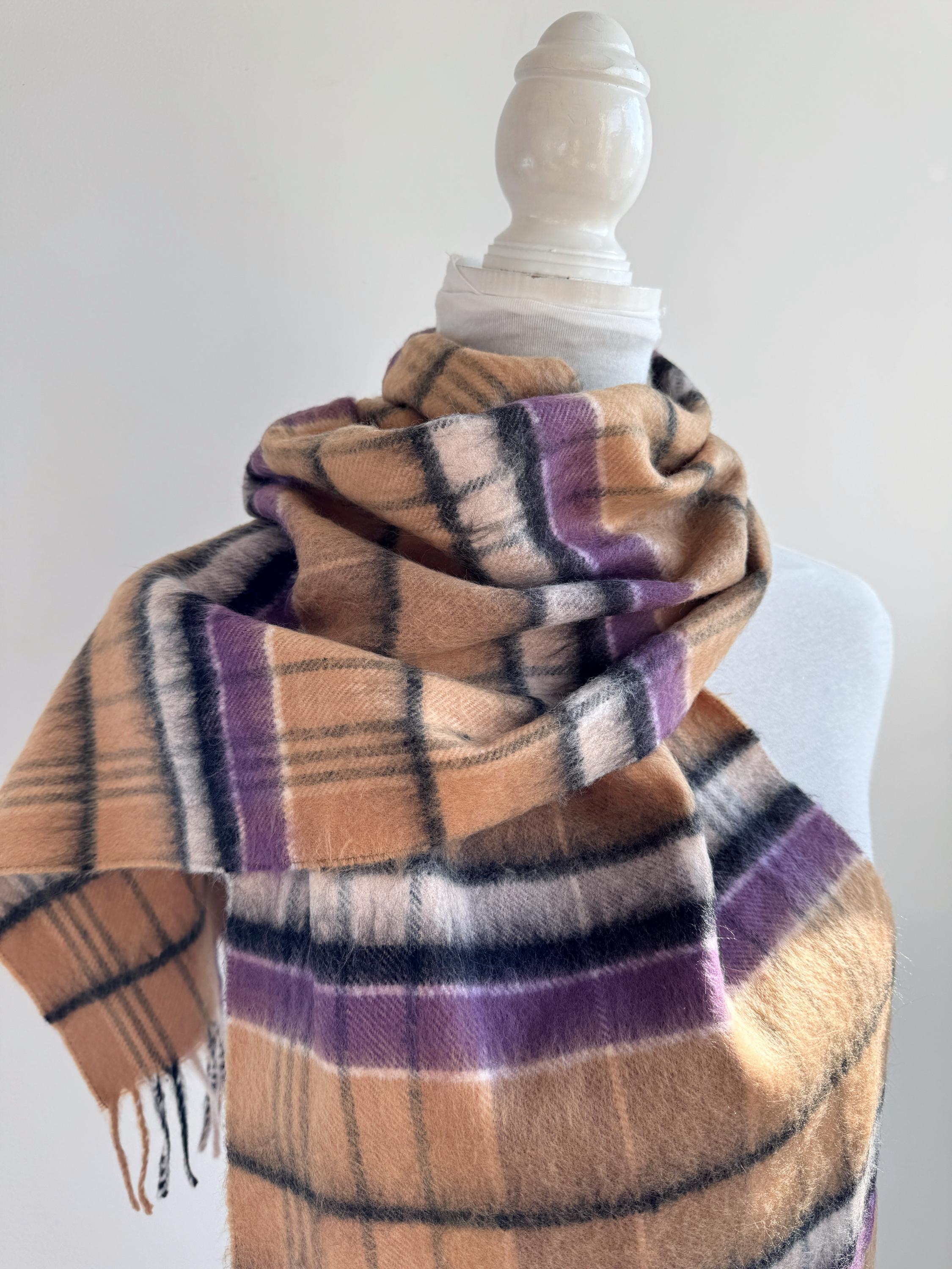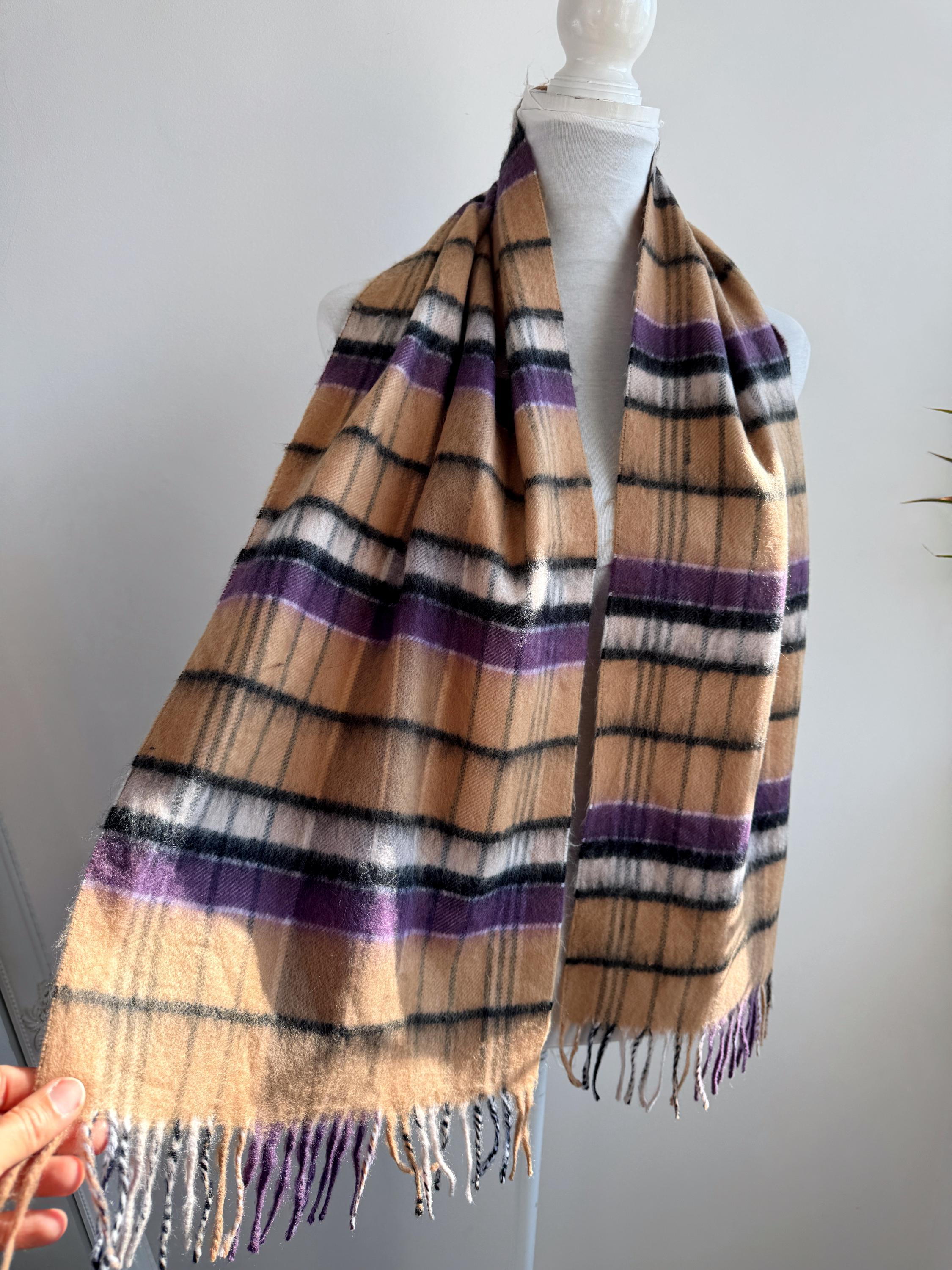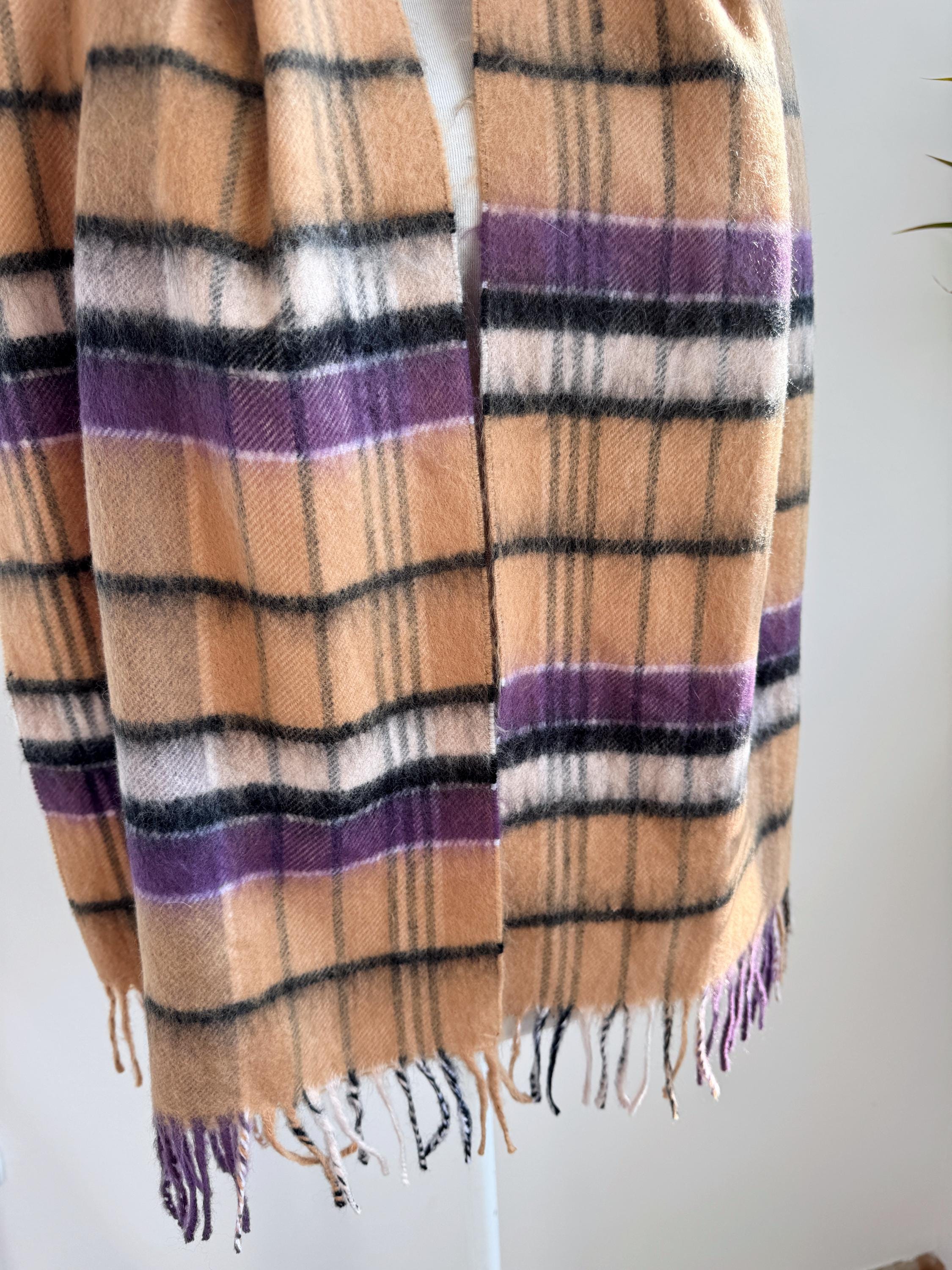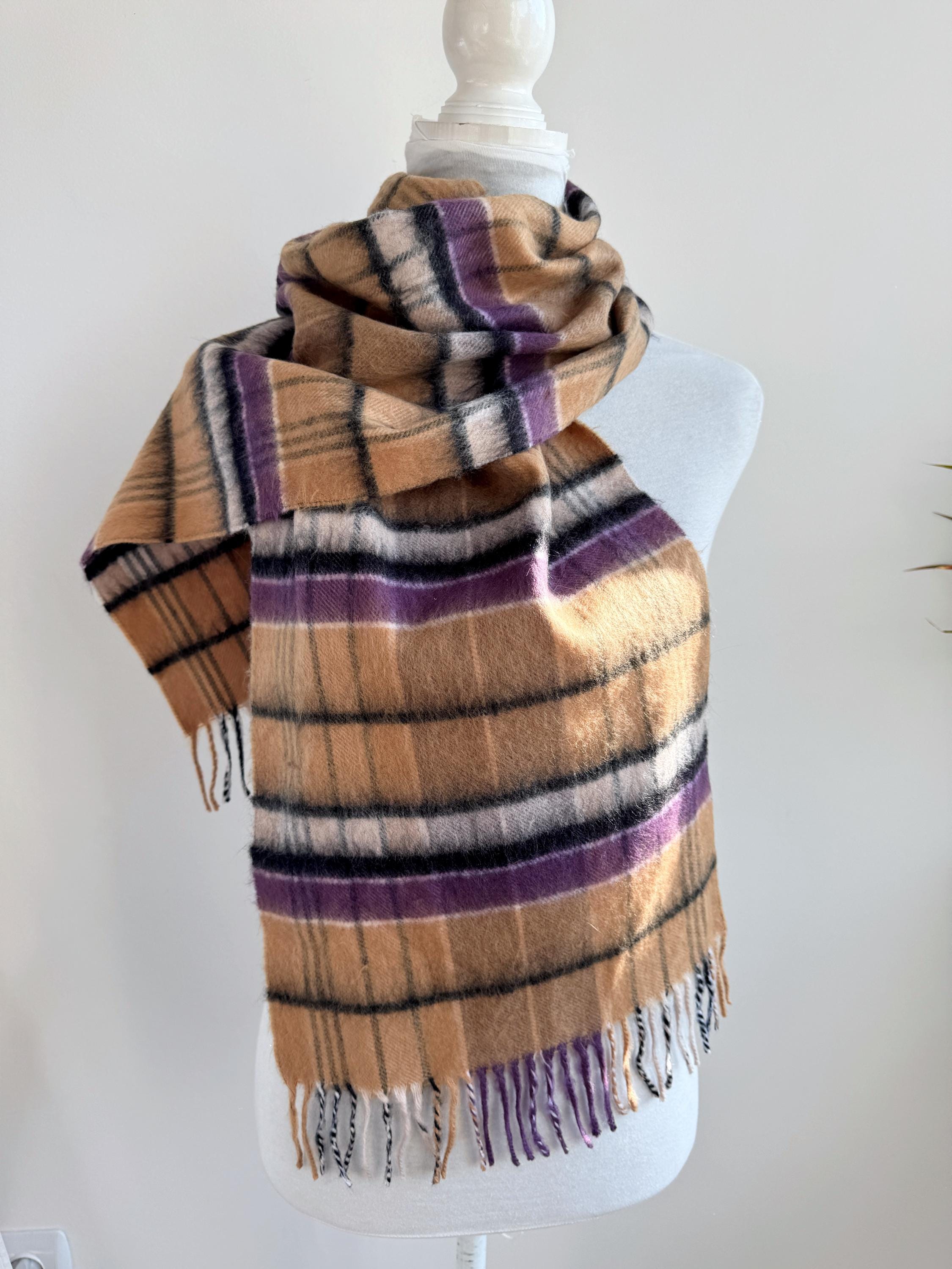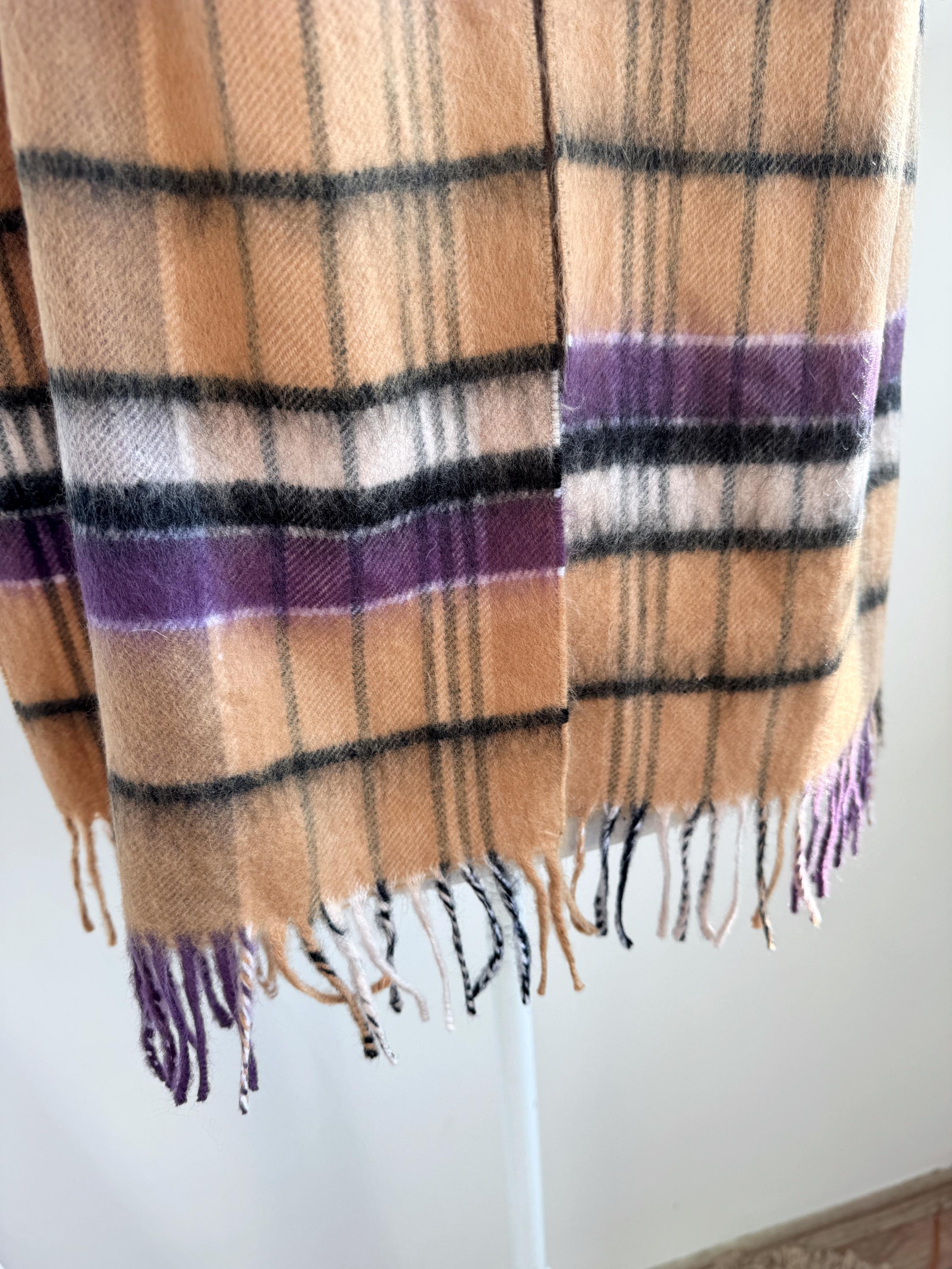 This is a vintage 90s soft acrylic wool unisex scarf in shades of camel beige, white, purple and black. This soft cozy warm winter scarf is suitable for both men and women with its unisex tartan print. This plaid scarf has a simple minimalist print. It will keep you warm and cozy during the cold days. Beautiful vintage gift for the fall and winter season.