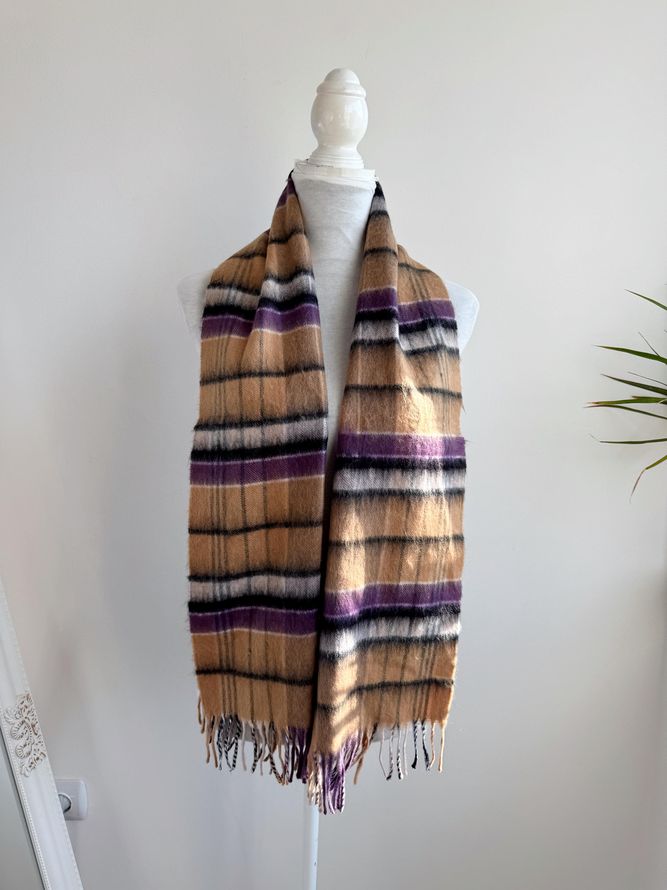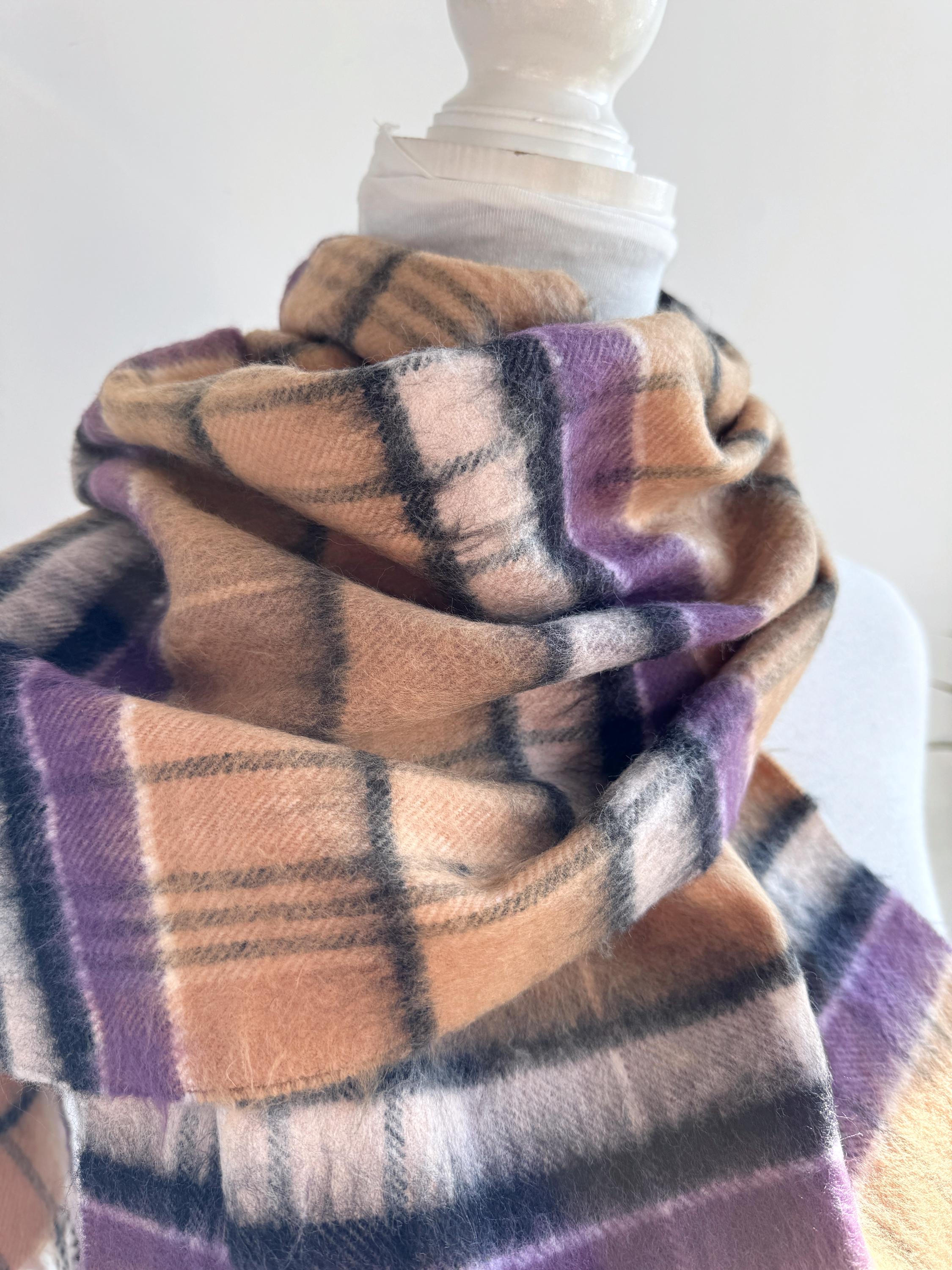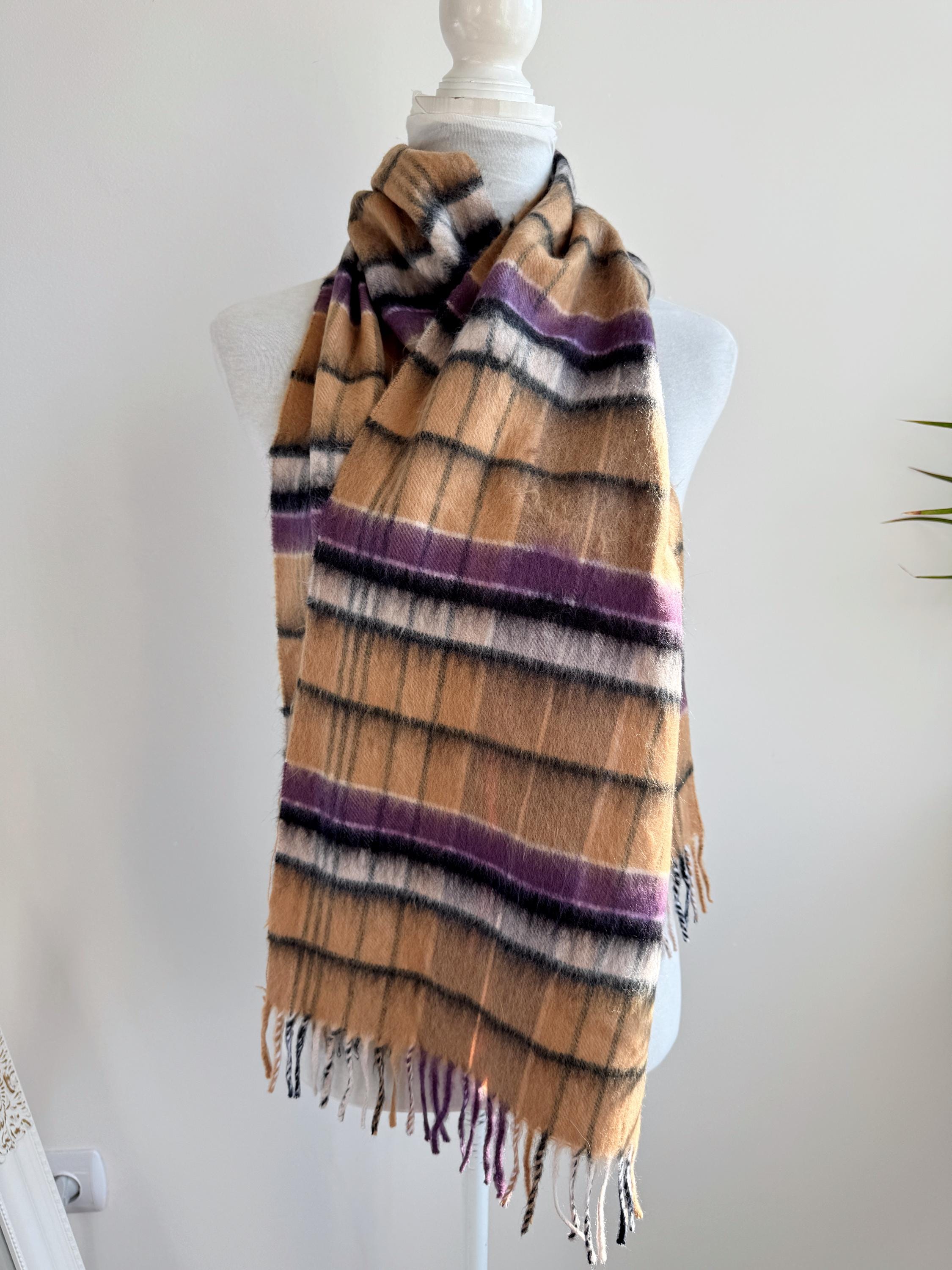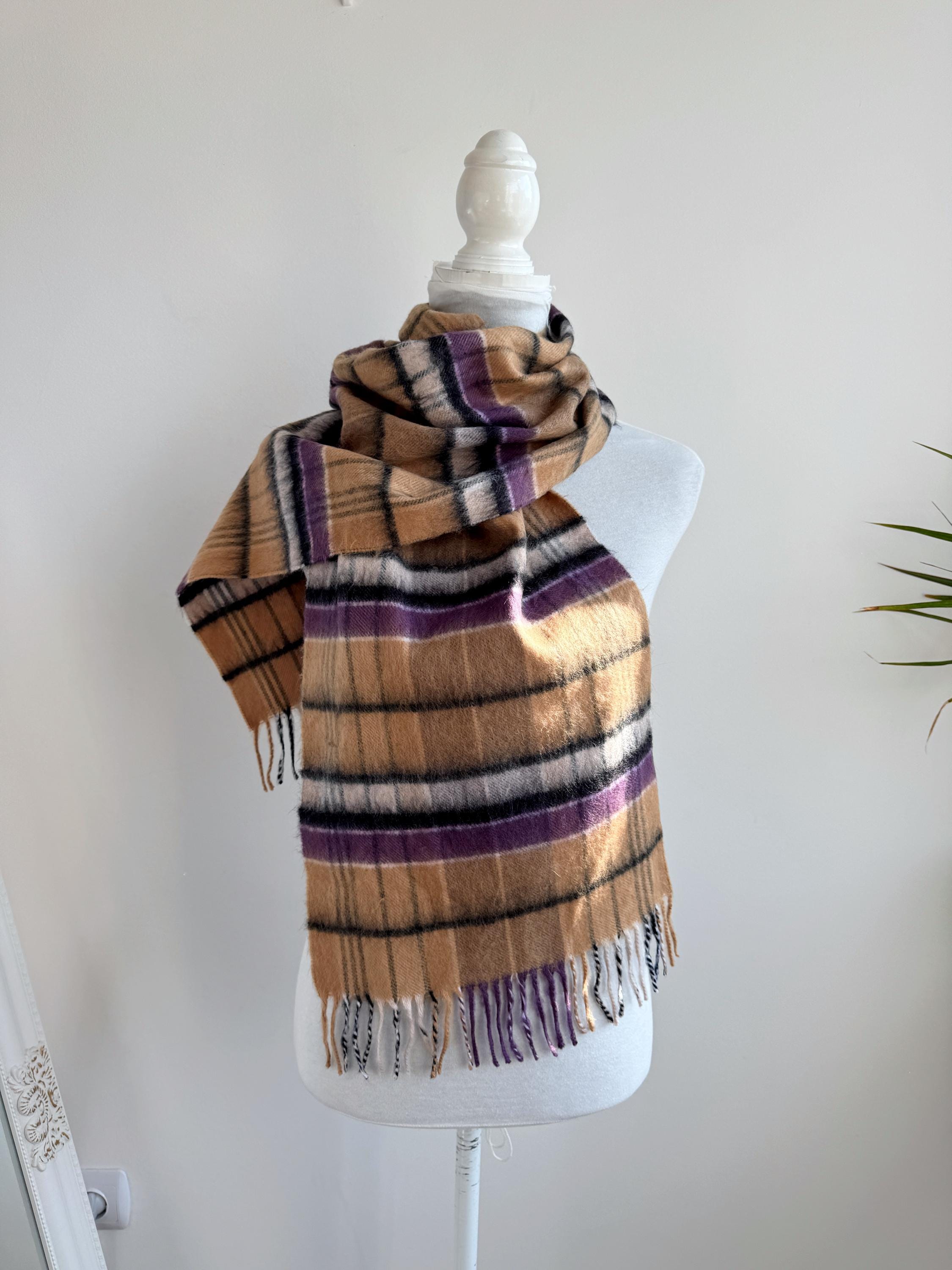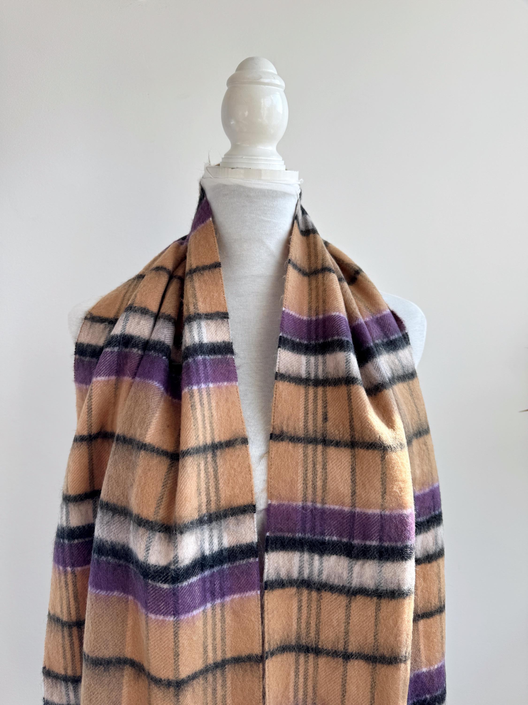 This is a vintage 90s soft acrylic wool unisex scarf in shades of camel beige, white, purple and black. This soft cozy warm winter scarf is suitable for both men and women with its unisex tartan print. This plaid scarf has a simple minimalist print. It will keep you warm and cozy during the cold days. Beautiful vintage gift for the fall and winter season.