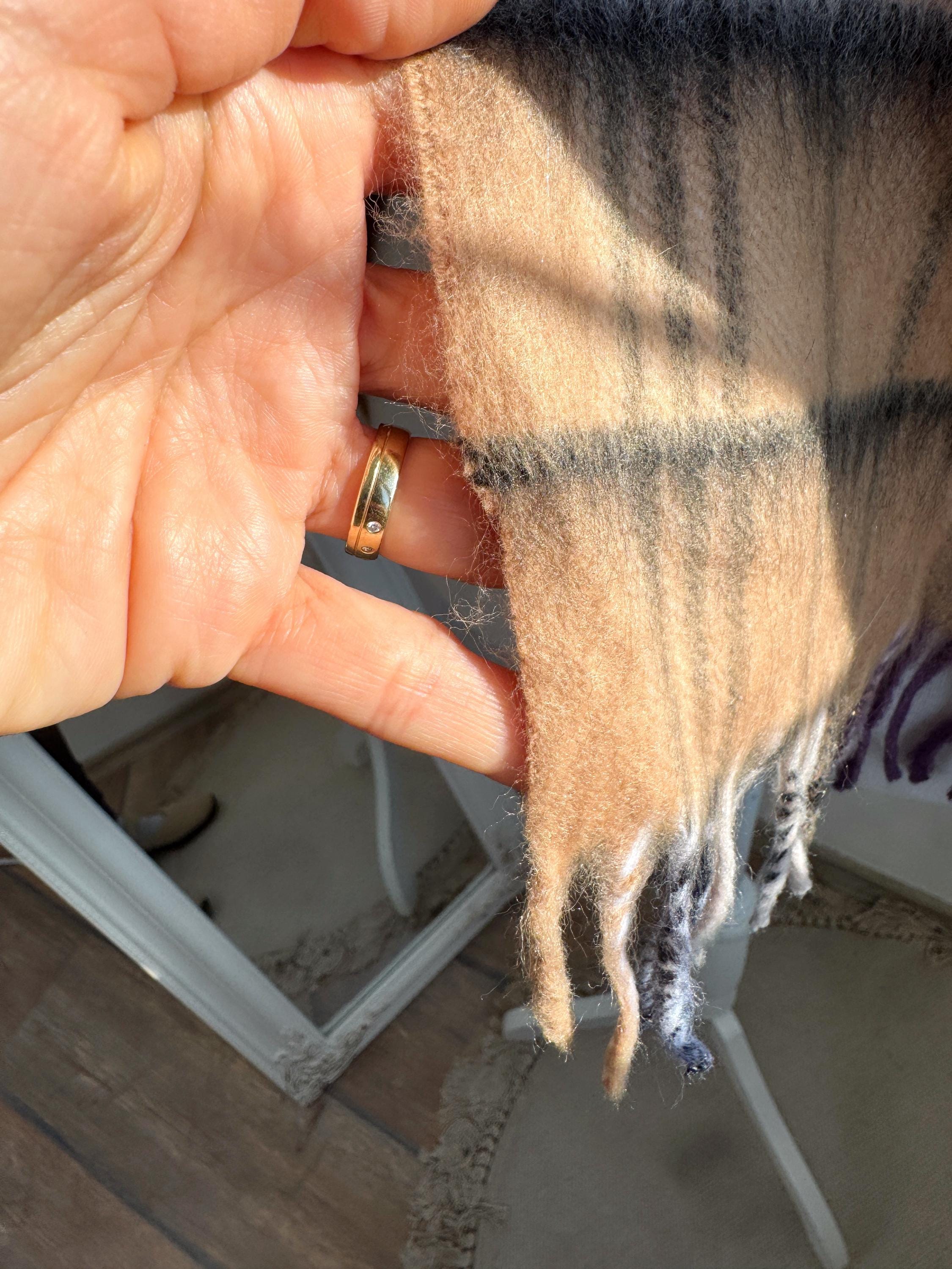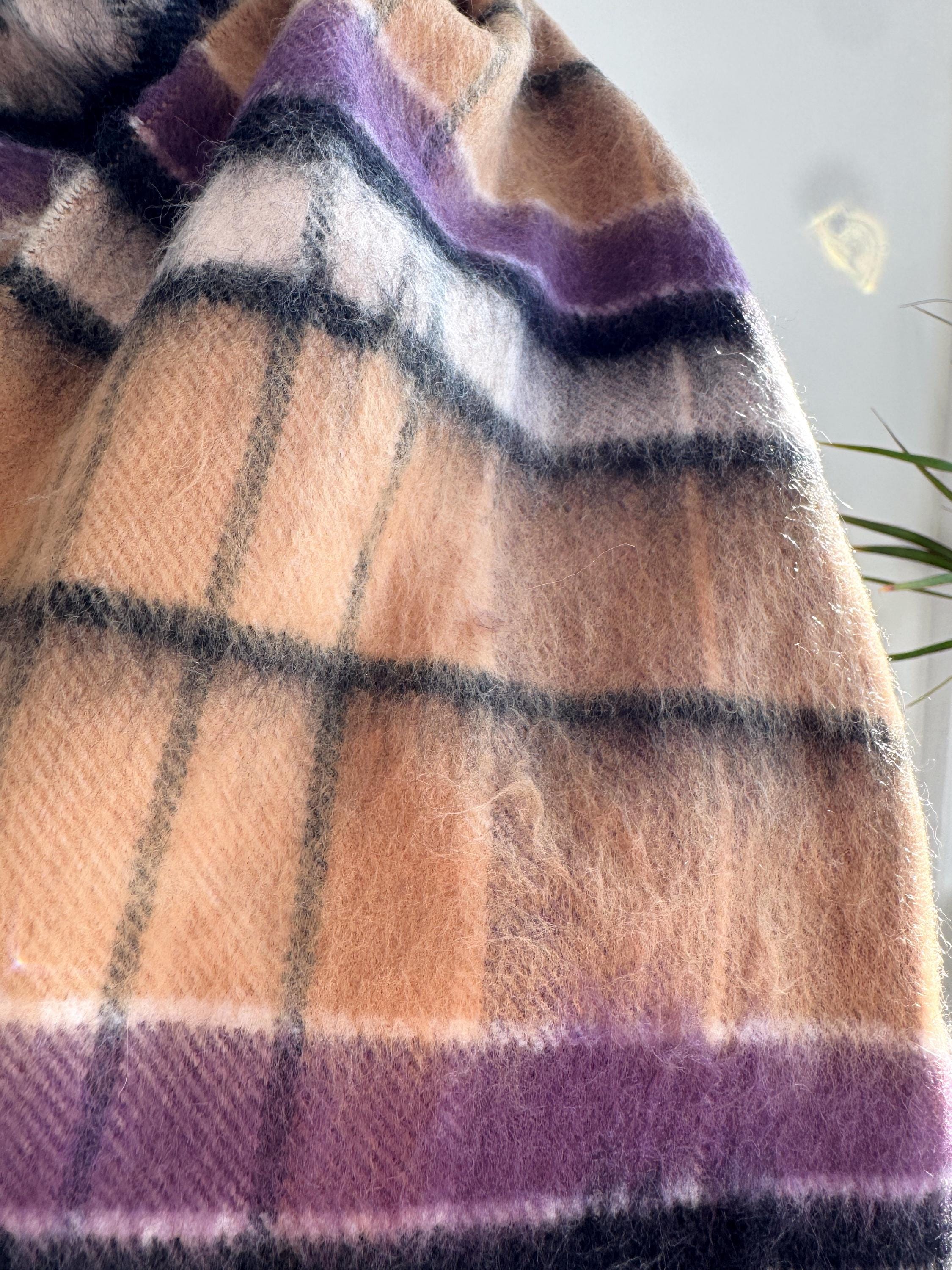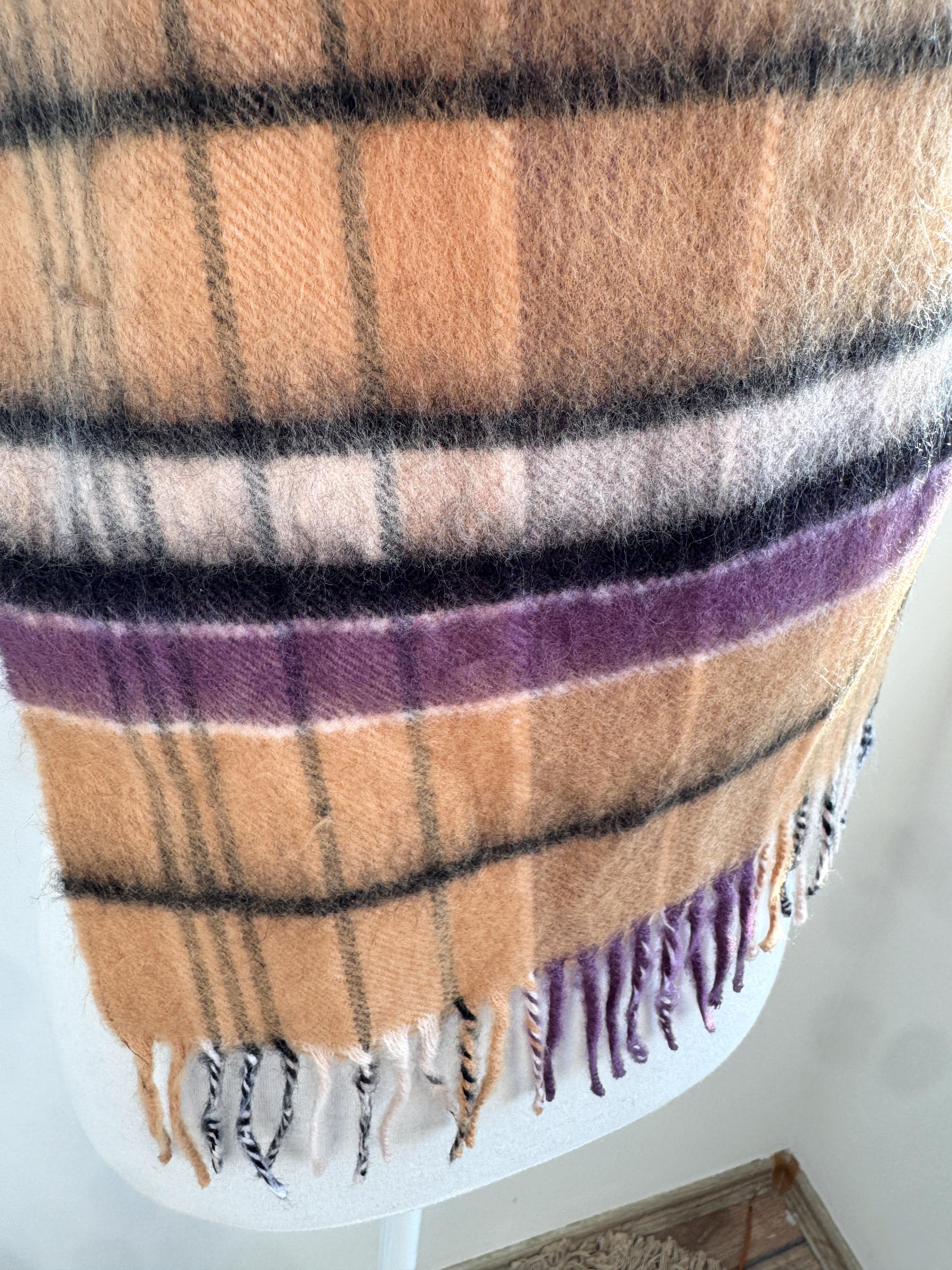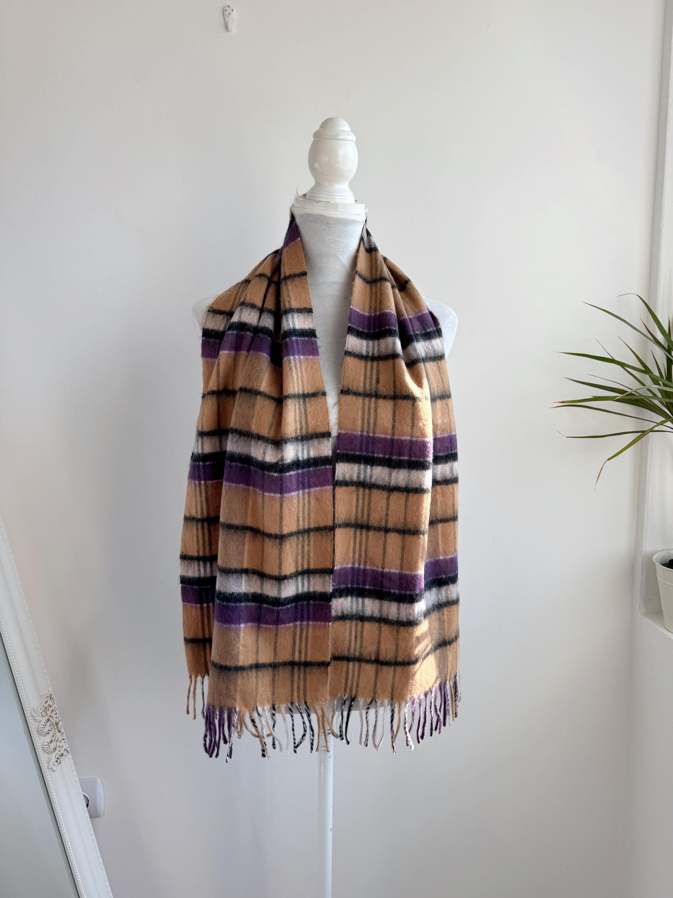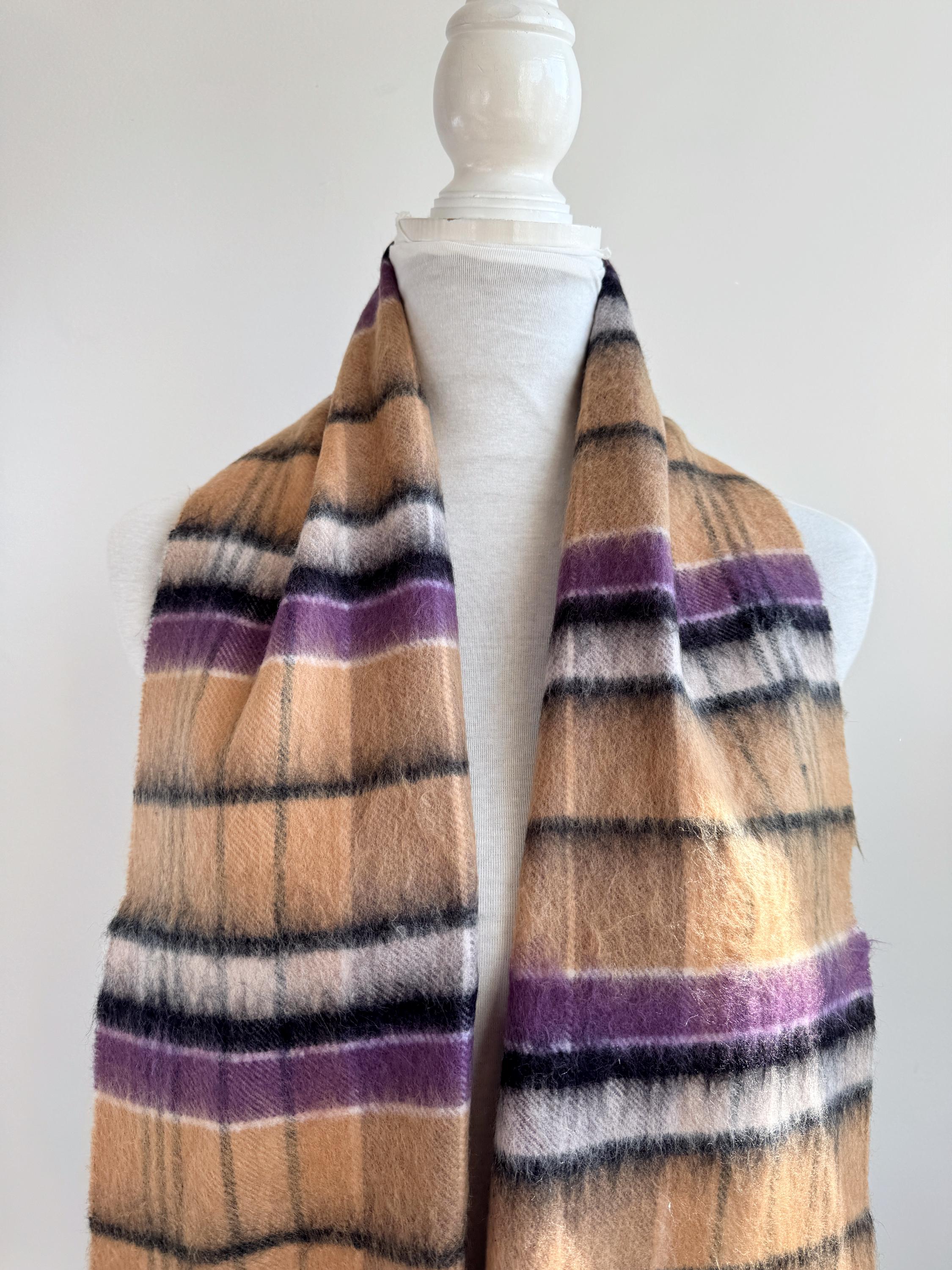 This is a vintage 90s soft acrylic wool unisex scarf in shades of camel beige, white, purple and black. This soft cozy warm winter scarf is suitable for both men and women with its unisex tartan print. This plaid scarf has a simple minimalist print. It will keep you warm and cozy during the cold days. Beautiful vintage gift for the fall and winter season.