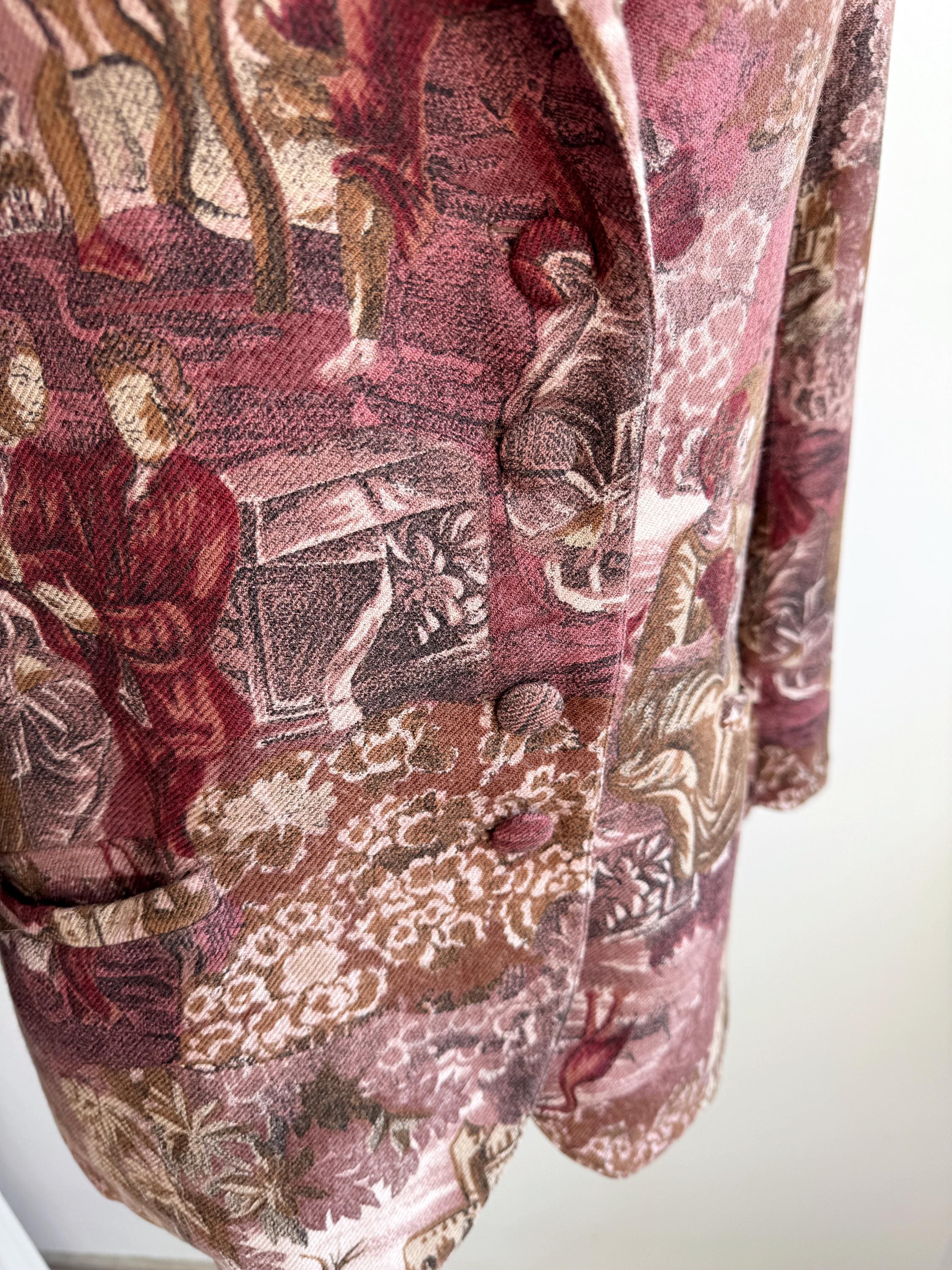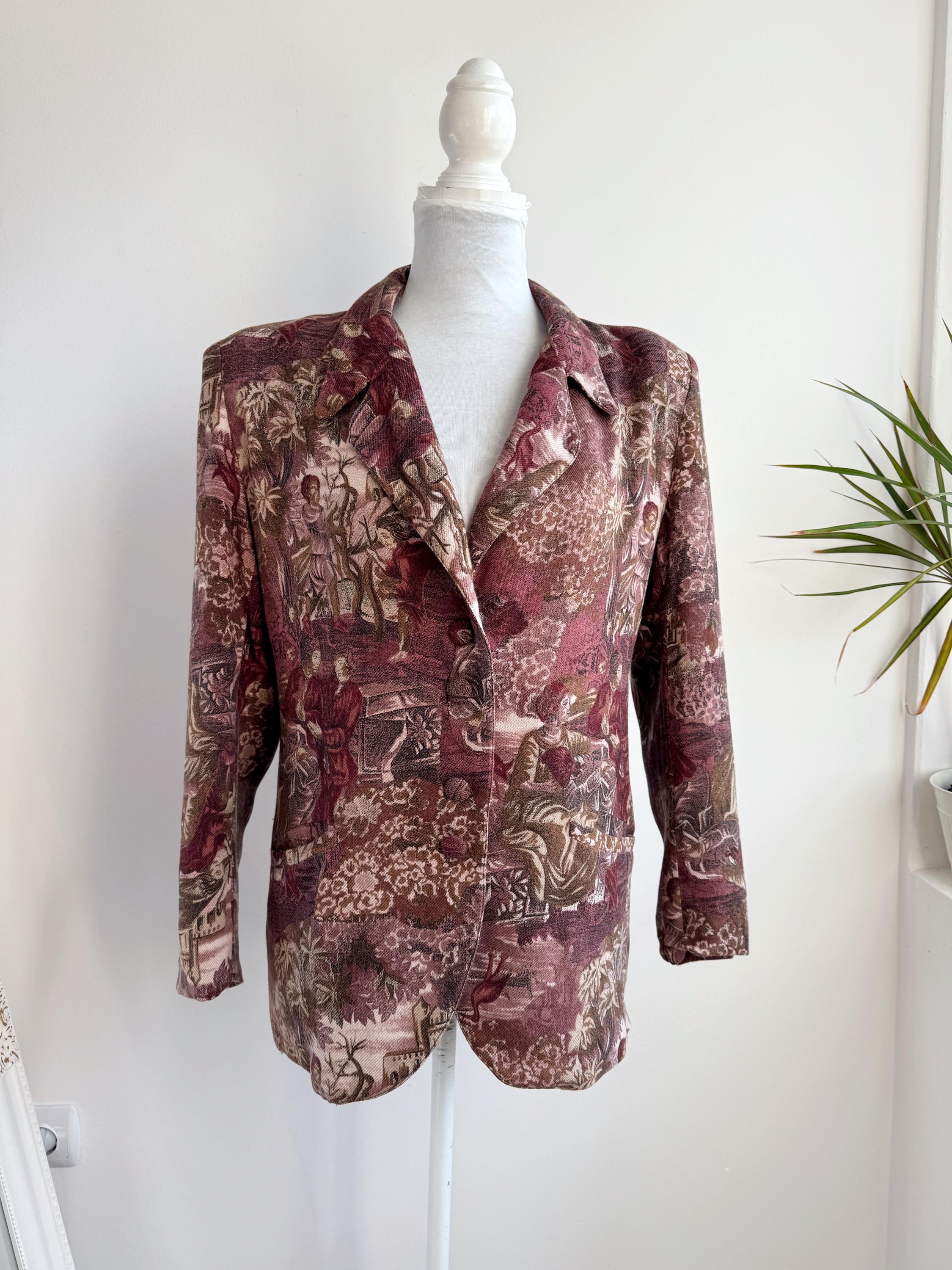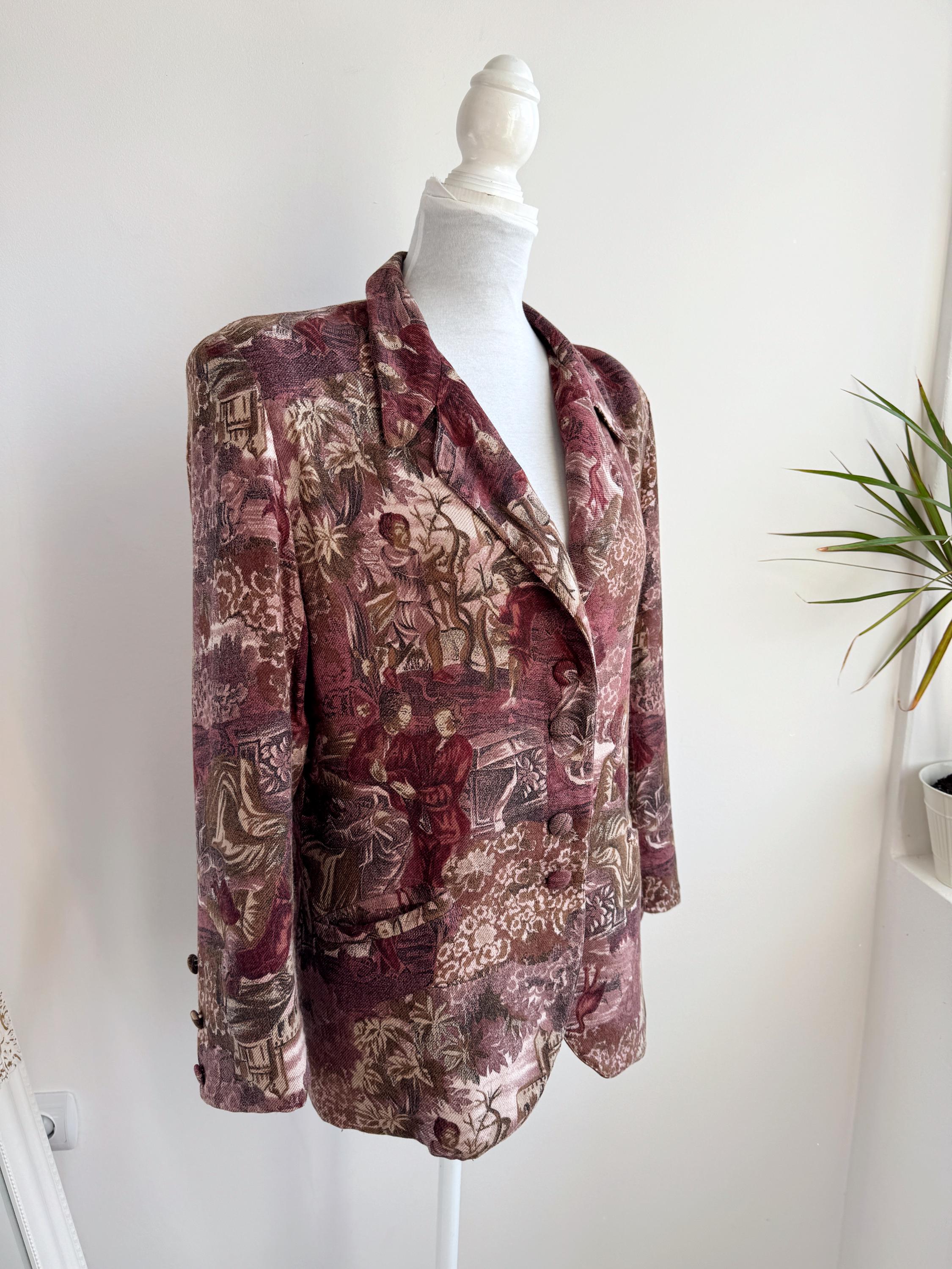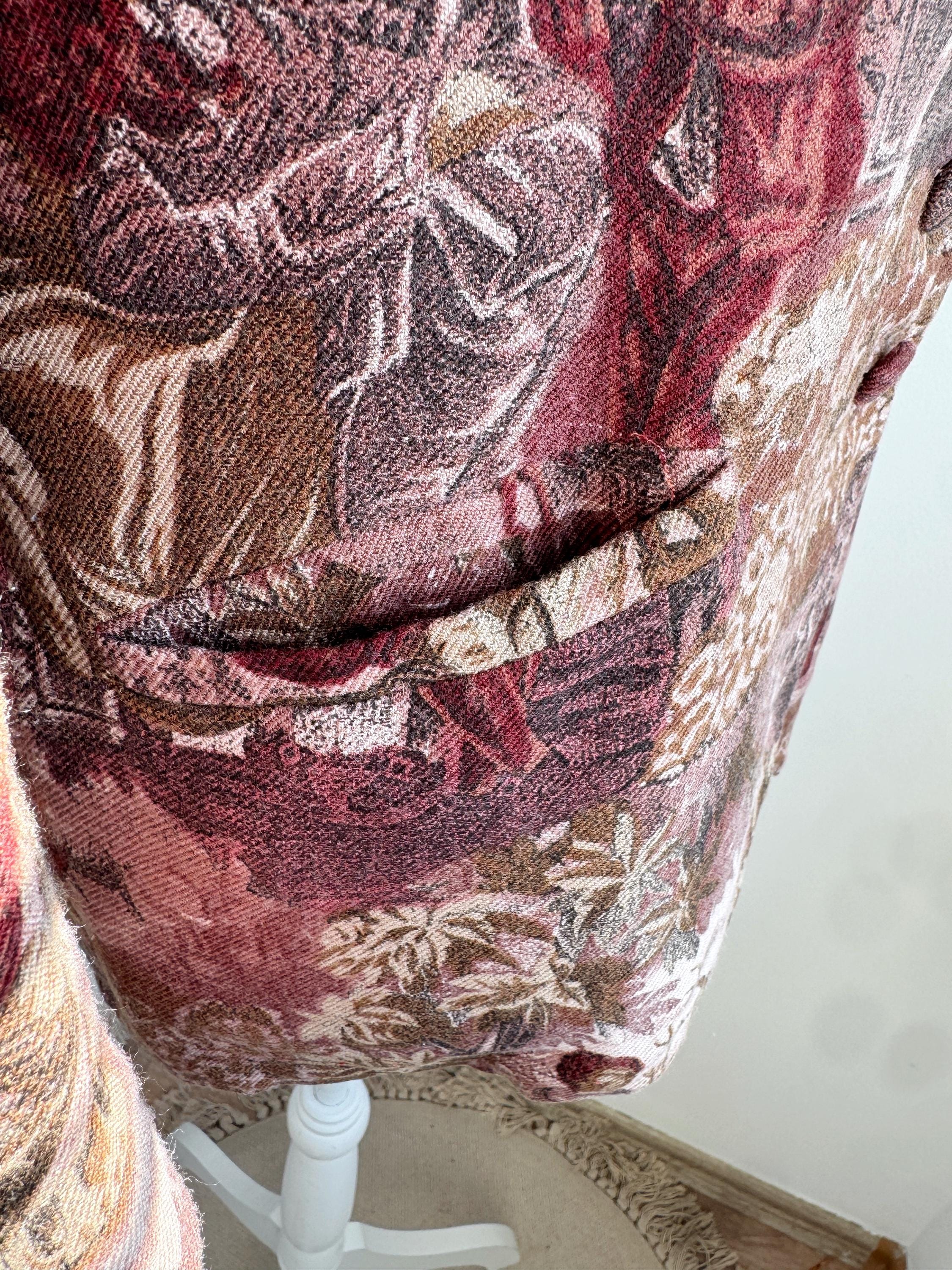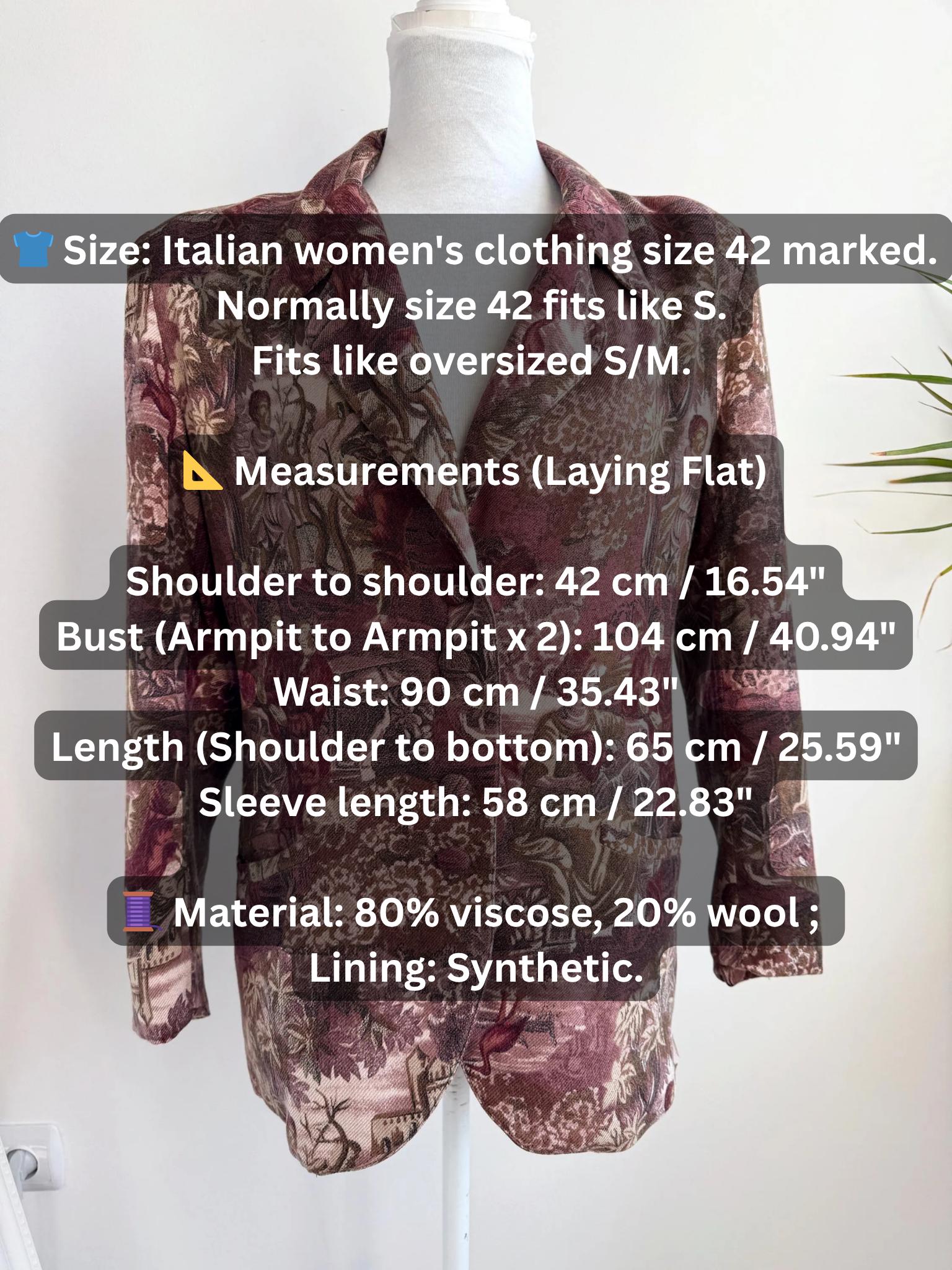 Vintage 90s Italian tapestry blazer with floral garden pastoral scene in shades of burgundy, pink, beige and brown. This gobelin blazer is made of 80% viscose and 20% wool fabric with synthetic lining. It has two pockets. Italian women's clothing size 42 is marked, 42 normally fits like S, however this blazer has an oversized fit. Please check the measurements below.