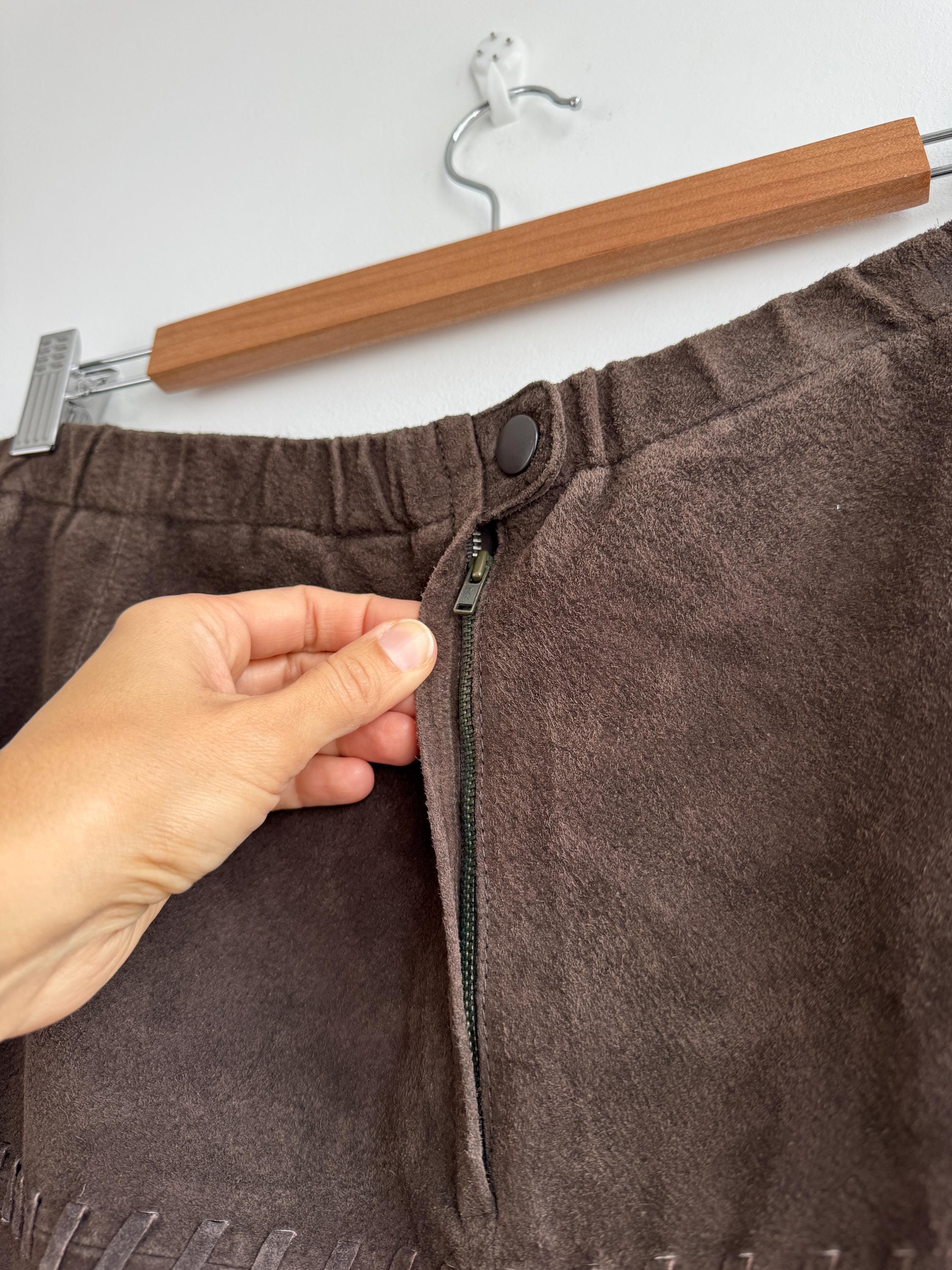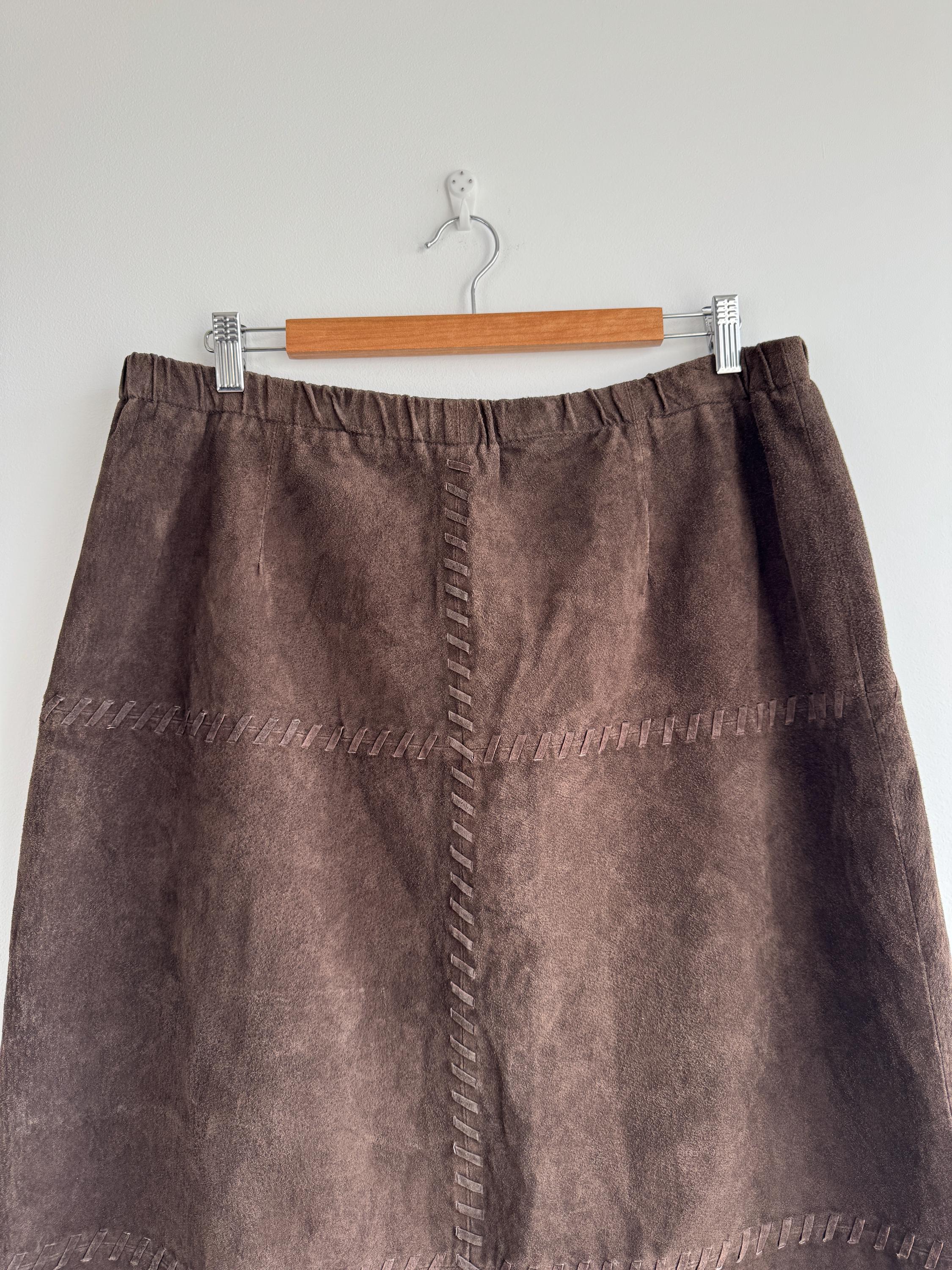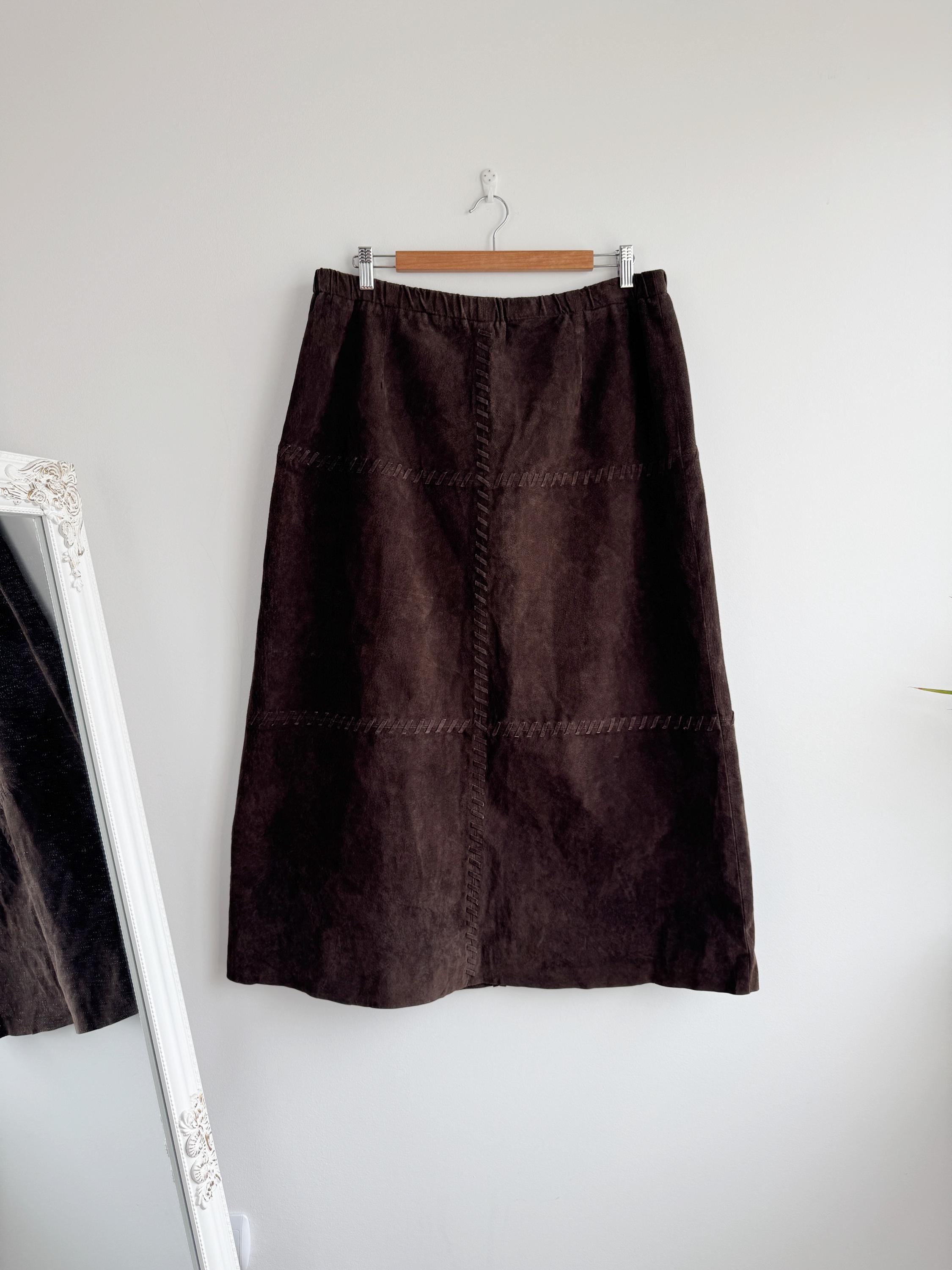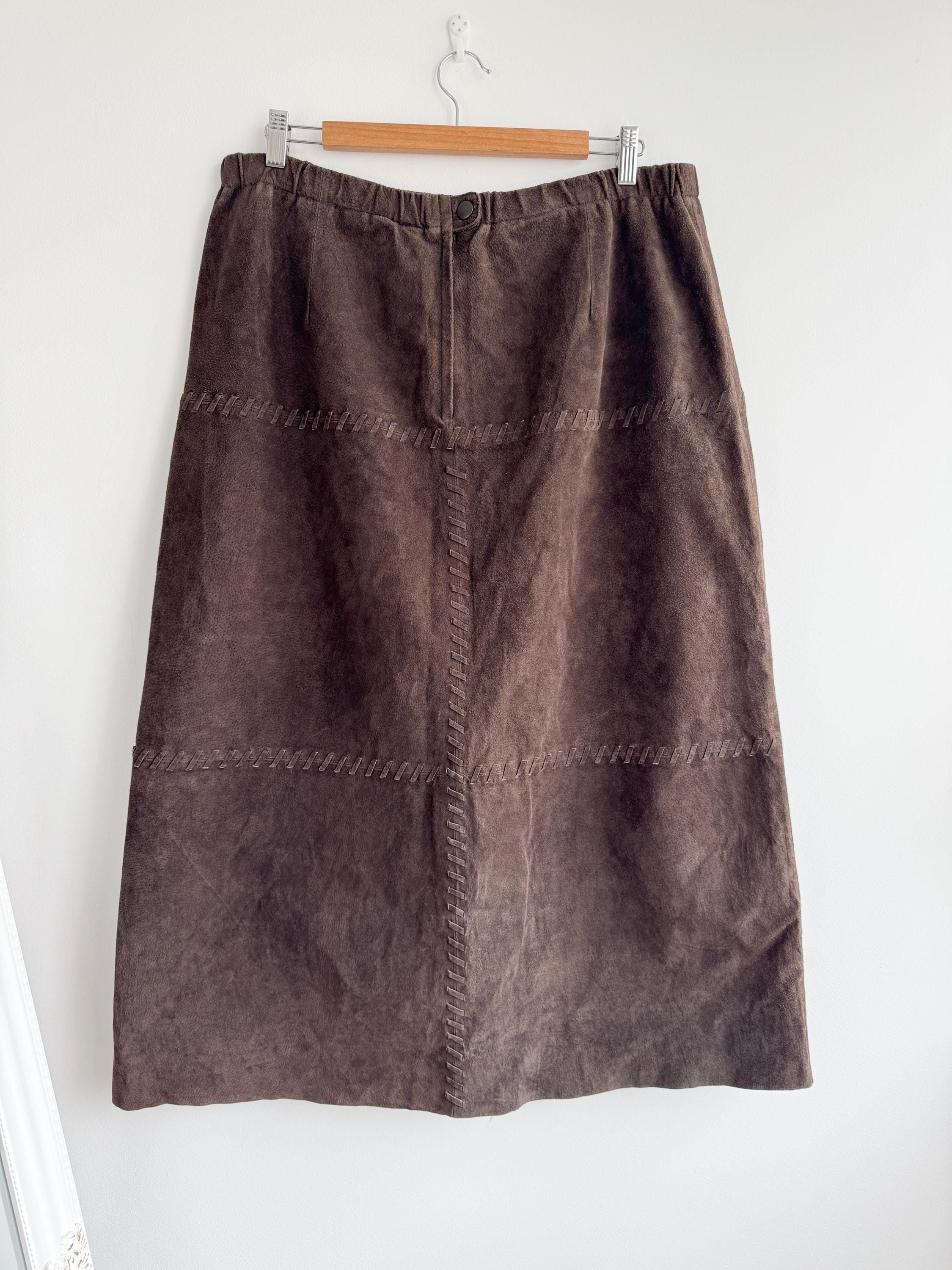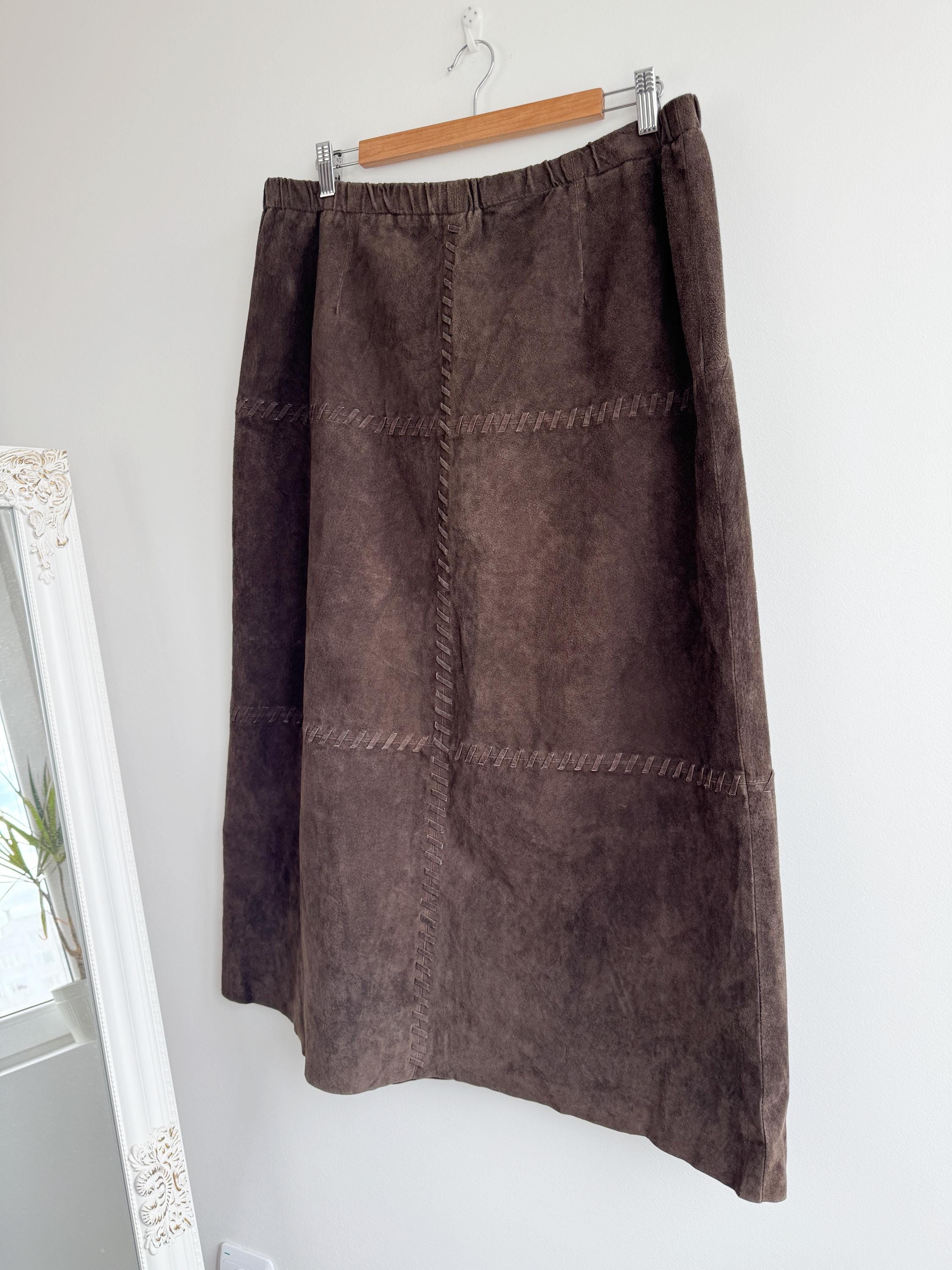 Lovely brown suede leather midaxi skirt by the Sweedish designer Jytte Meilvang in size L. This real leather patchrowk skirt has long midi length, elastic waistline and back zip and snap buttin closure with acetate lining underneath.