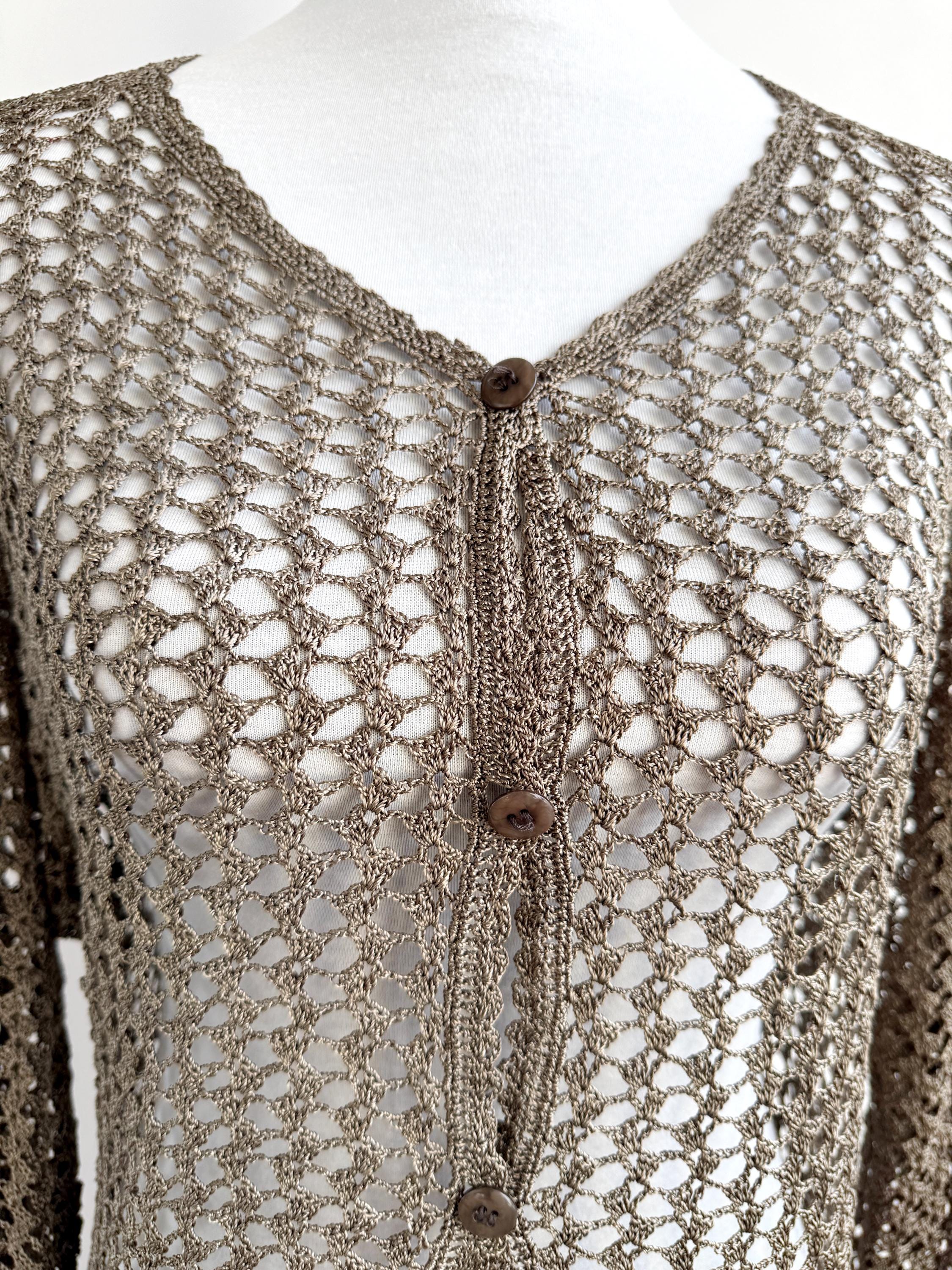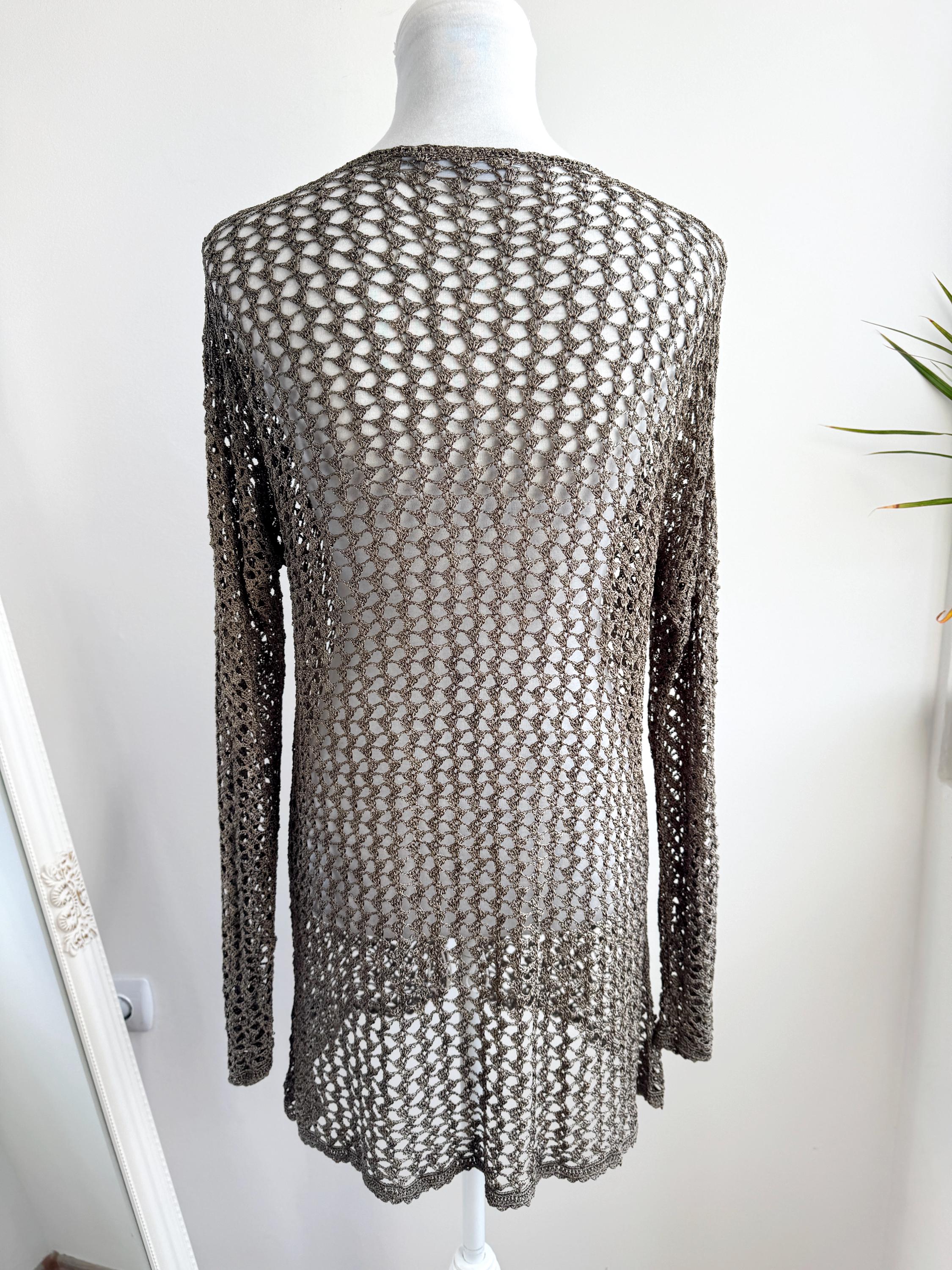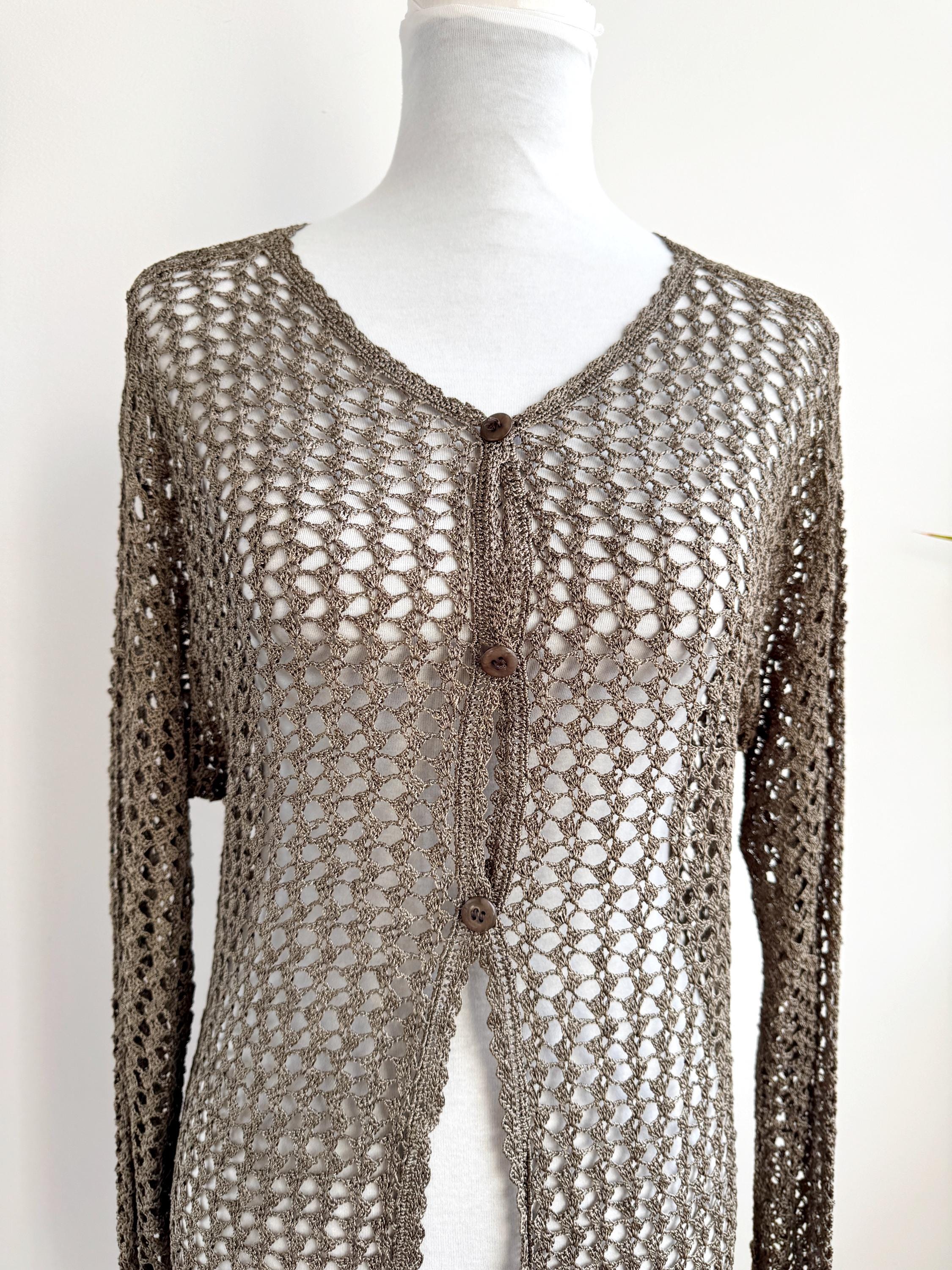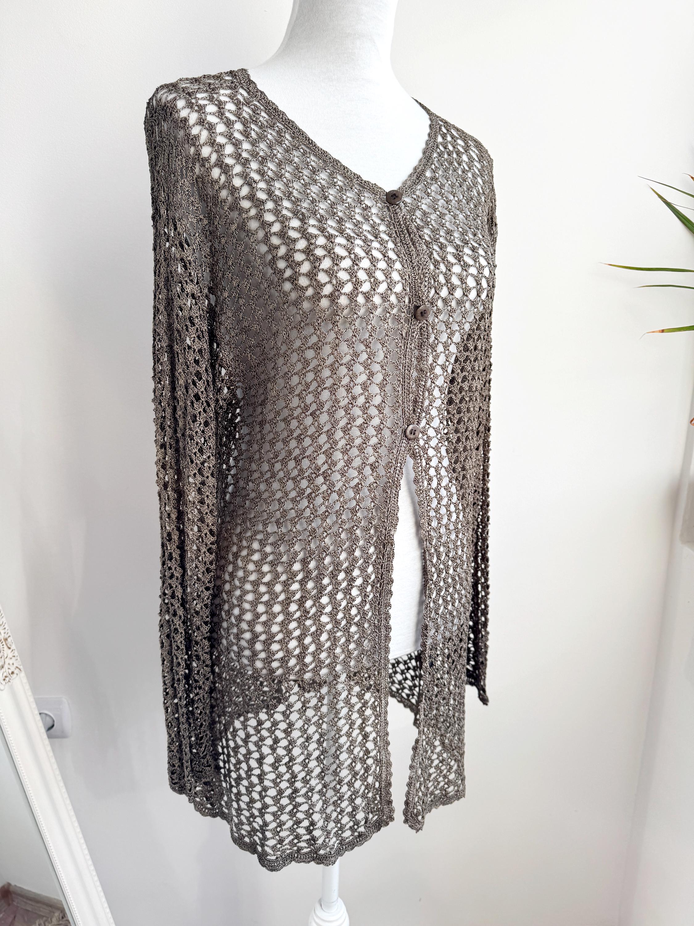 Beautiful vintage Y2K khaki crochet carding with long sleeves and button front closure by Millenium size XL made of 100% viscose fabric with beautiful silky shine.