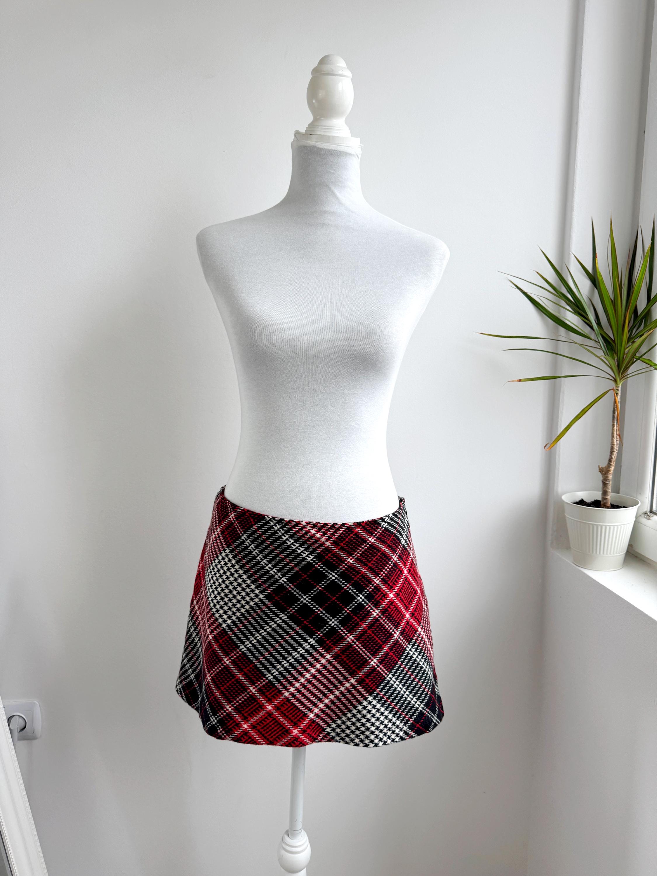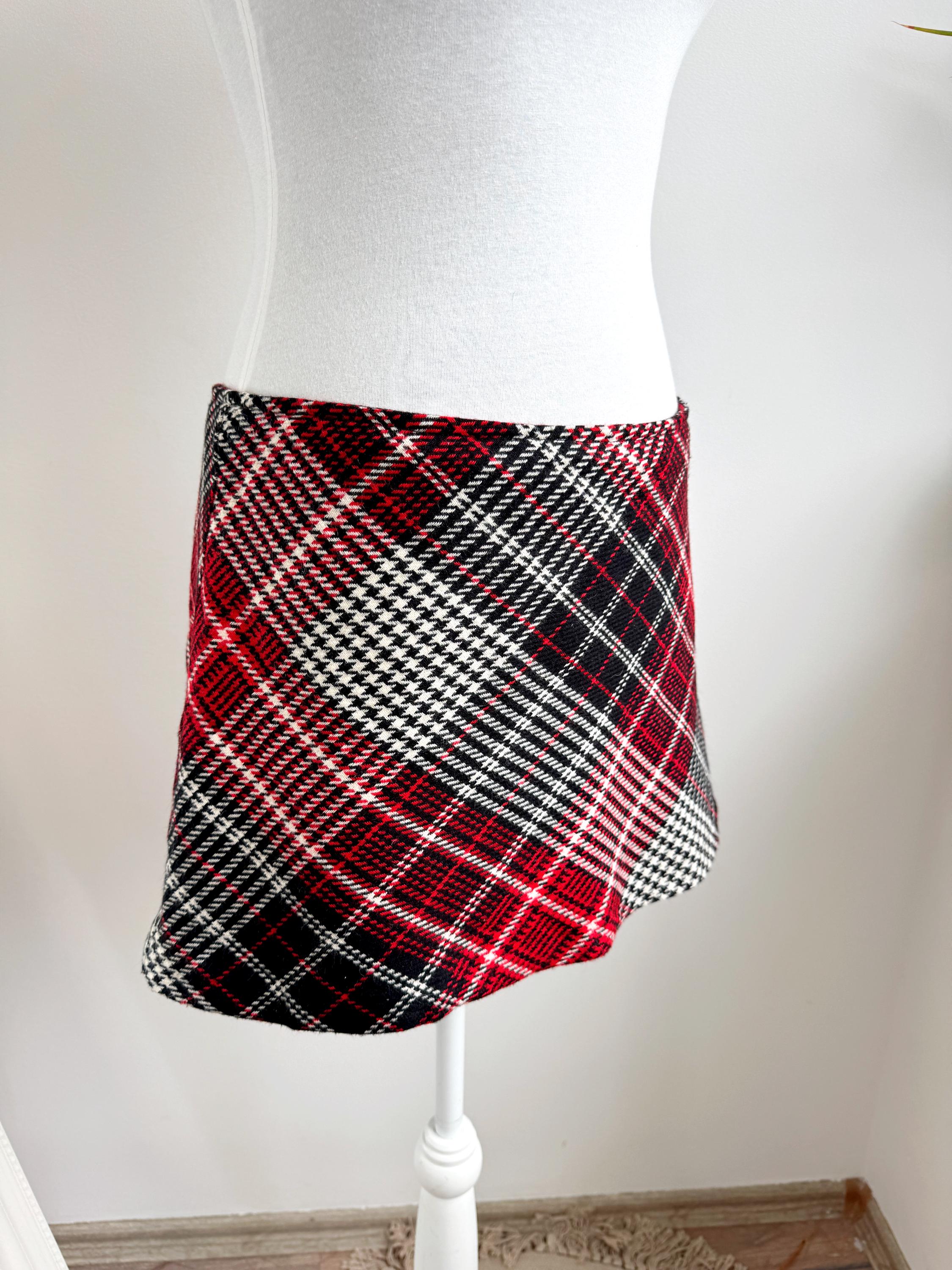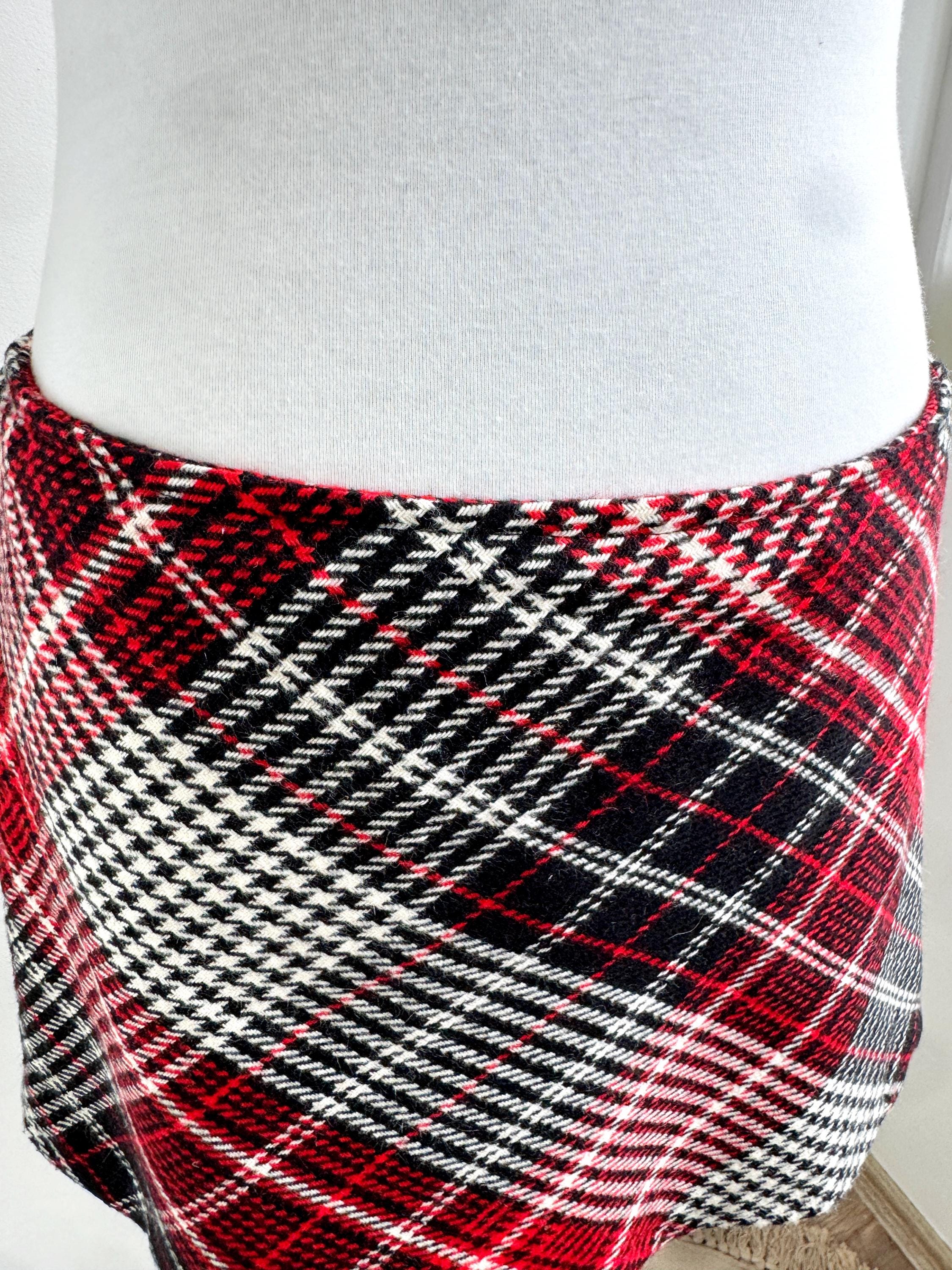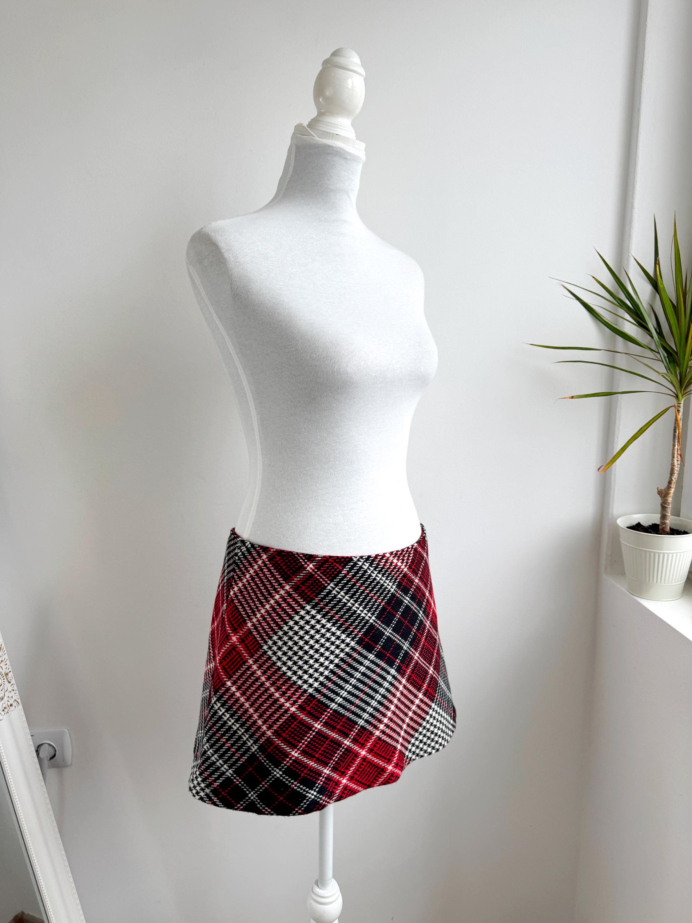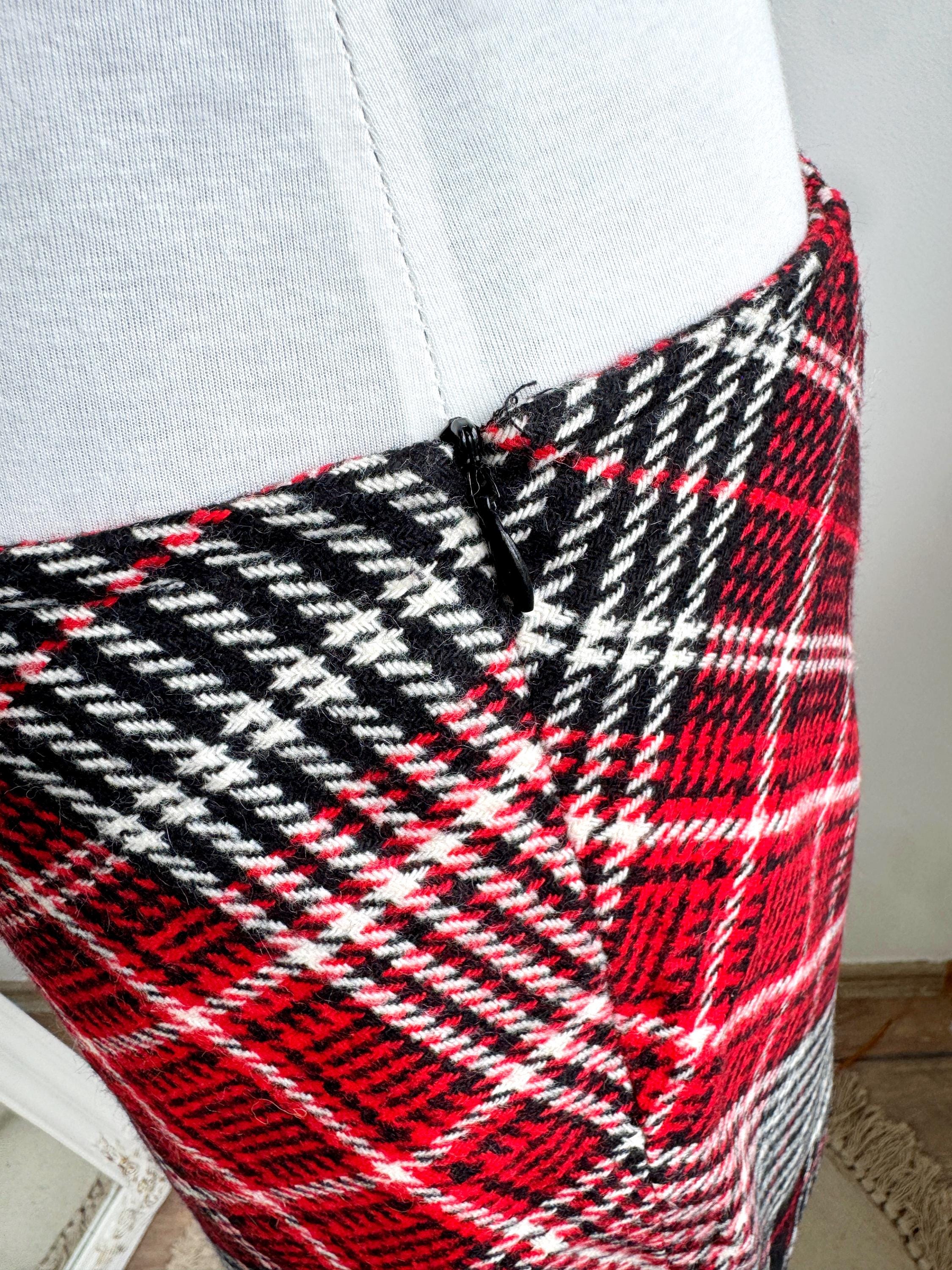 Wonderful vintage 90s Italian plaid tartan mini skirt made of soft wool blend fabric (80% wook, 20% other fibers) in red, black and white with lining underneath in size 44 Italy, which fits like size S and side hidden zipper closure.