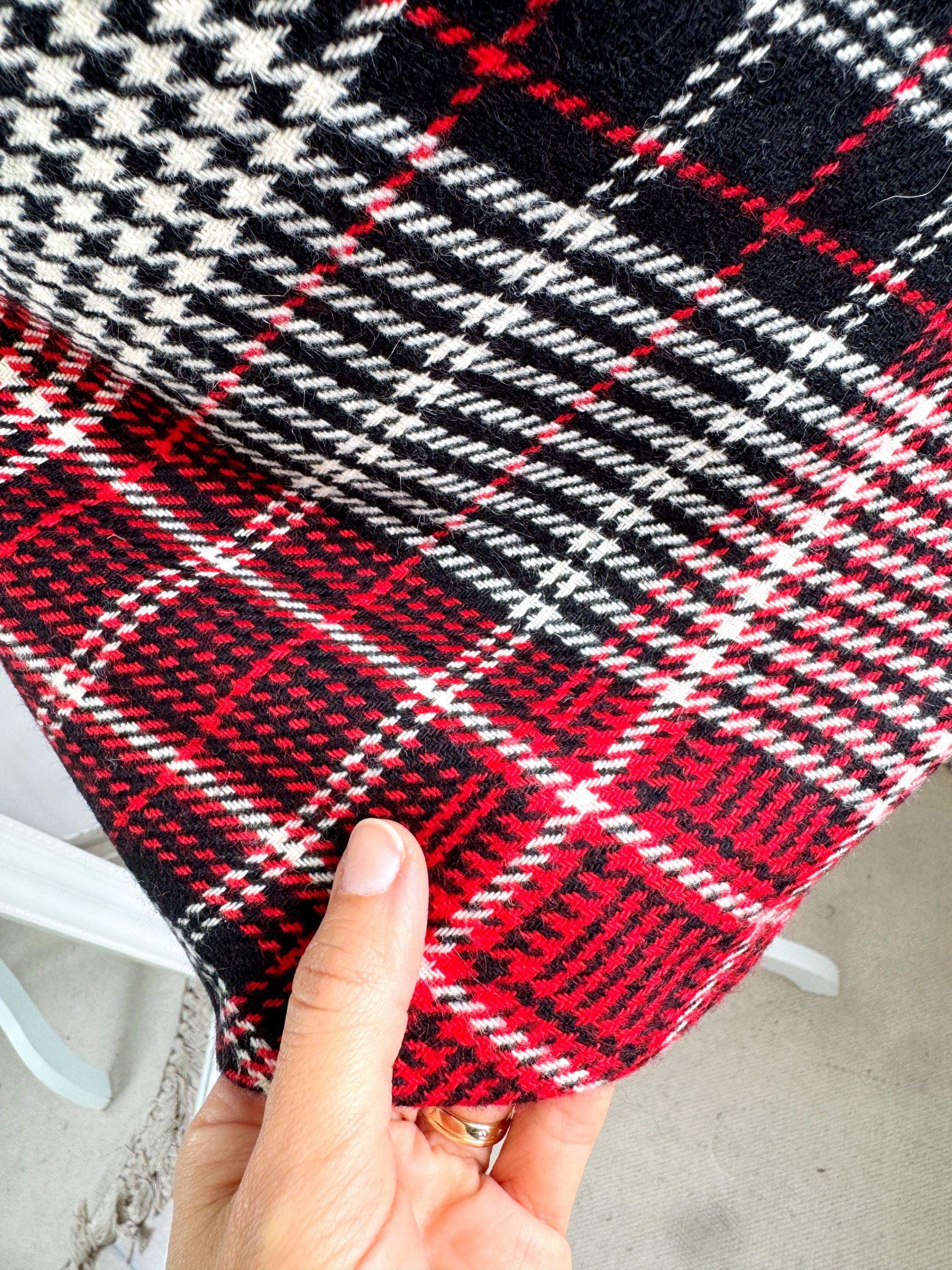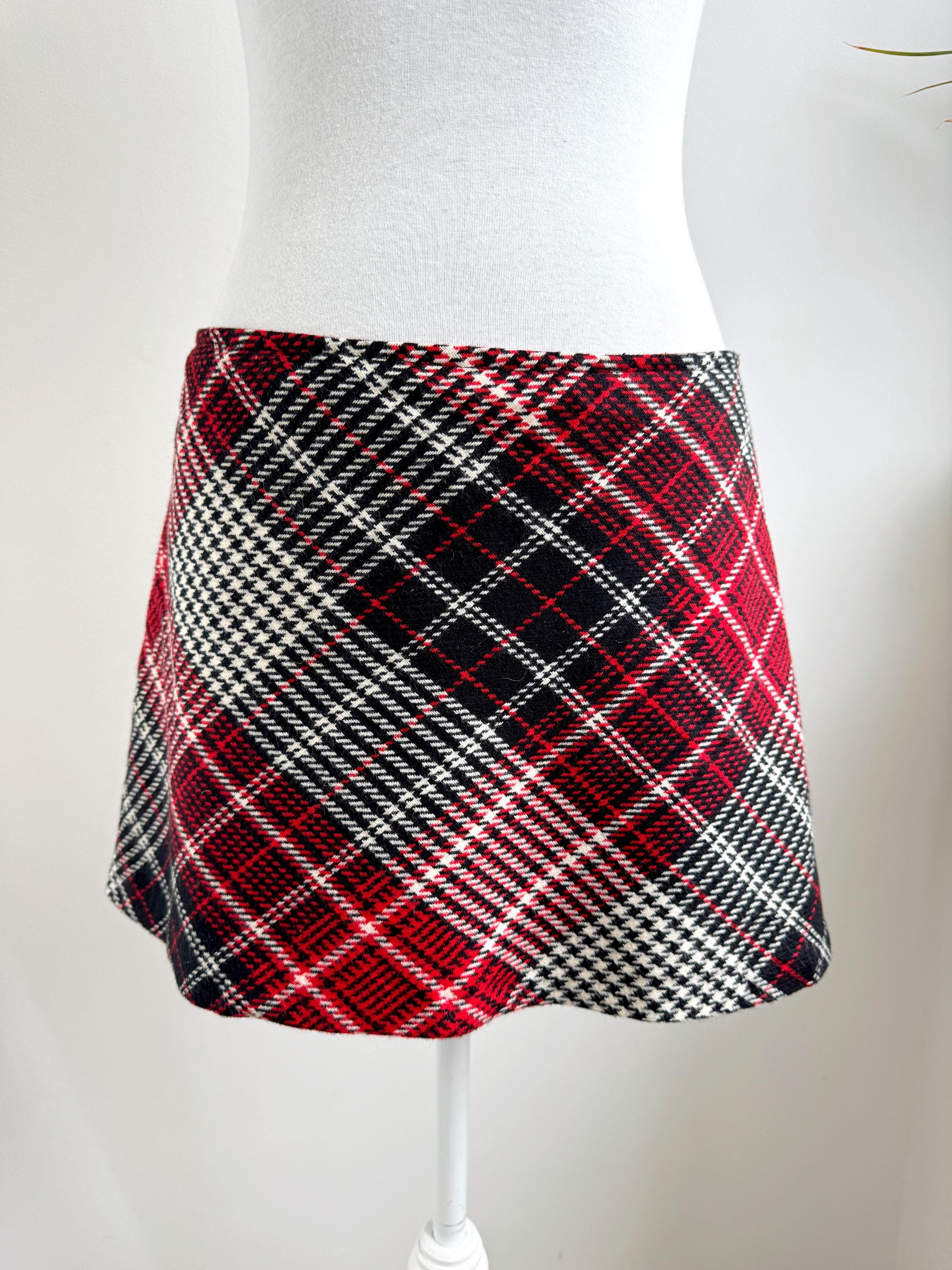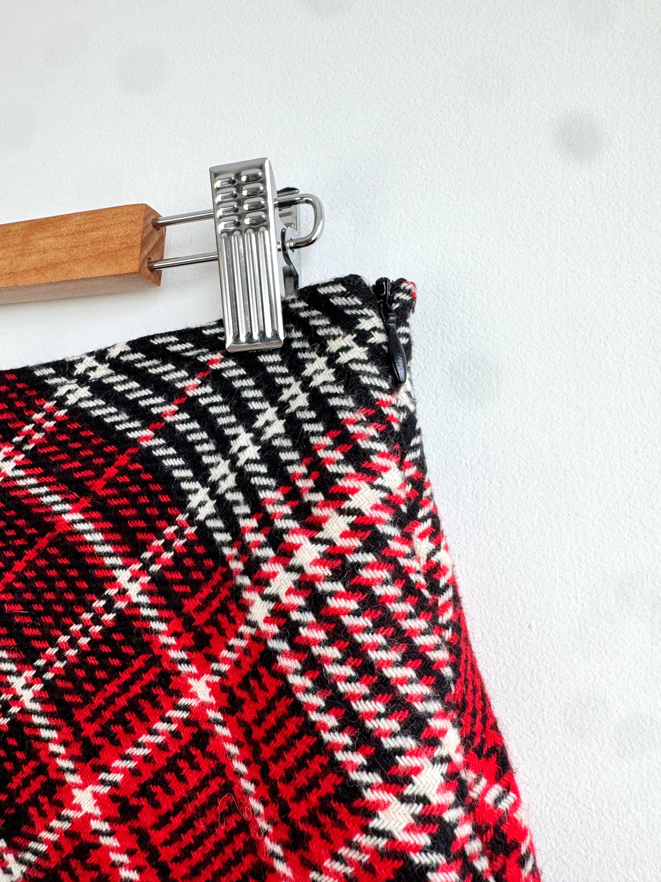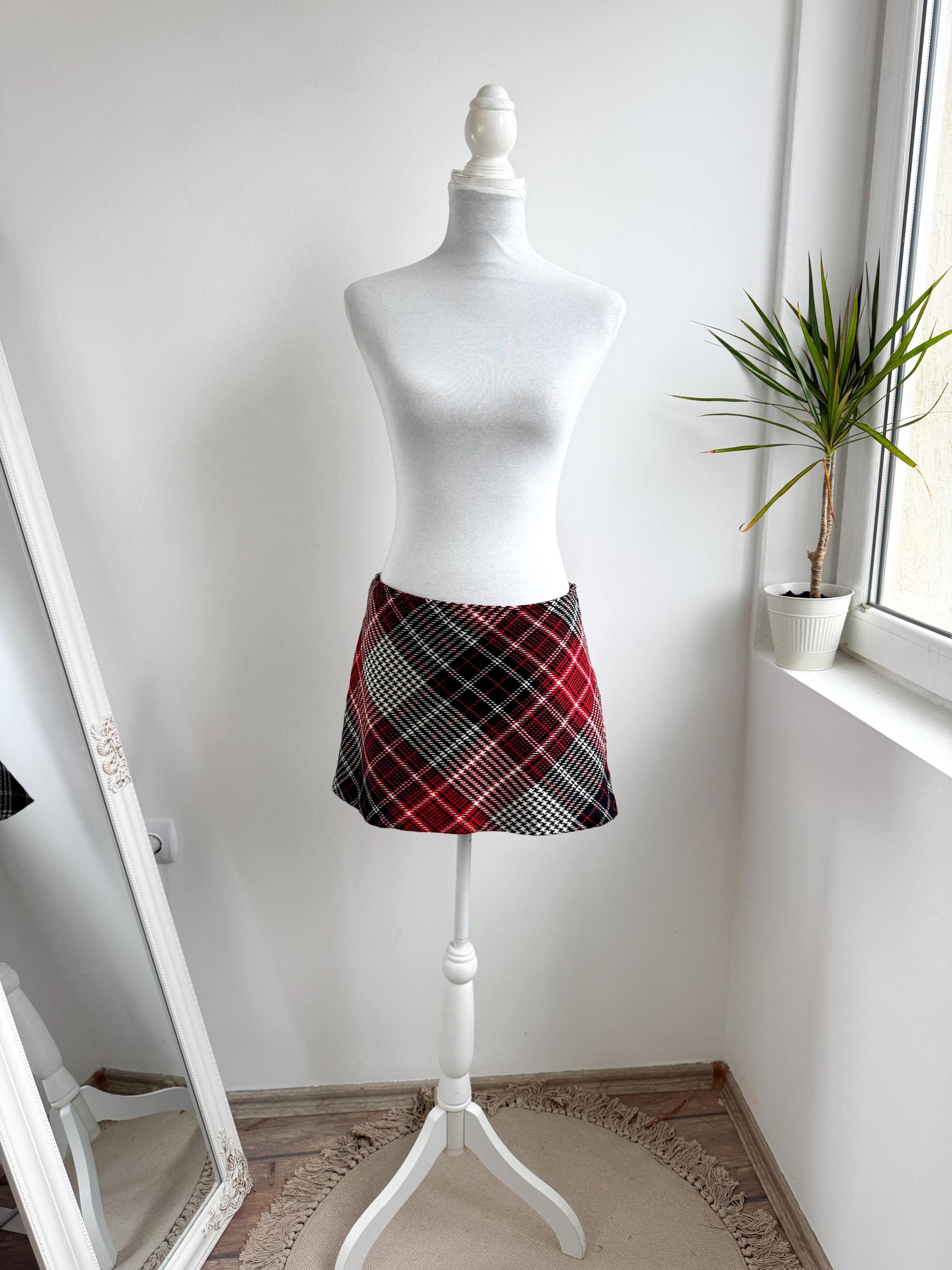 Wonderful vintage 90s Italian plaid tartan mini skirt made of soft wool blend fabric (80% wook, 20% other fibers) in red, black and white with lining underneath in size 44 Italy, which fits like size S and side hidden zipper closure.