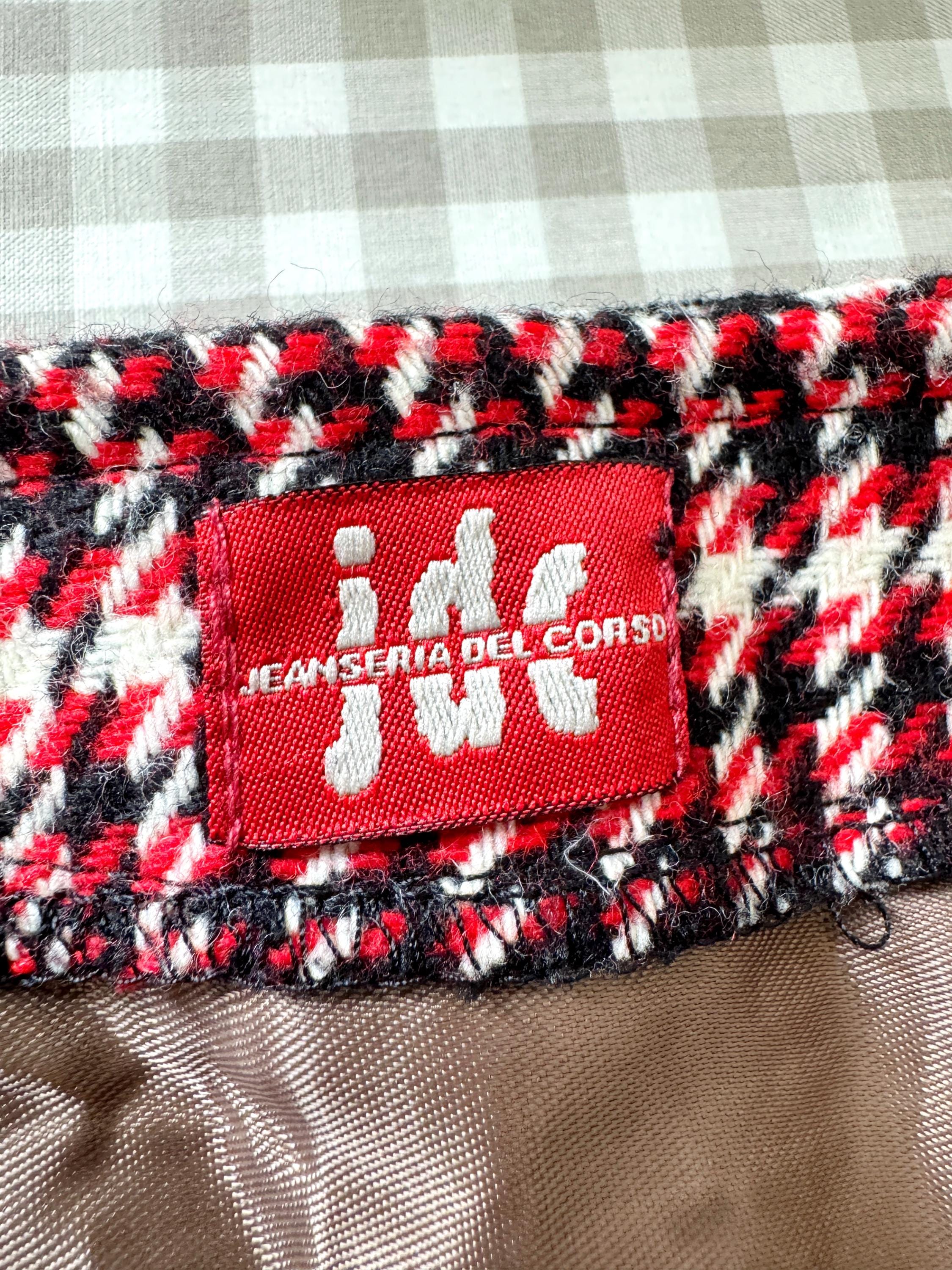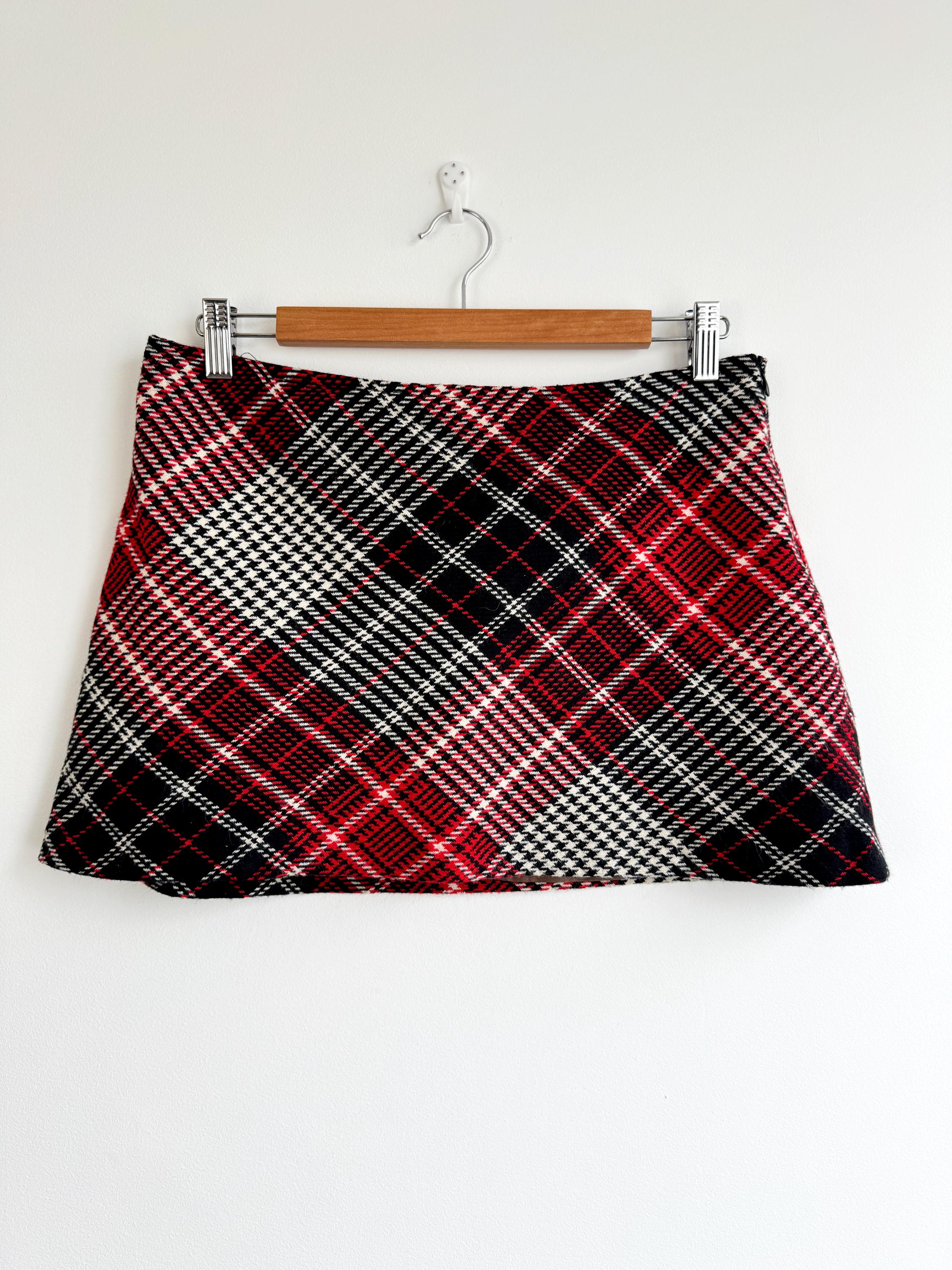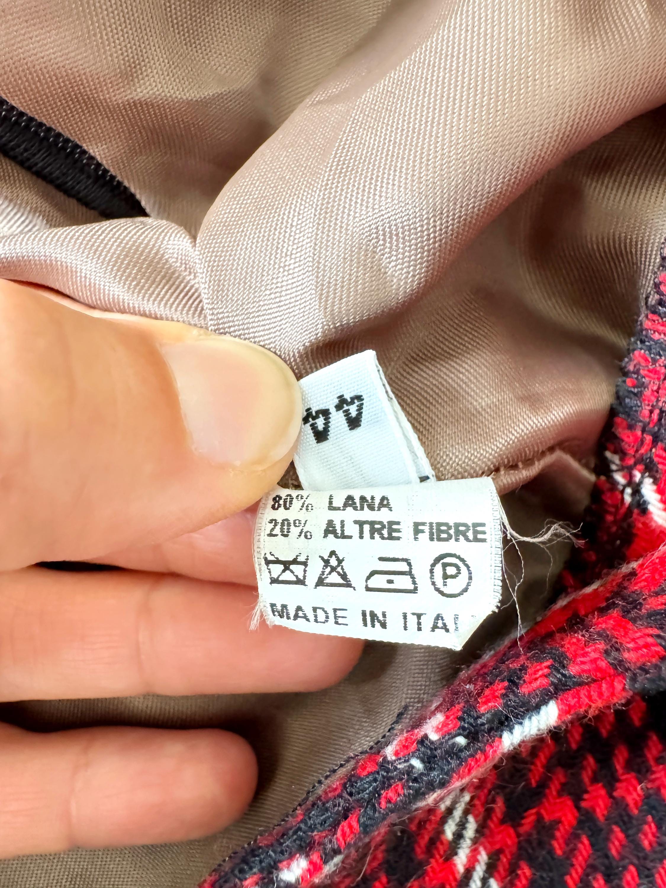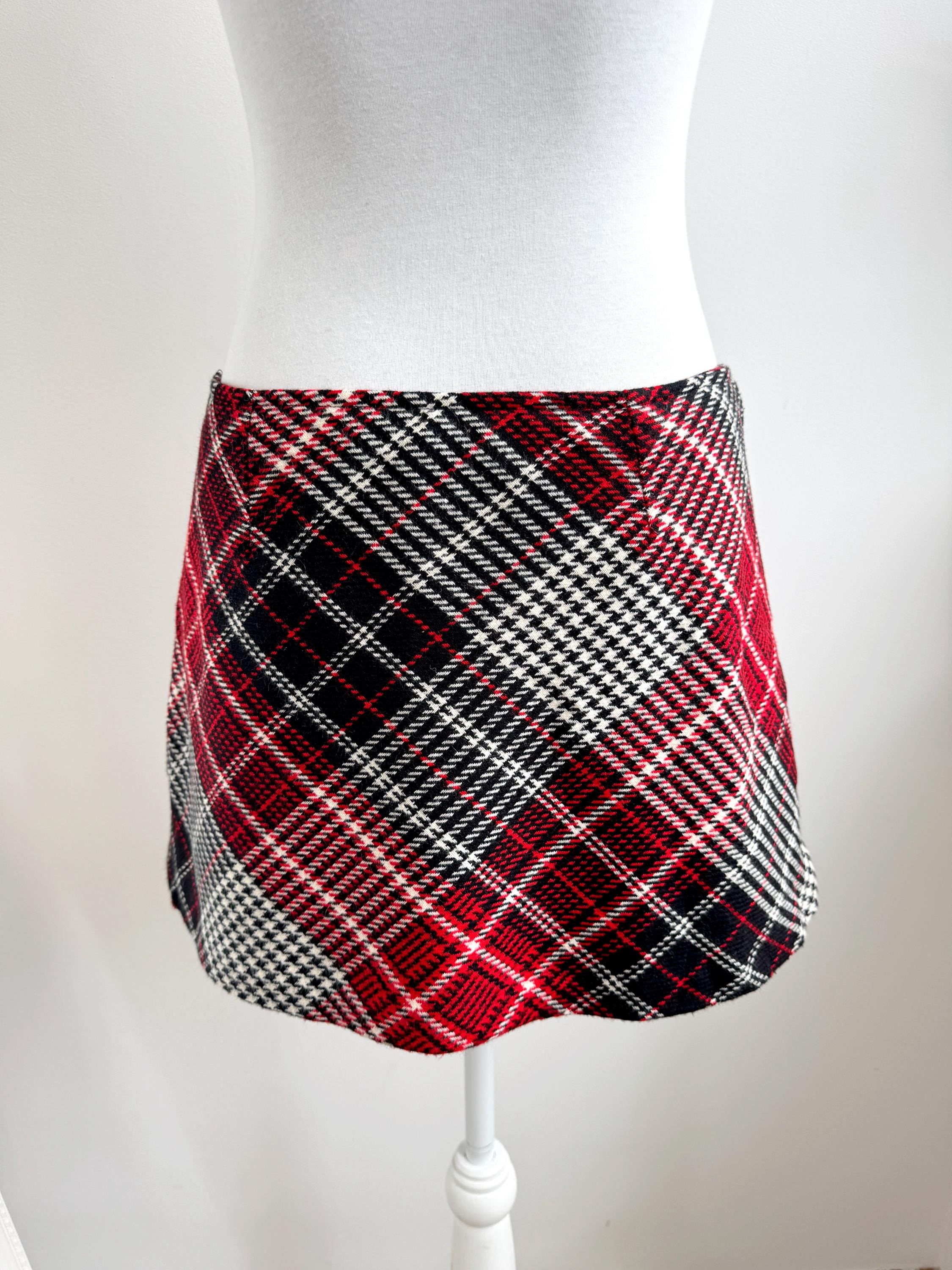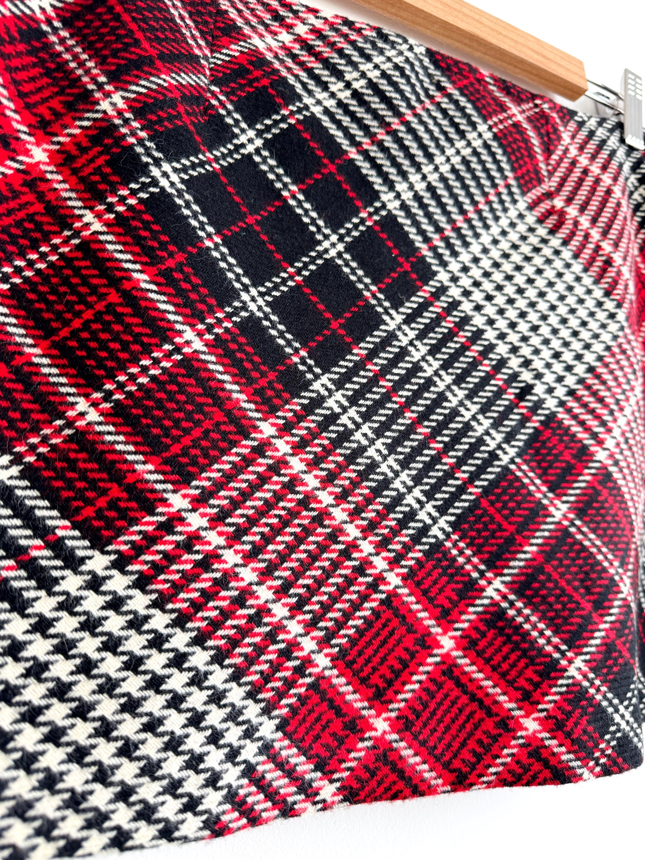 Wonderful vintage 90s Italian plaid tartan mini skirt made of soft wool blend fabric (80% wook, 20% other fibers) in red, black and white with lining underneath in size 44 Italy, which fits like size S and side hidden zipper closure.