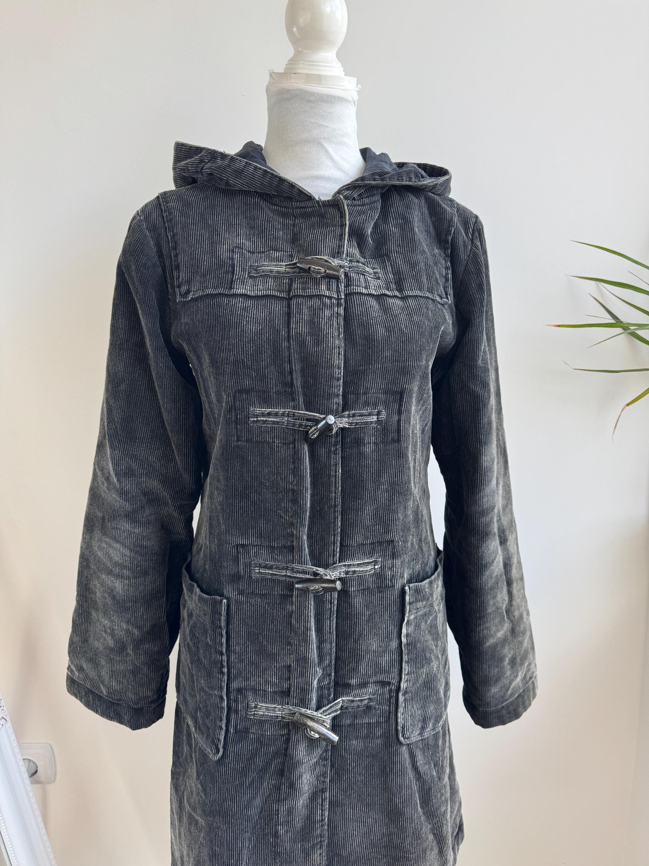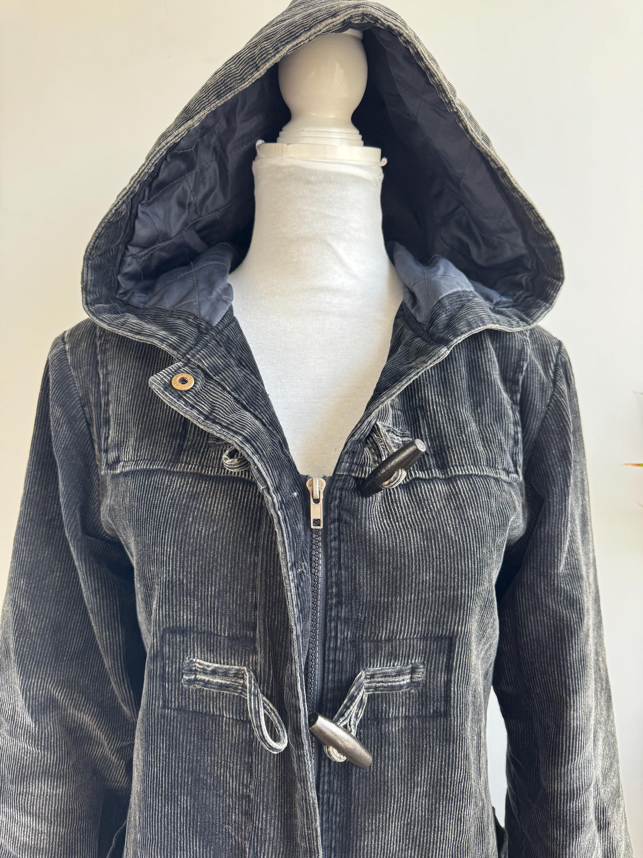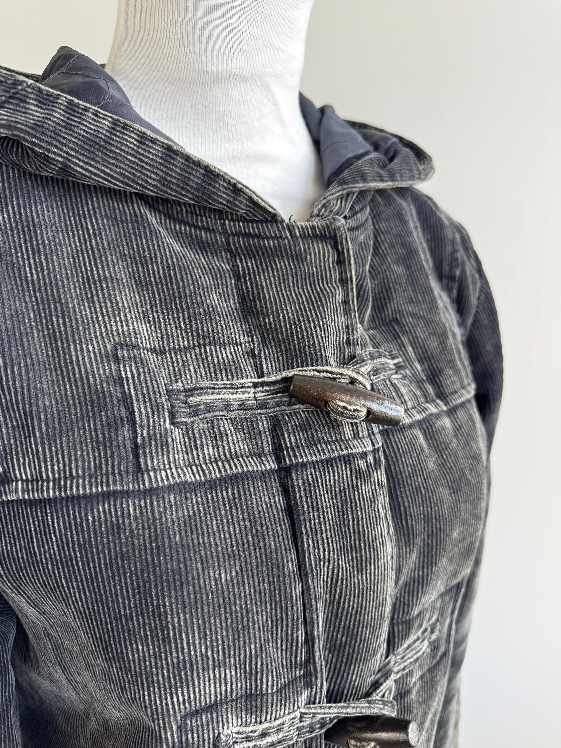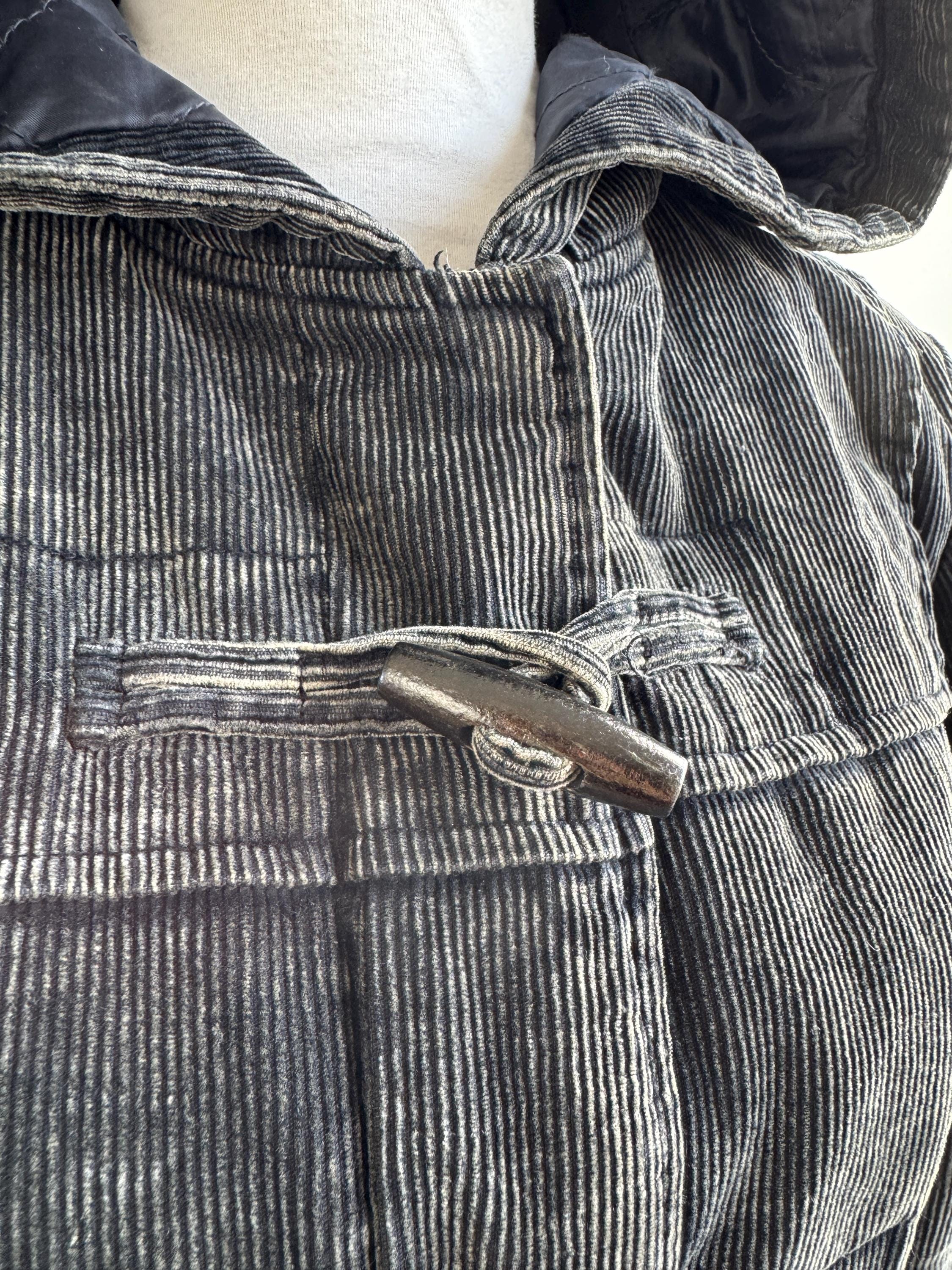 Vintage 90s washed black thin cord corduroy duffle jacket made of 100% cotton fabric with zipper and toggle closure and pockets, quilted lining for extra warmth size EUR 34, fits like S.