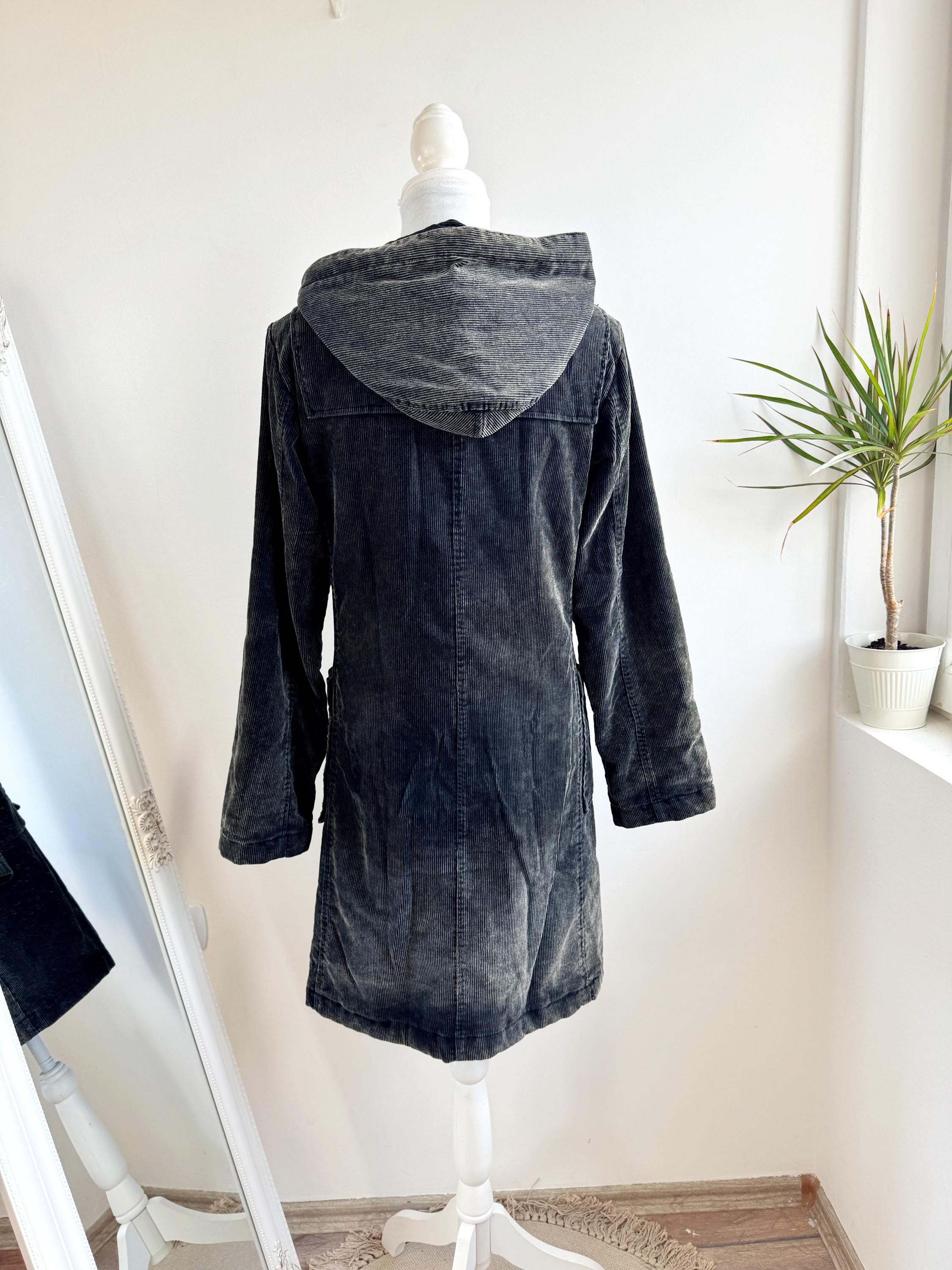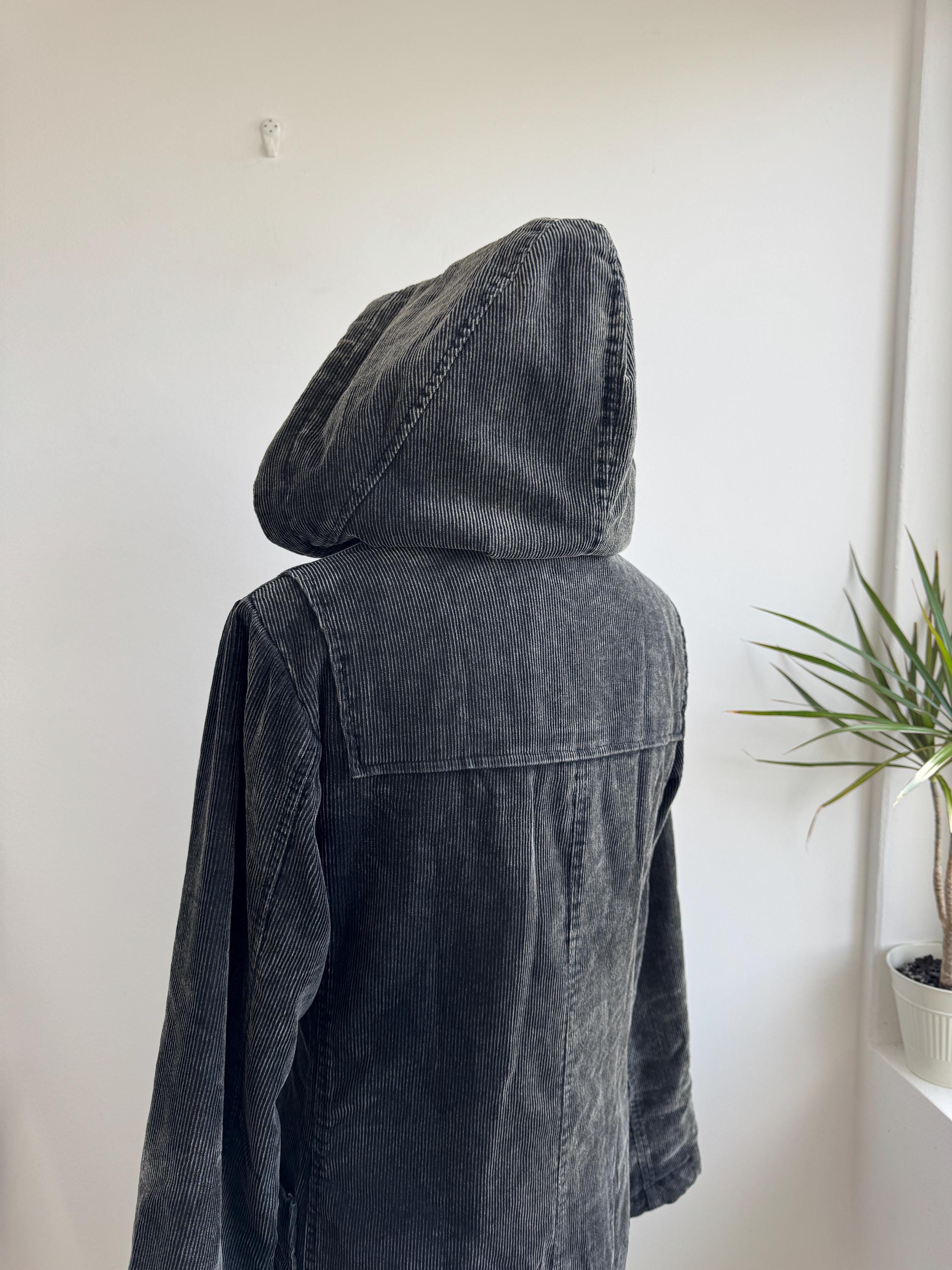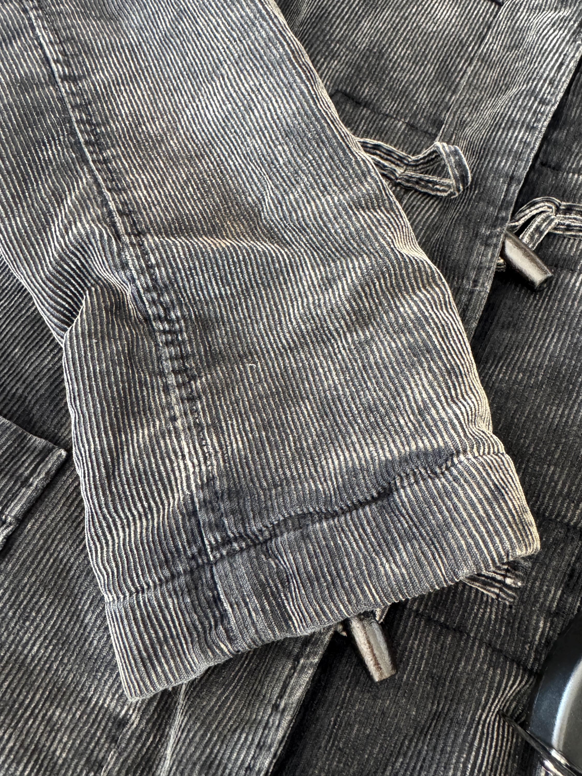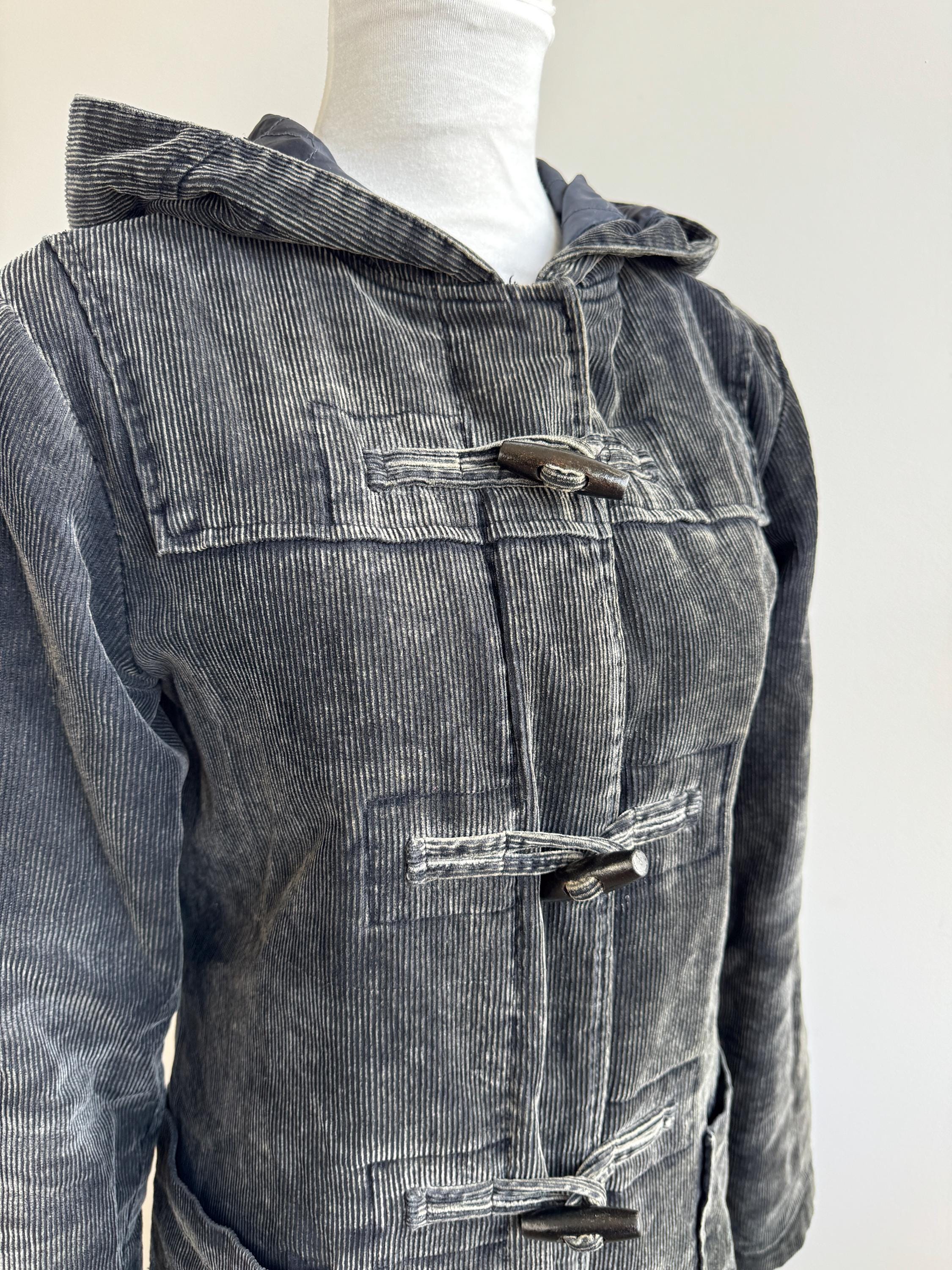 Vintage 90s washed black thin cord corduroy duffle jacket made of 100% cotton fabric with zipper and toggle closure and pockets, quilted lining for extra warmth size EUR 34, fits like S.