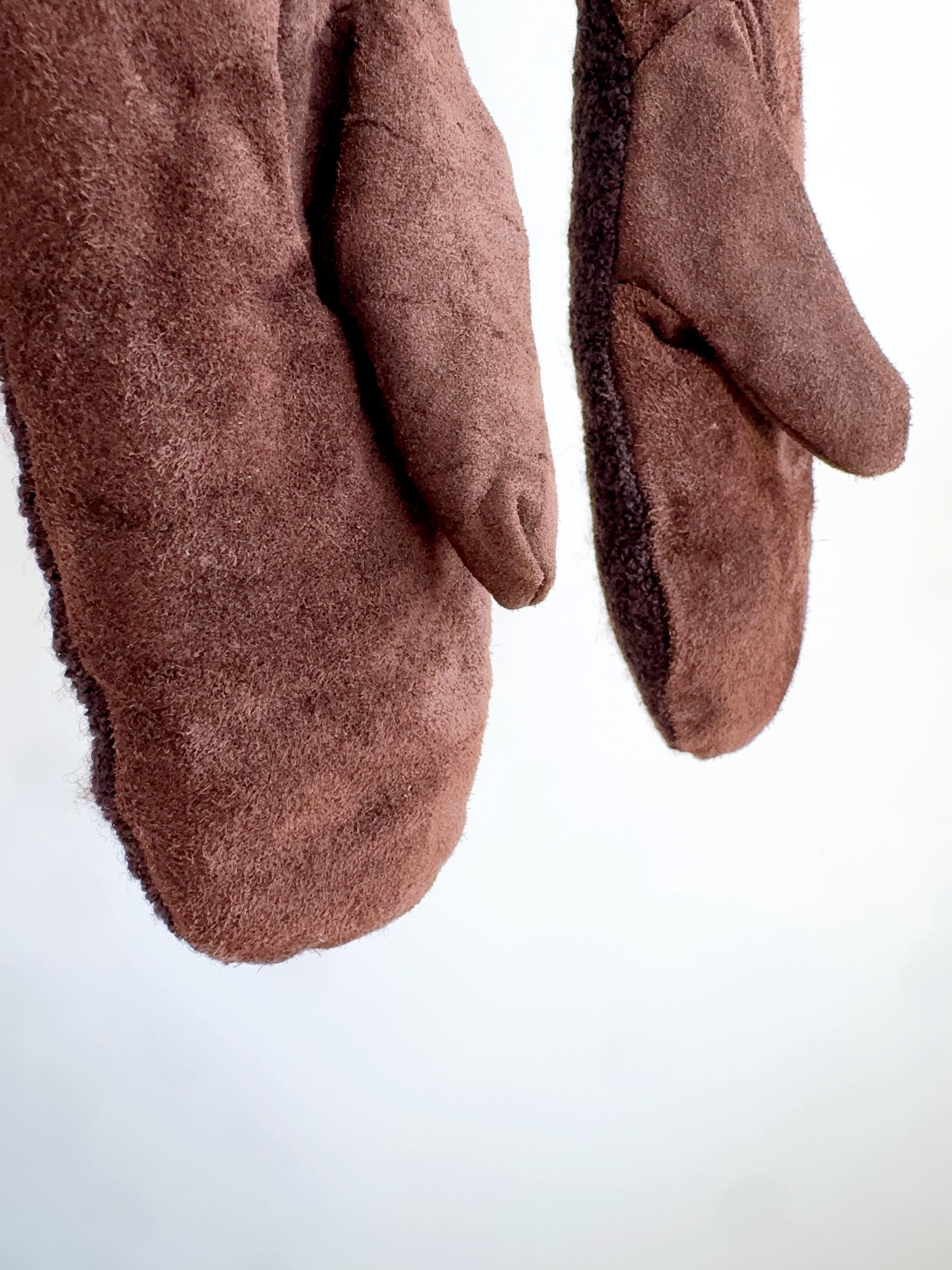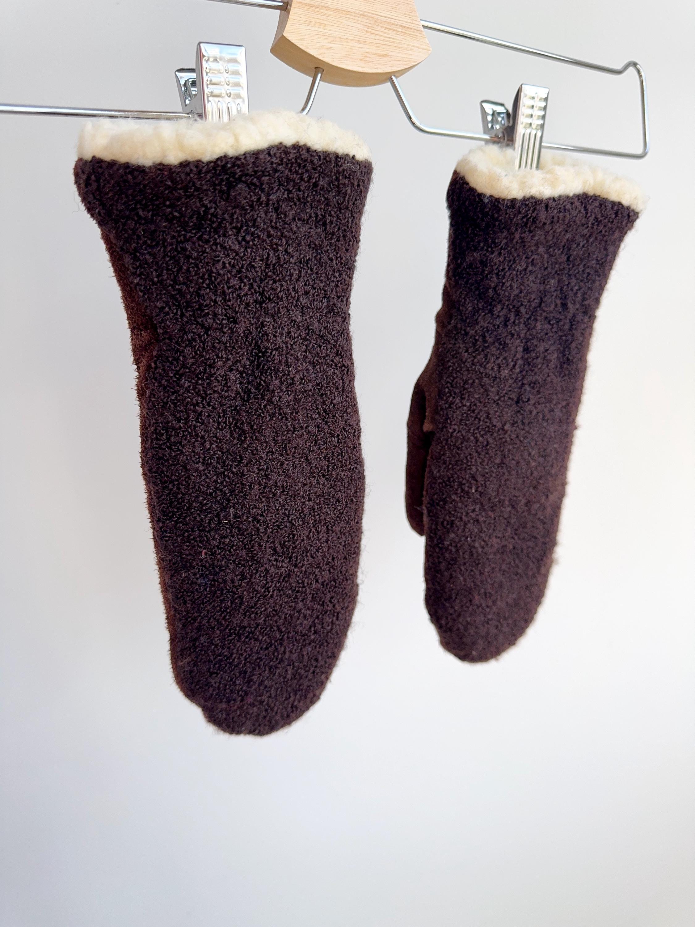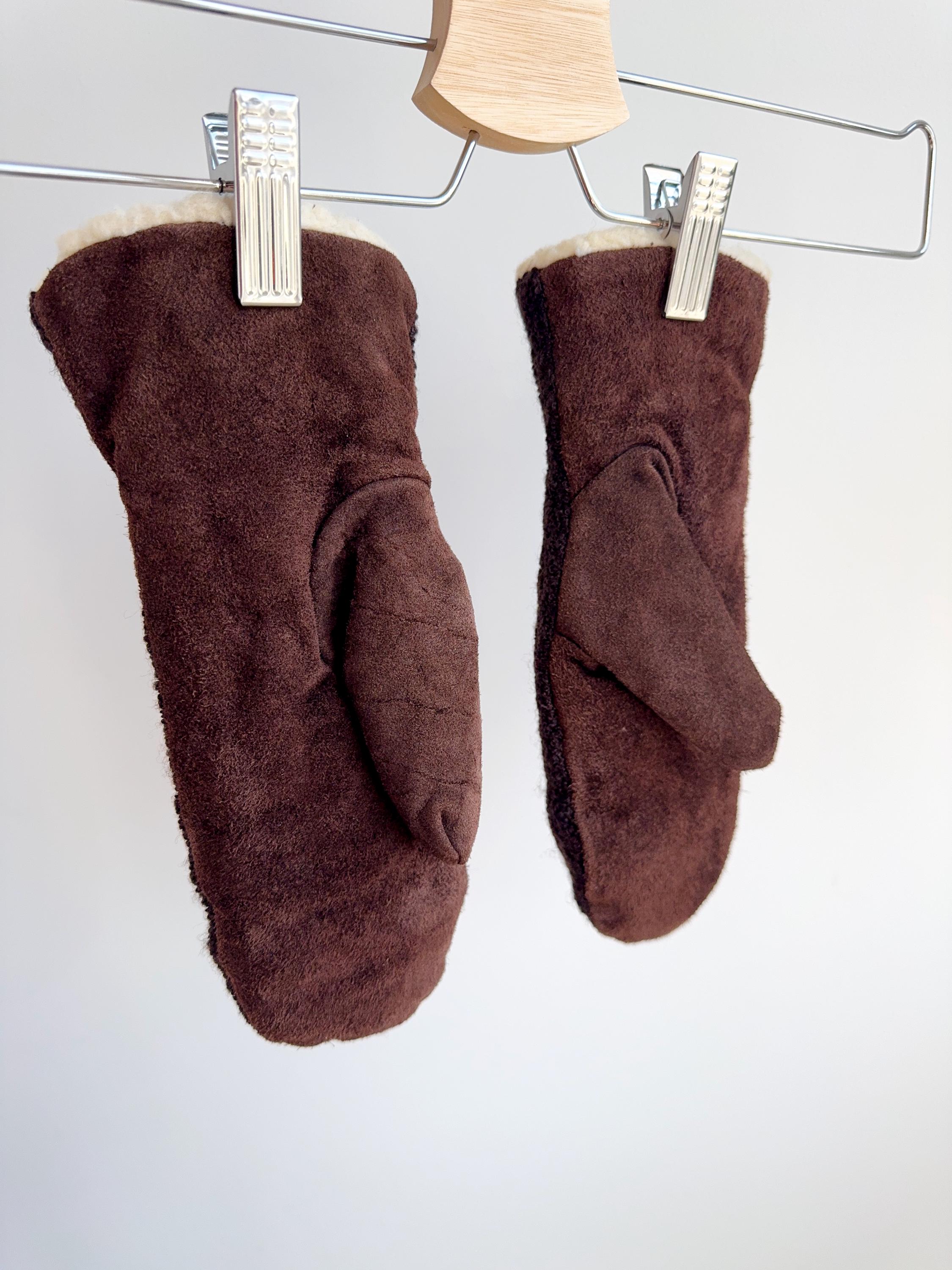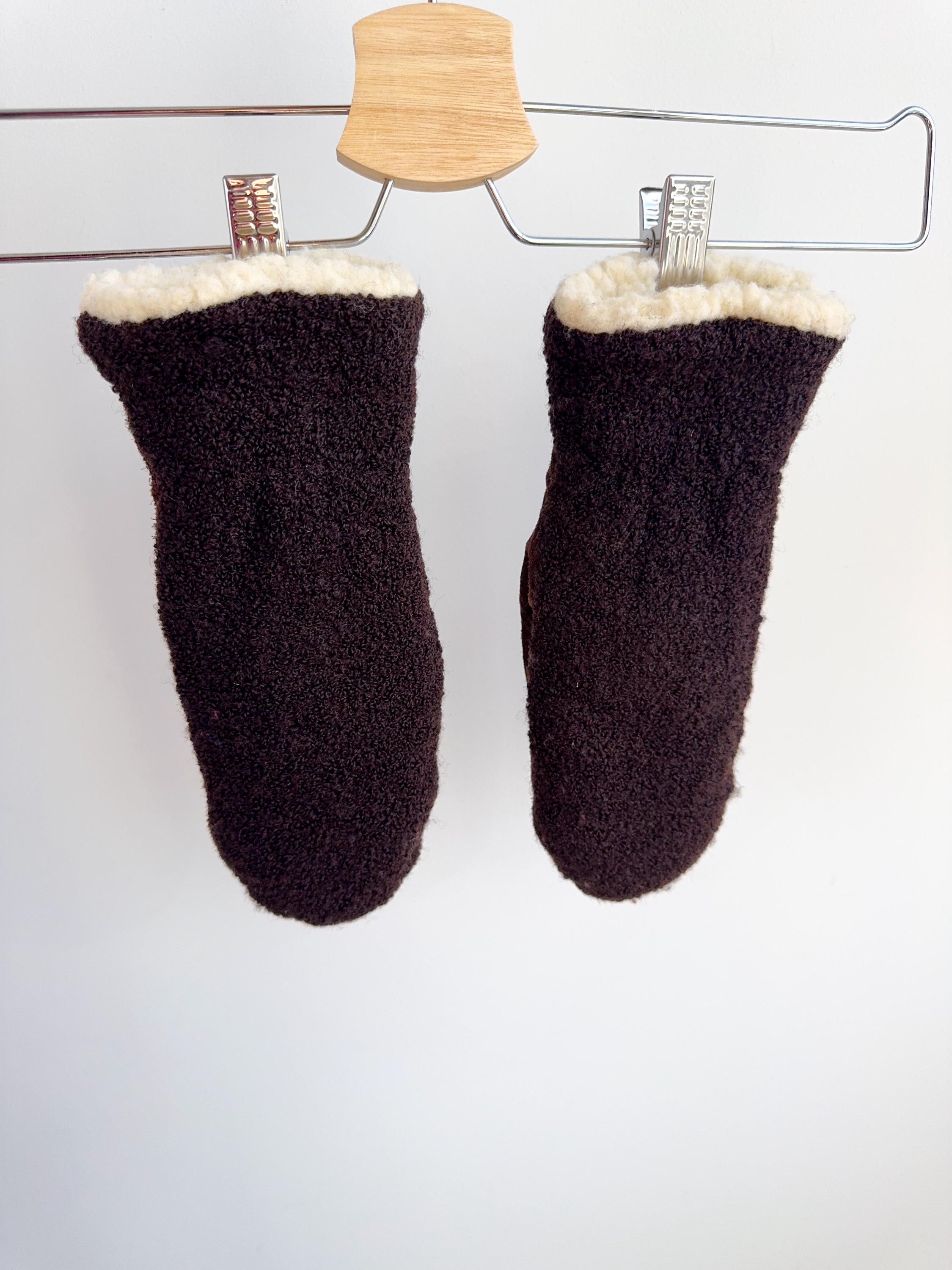 Lovely brown suede leather sherpa winter mitts with boucle top, real suede leather bottom part and warm cozy sherpa lining, fit like women's size small.