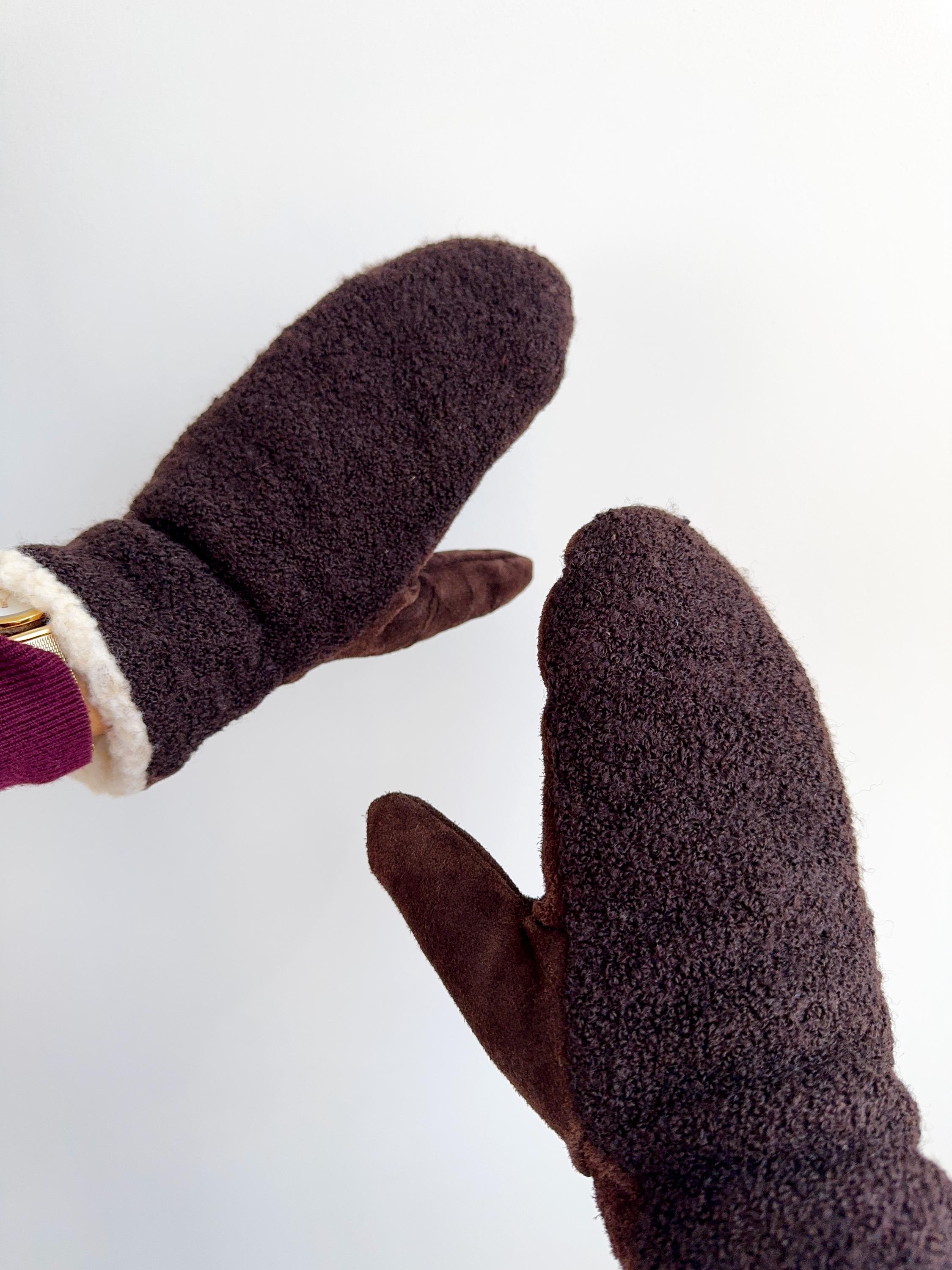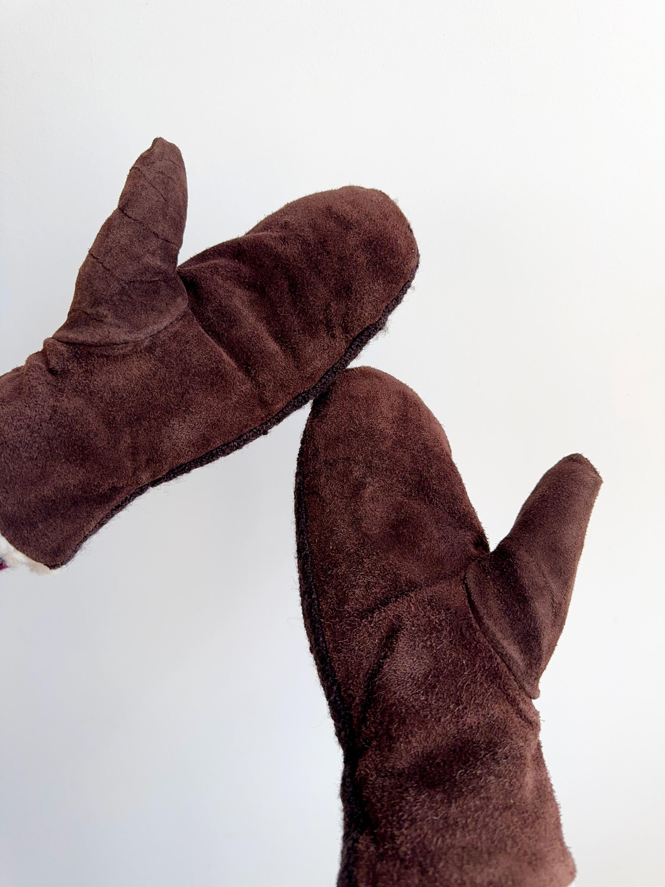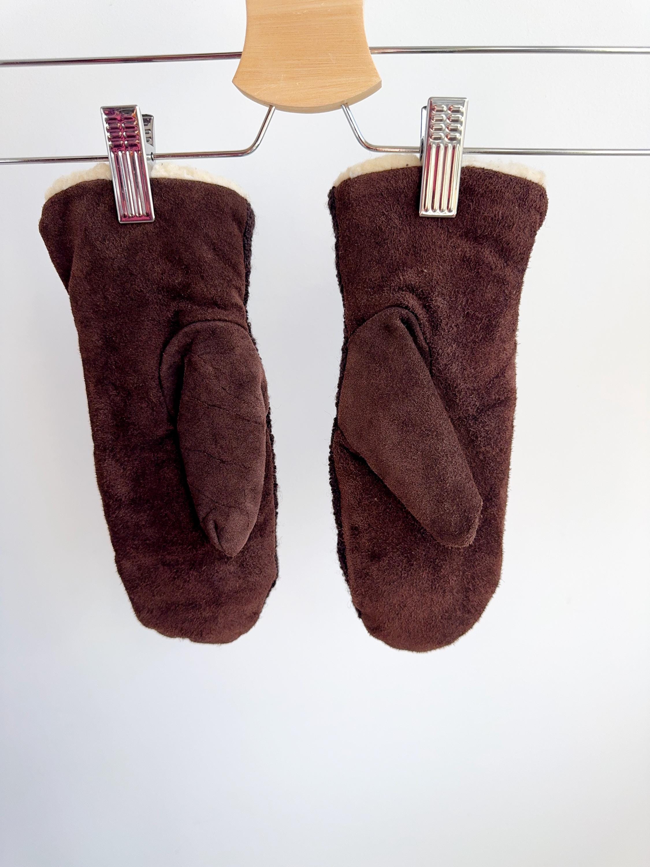 Lovely brown suede leather sherpa winter mitts with boucle top, real suede leather bottom part and warm cozy sherpa lining, fit like women's size small.