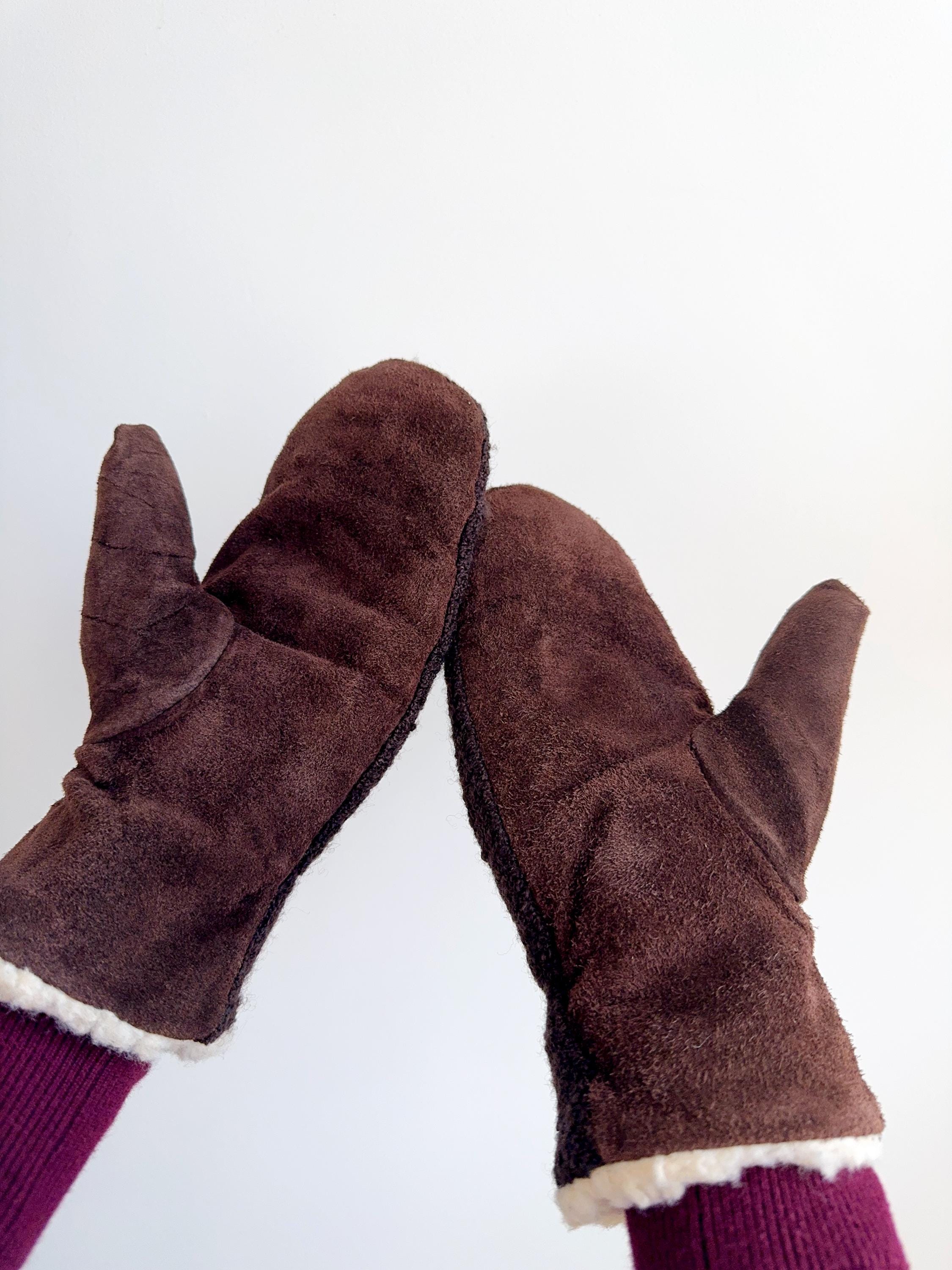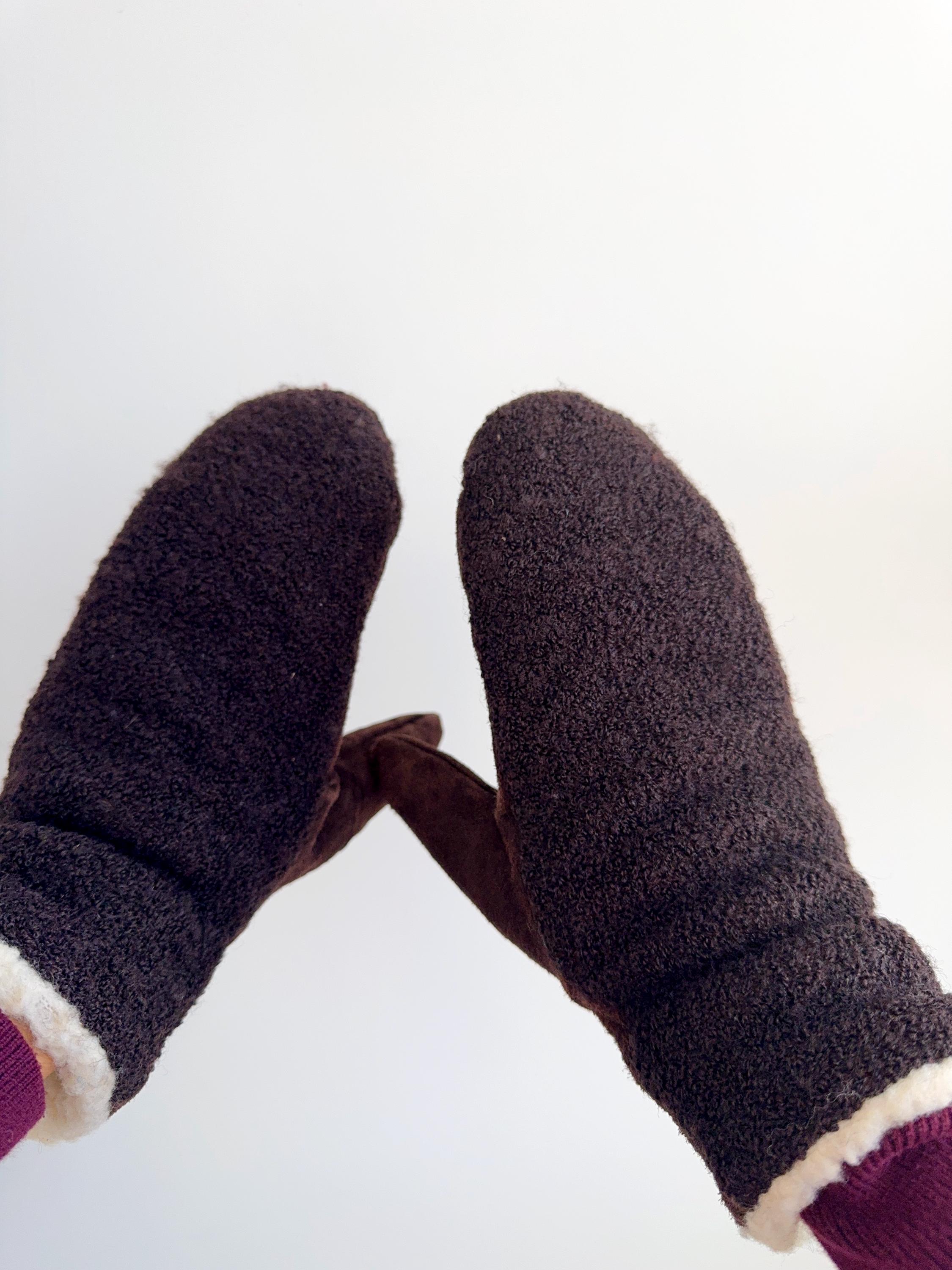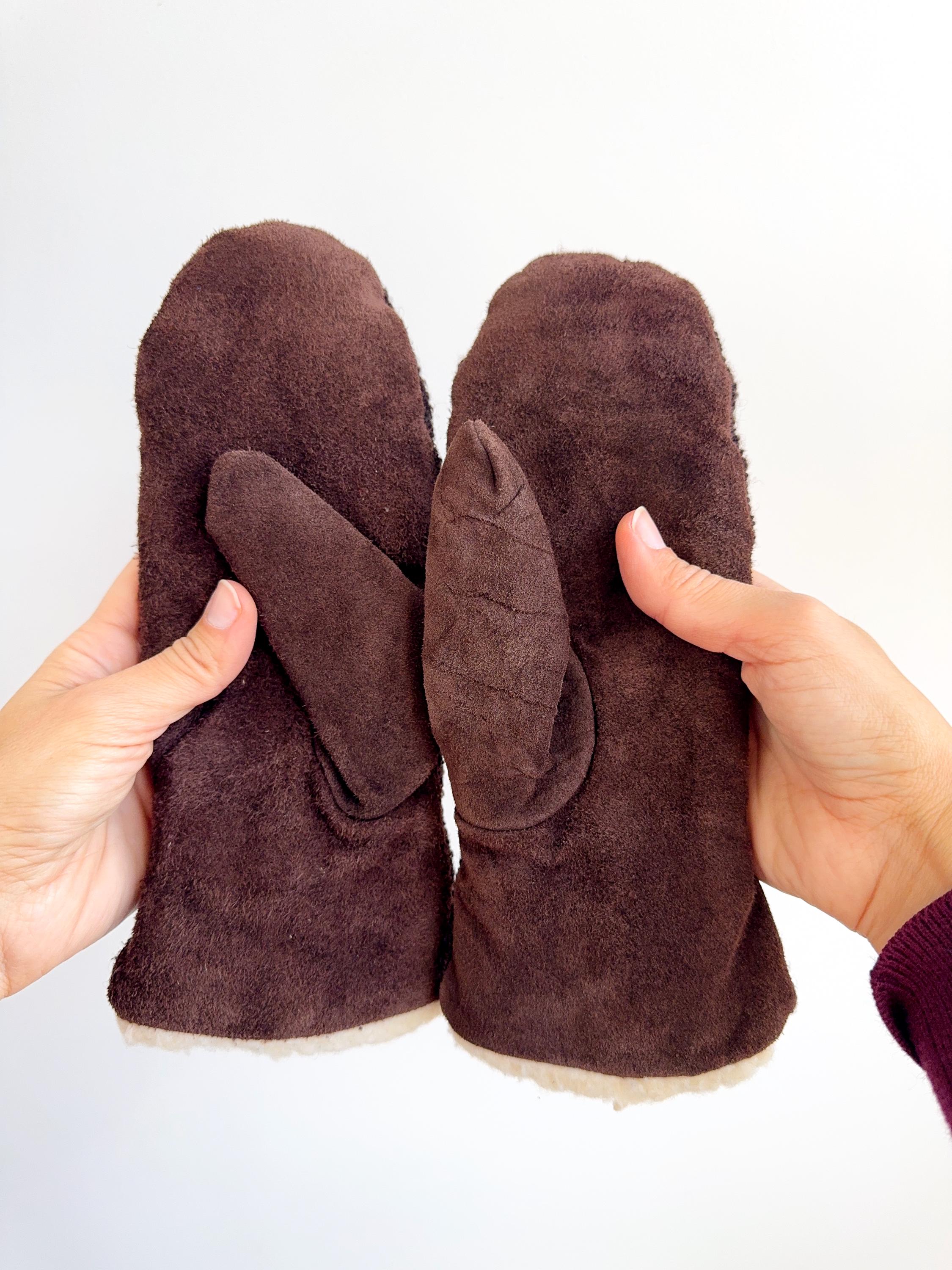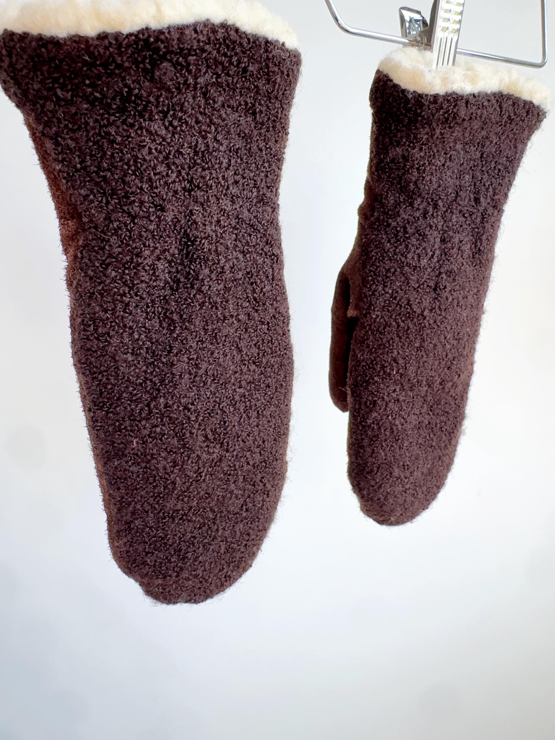Lovely brown suede leather sherpa winter mitts with boucle top, real suede leather bottom part and warm cozy sherpa lining, fit like women's size small.