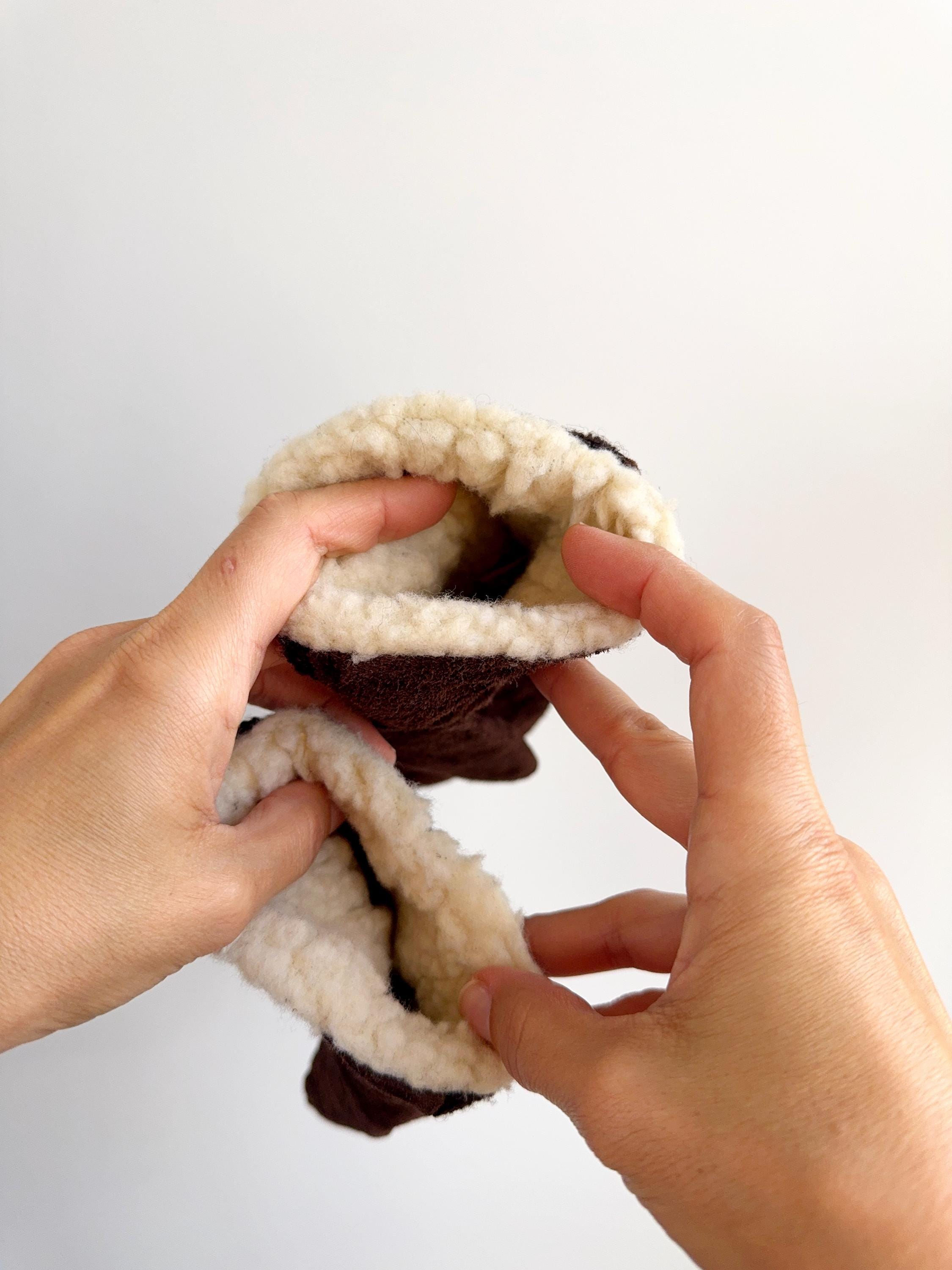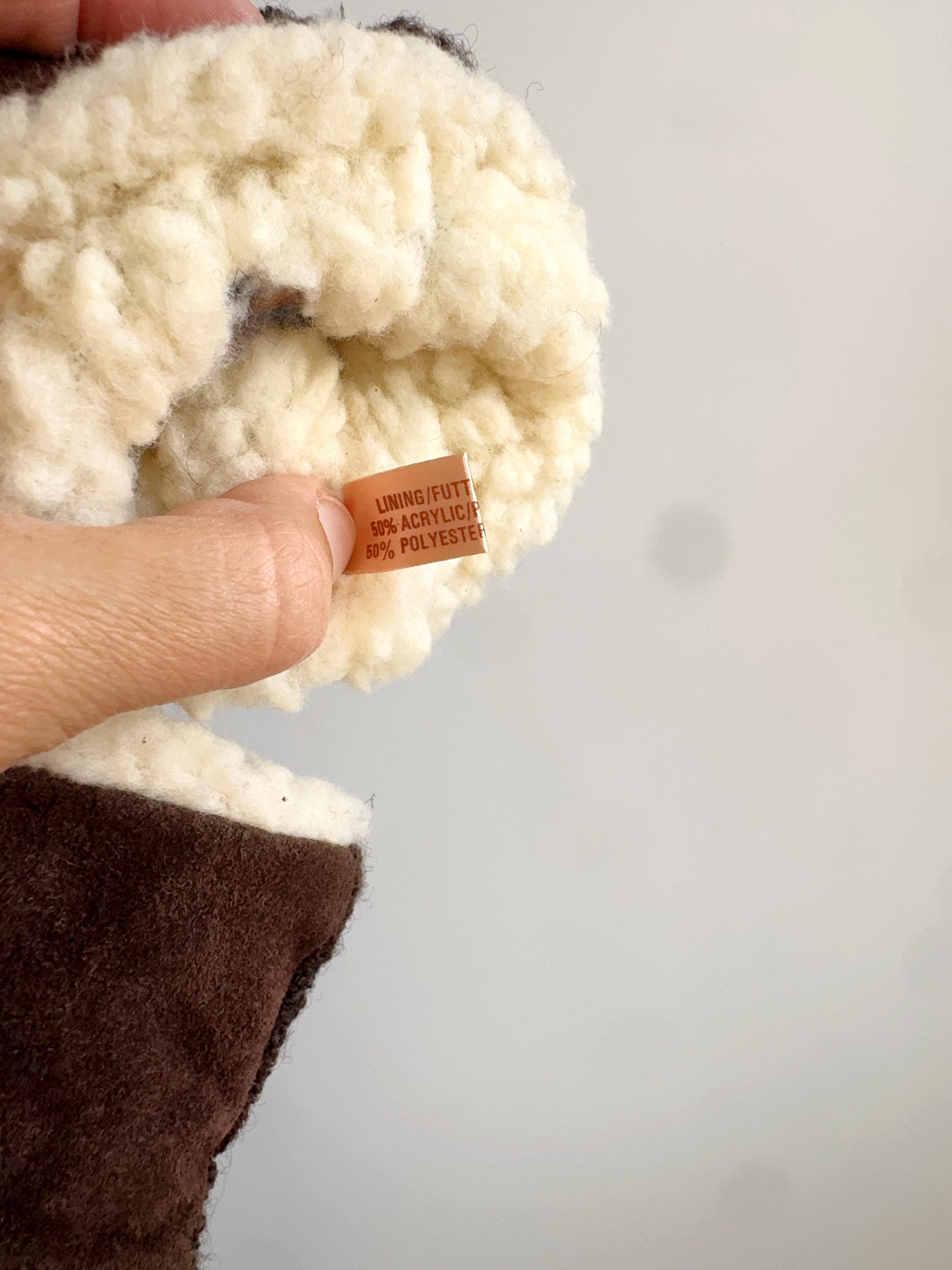 🧵 Material: Outer: Boucle Fabric Top, Suede Leather Bottom; Lining: 50% Acrylic, 50% Polyester (Sherpa/Faux Fur)