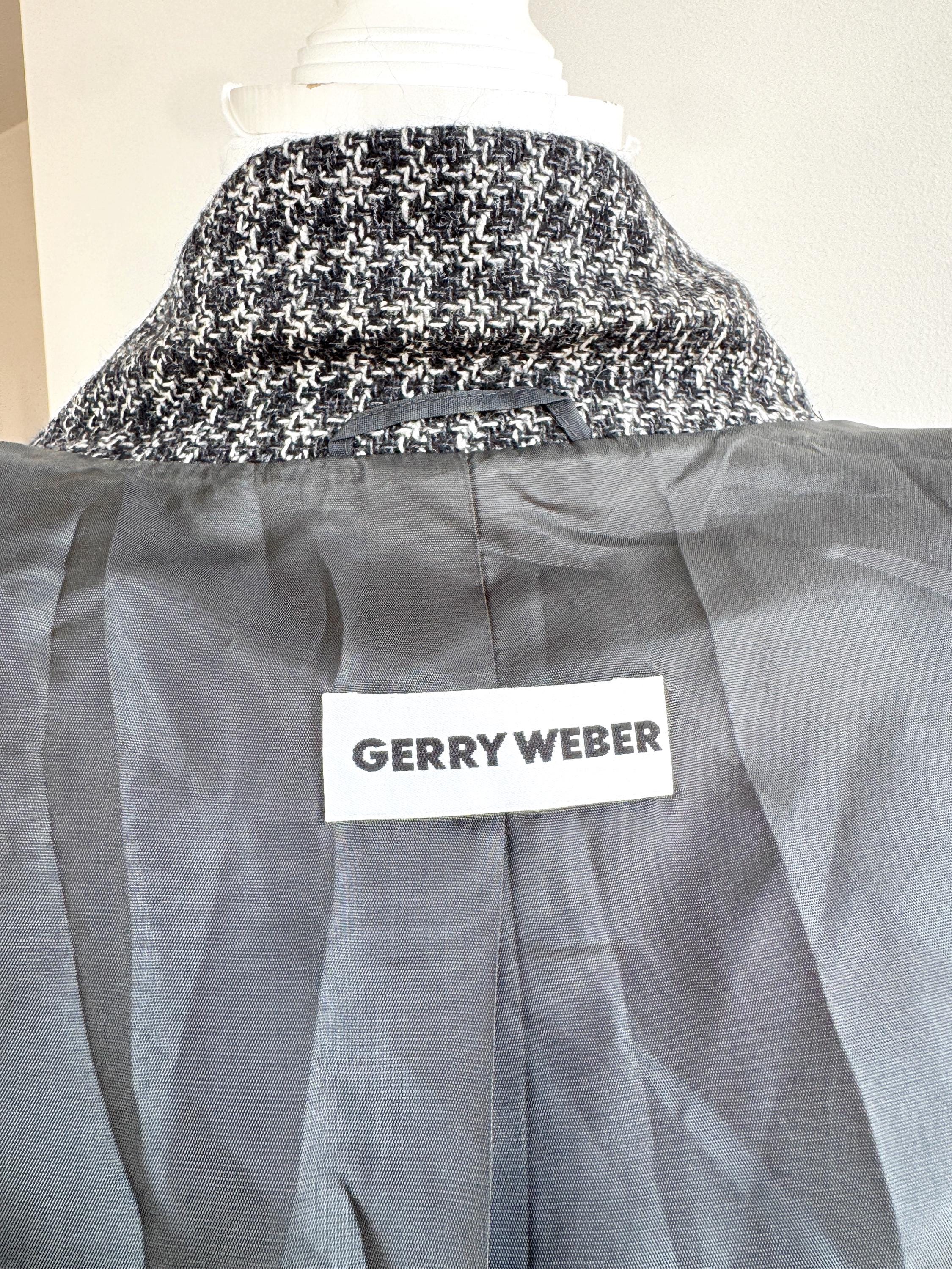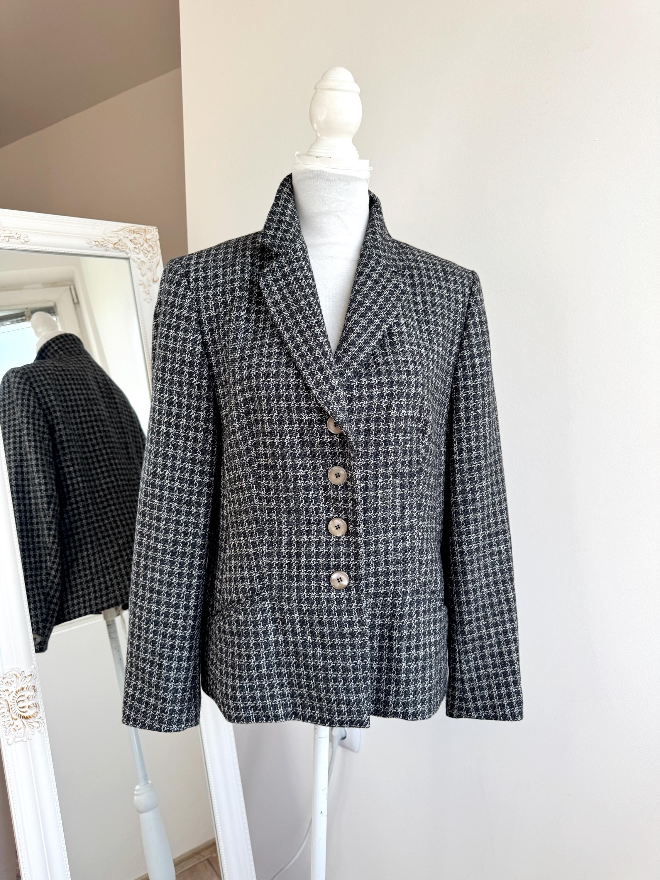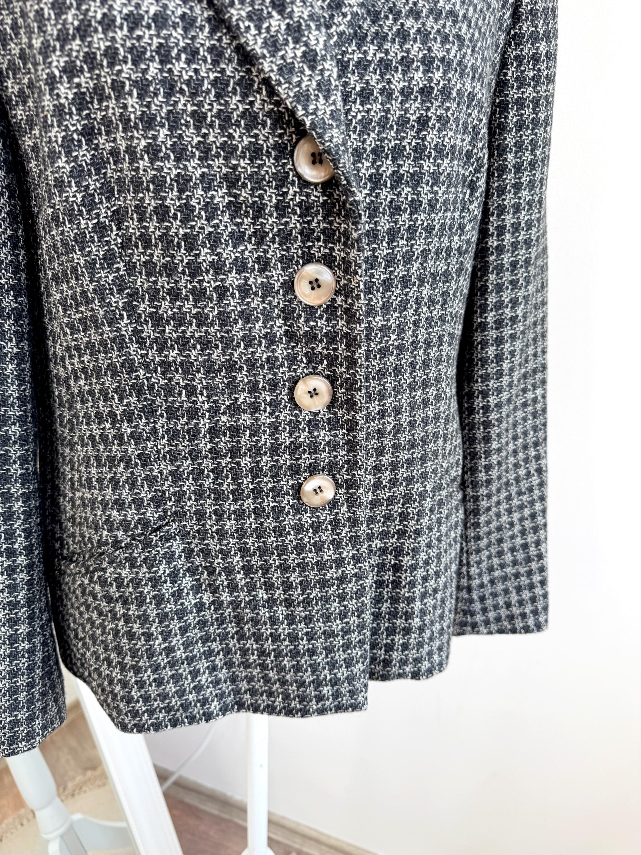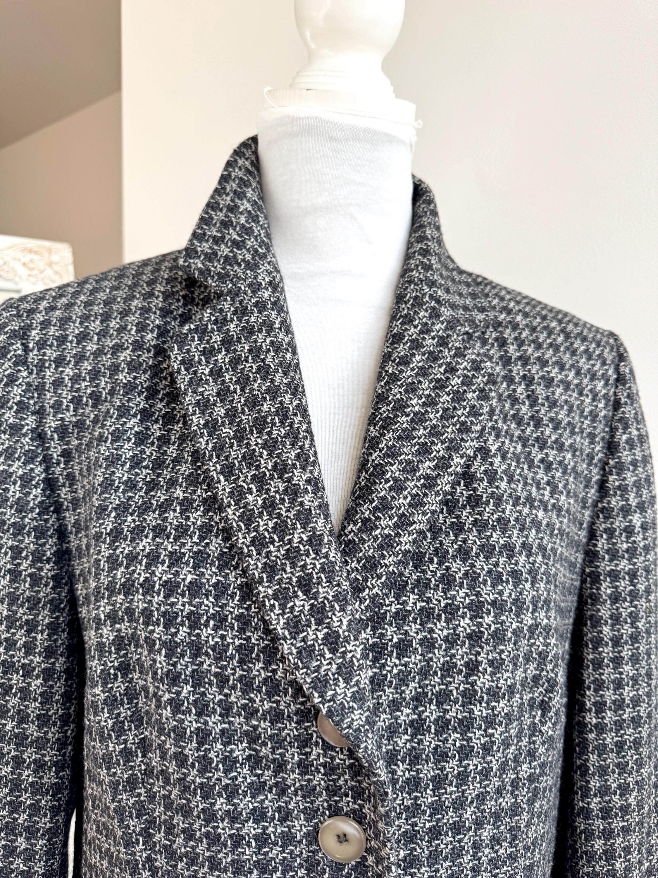 This is a vintage 90s Gerry Weber houndstooth blazer for women in size EUR 40, which fits like size L. This structured blazer is made of pure new wool in black and white check, giving it a charcoal grey look. Fully lined with acetate lining.