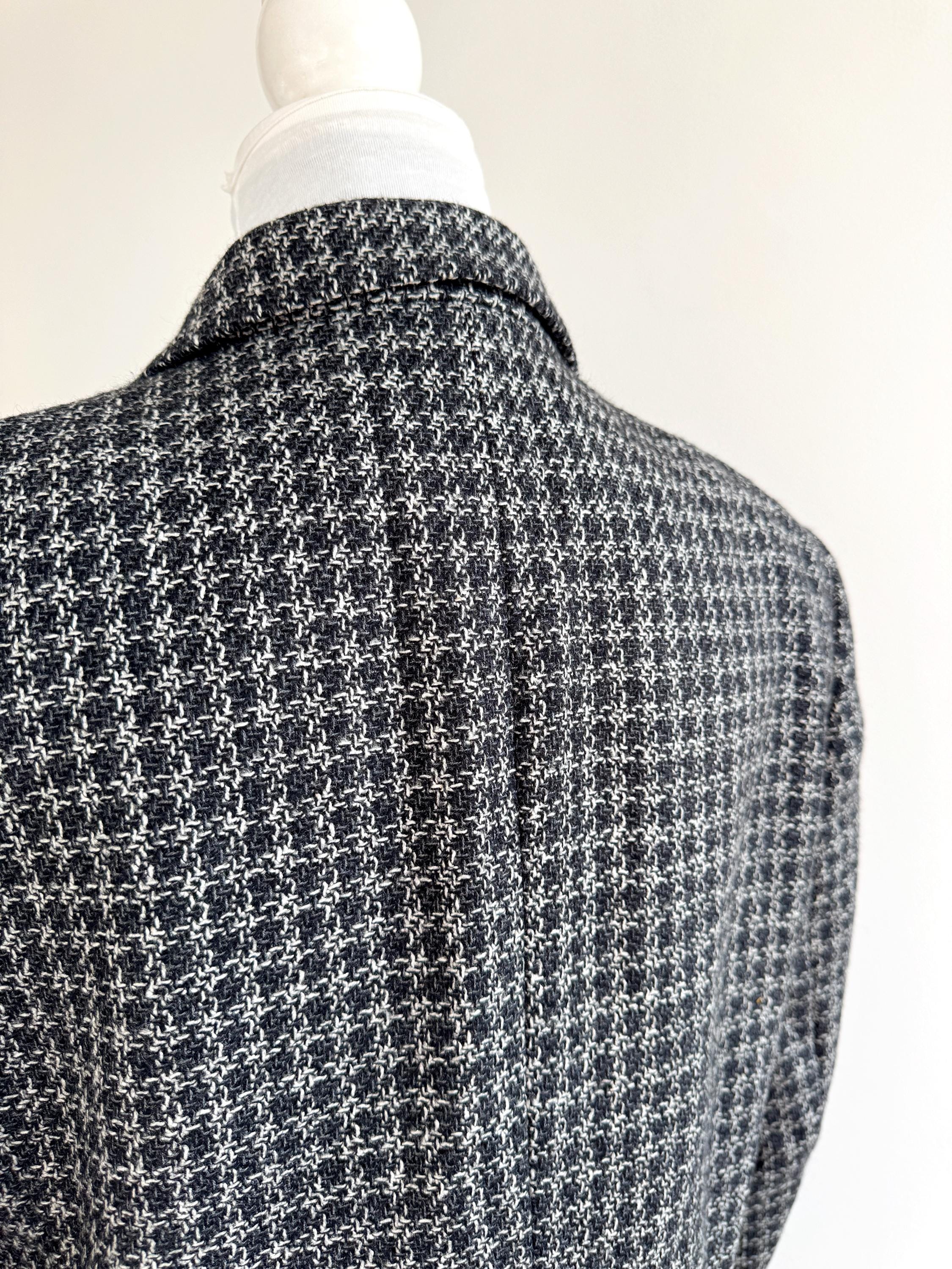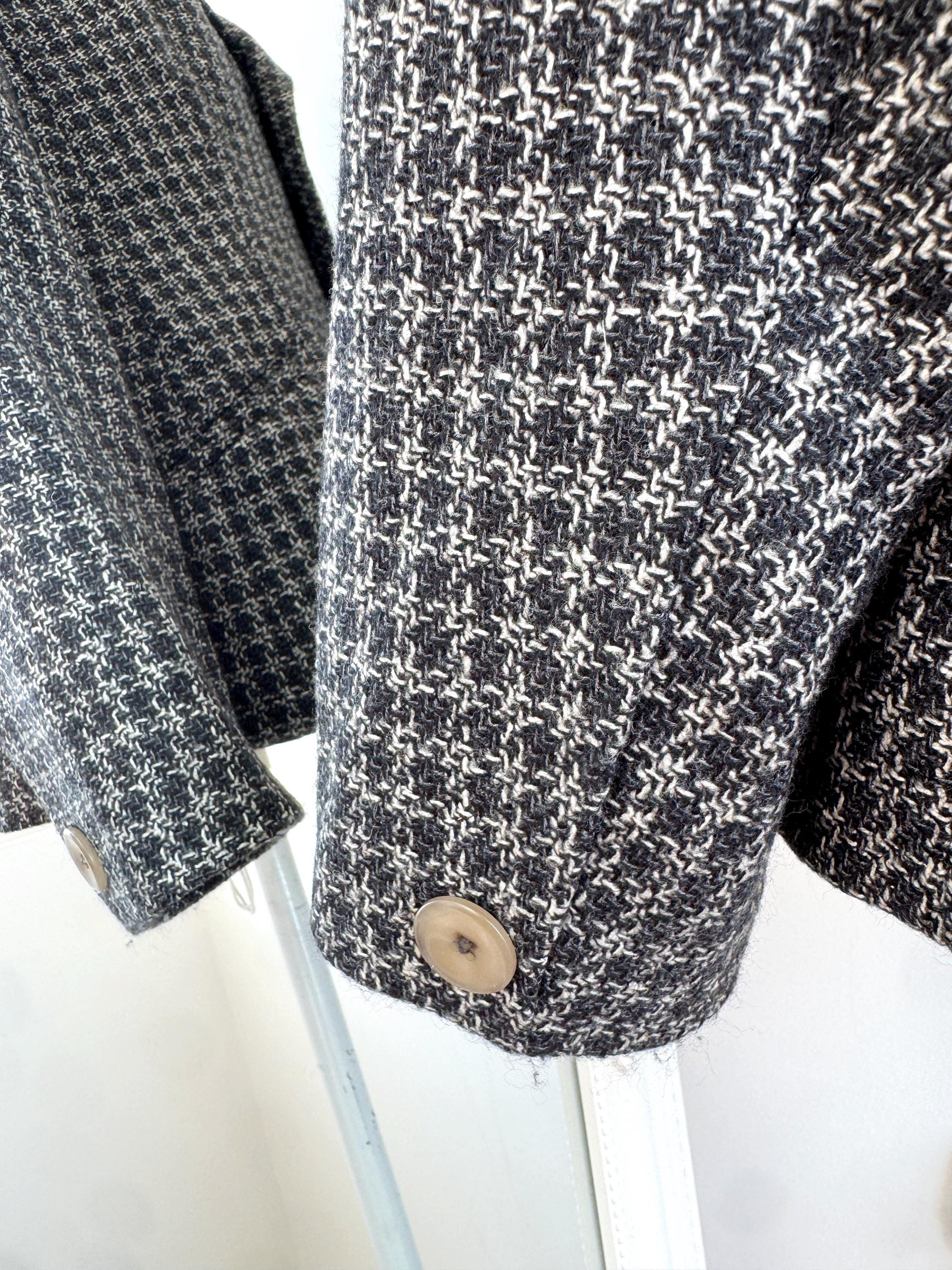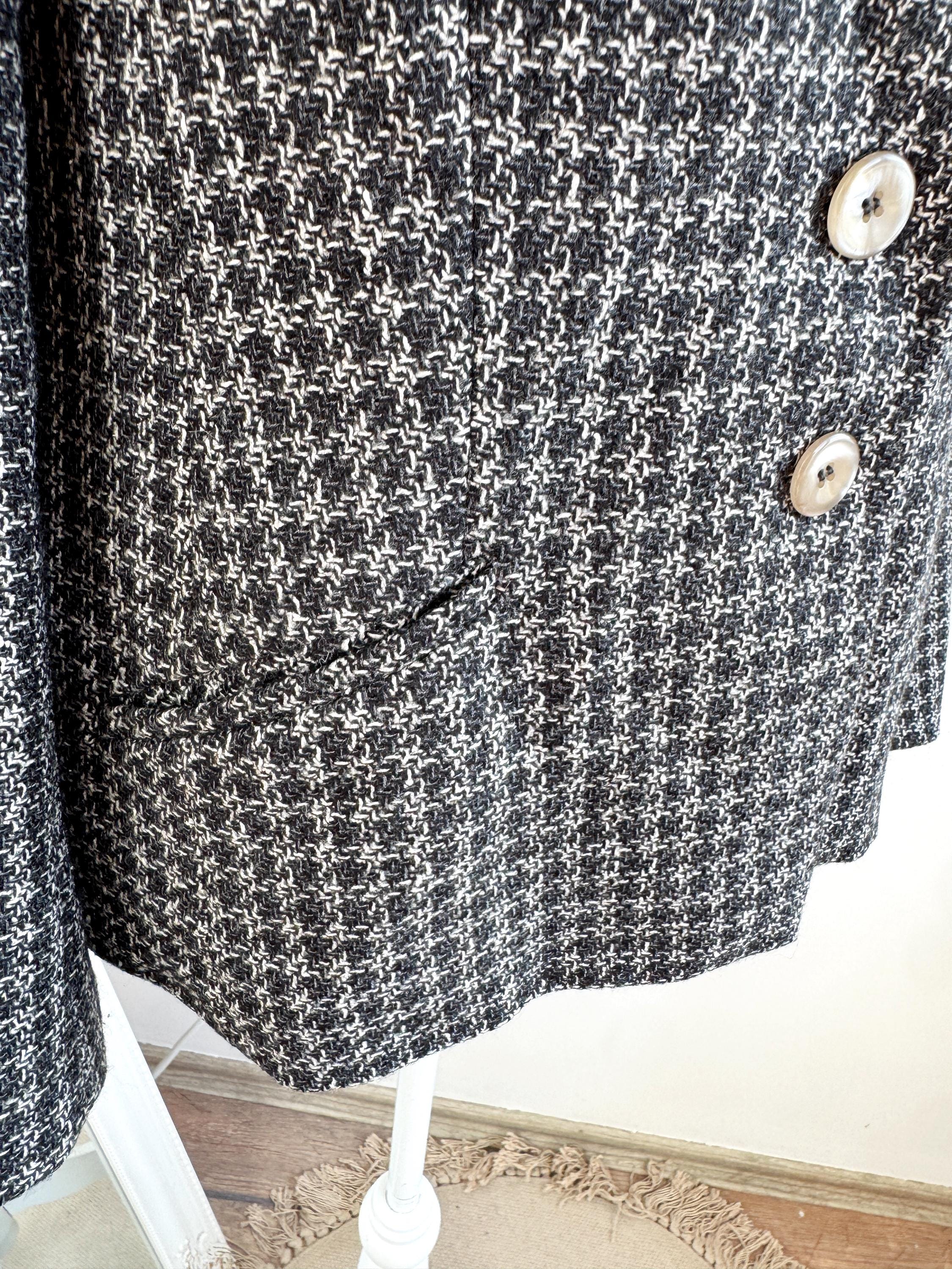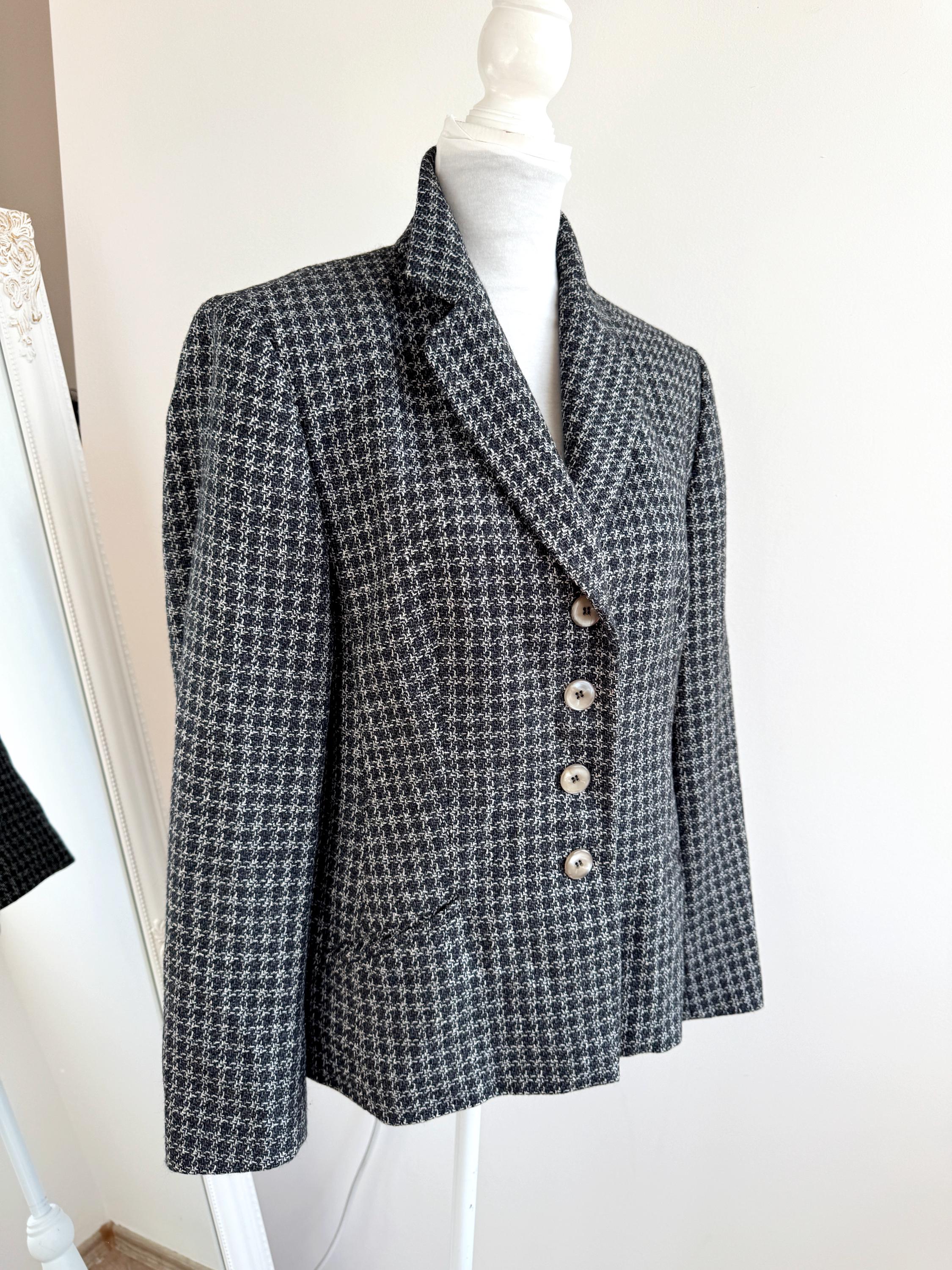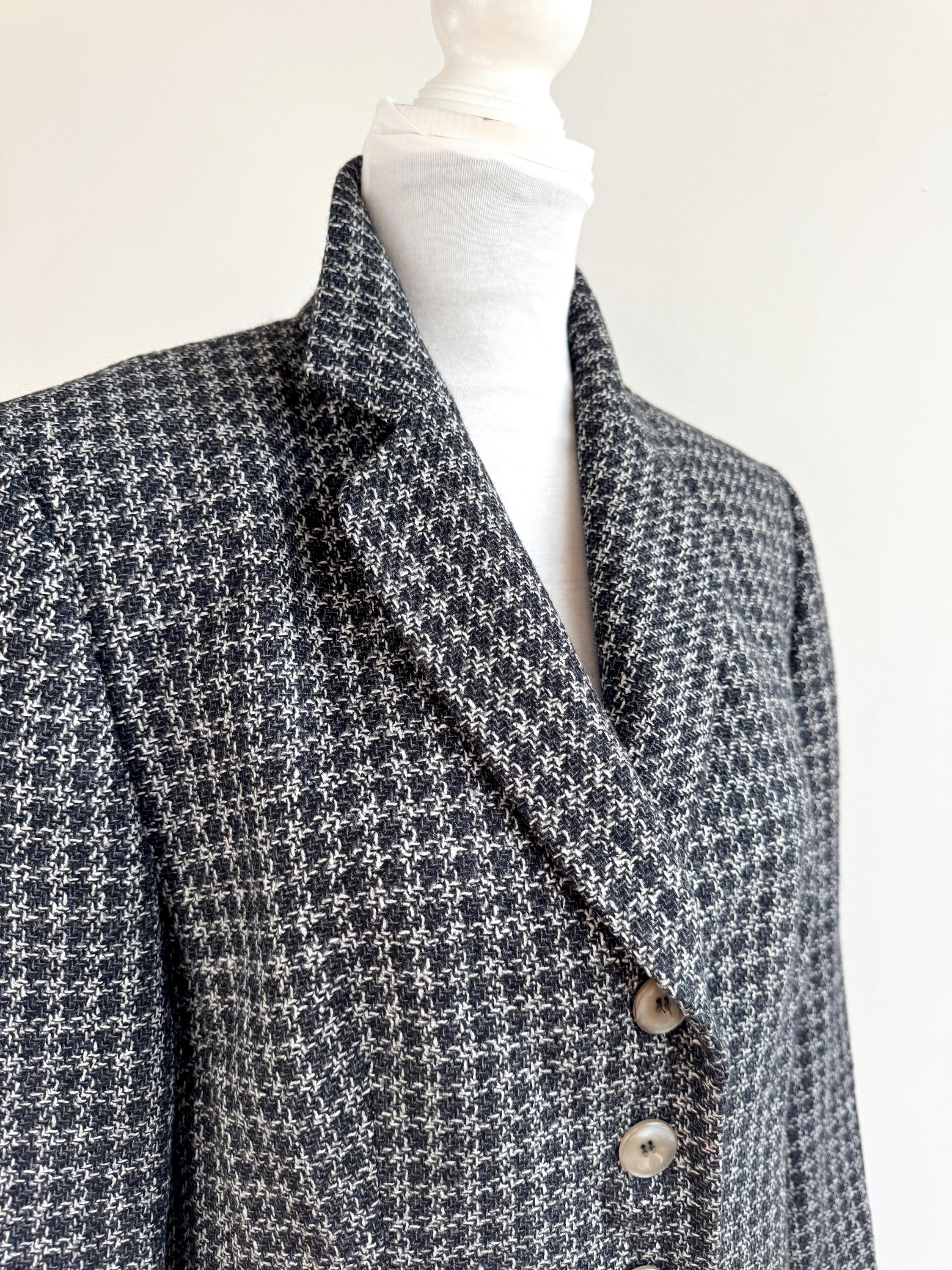 This is a vintage 90s Gerry Weber houndstooth blazer for women in size EUR 40, which fits like size L. This structured blazer is made of pure new wool in black and white check, giving it a charcoal grey look. Fully lined with acetate lining.
