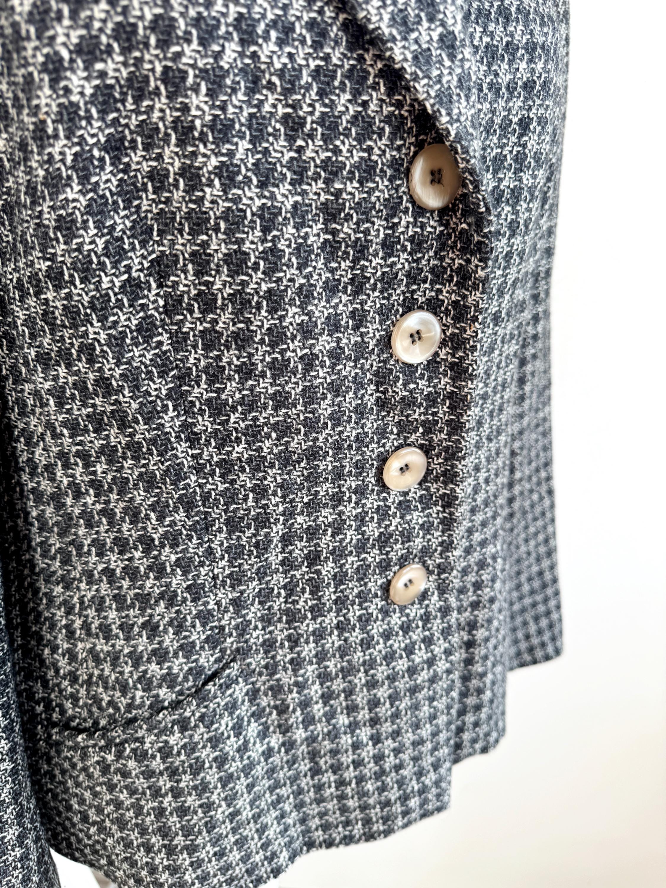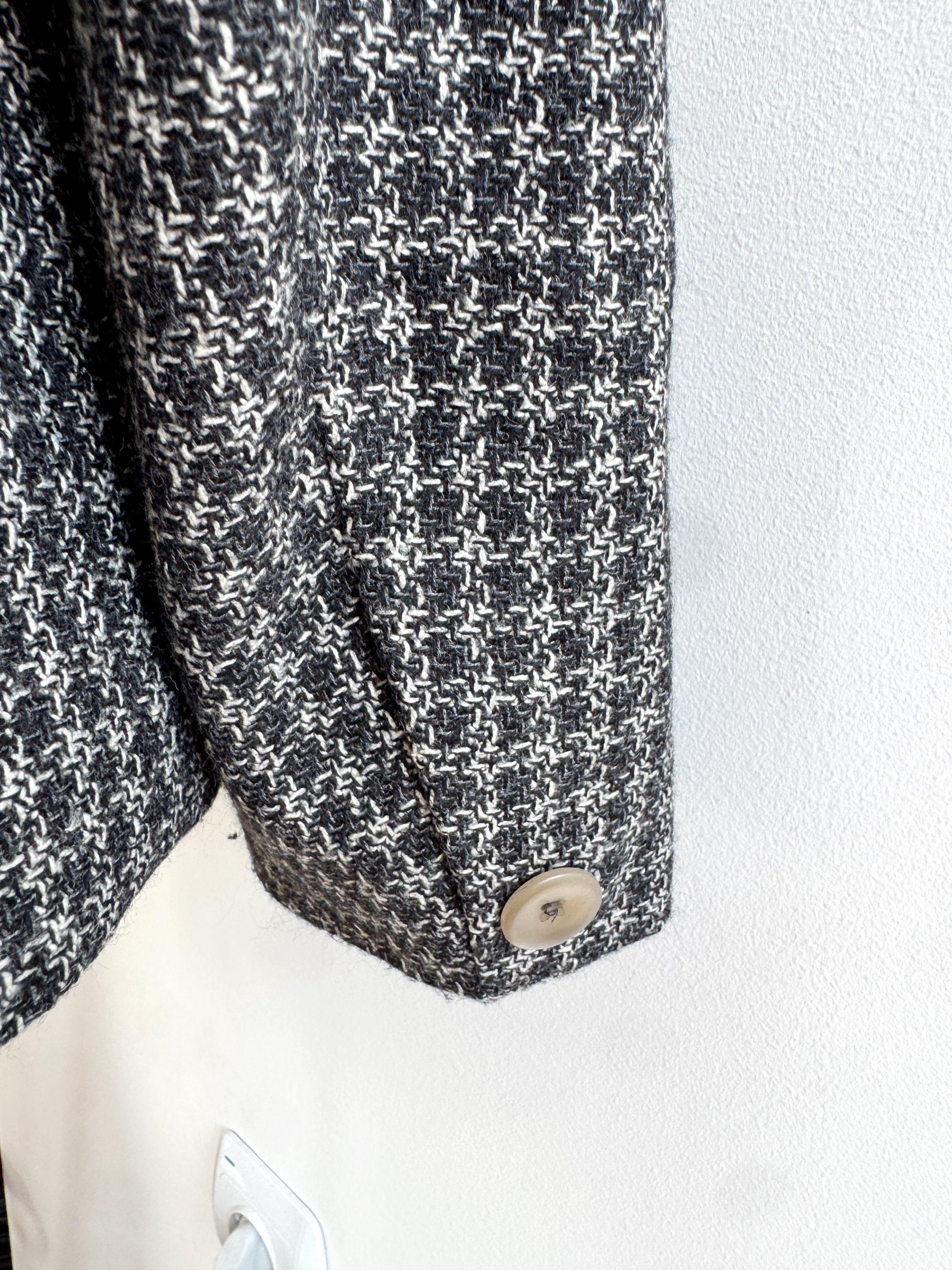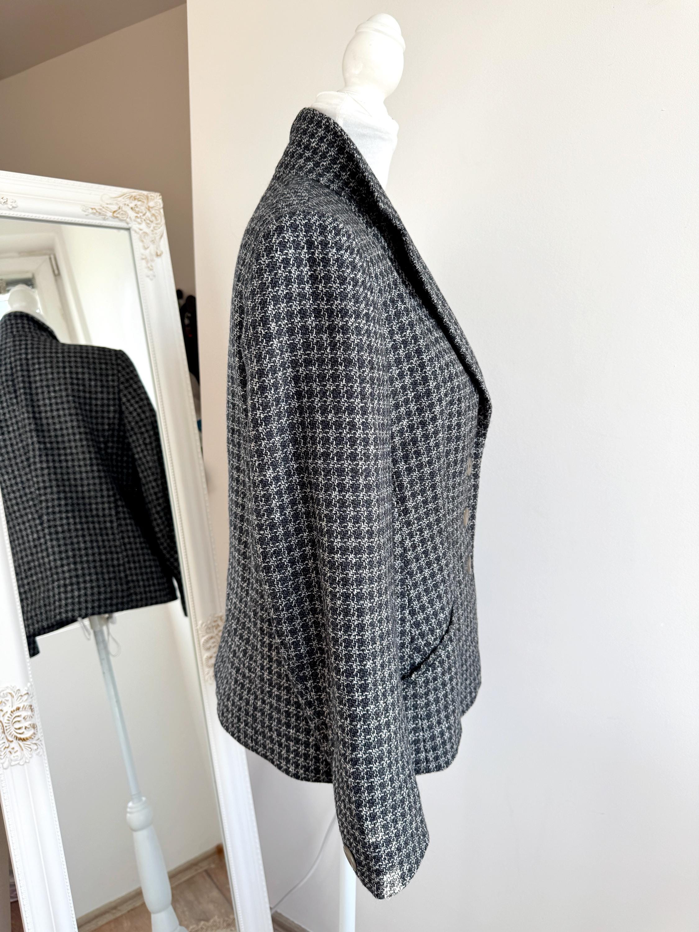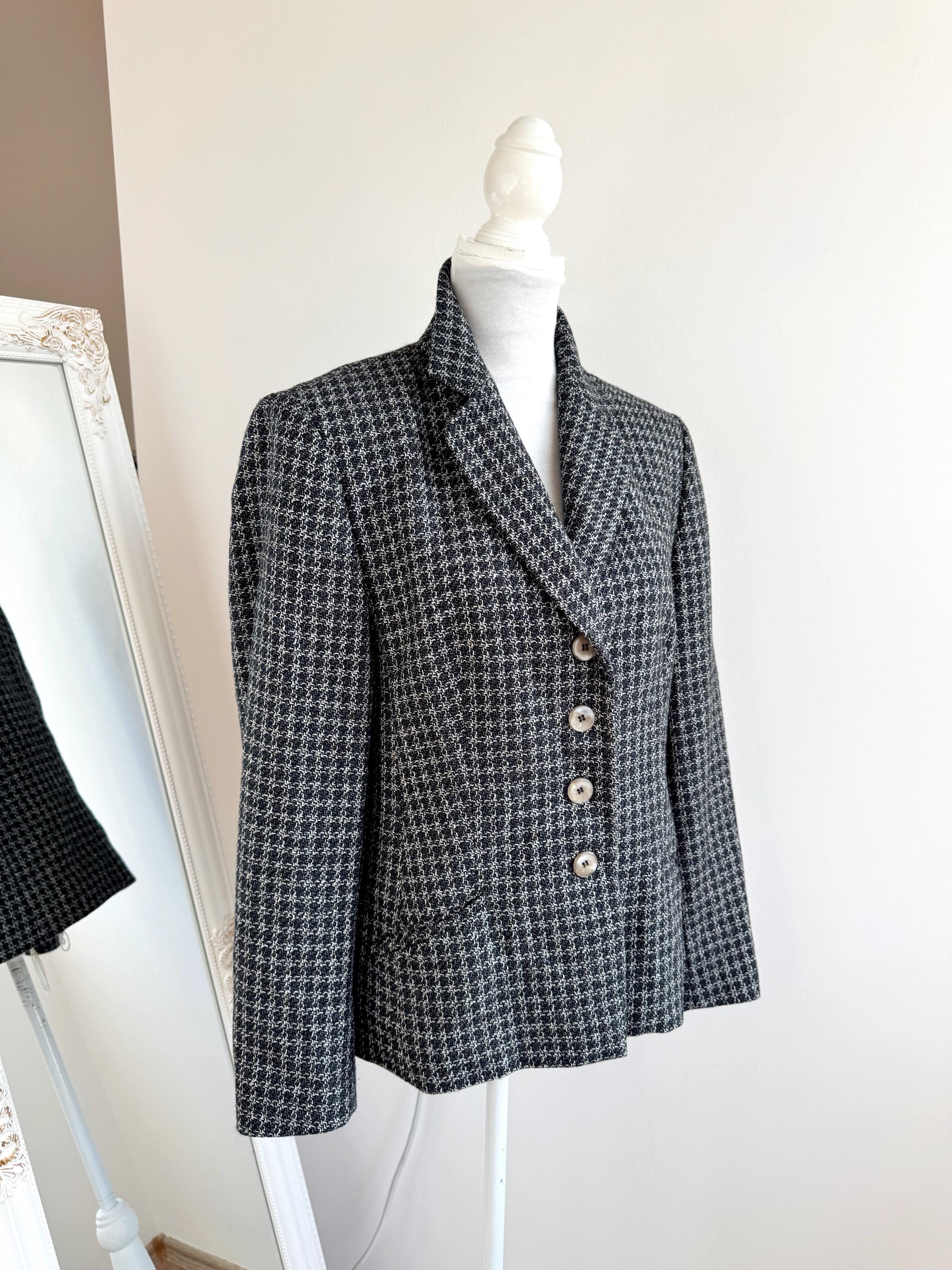 This is a vintage 90s Gerry Weber houndstooth blazer for women in size EUR 40, which fits like size L. This structured blazer is made of pure new wool in black and white check, giving it a charcoal grey look. Fully lined with acetate lining.