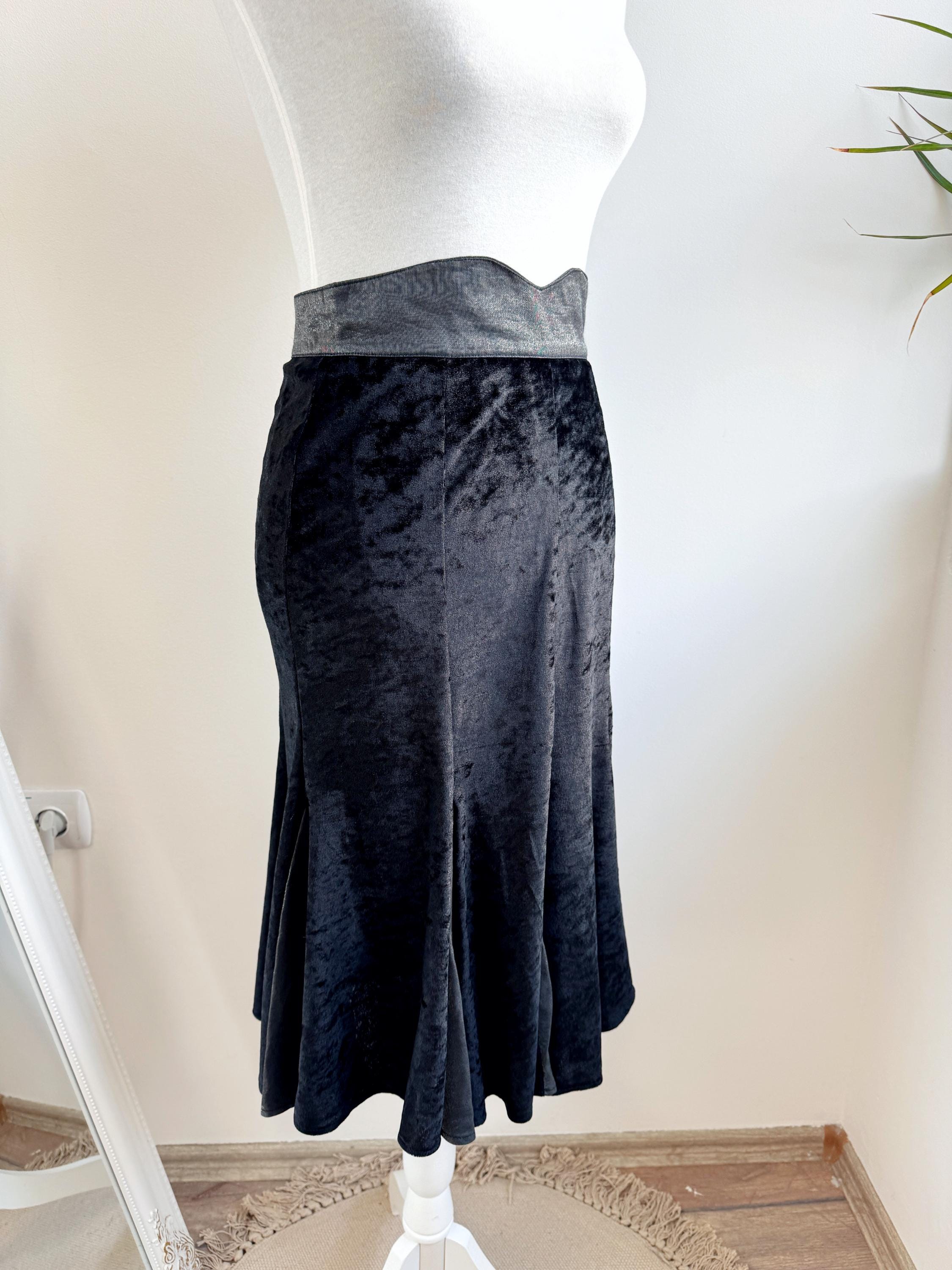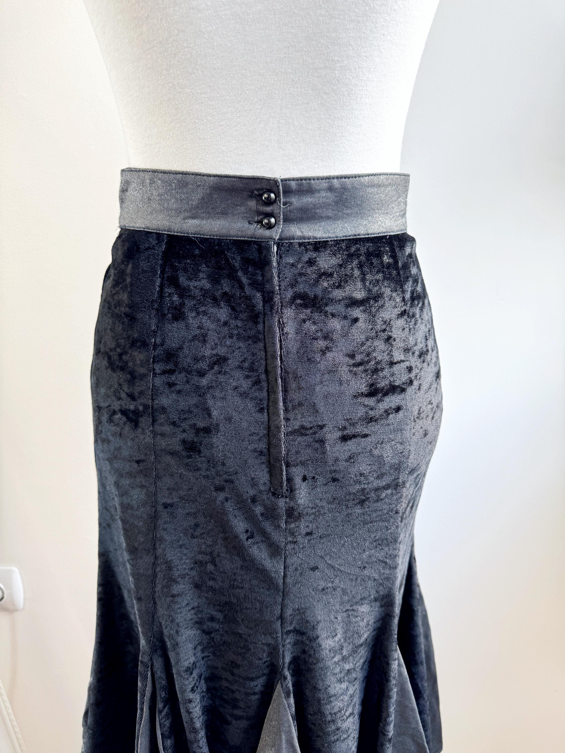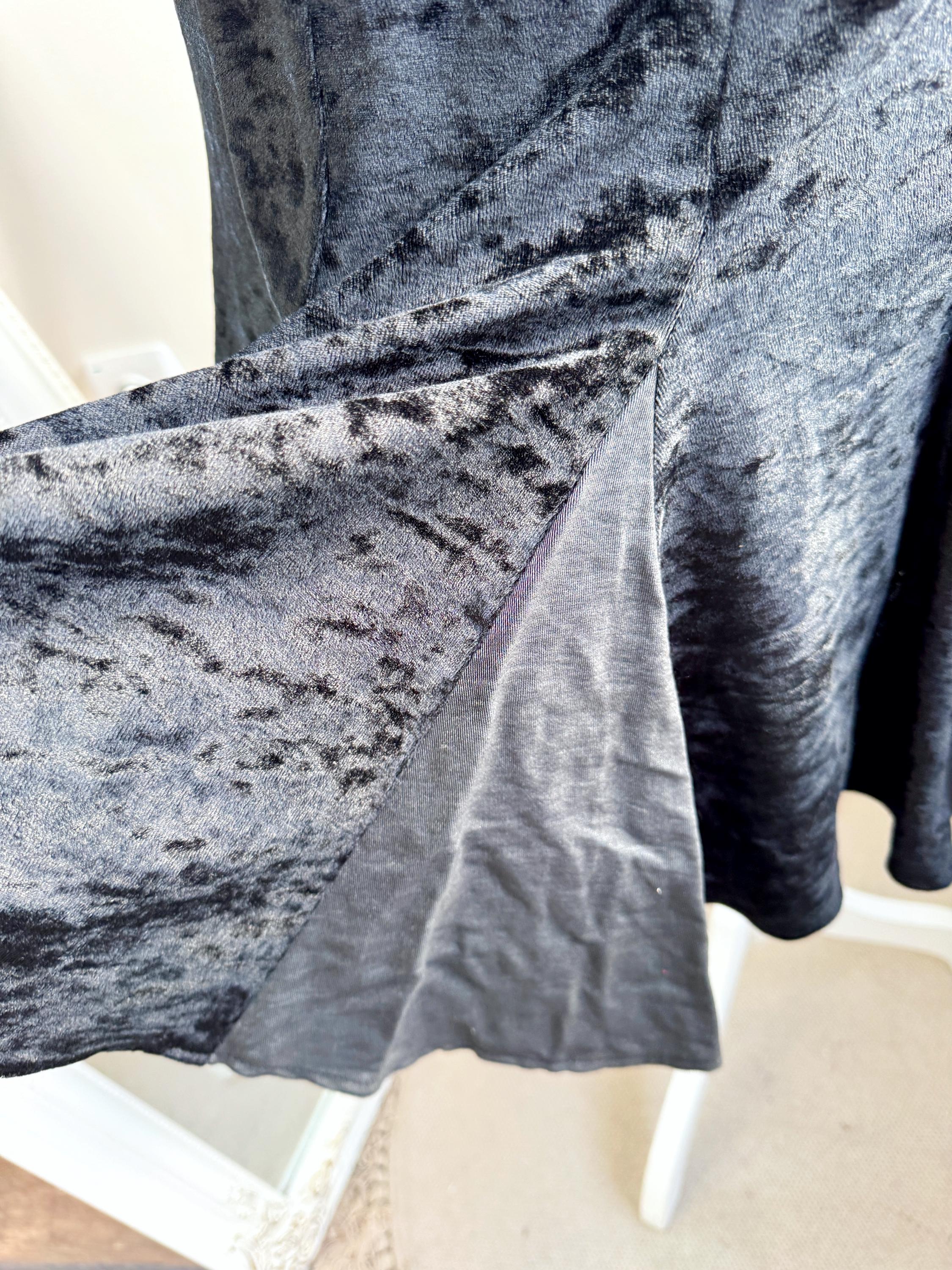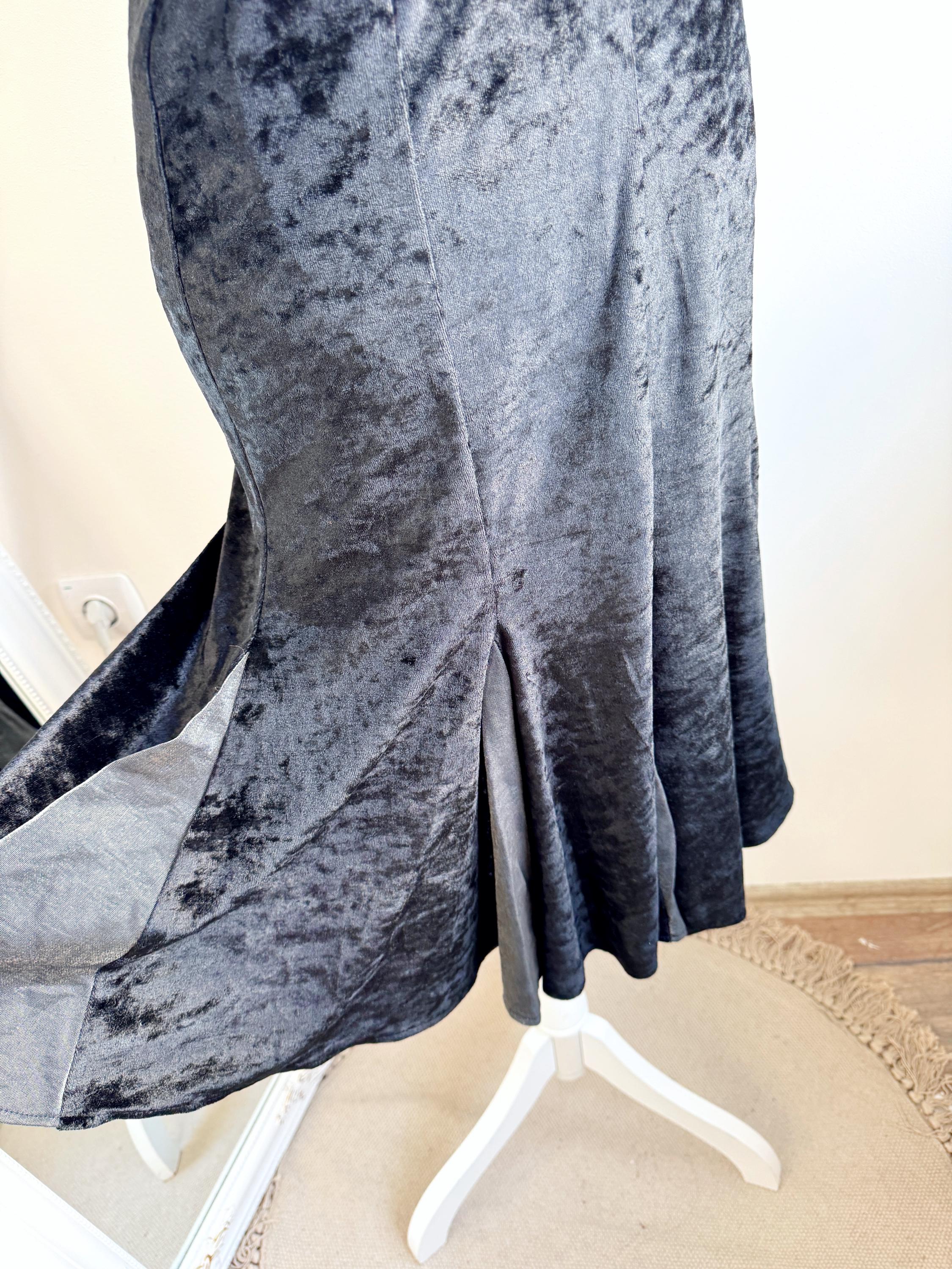 This is a lovely vintage 90s black crushed velvet mermaid midi skirt with flared hem and back zip and button closure in size EUR 38, which fits like S.