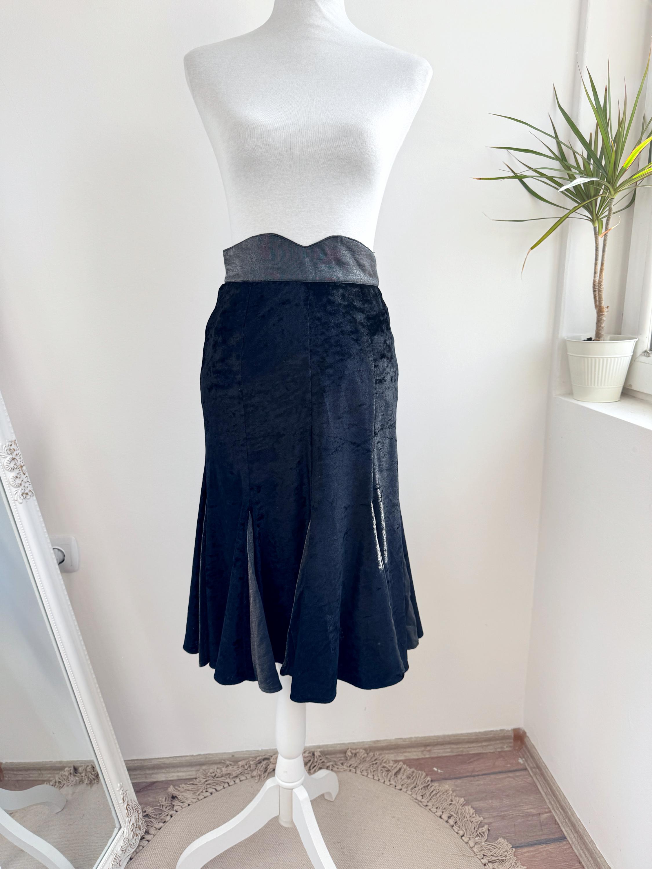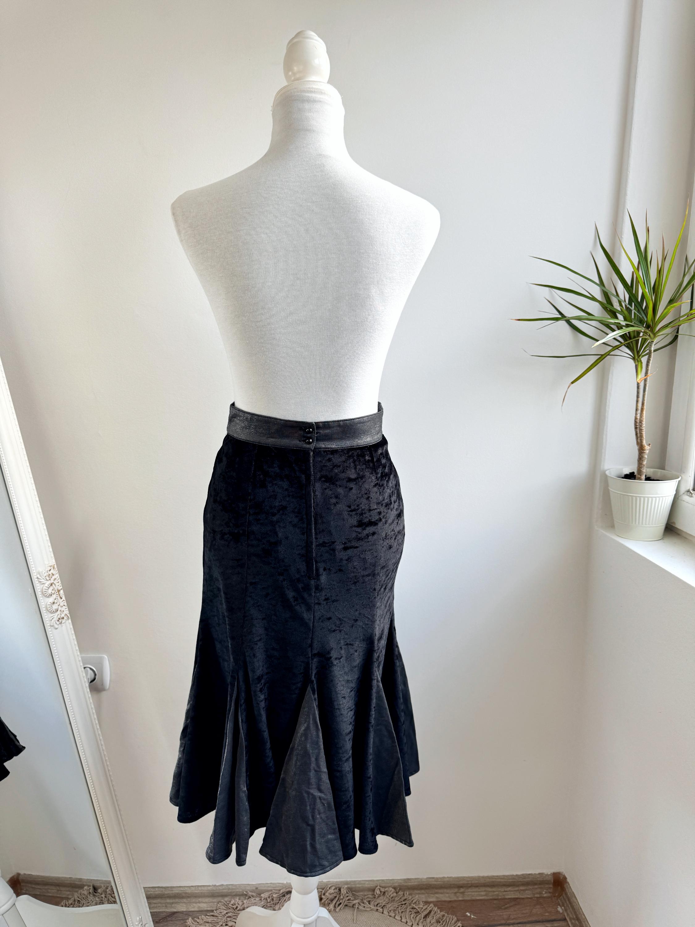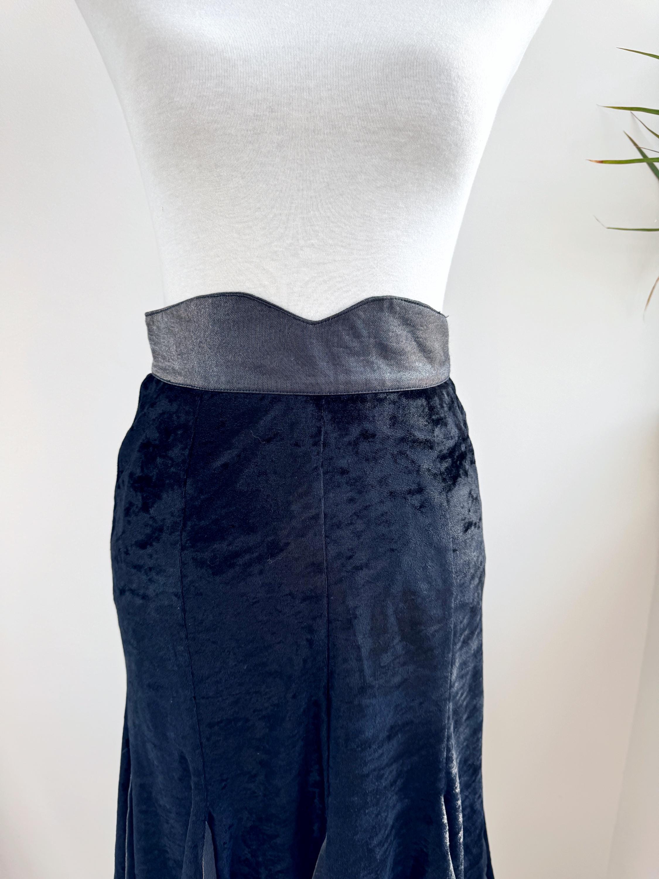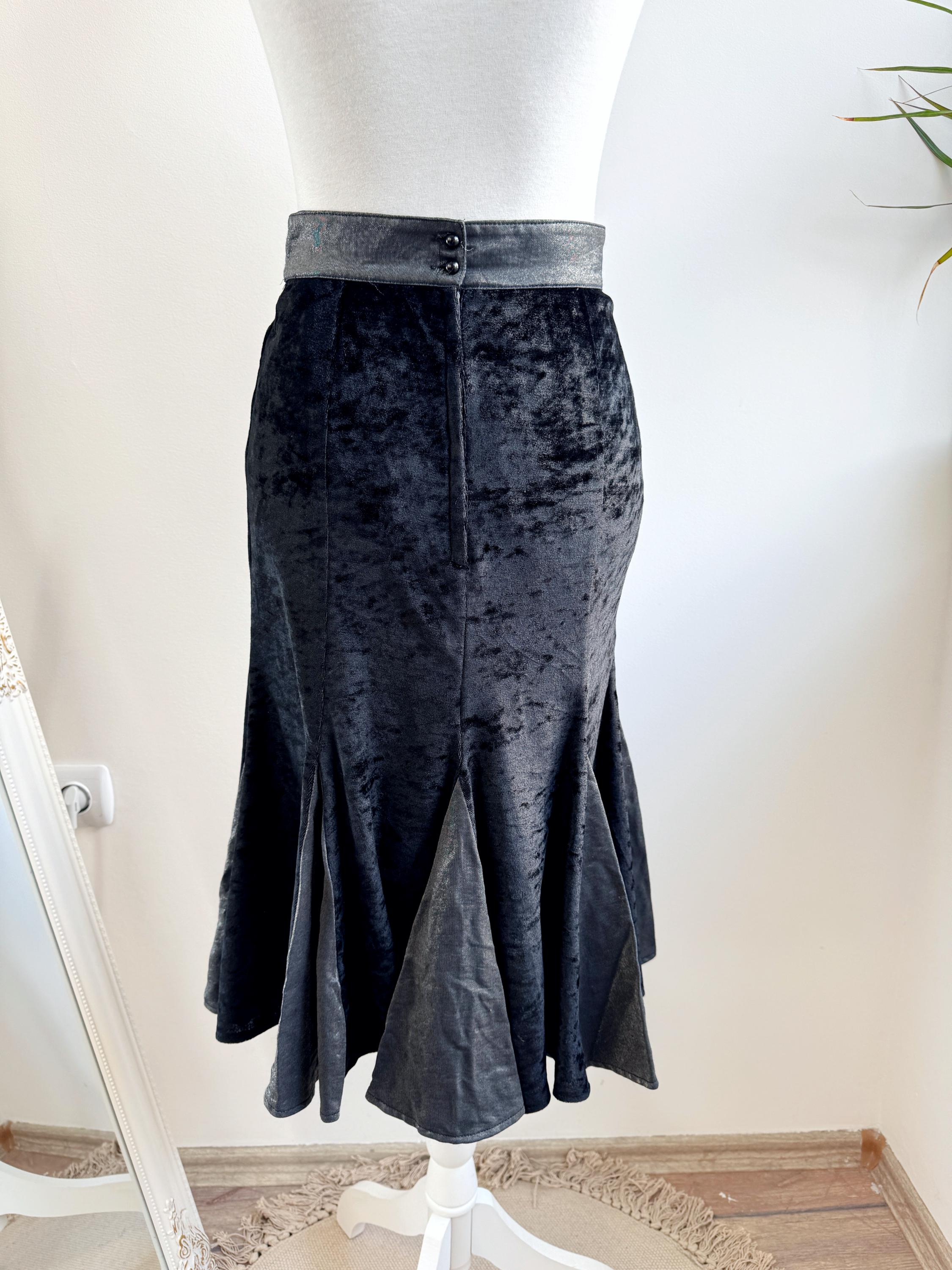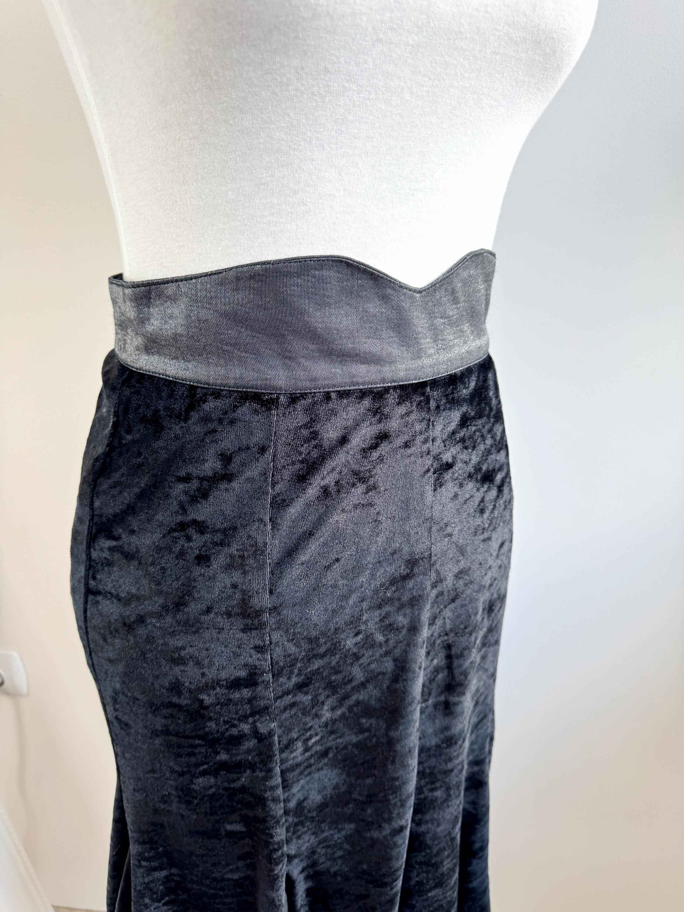 This is a lovely vintage 90s black crushed velvet mermaid midi skirt with flared hem and back zip and button closure in size EUR 38, which fits like S.
