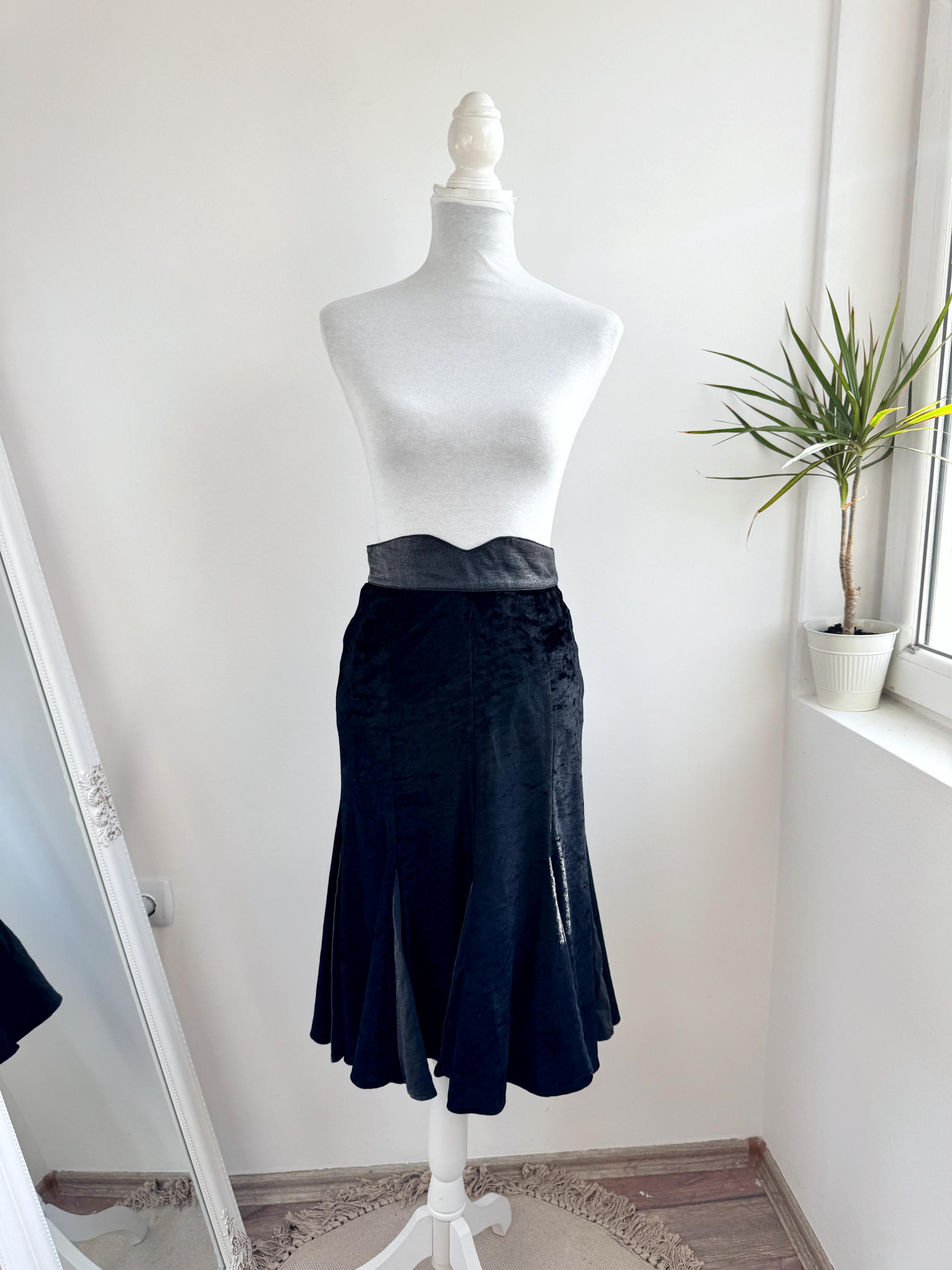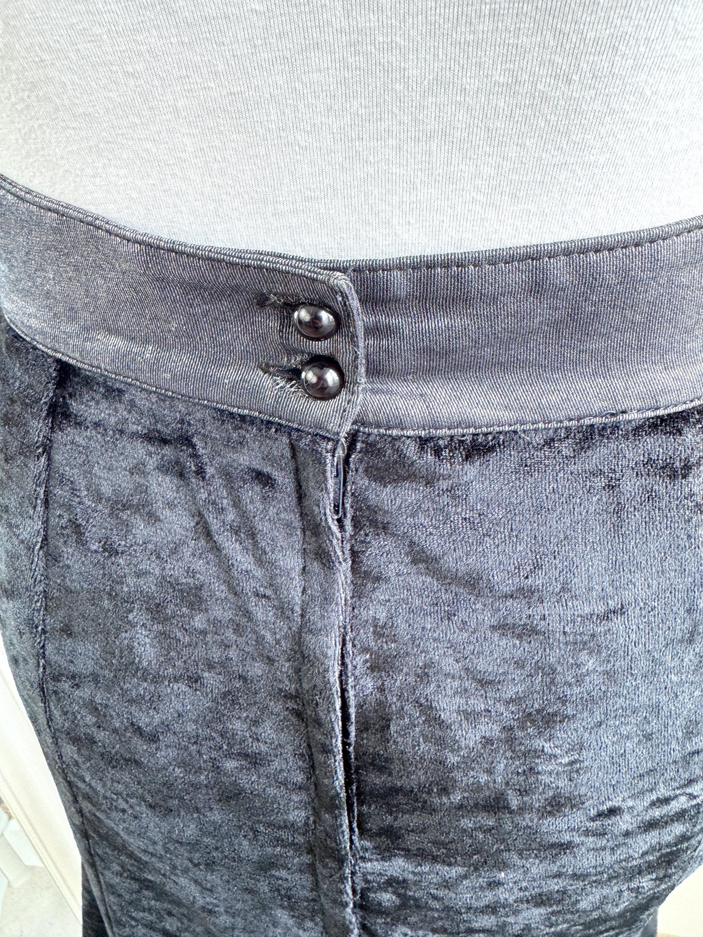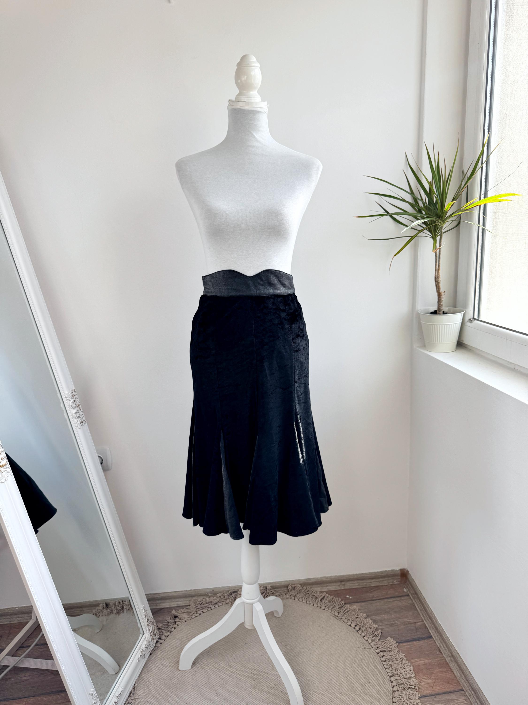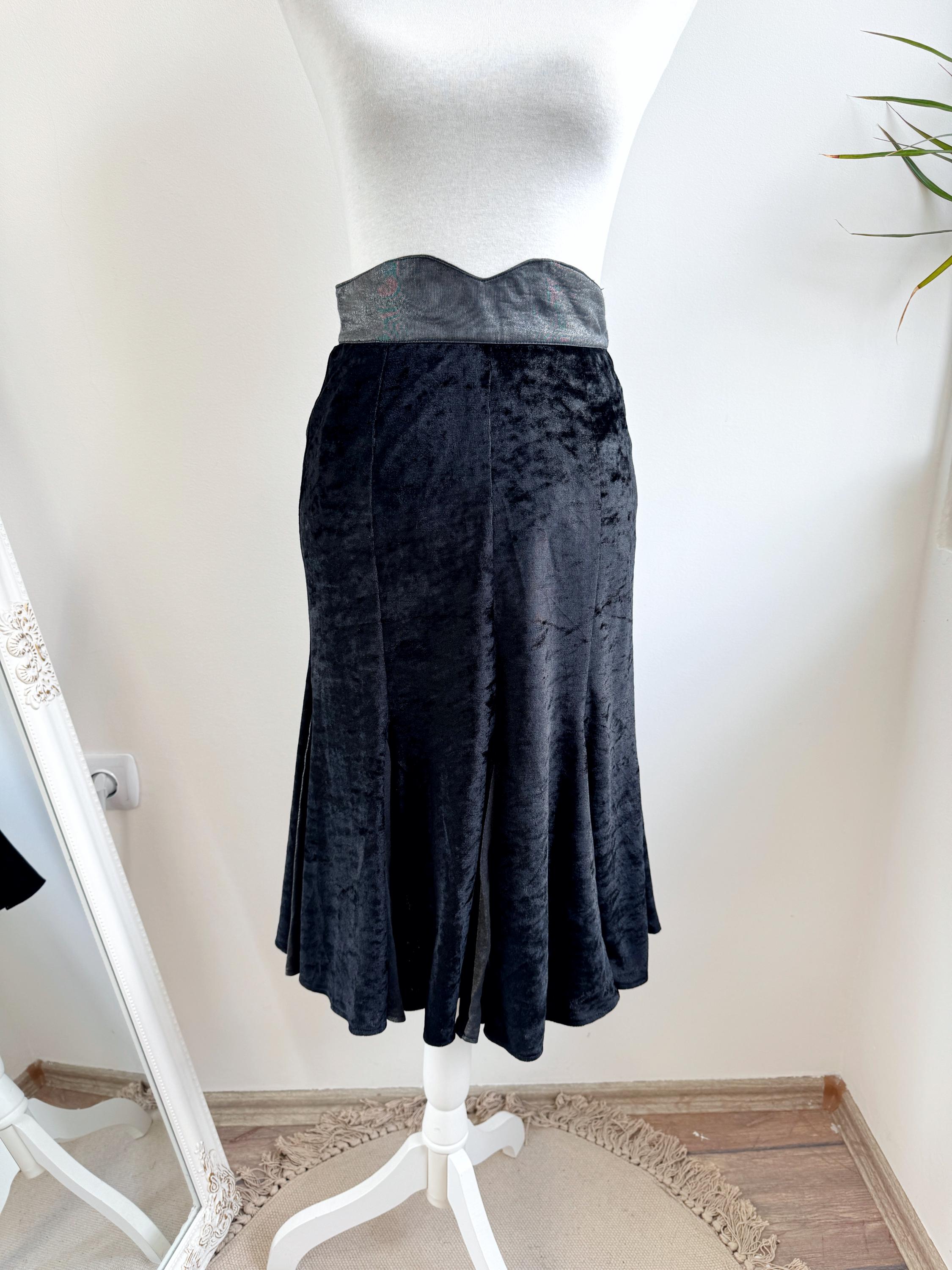 This is a lovely vintage 90s black crushed velvet mermaid midi skirt with flared hem and back zip and button closure in size EUR 38, which fits like S.