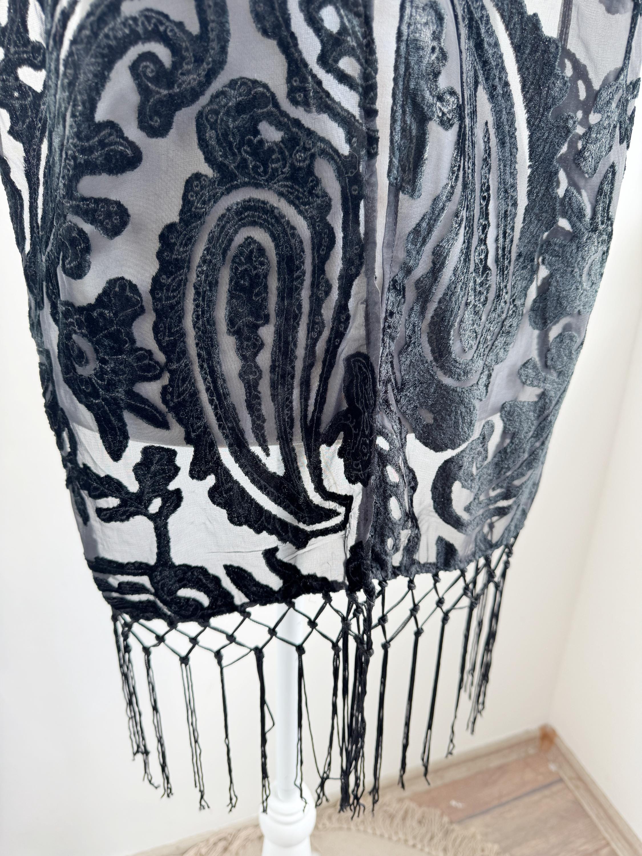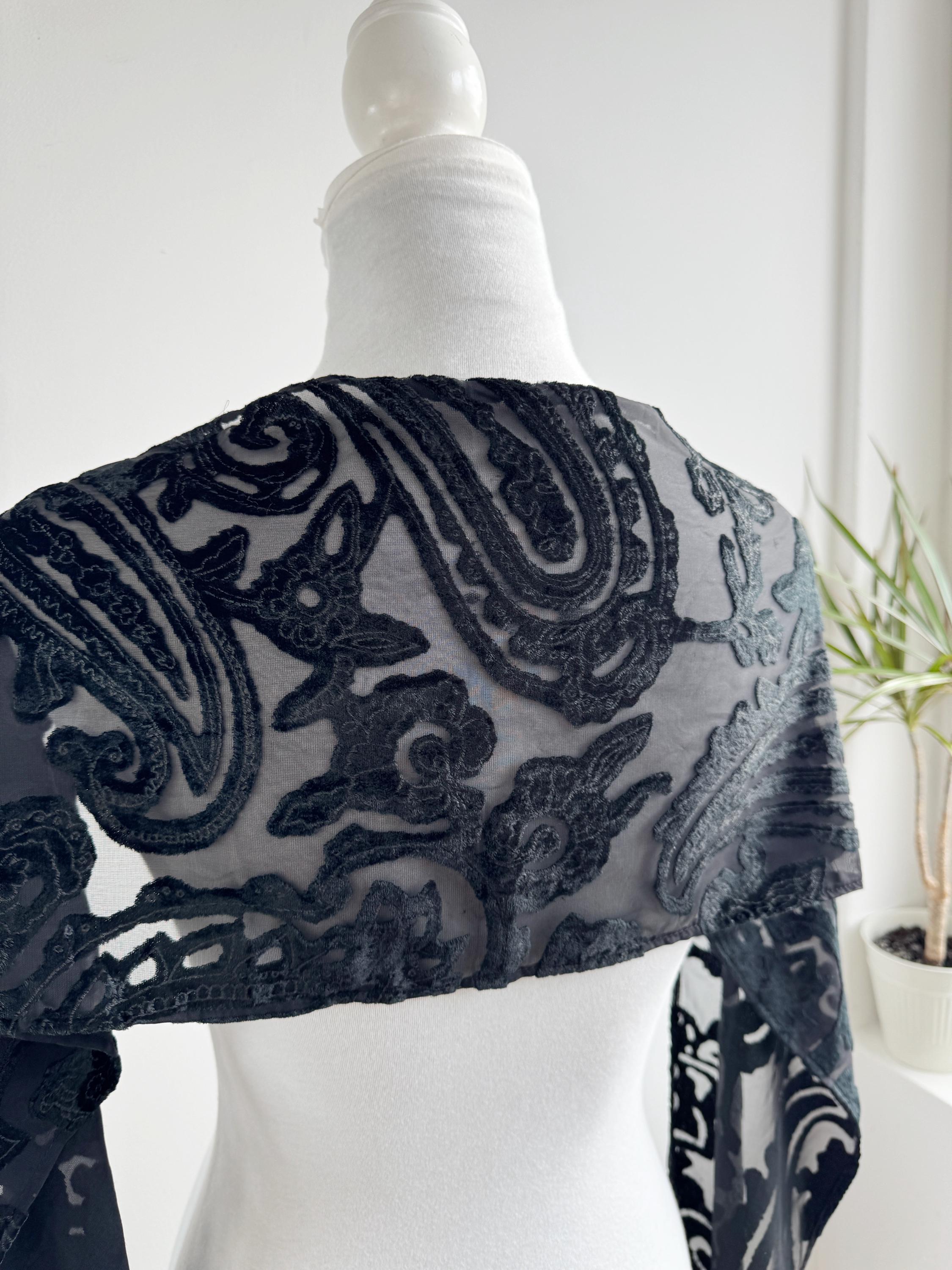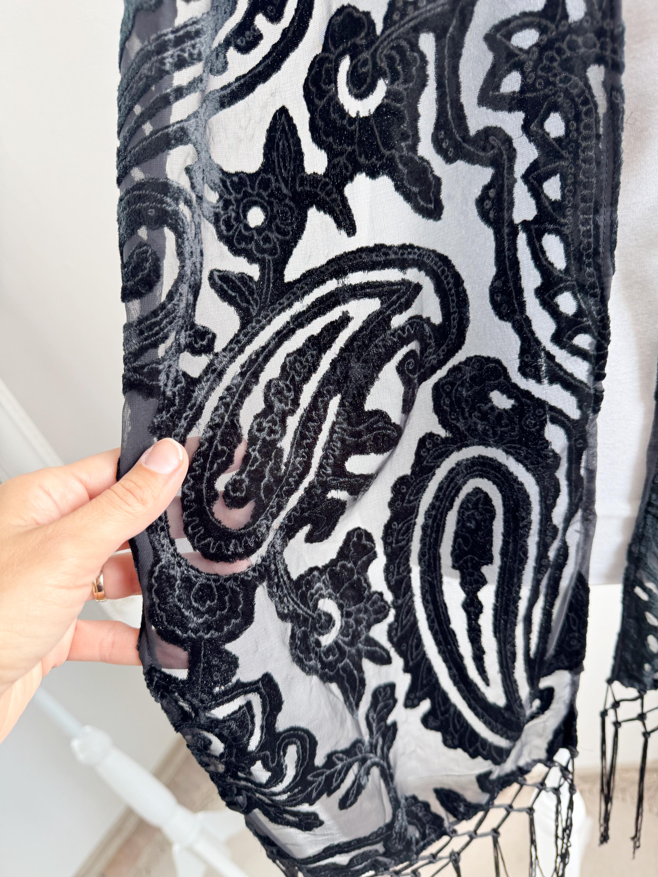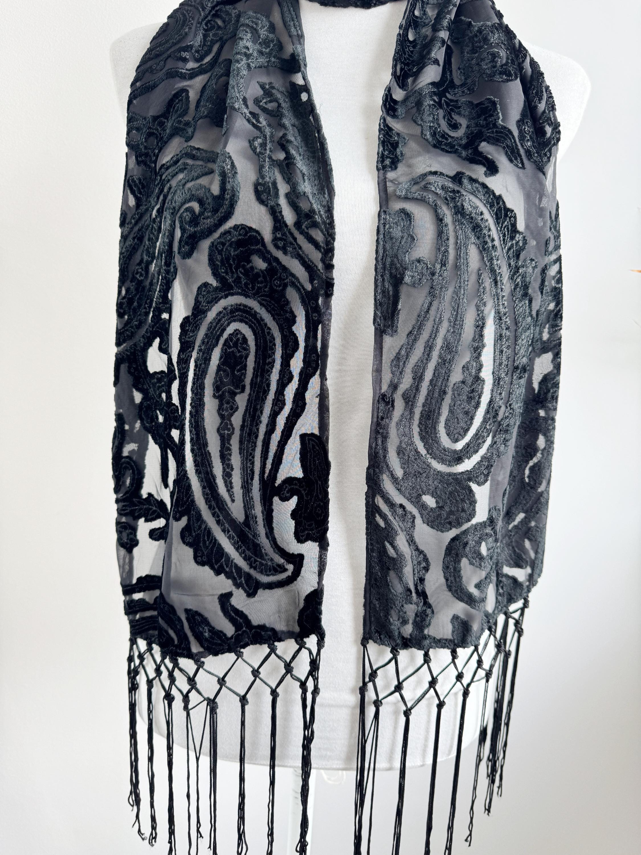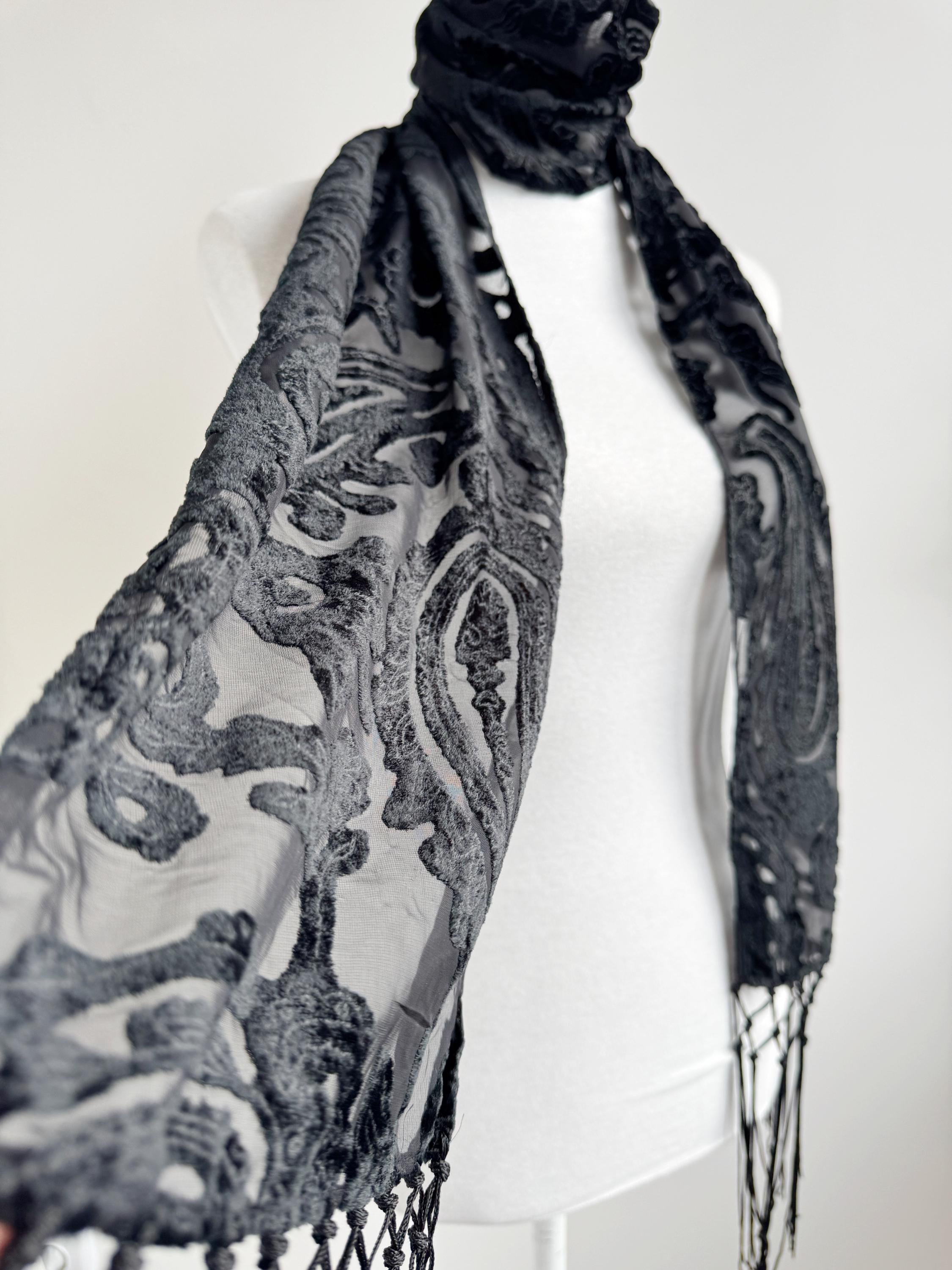 This is a sheer devore scarf with paisley floral flocked damask print and long fringe made of synthetic fabric. Lovely delivate art deco evening wrap to pair with evening gowns or goth chic accessory.