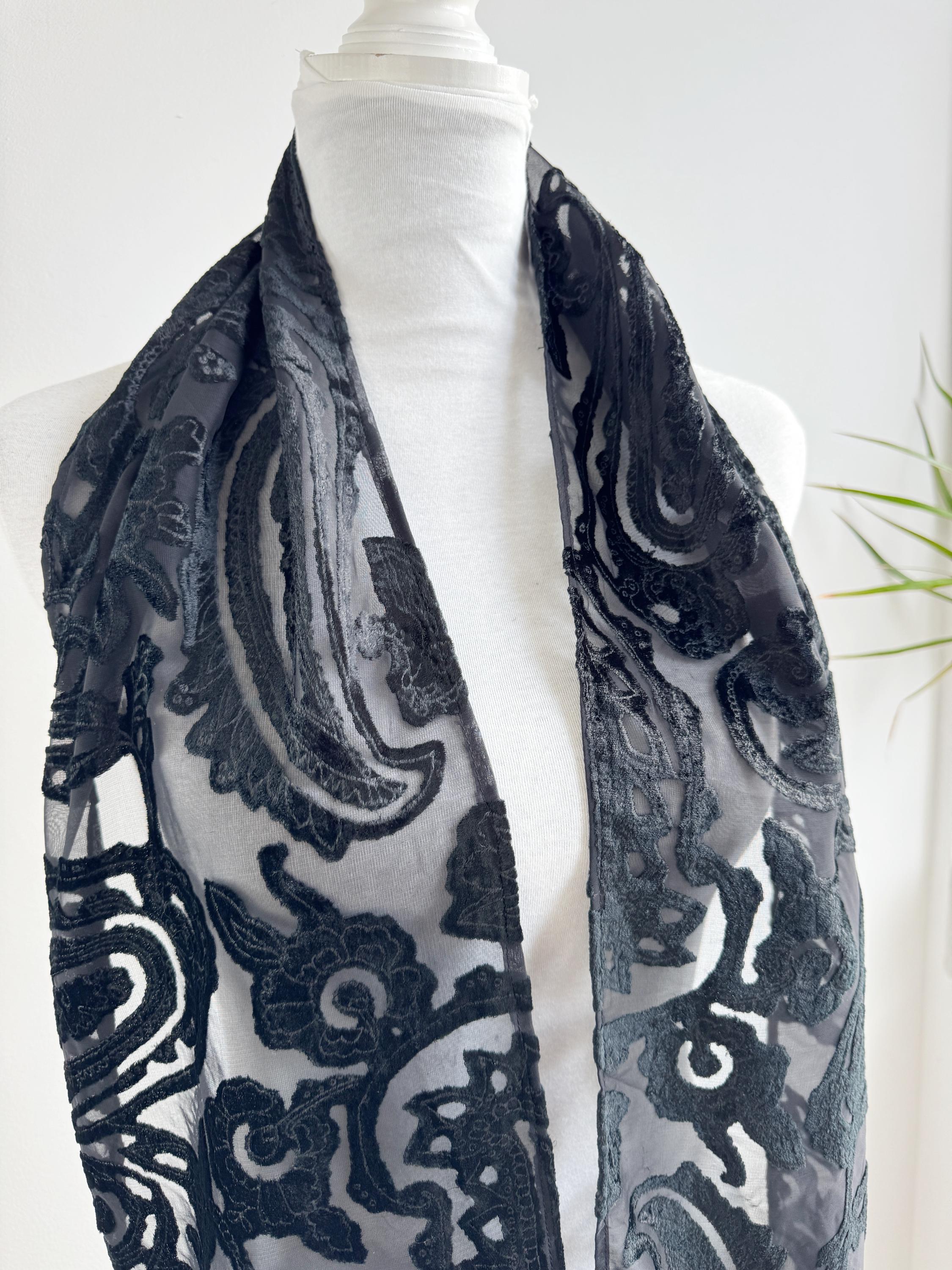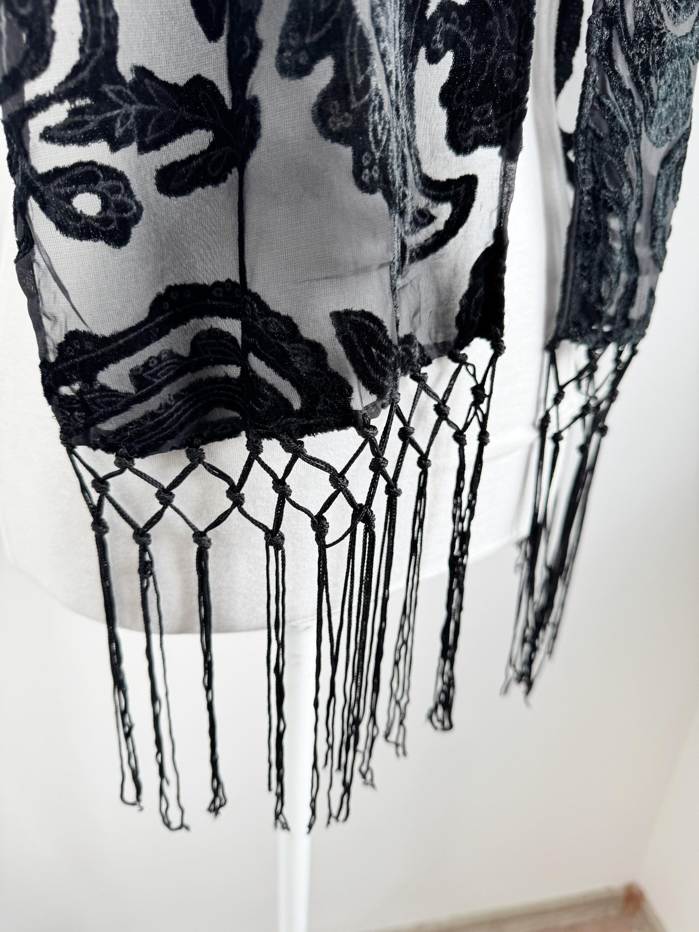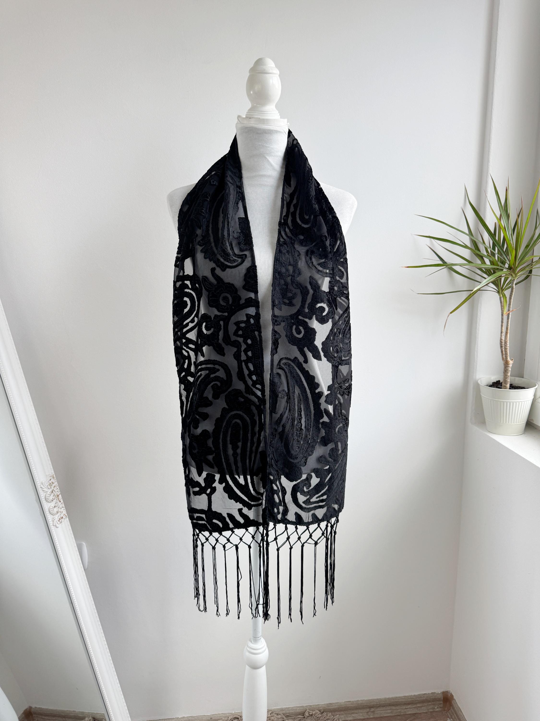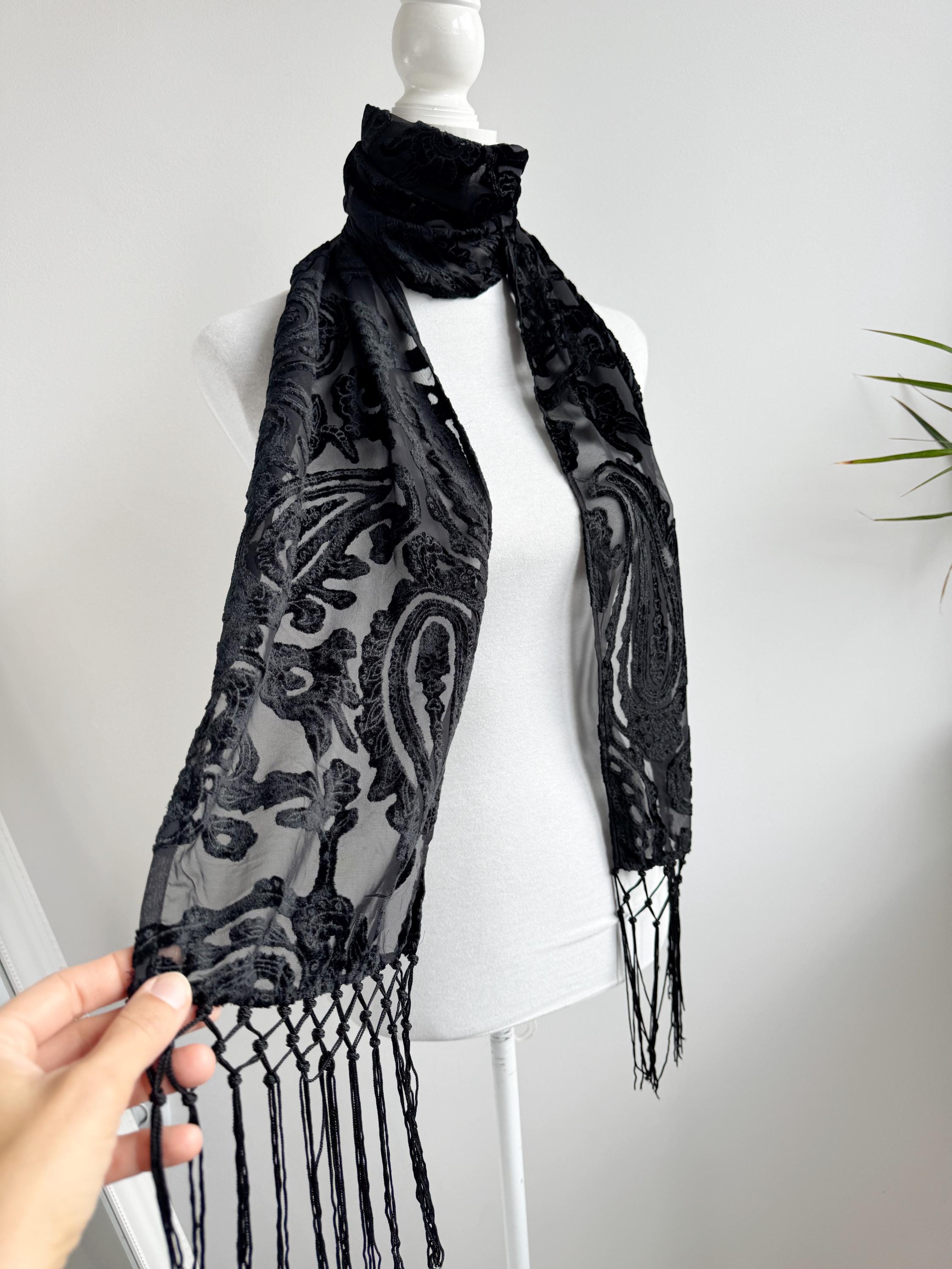 This is a sheer devore scarf with paisley floral flocked damask print and long fringe made of synthetic fabric. Lovely delivate art deco evening wrap to pair with evening gowns or goth chic accessory.