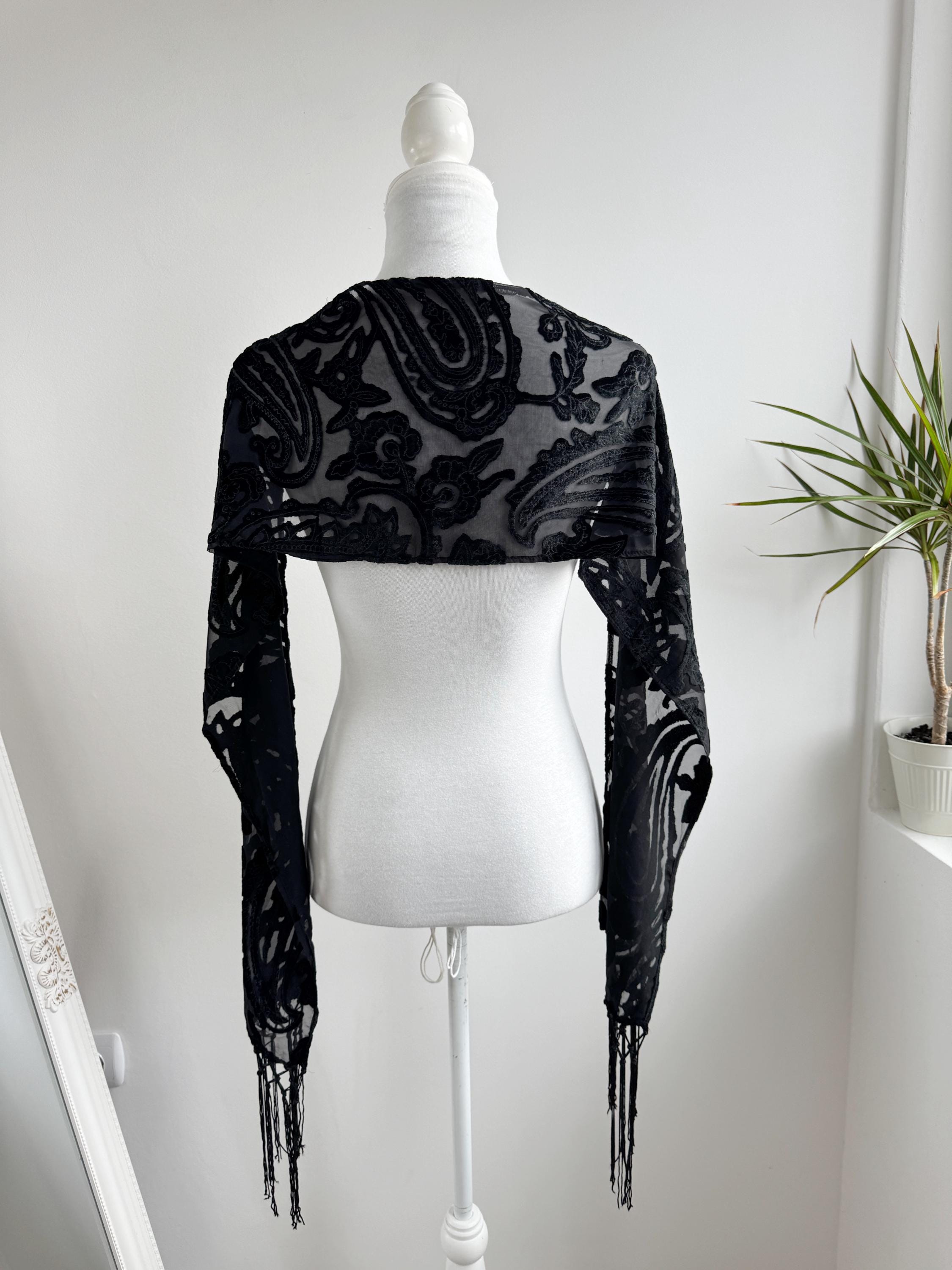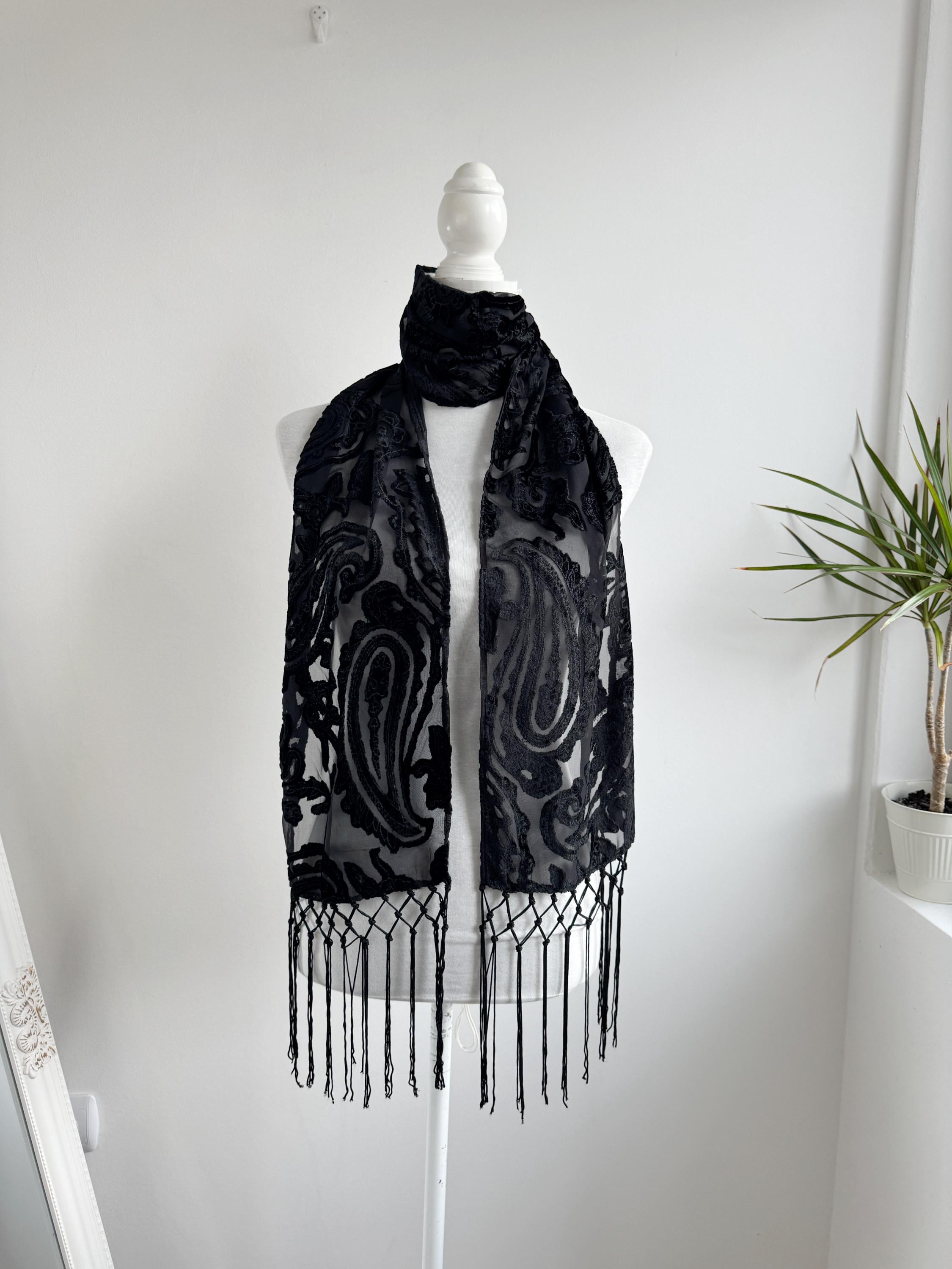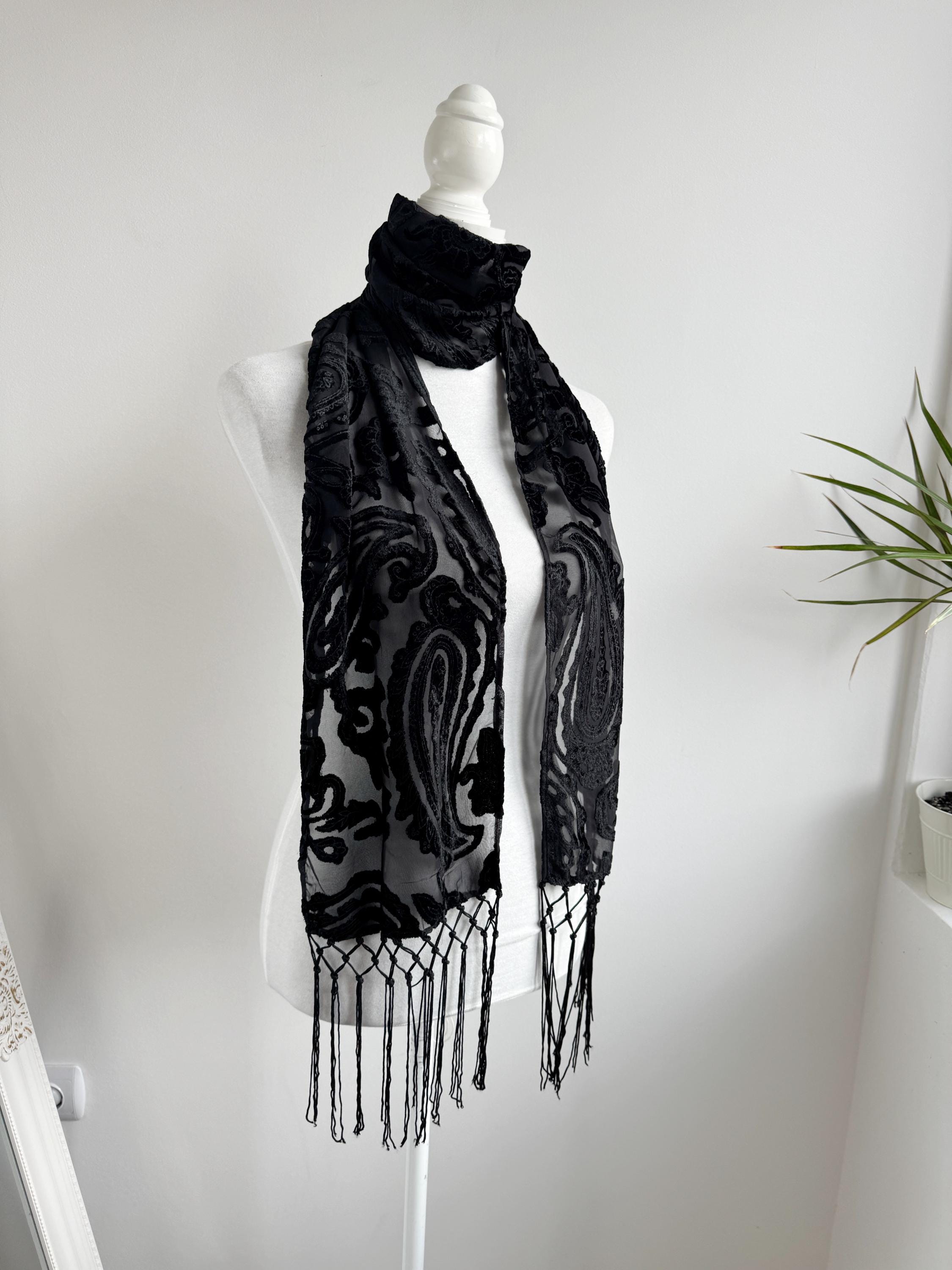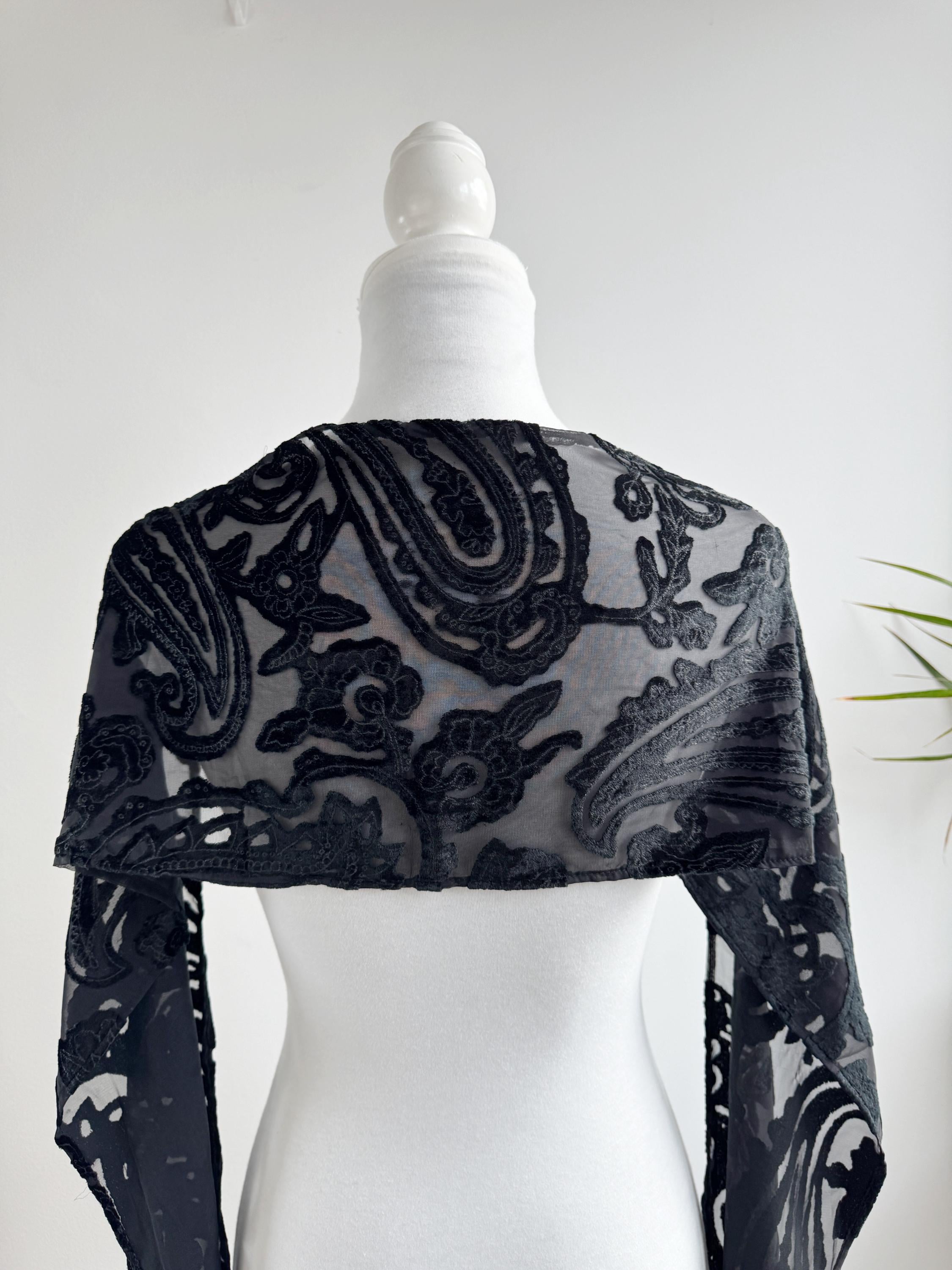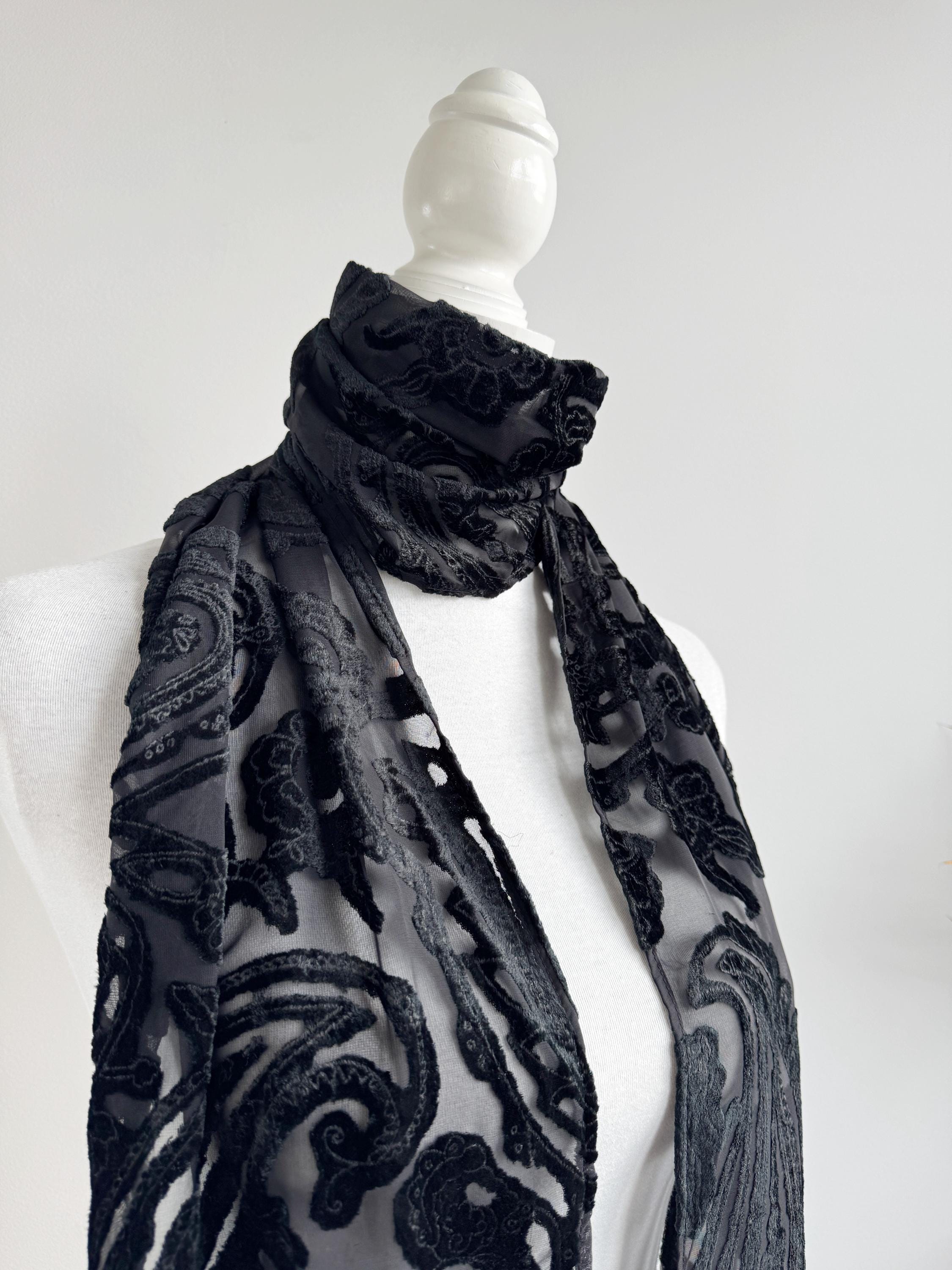 This is a sheer devore scarf with paisley floral flocked damask print and long fringe made of synthetic fabric. Lovely delivate art deco evening wrap to pair with evening gowns or goth chic accessory.
