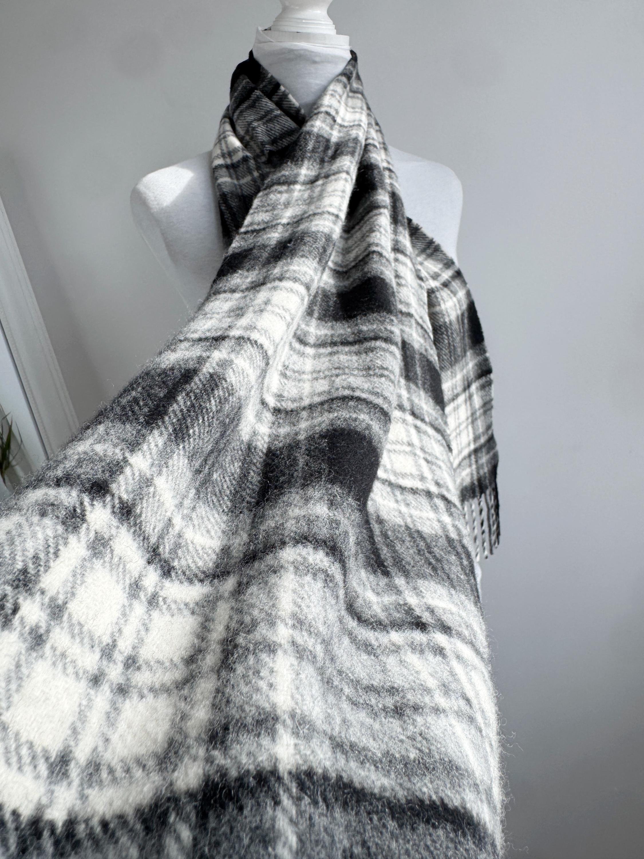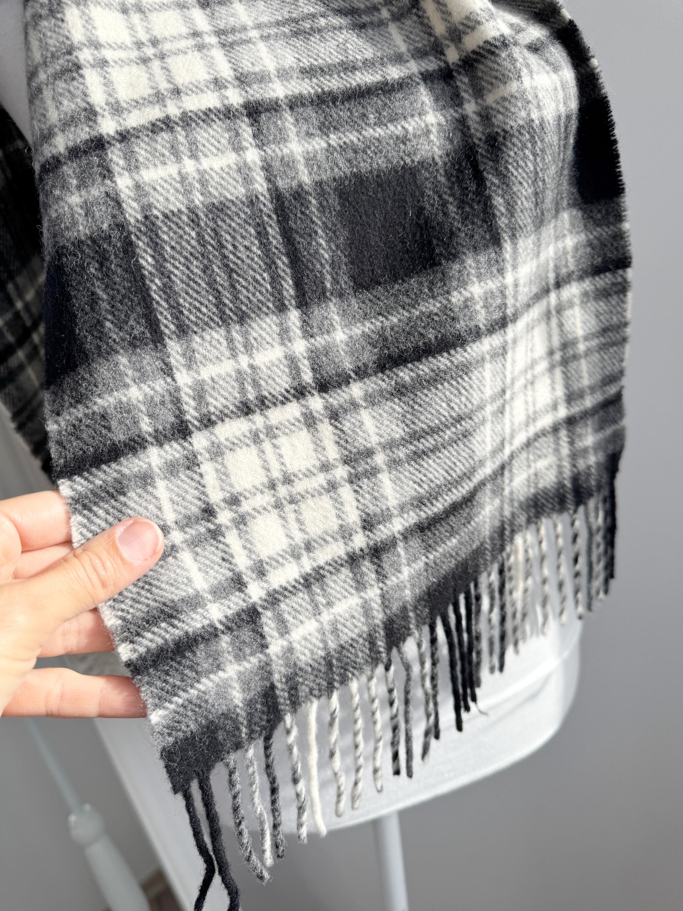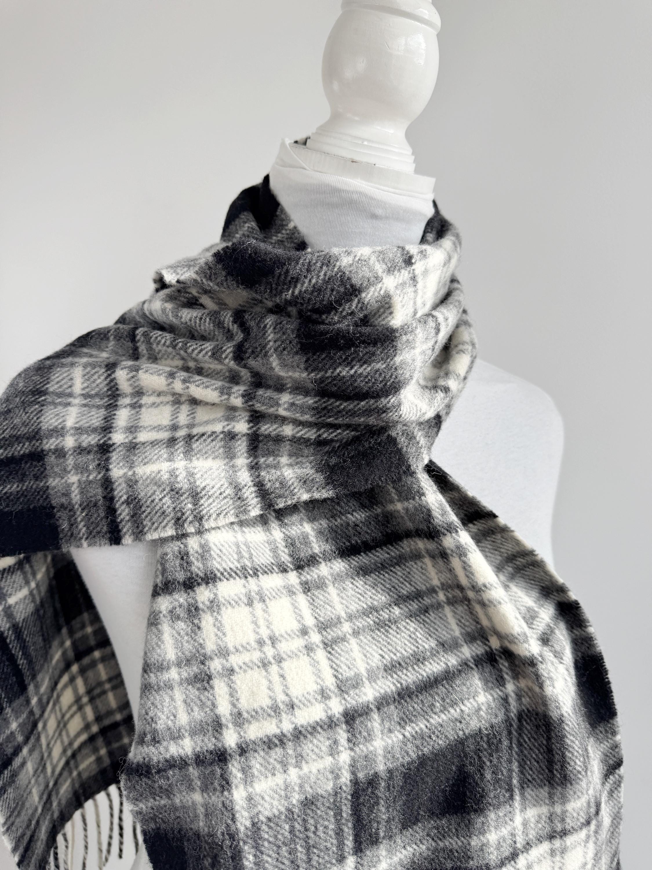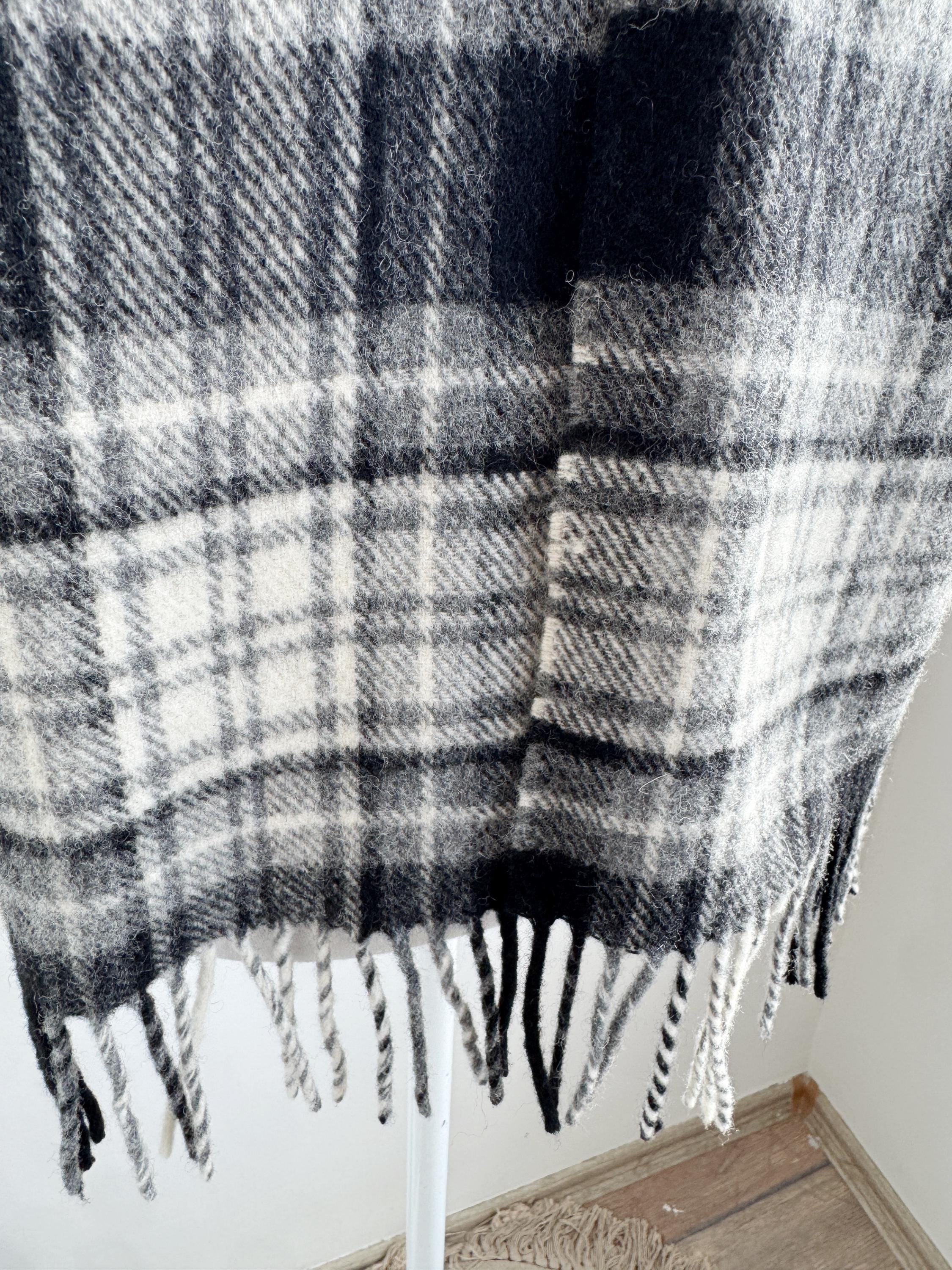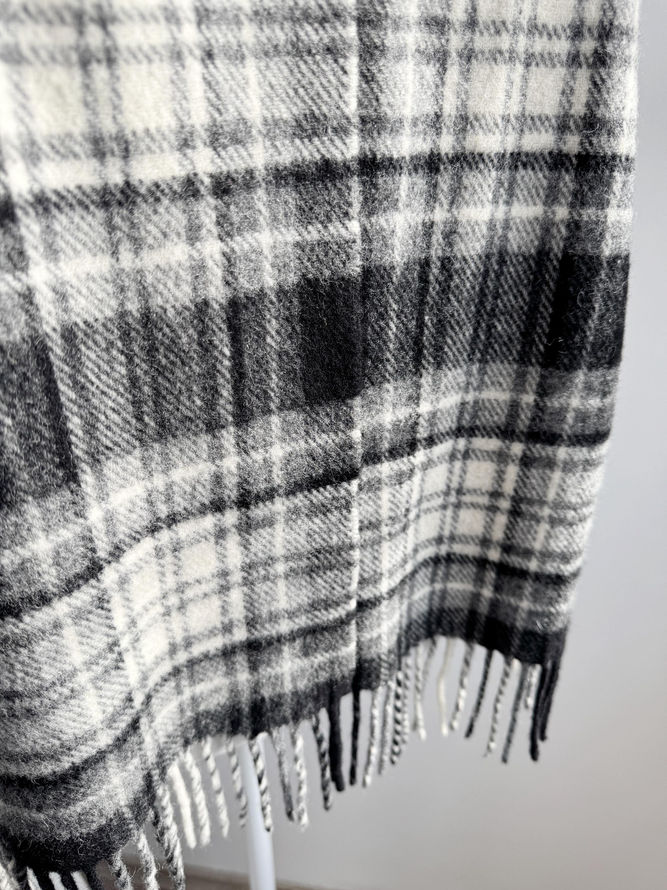The classic plaid or tartan check design features versatile shades of black, white, and gray, making it the perfect neutral accessory for any winter coat or jacket. It is finished with traditional fringe detailing. This genuine Irish wool scarf is a timeless piece that adds a touch of heritage and quality to your cold-weather wardrobe. A sustainable and cozy gift idea for him or her!