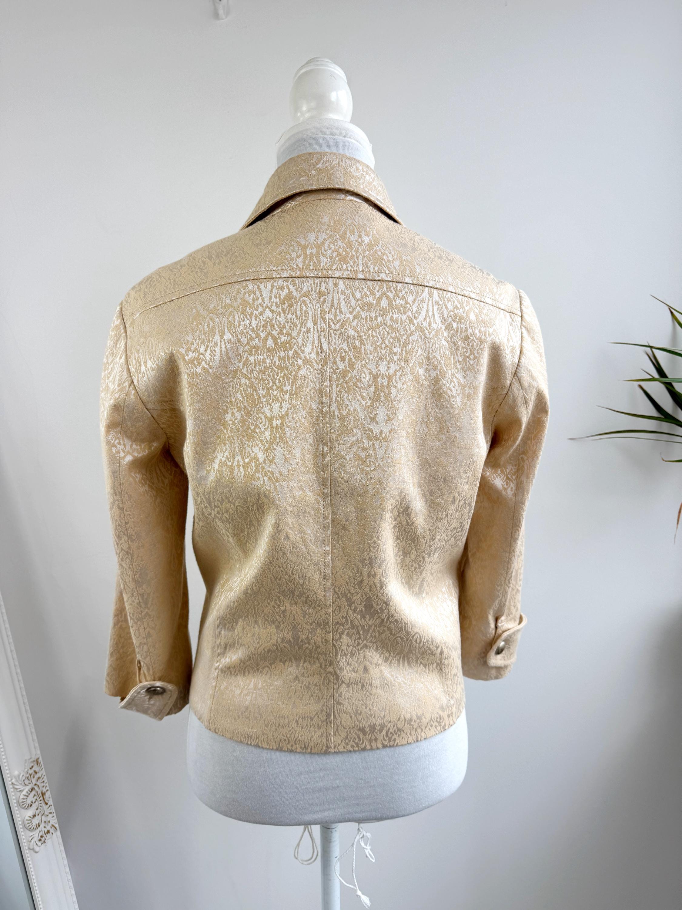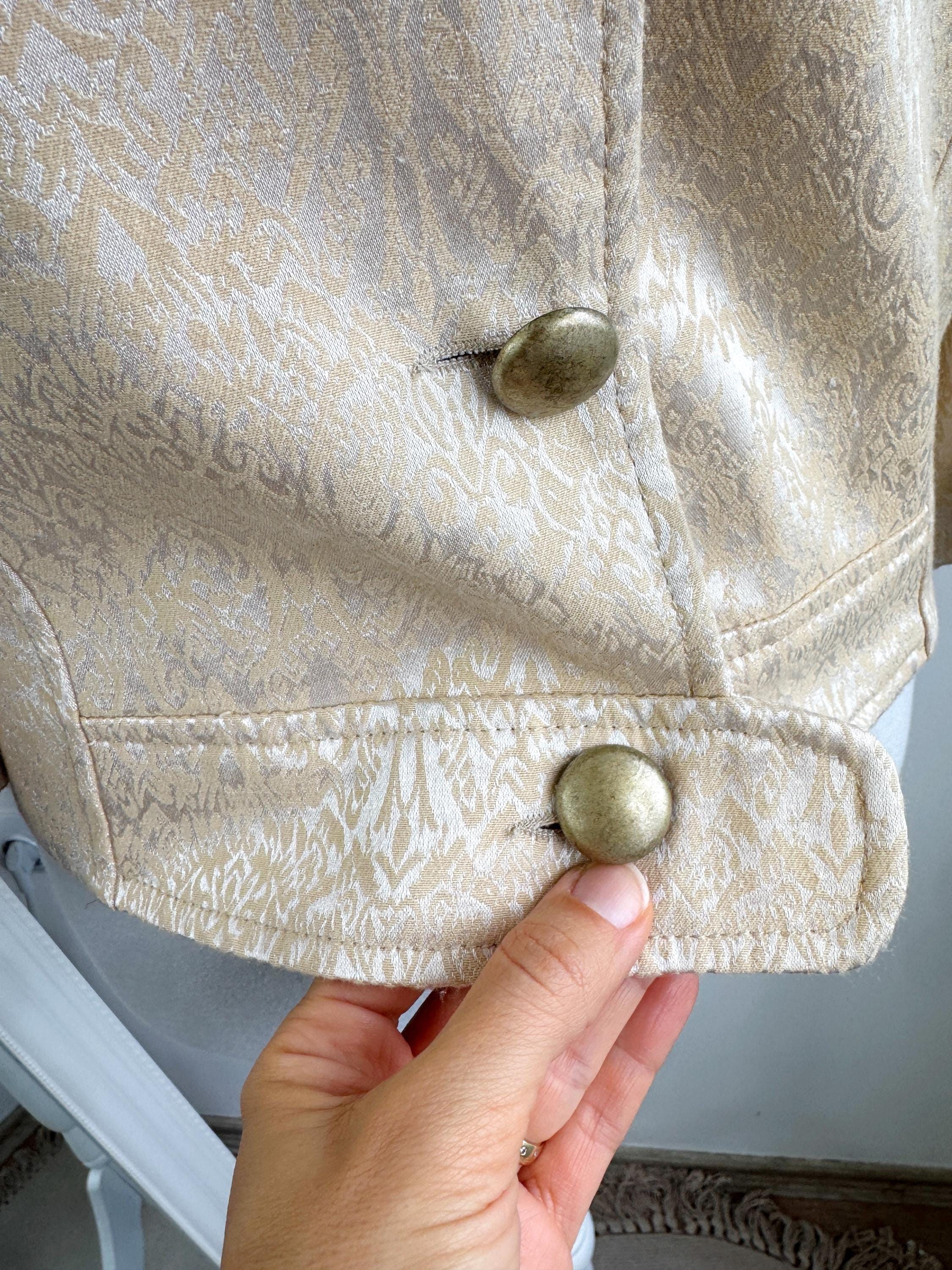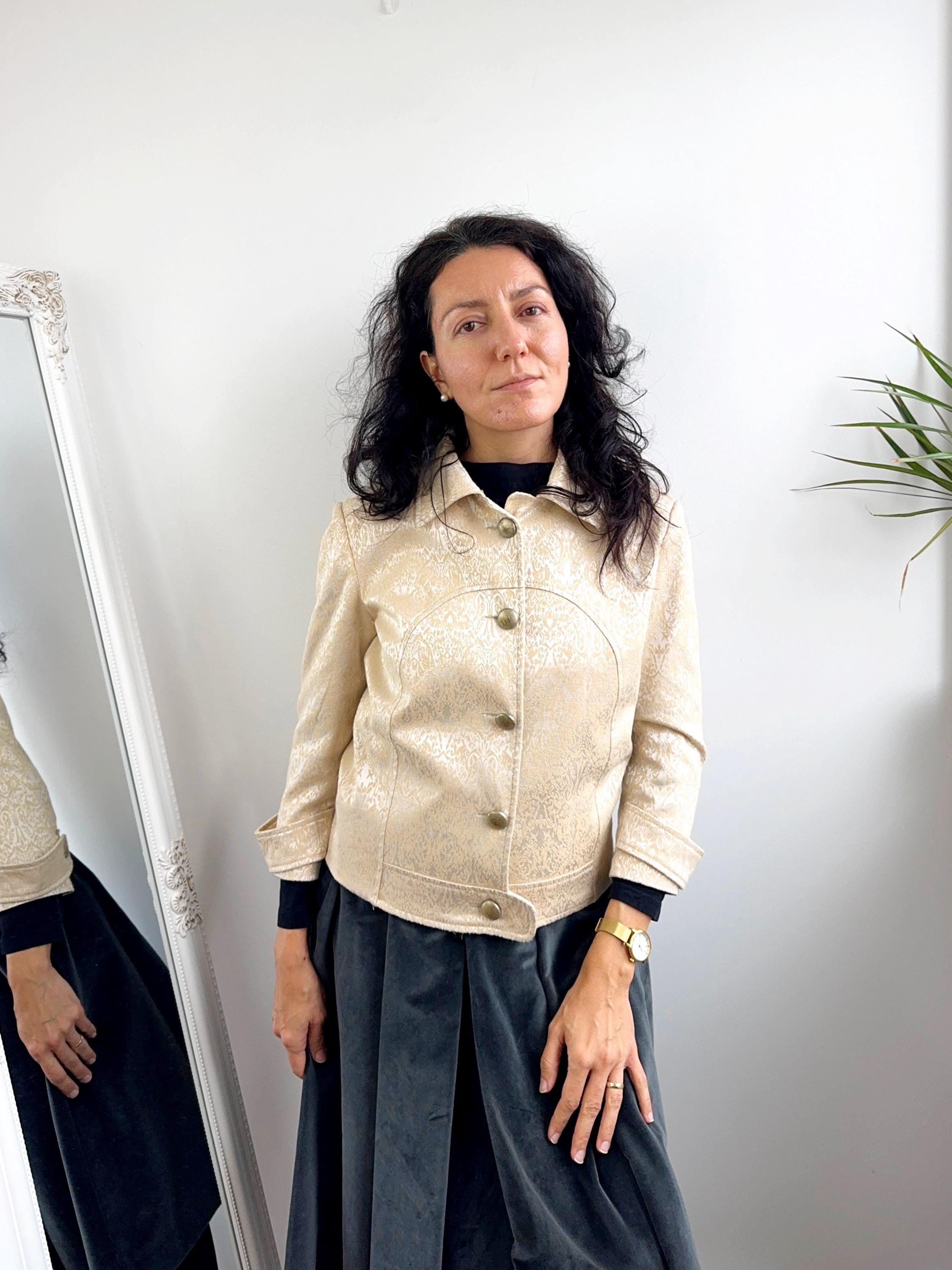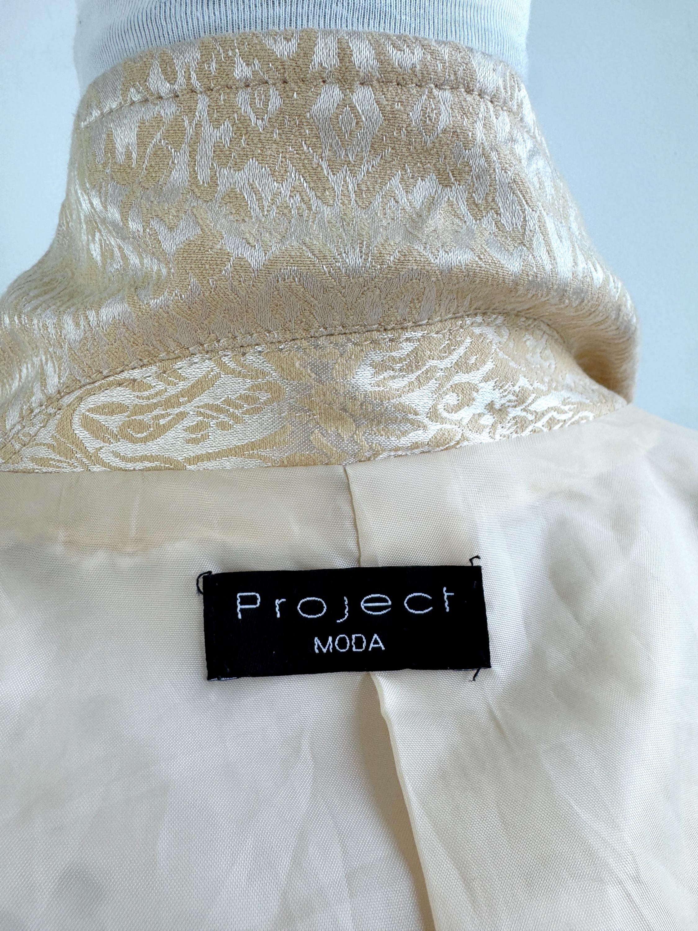 Elevate your wardrobe with this stunning vintage cropped jacket from the Italian brand Project MODA in size Italy 44, which fits like M. This beautiful jacquard coat captures the sophisticated aesthetic of the late 90s and Y2K designer fashion. Crafted in Italy, this brocade jacket features a luxurious gold and cream brocade or jacquard fabric with an intricate, almost floral-like pattern that gives it a rich texture and subtle sheen.