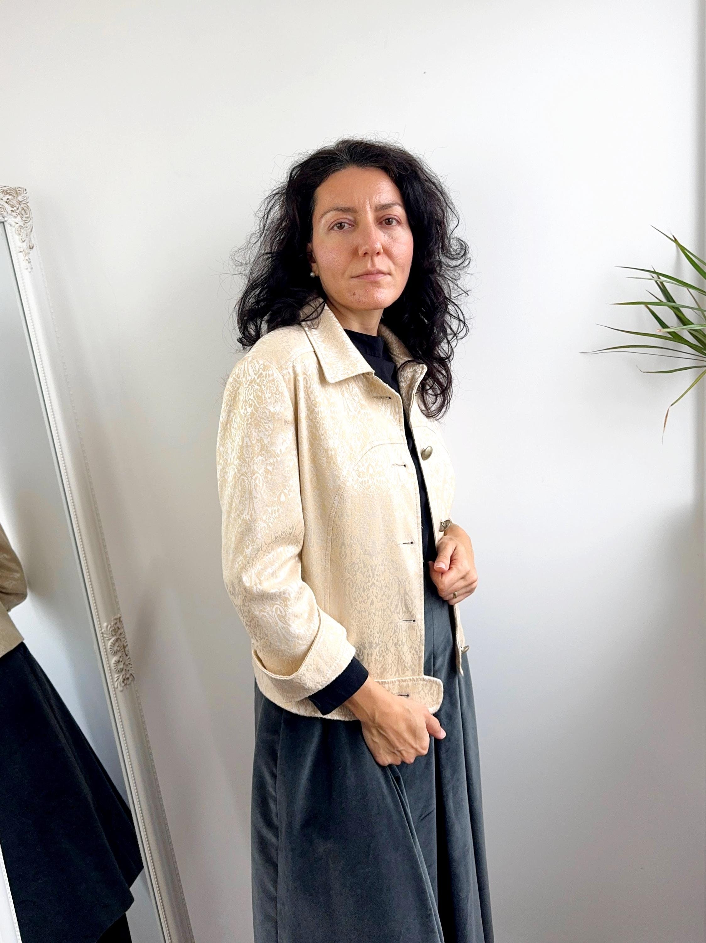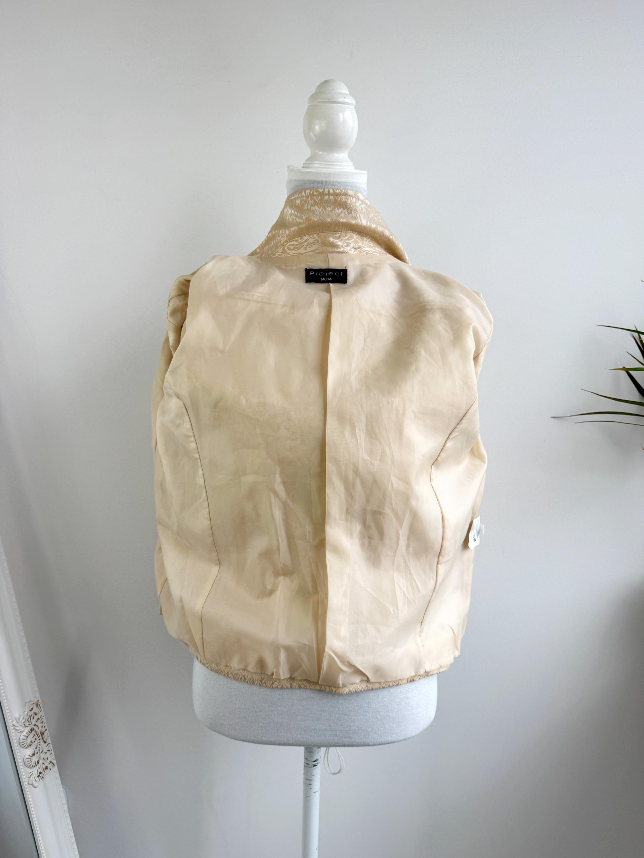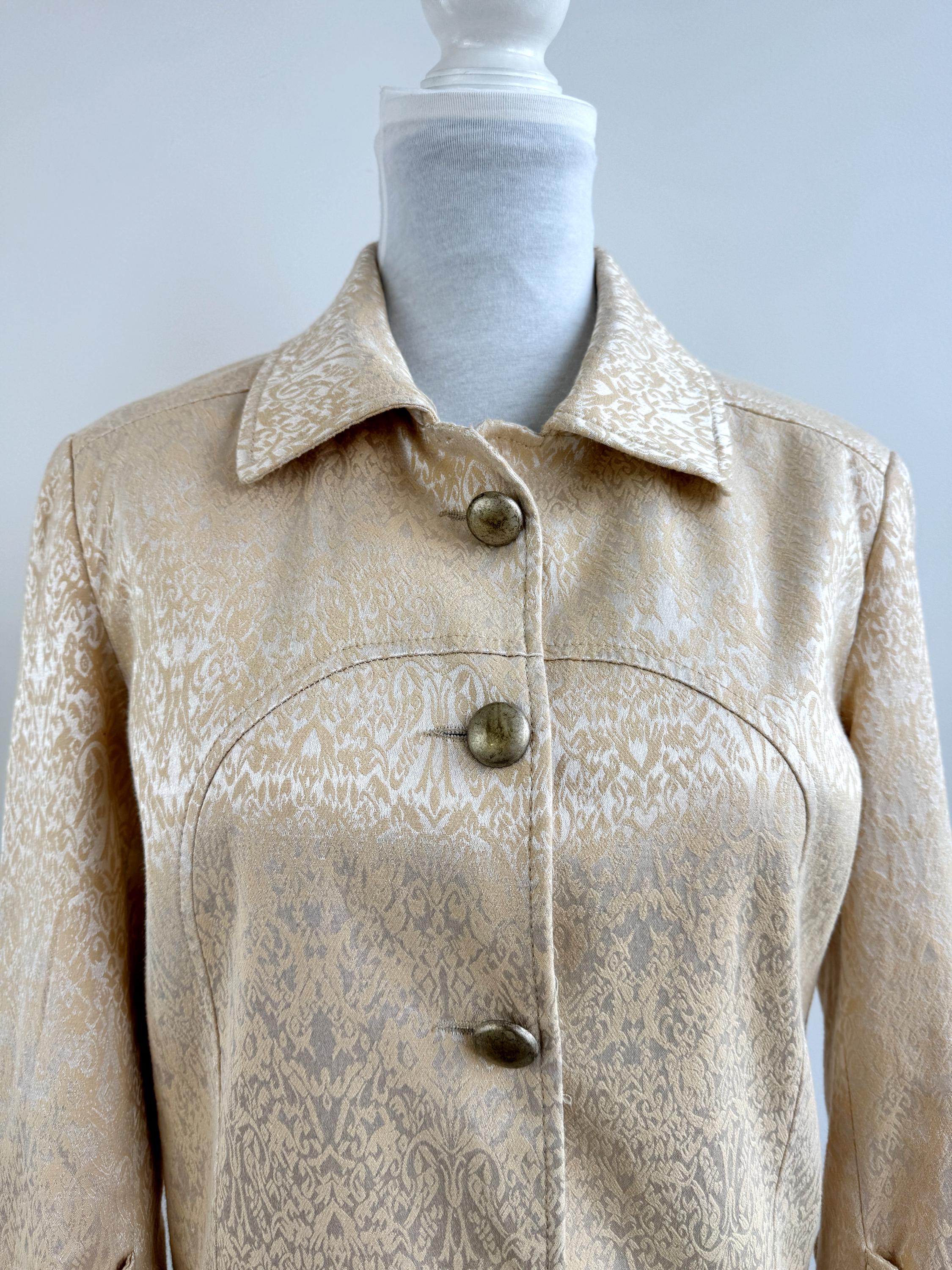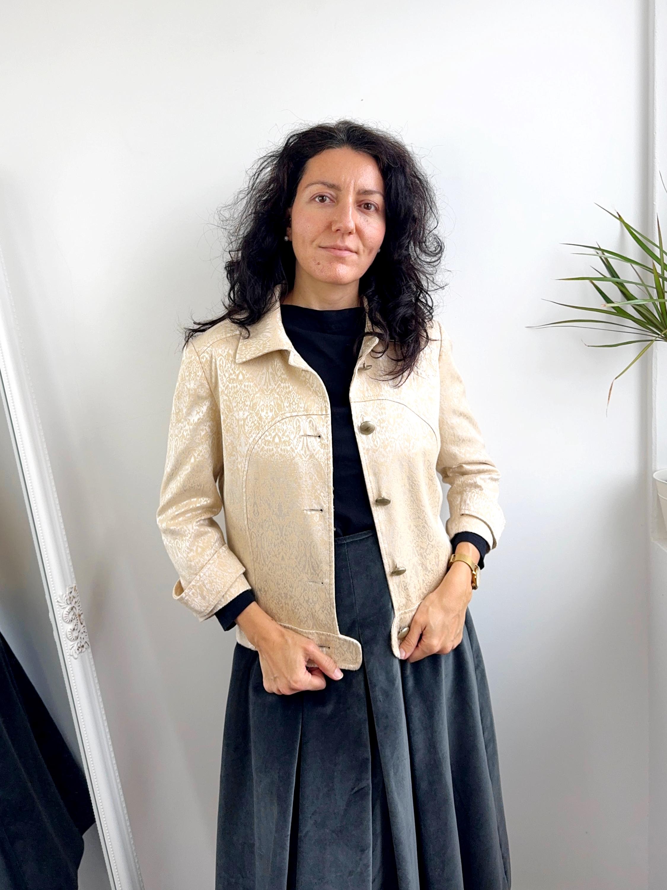 Elevate your wardrobe with this stunning vintage cropped jacket from the Italian brand Project MODA in size Italy 44, which fits like M. This beautiful jacquard coat captures the sophisticated aesthetic of the late 90s and Y2K designer fashion. Crafted in Italy, this brocade jacket features a luxurious gold and cream brocade or jacquard fabric with an intricate, almost floral-like pattern that gives it a rich texture and subtle sheen.