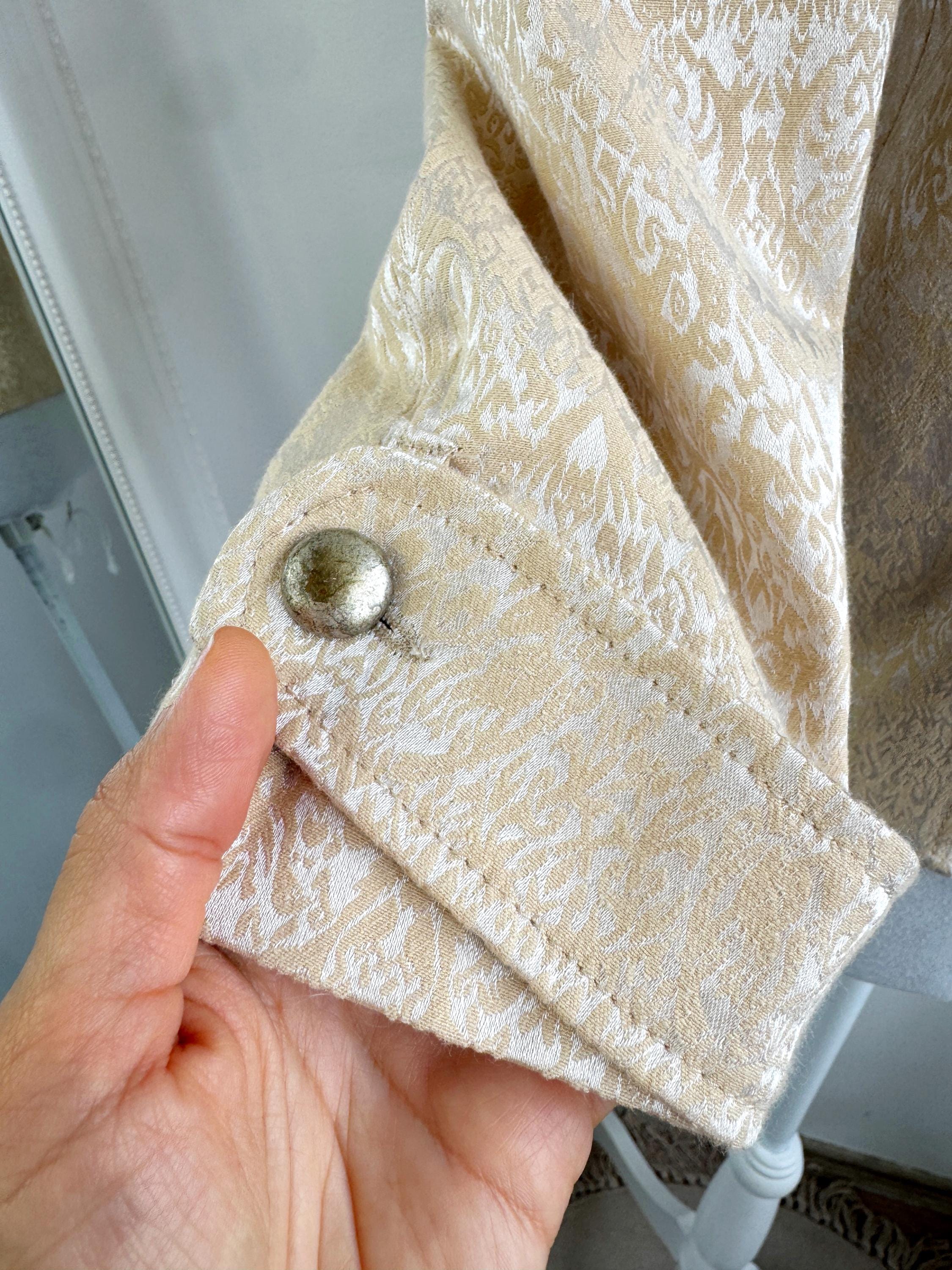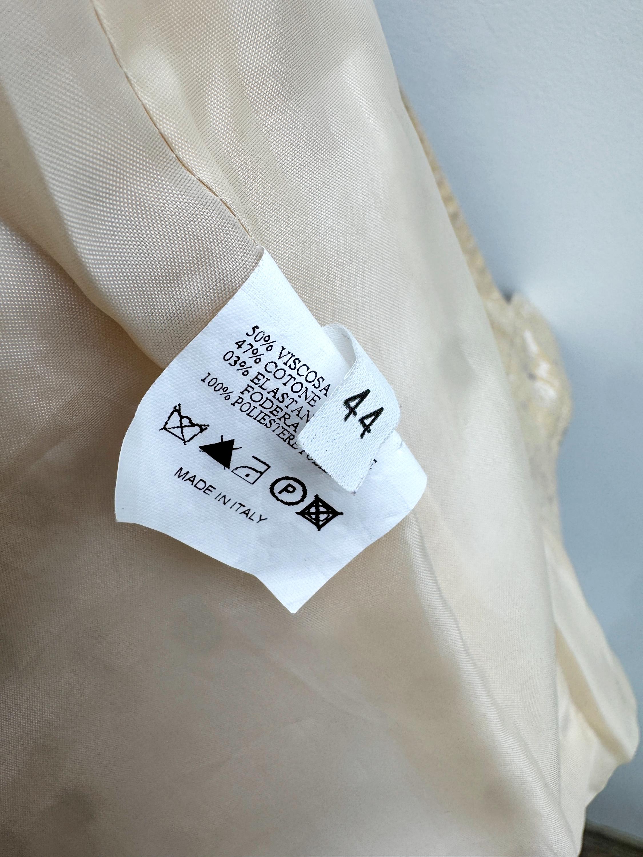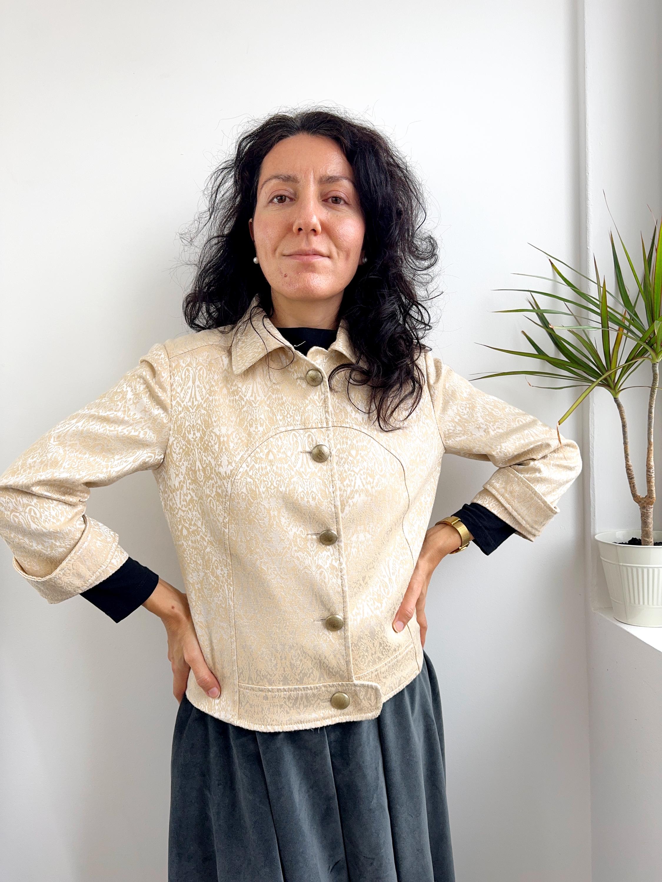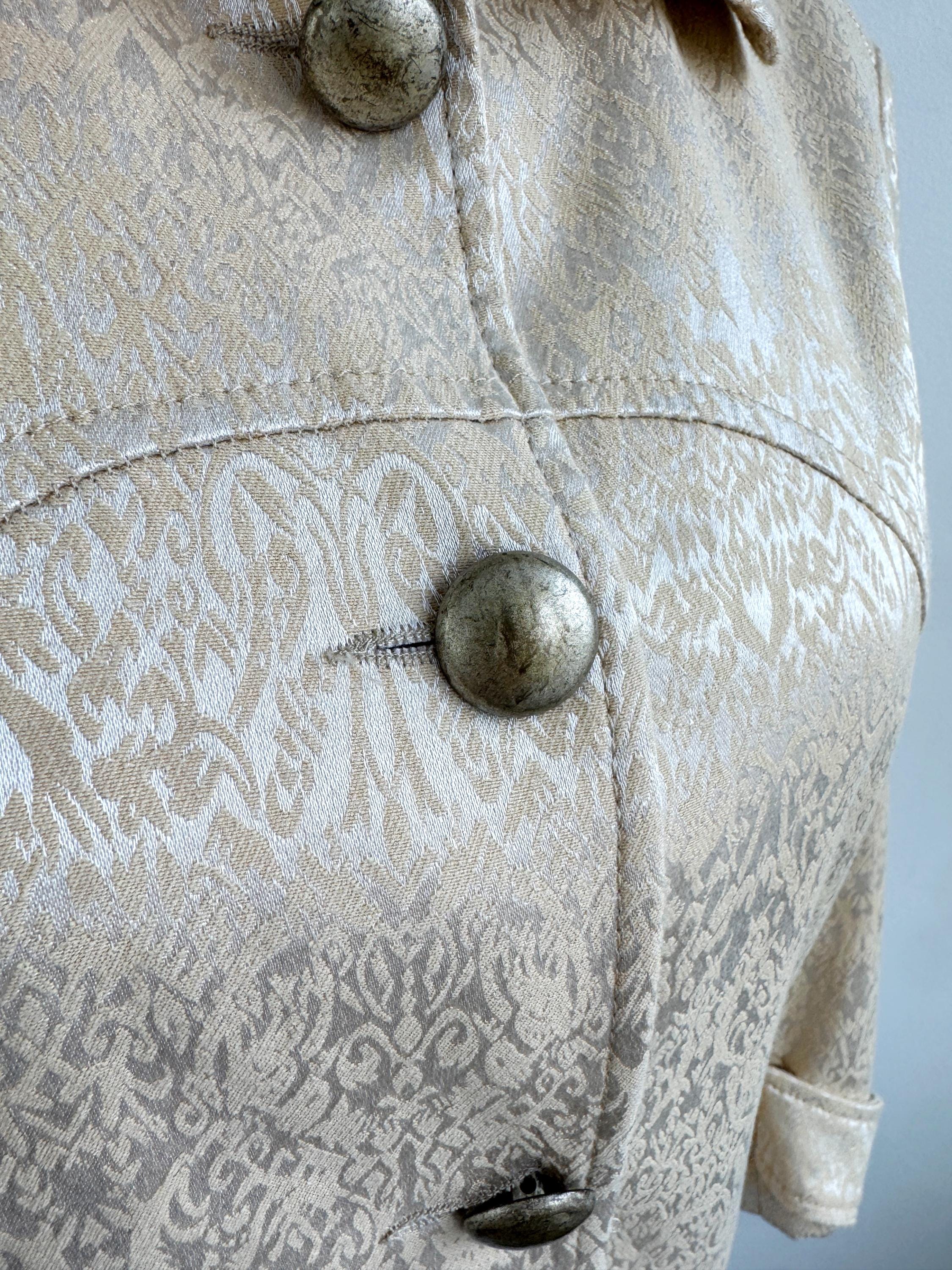 Elevate your wardrobe with this stunning vintage cropped jacket from the Italian brand Project MODA in size Italy 44, which fits like M. This beautiful jacquard coat captures the sophisticated aesthetic of the late 90s and Y2K designer fashion. Crafted in Italy, this brocade jacket features a luxurious gold and cream brocade or jacquard fabric with an intricate, almost floral-like pattern that gives it a rich texture and subtle sheen.