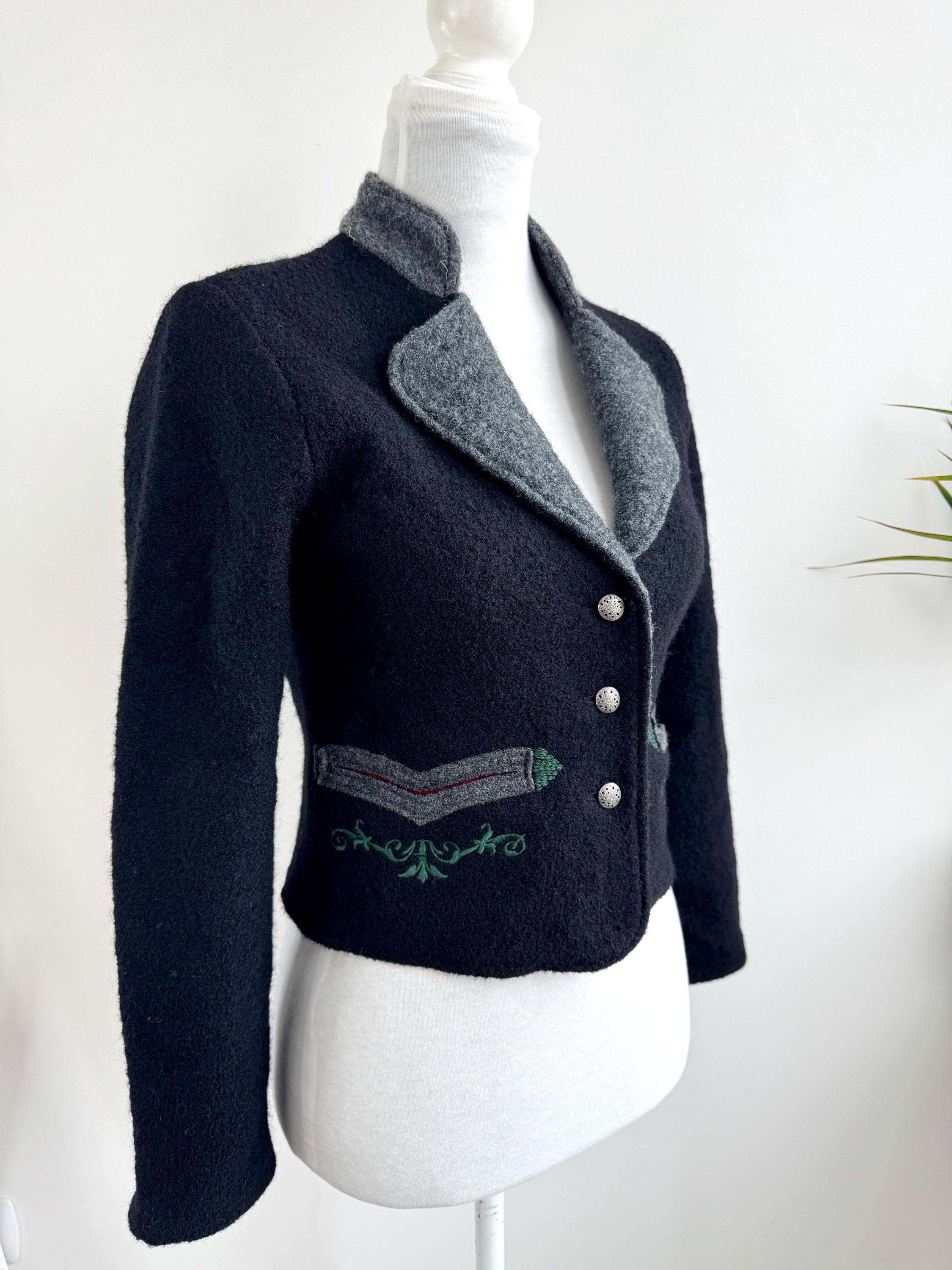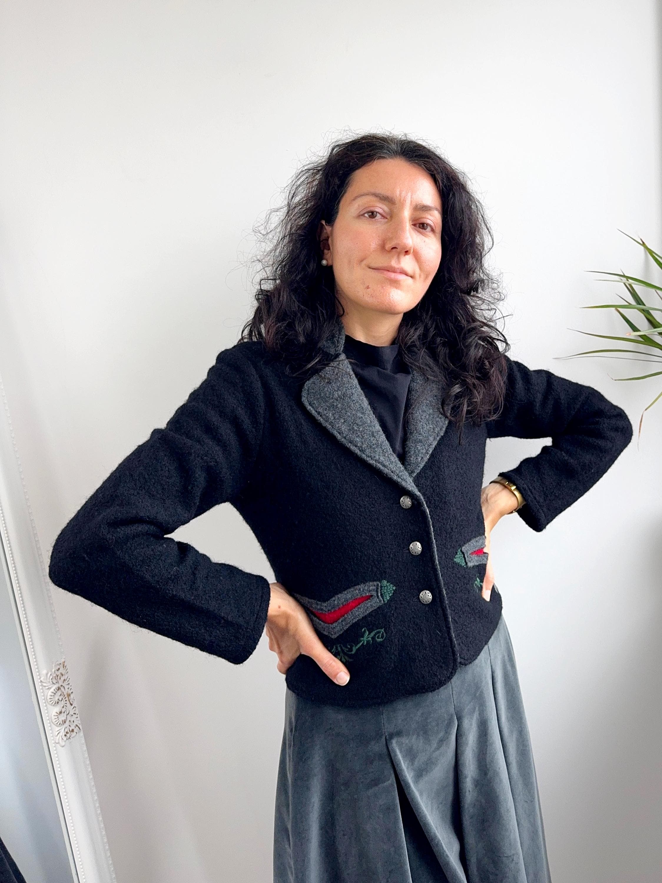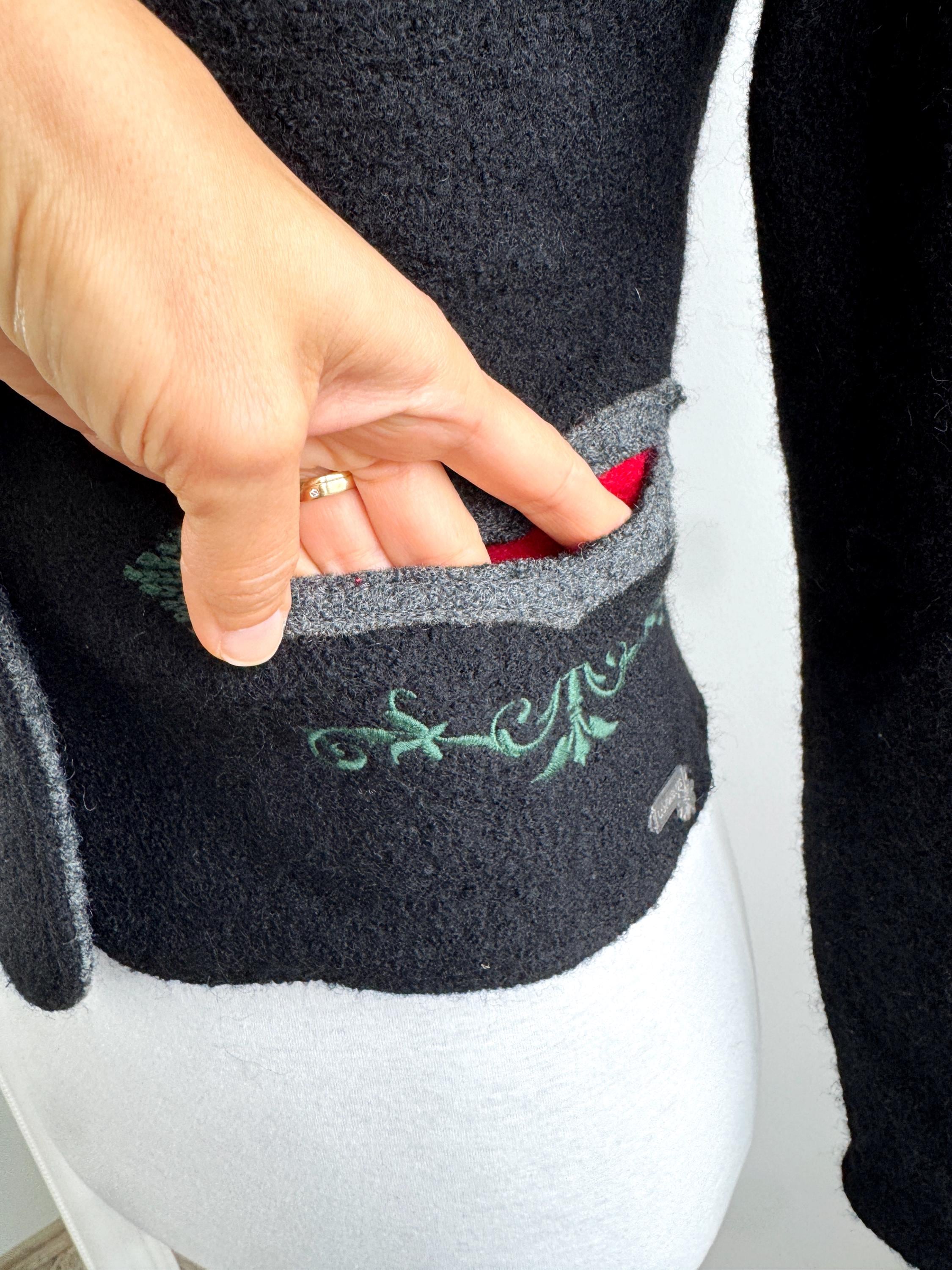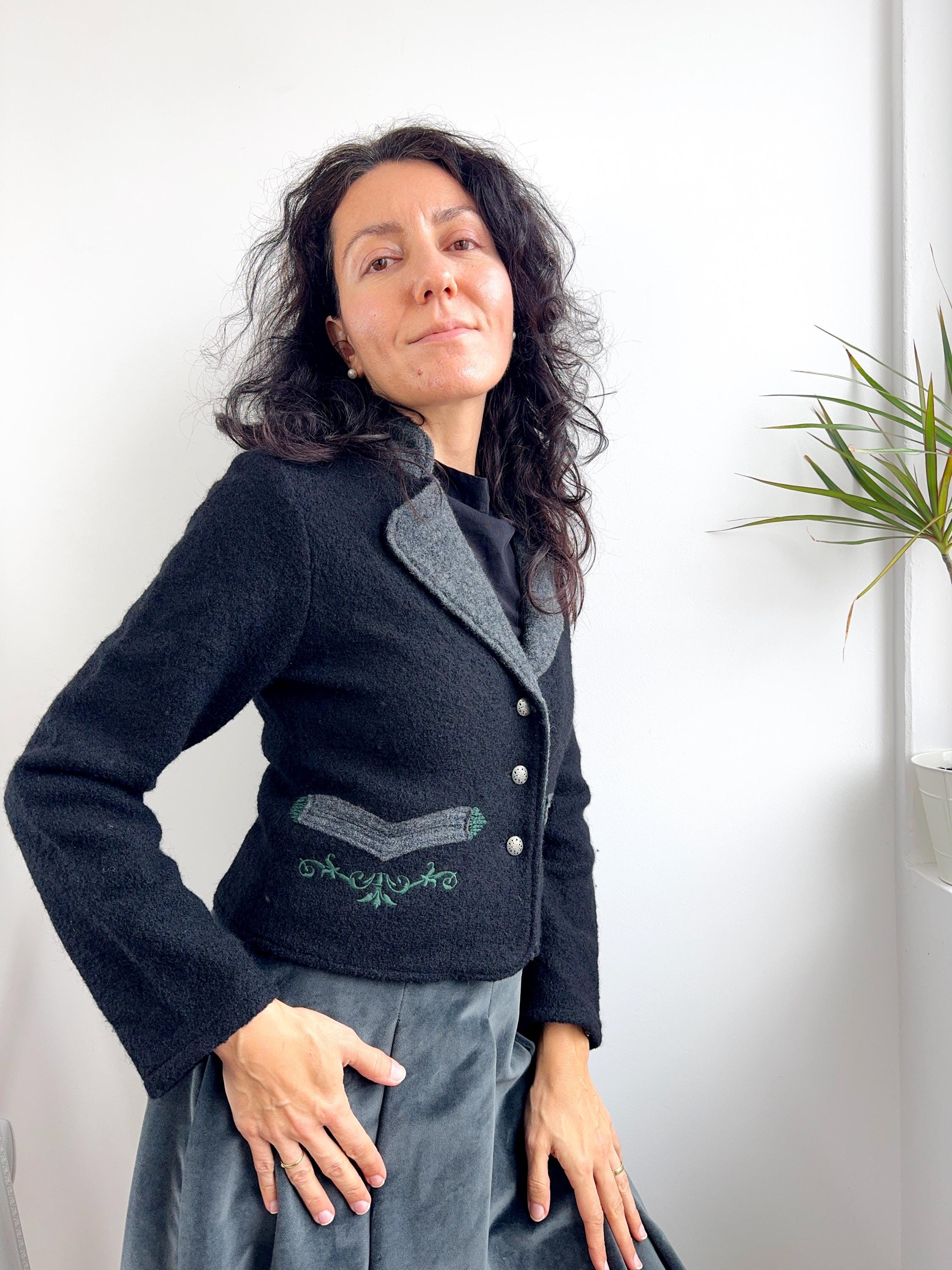This tyrolean dirndl jacket features a striking black body contrasted with a soft, grey wool collar and pocket embroidery trim. Beautiful green embroidery adorns the pockets, adding a subtle touch of Alpine folk style. It fastens with three decorative, silver-toned metal buttons. This is a timeless piece of German/Austrian fashion perfect for the colder months. It works beautifully styled traditionally with a dirndl, or paired with modern essentials like jeans or a midi or maxi skirt for a cozy cottagecore or dark academia look. A genuine, high-quality vintage wool coat.