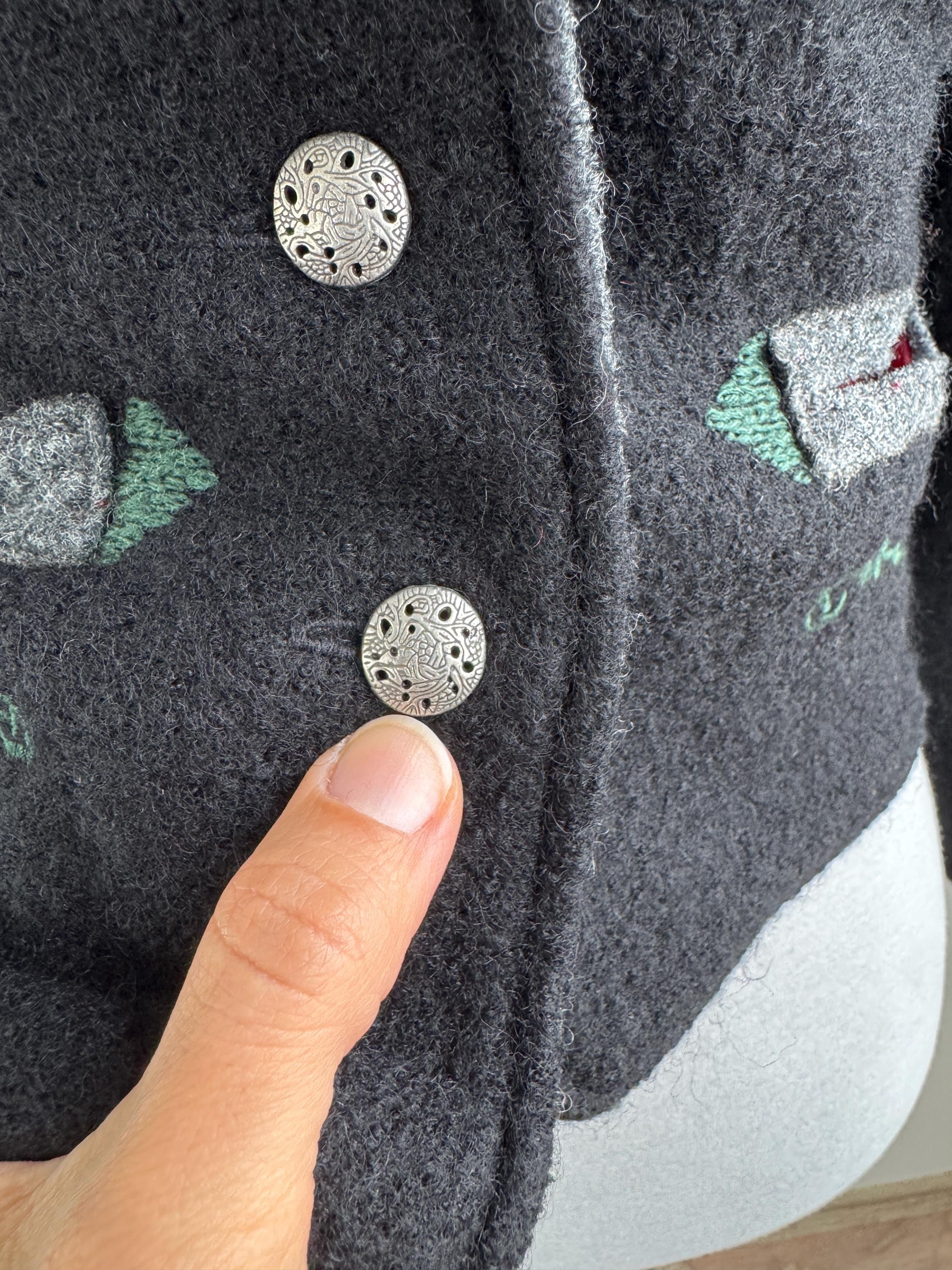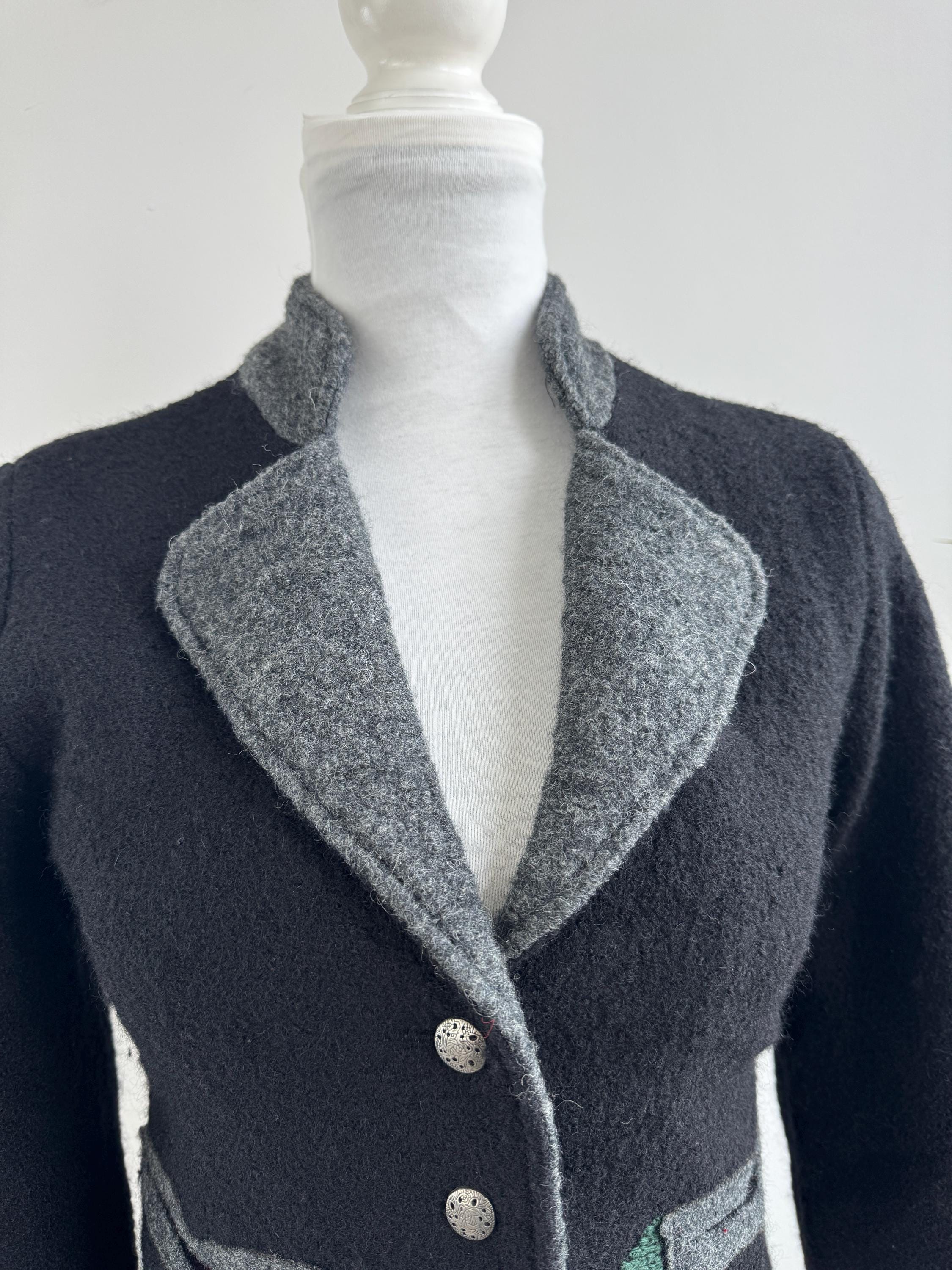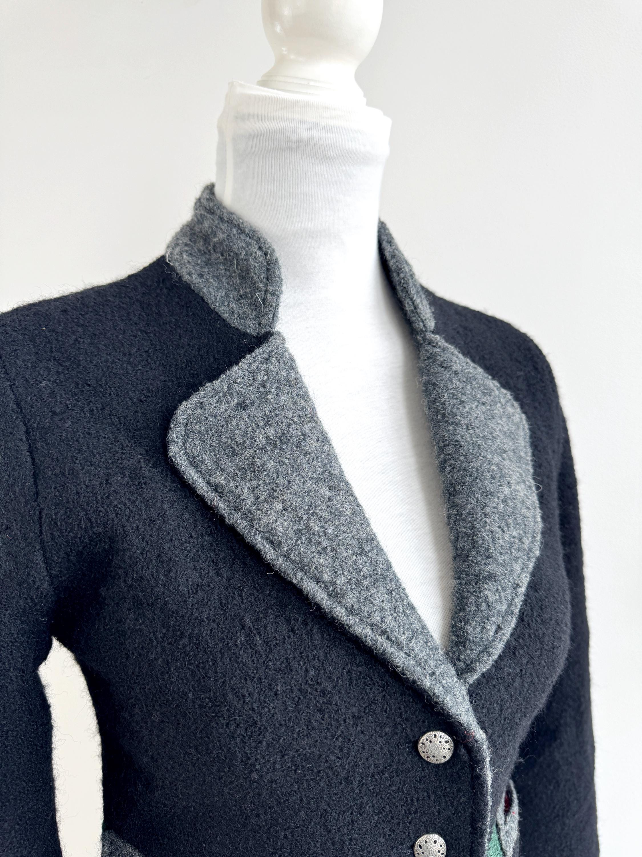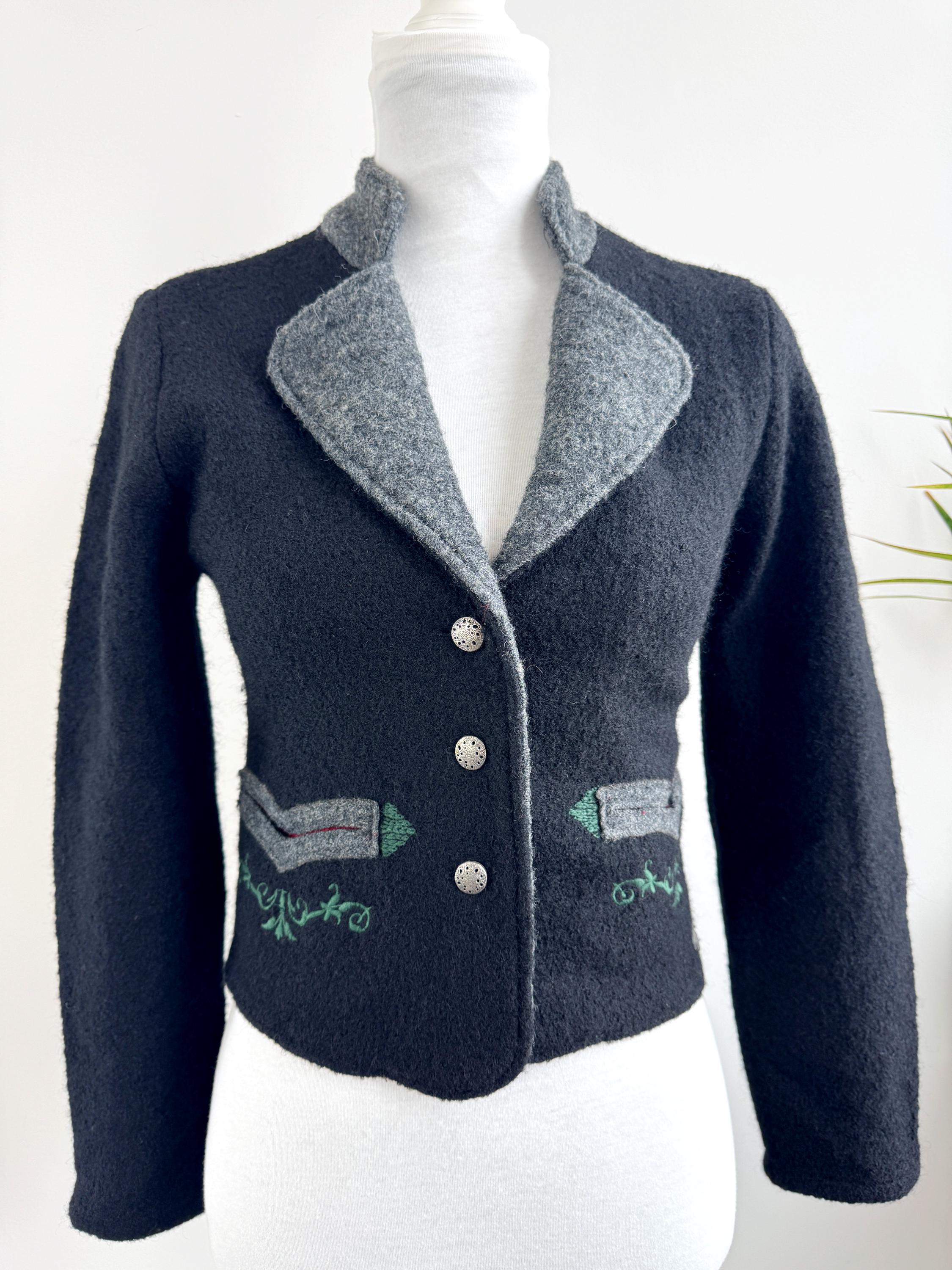 This tyrolean dirndl jacket features a striking black body contrasted with a soft, grey wool collar and pocket embroidery trim. Beautiful green embroidery adorns the pockets, adding a subtle touch of Alpine folk style. It fastens with three decorative, silver-toned metal buttons. This is a timeless piece of German/Austrian fashion perfect for the colder months. It works beautifully styled traditionally with a dirndl, or paired with modern essentials like jeans or a midi or maxi skirt for a cozy cottagecore or dark academia look. A genuine, high-quality vintage wool coat.