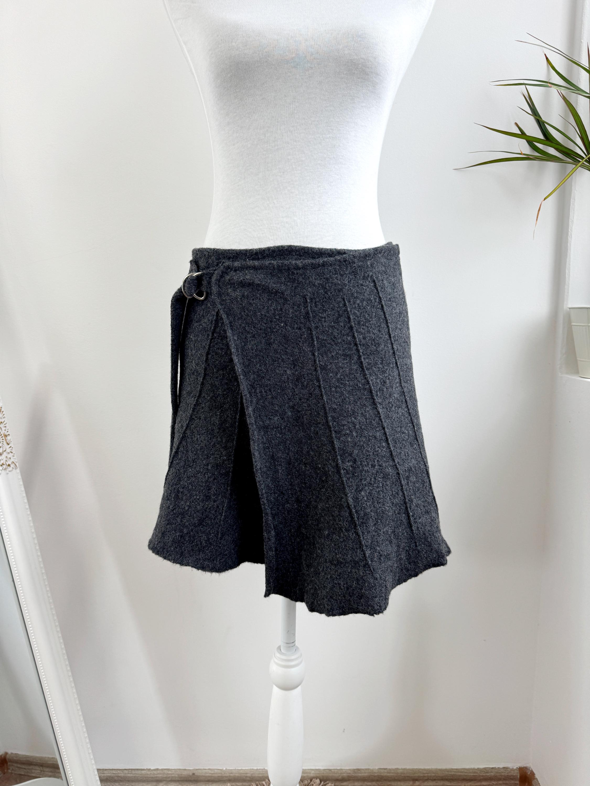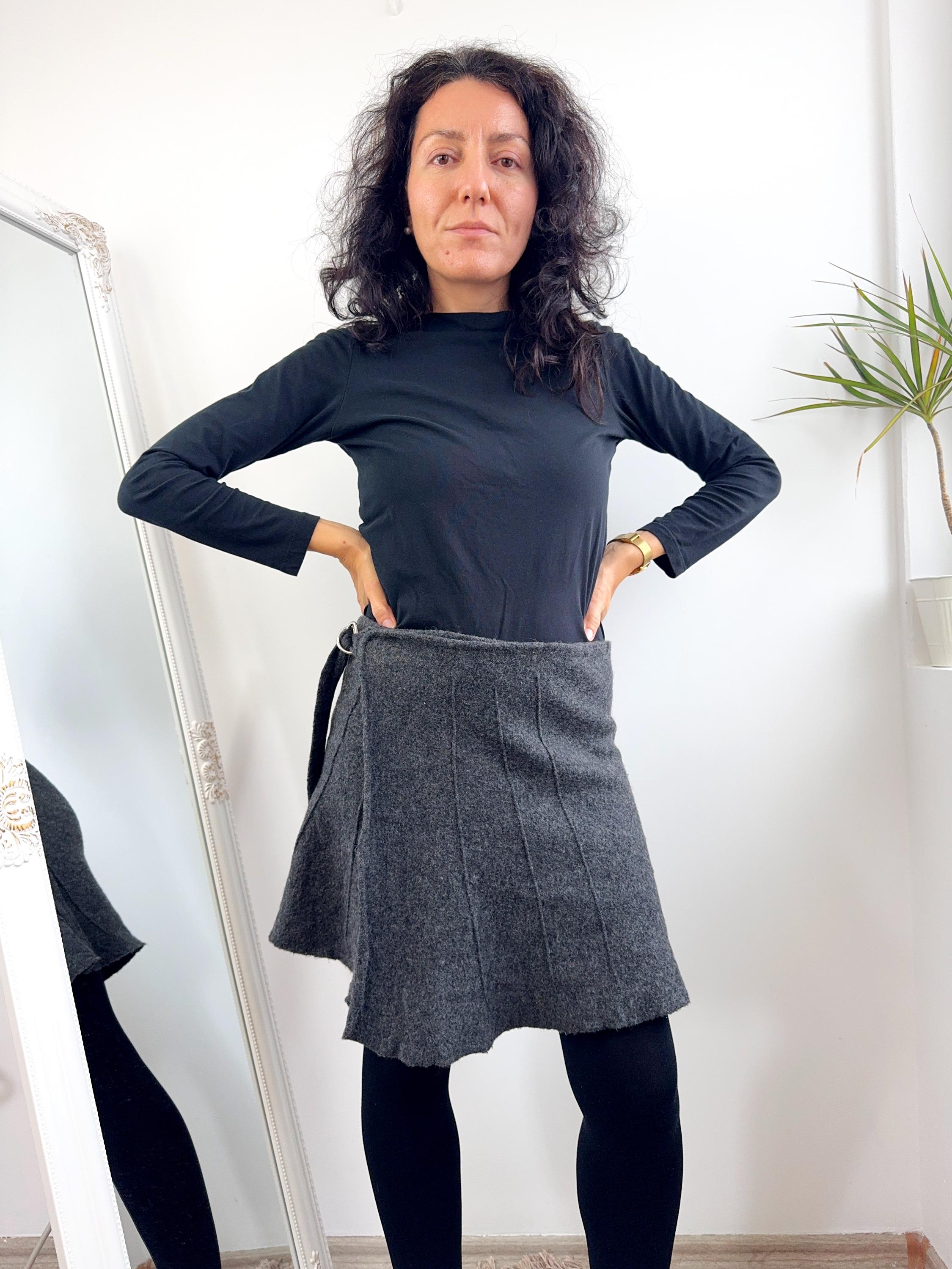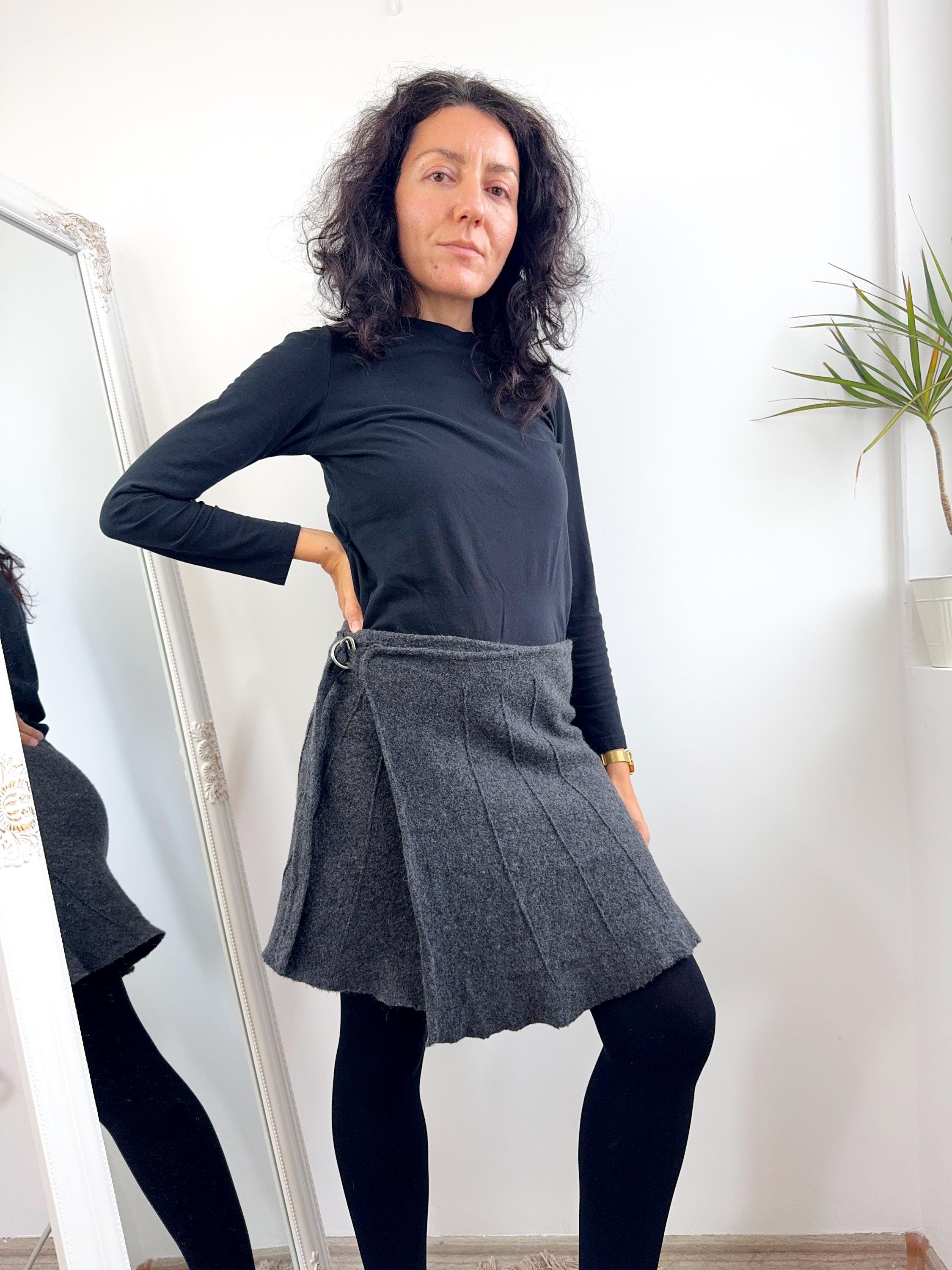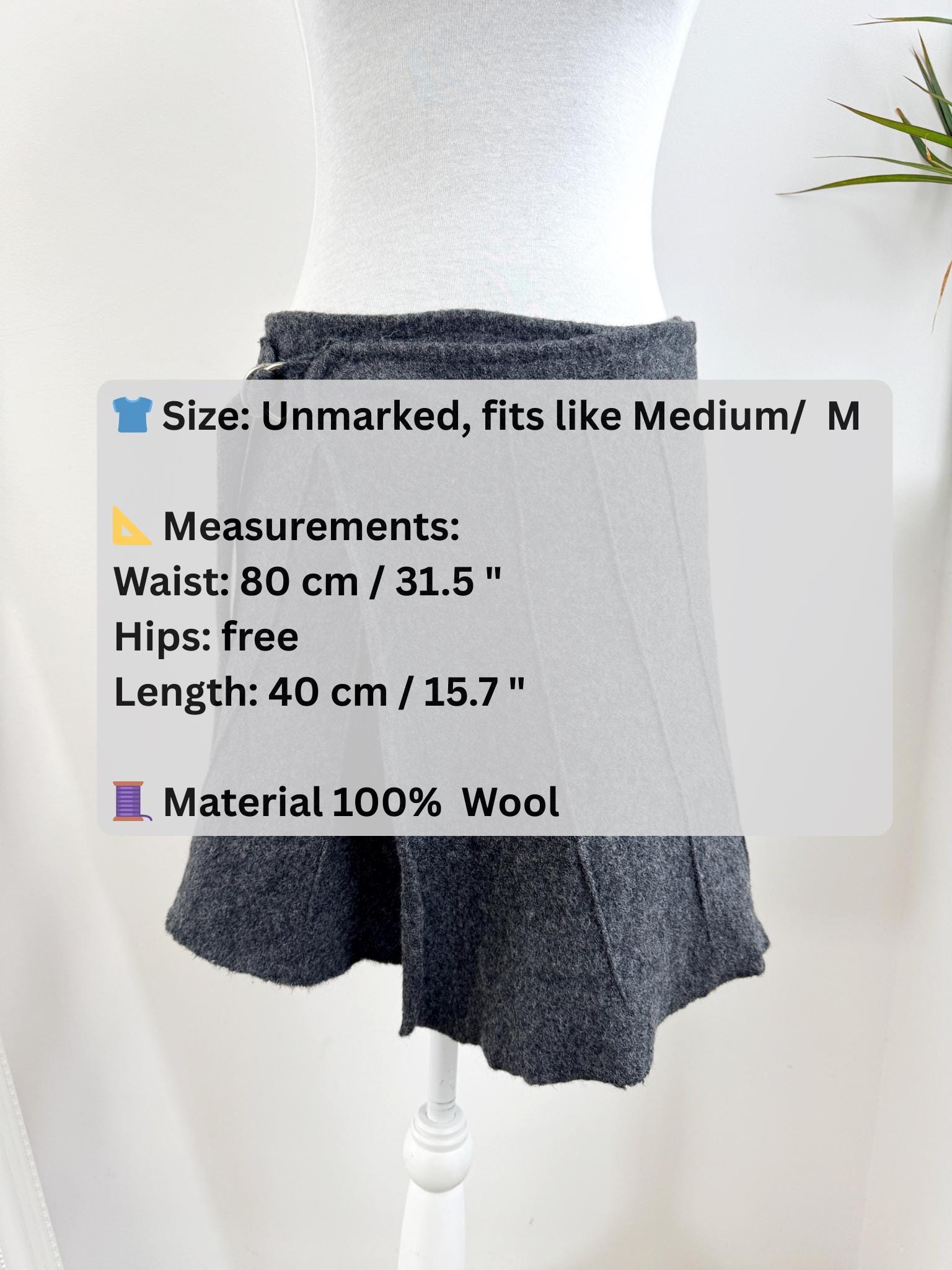 This is a vintage Y2K super cozy warm felted 100% wool mini skirt by Joma Fashion which fits like size M. This grey wool skirt is the perfect blend of warmth and retro style. The luxurious warm fluffy fabric is a rich, dark grey wool, offering natural warmth and a beautifully soft, slightly felted texture.