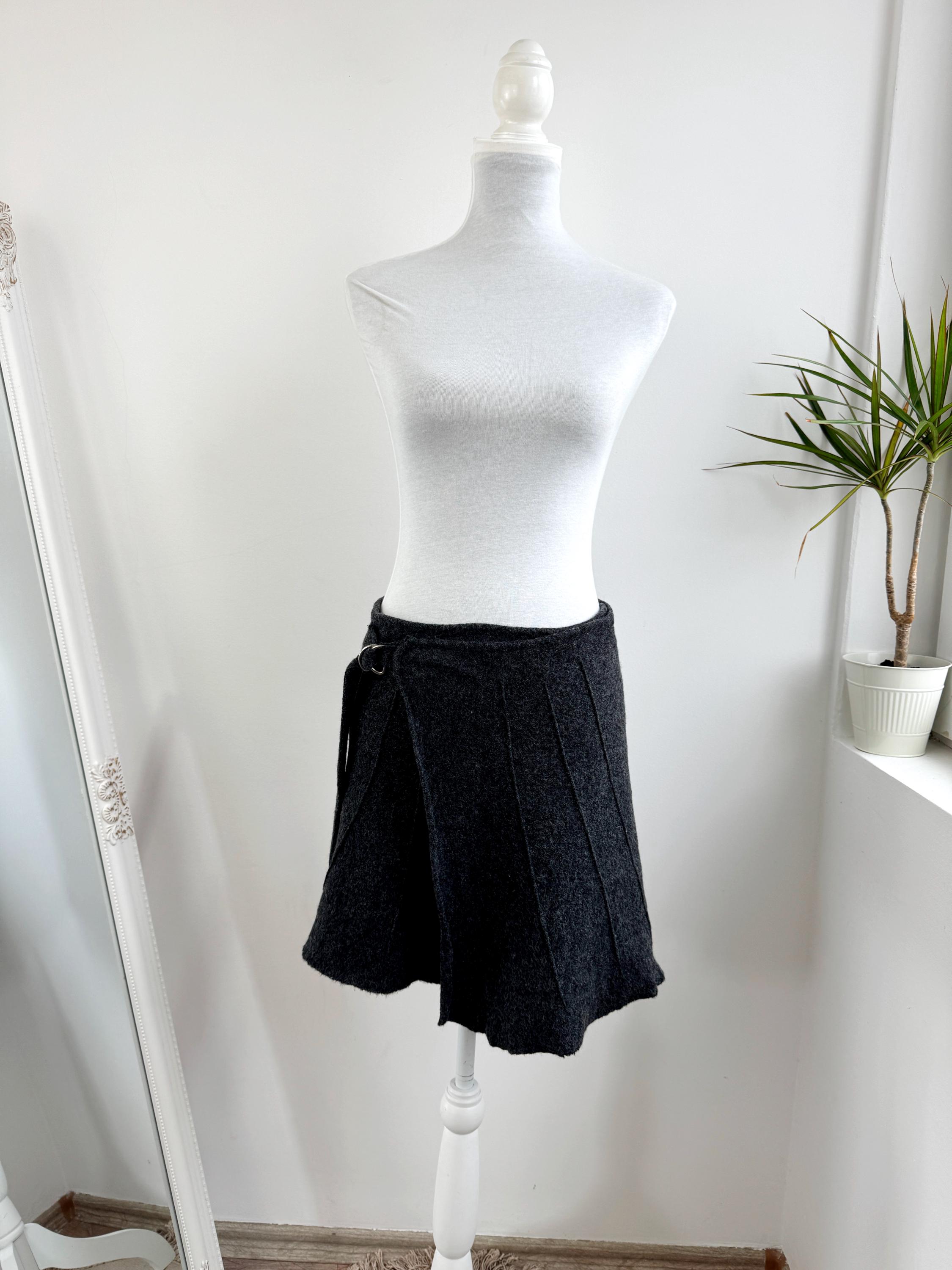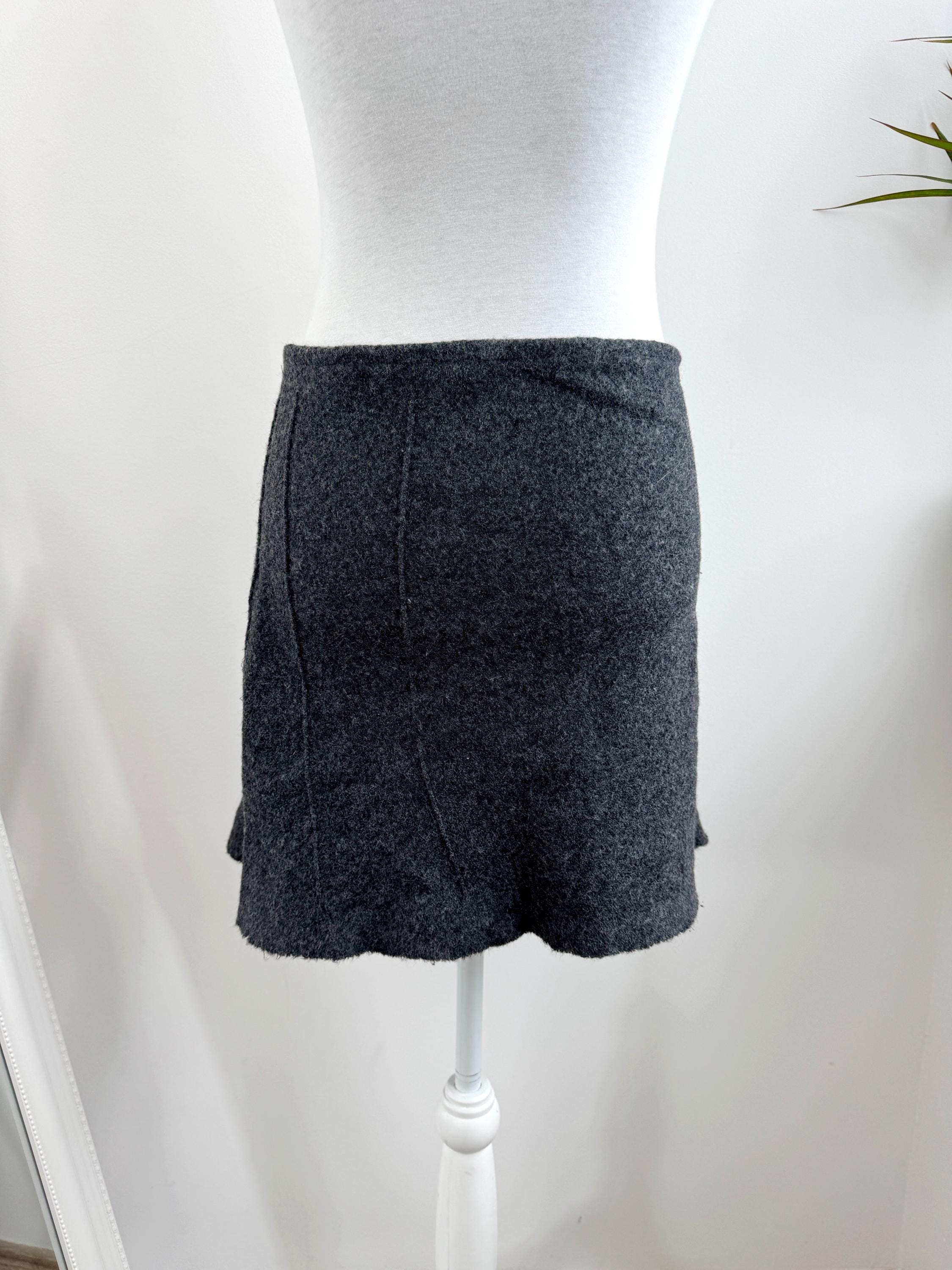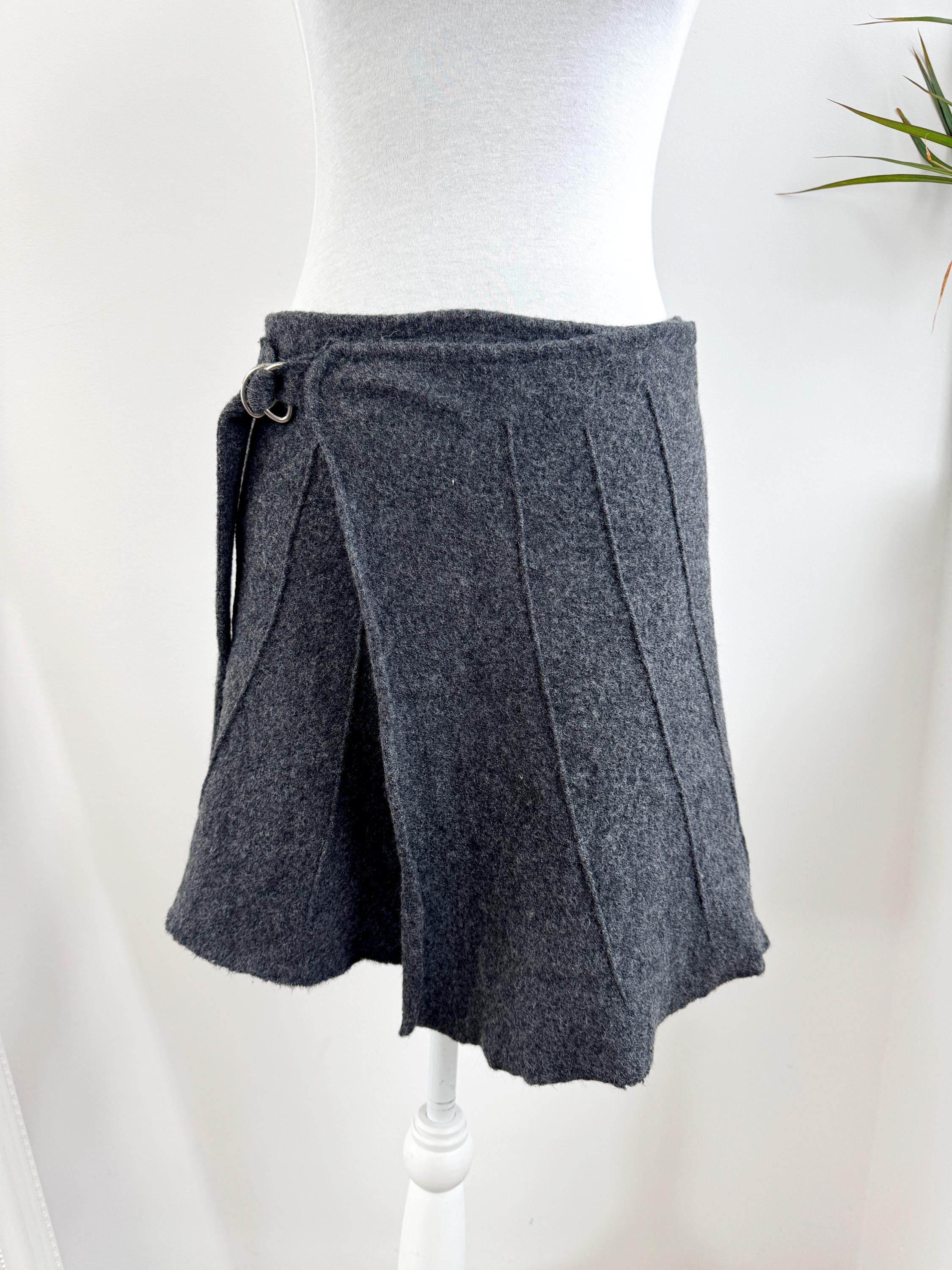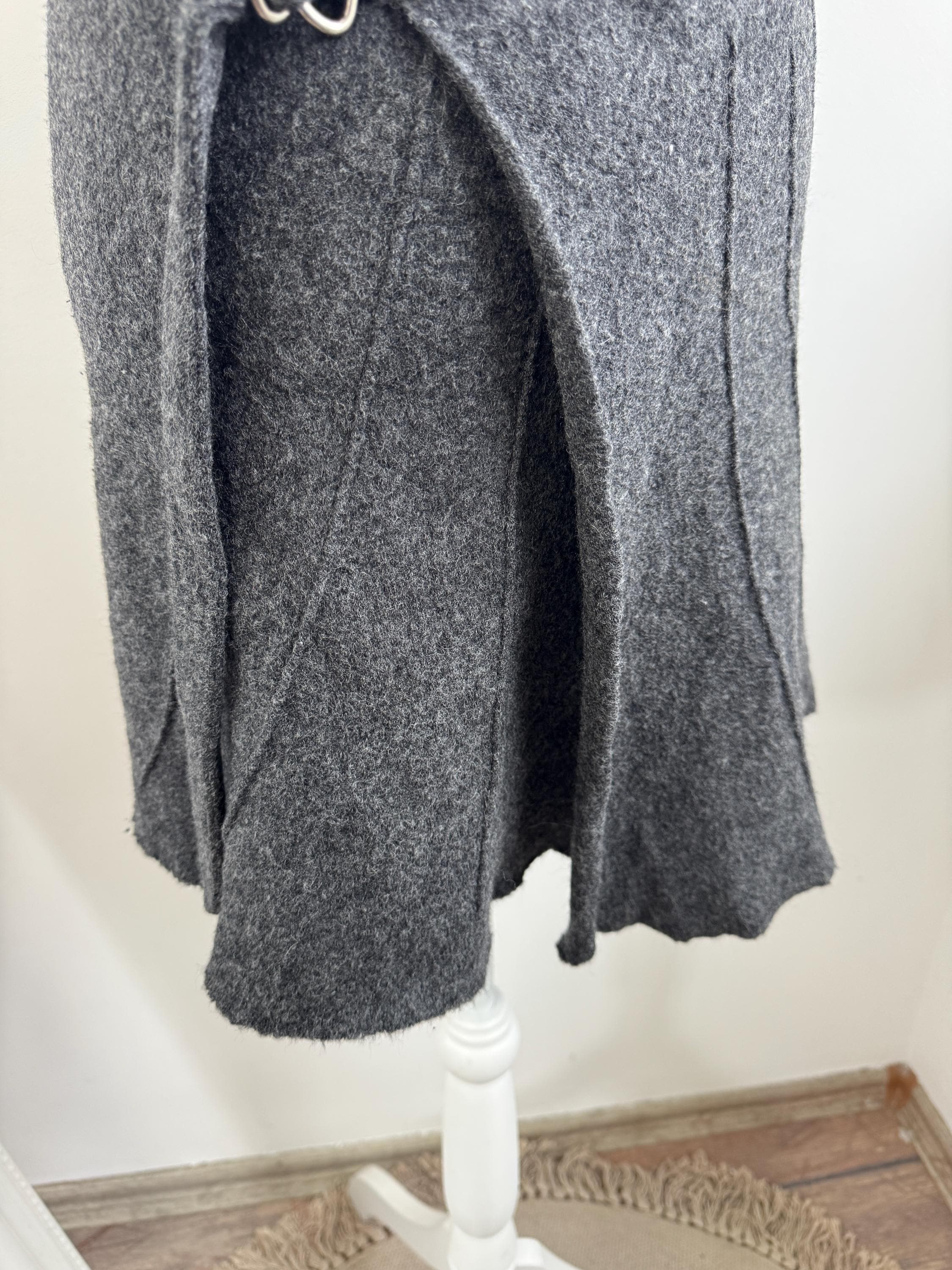 This is a vintage Y2K super cozy warm felted 100% wool mini skirt by Joma Fashion which fits like size M. This grey wool skirt is the perfect blend of warmth and retro style. The luxurious warm fluffy fabric is a rich, dark grey wool, offering natural warmth and a beautifully soft, slightly felted texture.