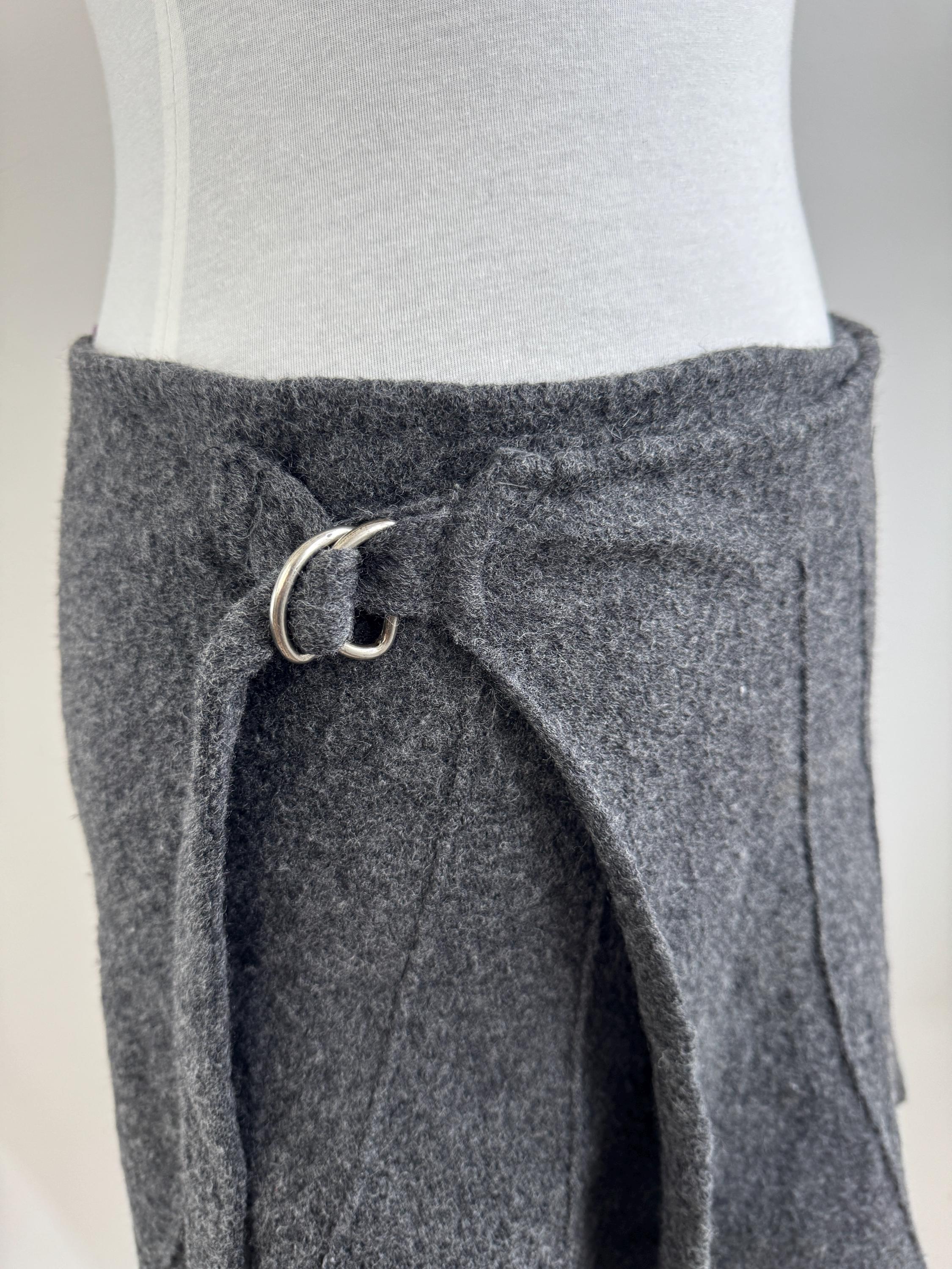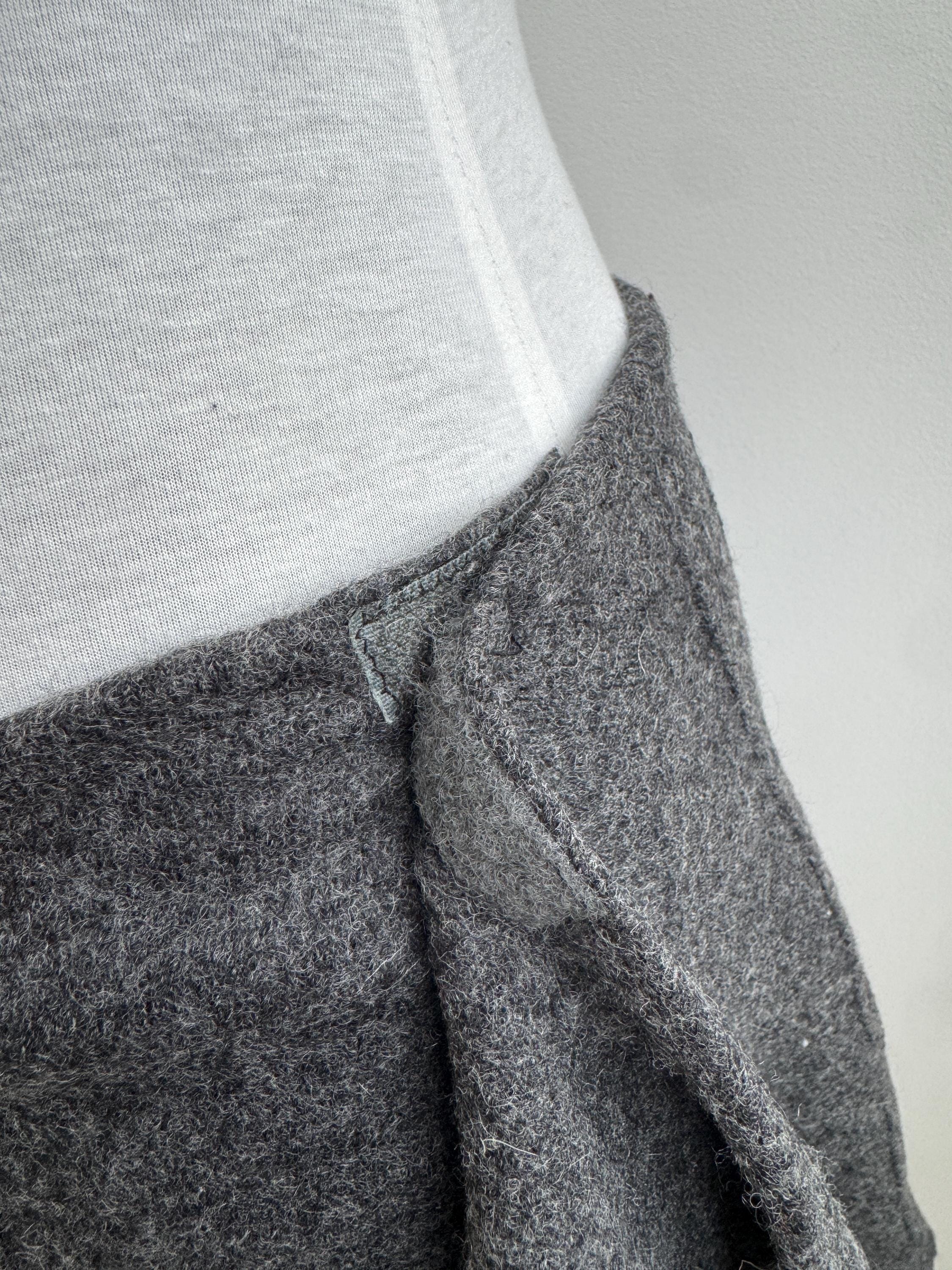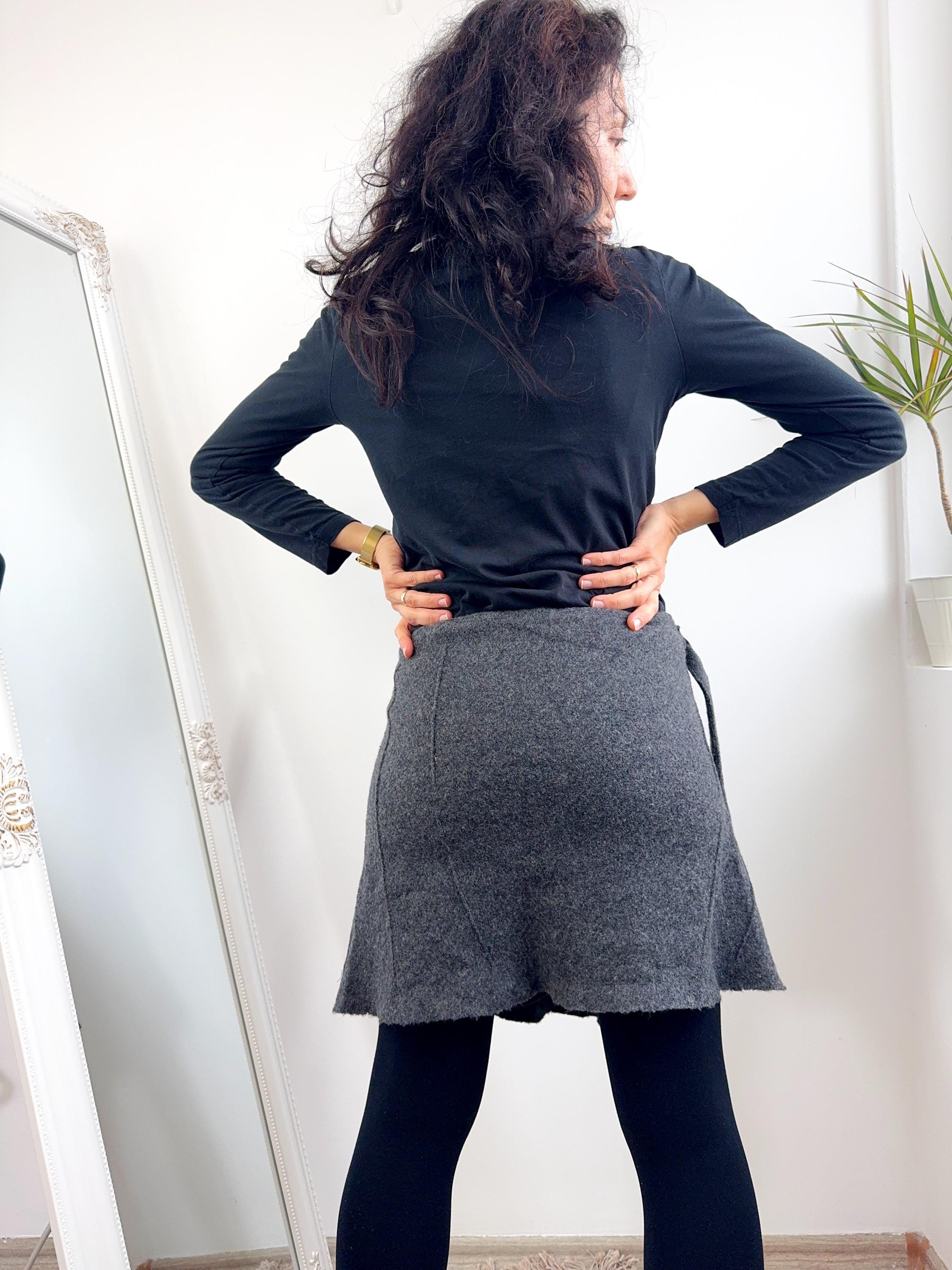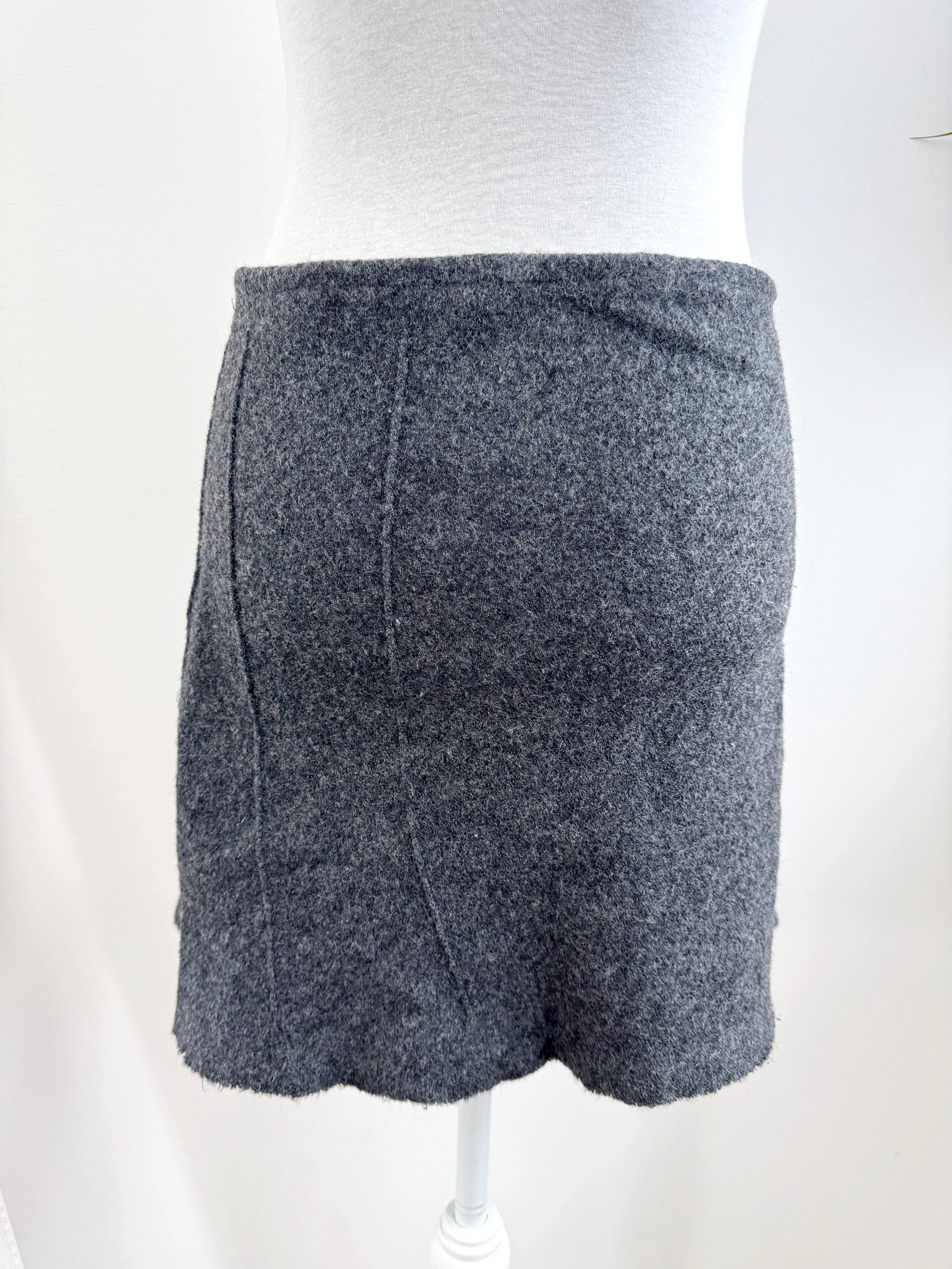 This is a vintage Y2K super cozy warm felted 100% wool mini skirt by Joma Fashion which fits like size M. This grey wool skirt is the perfect blend of warmth and retro style. The luxurious warm fluffy fabric is a rich, dark grey wool, offering natural warmth and a beautifully soft, slightly felted texture.