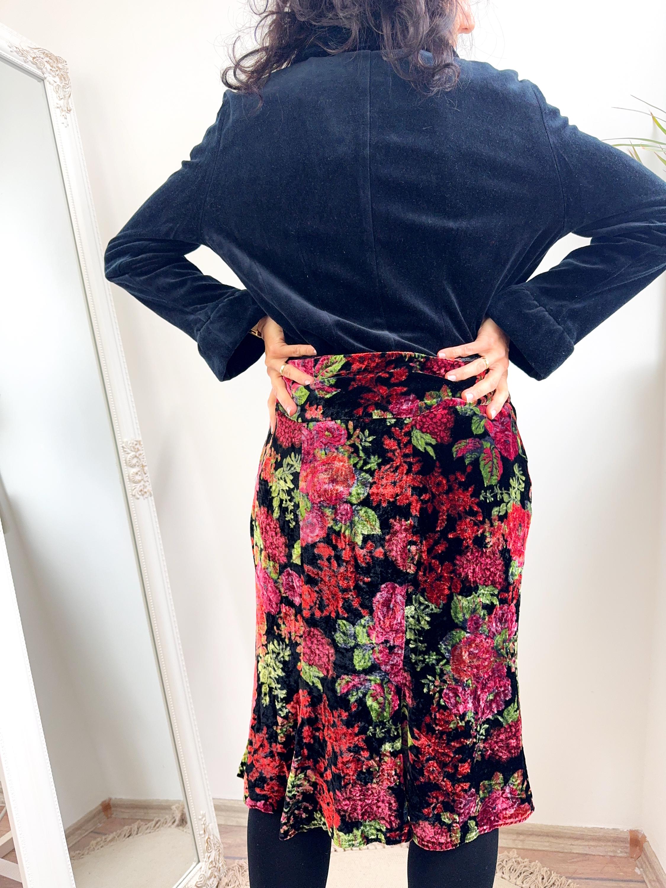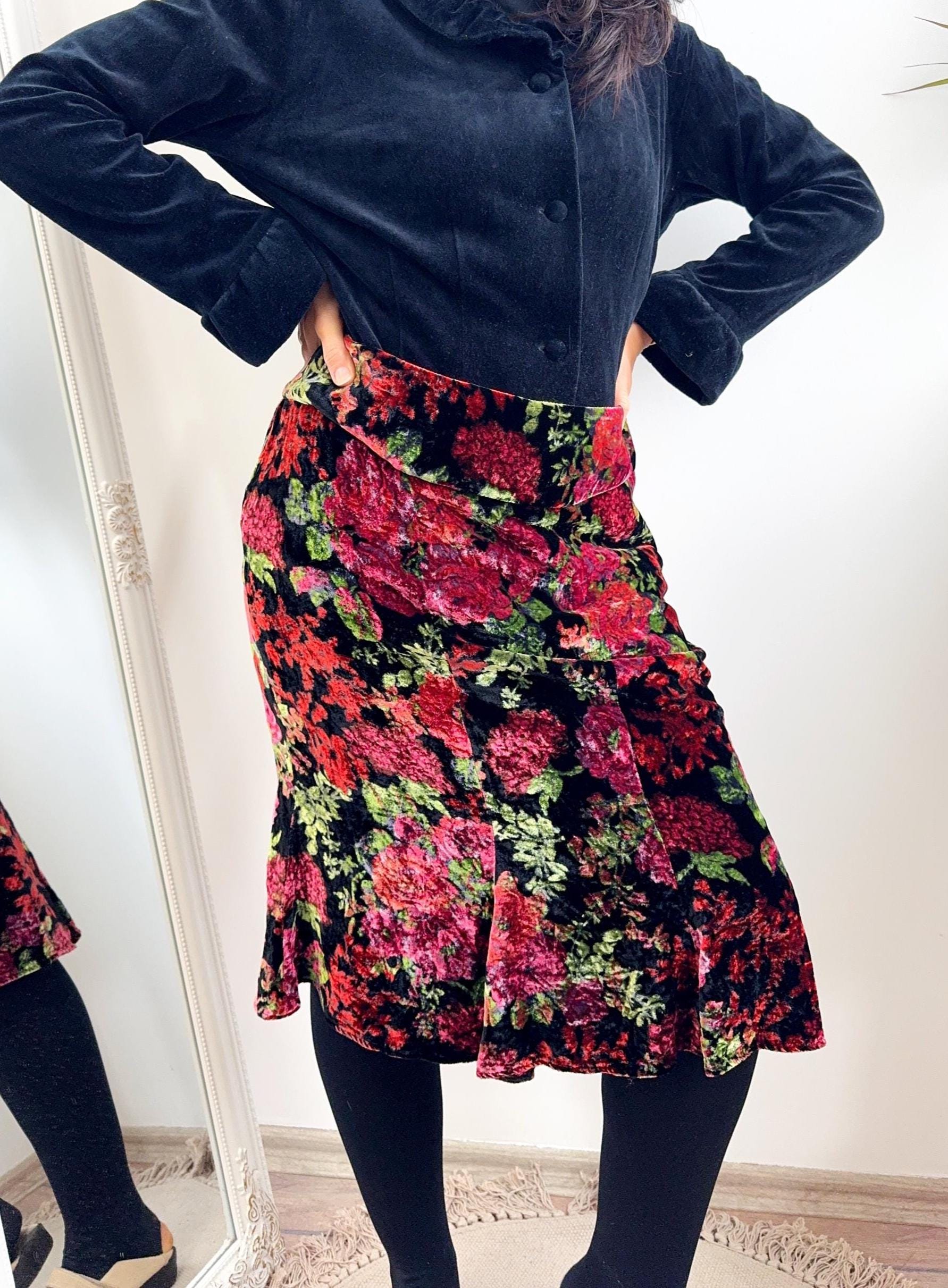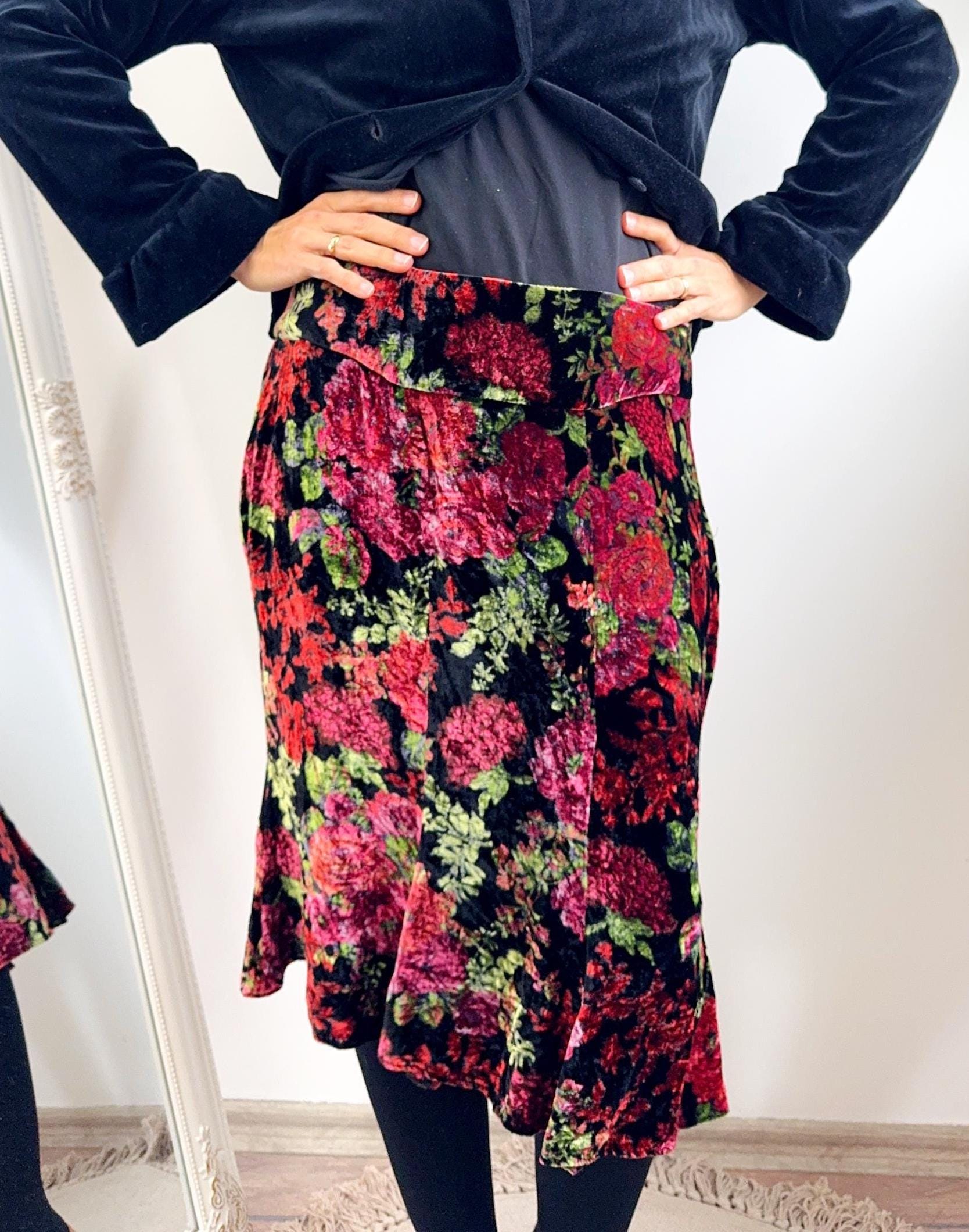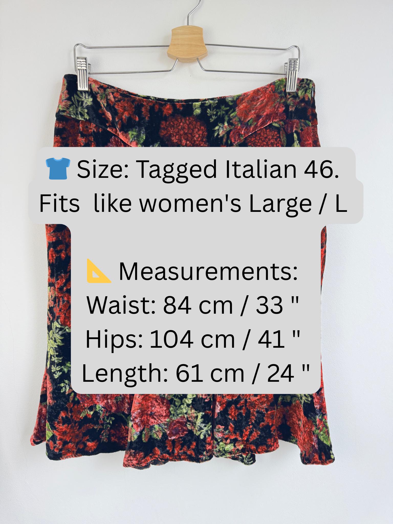 Make a glamorous statement with this exquisite vintage velvet midi skirt by the Italian brand Daniel & Mayer Milano in size Italy 46 which fits like L / large. This dark floral skirt perfectly embodies the dramatic, sensual style of the late 1990s and Y2K evening wear. Crafted from a plush, black velvet fabric, it features a stunning floral pattern in deep crimson reds, magenta pinks, and emerald greens, giving the fabric a beautiful, textured depth and shimmer as it moves.
