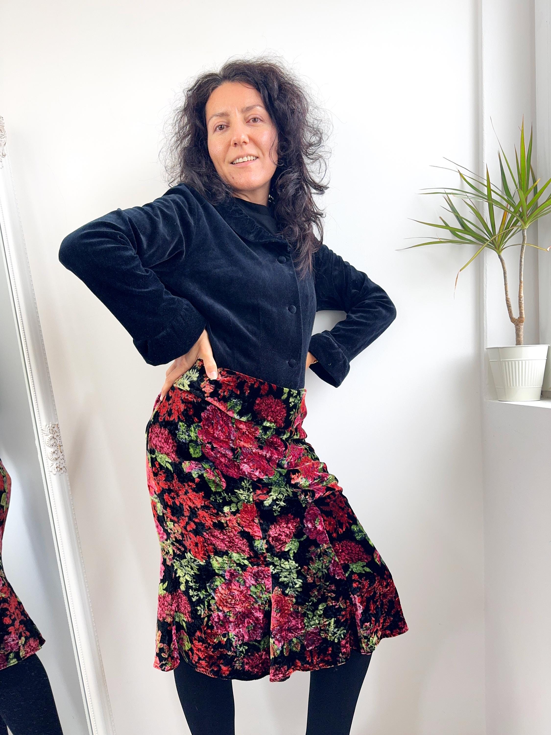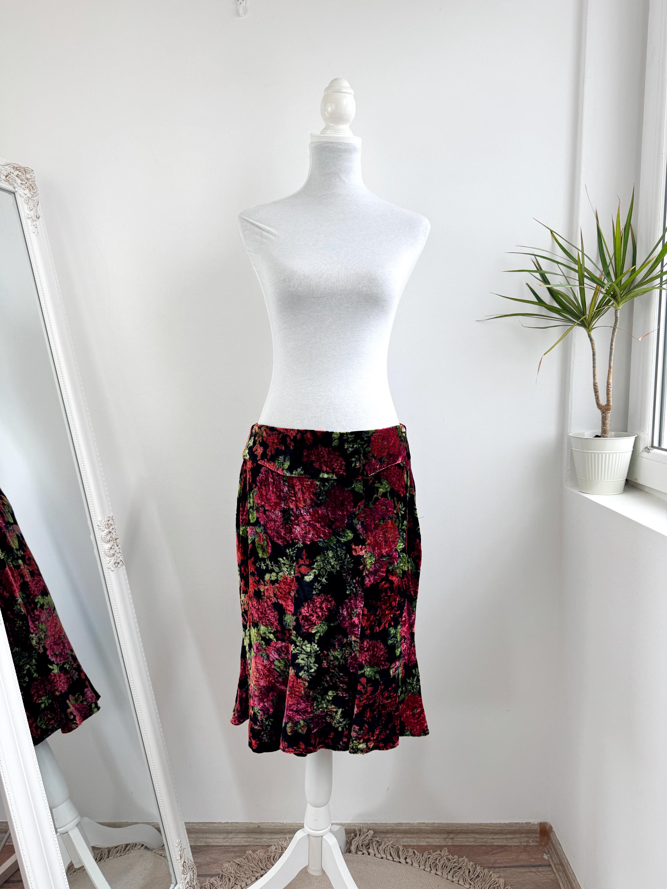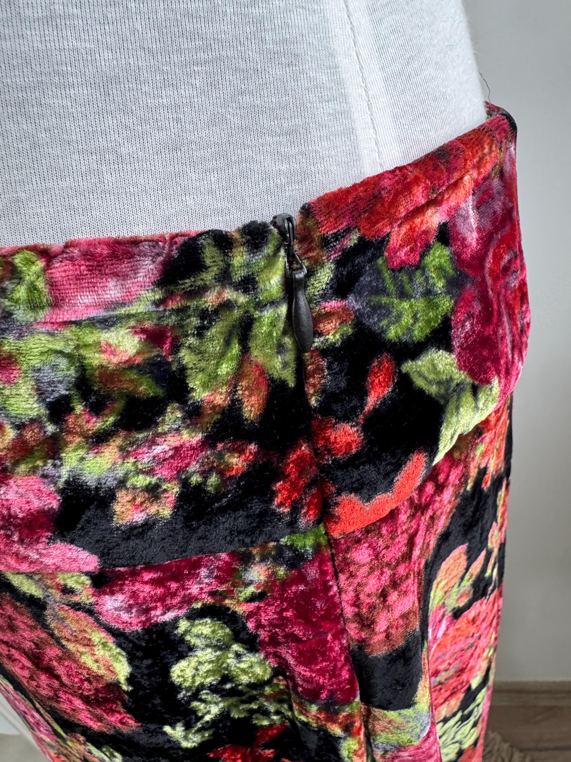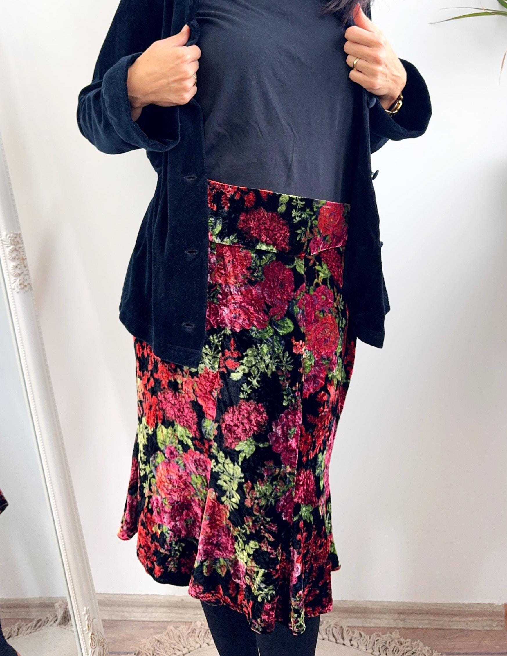 Make a glamorous statement with this exquisite vintage velvet midi skirt by the Italian brand Daniel & Mayer Milano in size Italy 46 which fits like L / large. This dark floral skirt perfectly embodies the dramatic, sensual style of the late 1990s and Y2K evening wear. Crafted from a plush, black velvet fabric, it features a stunning floral pattern in deep crimson reds, magenta pinks, and emerald greens, giving the fabric a beautiful, textured depth and shimmer as it moves.