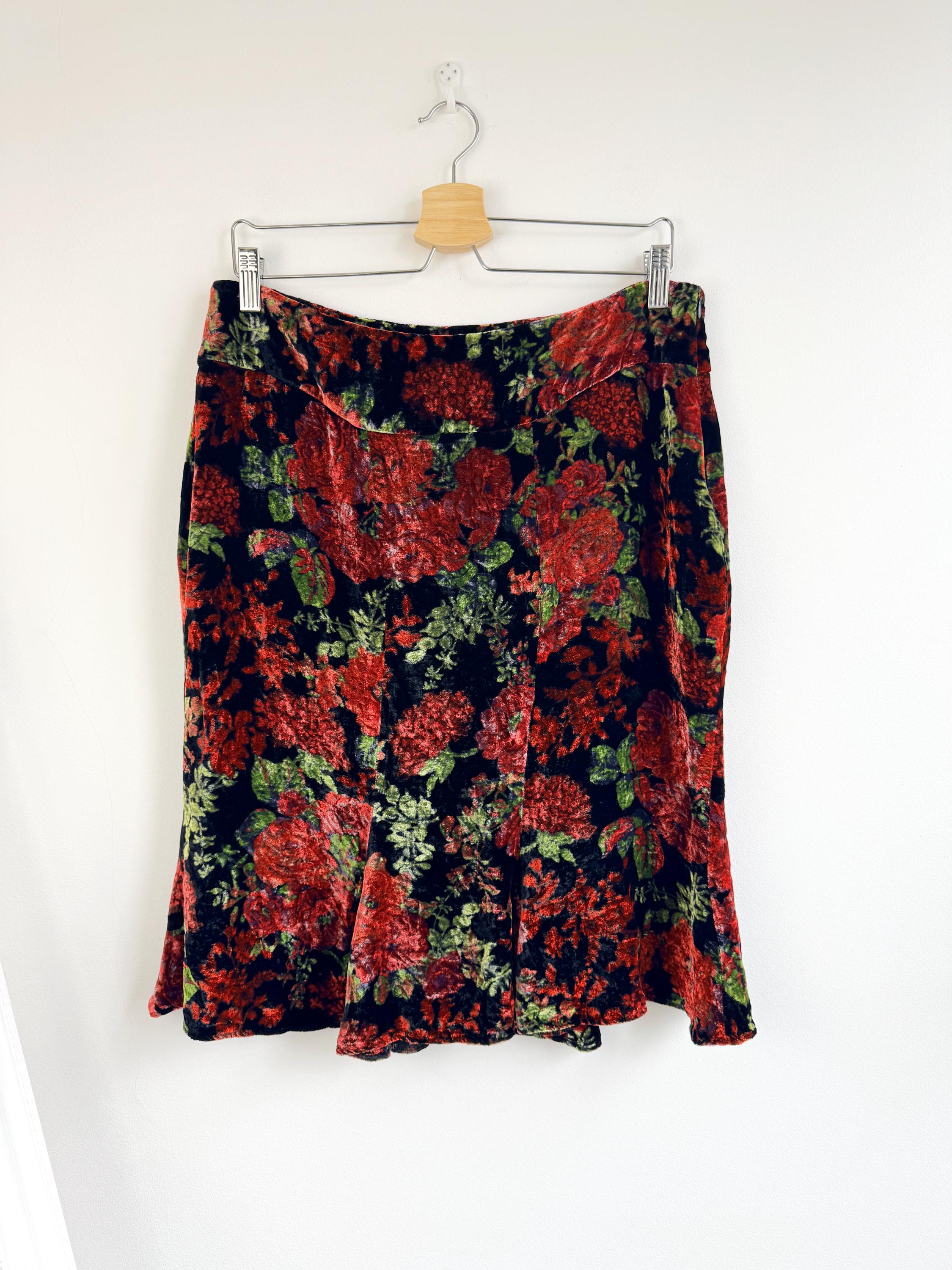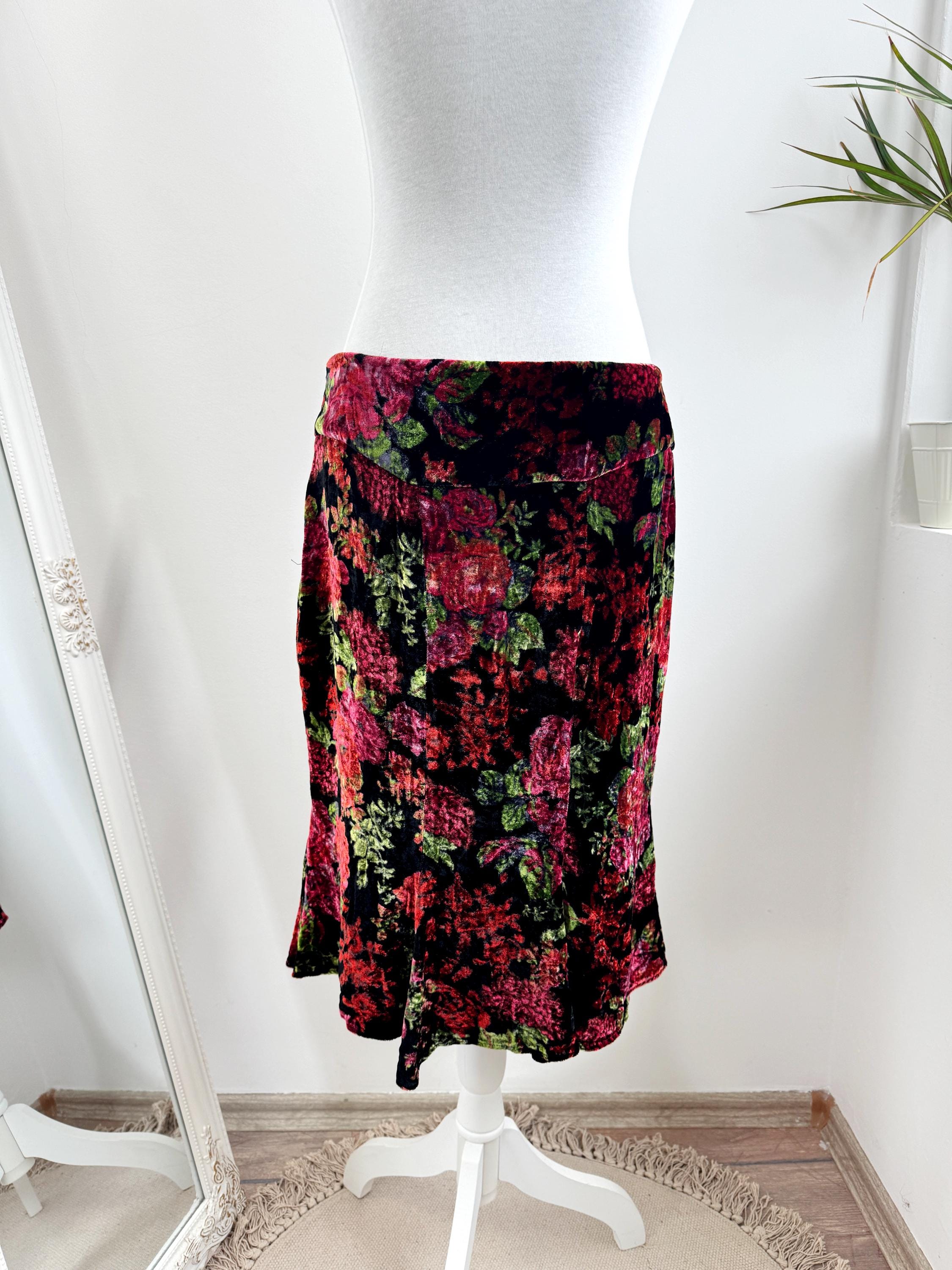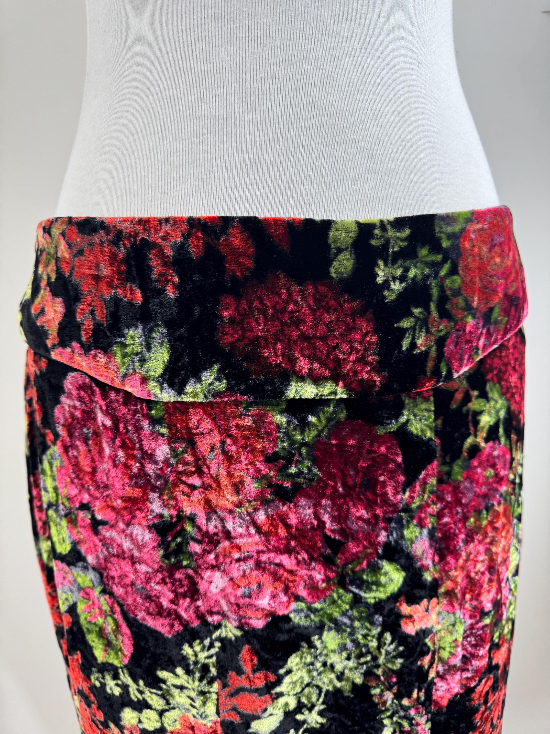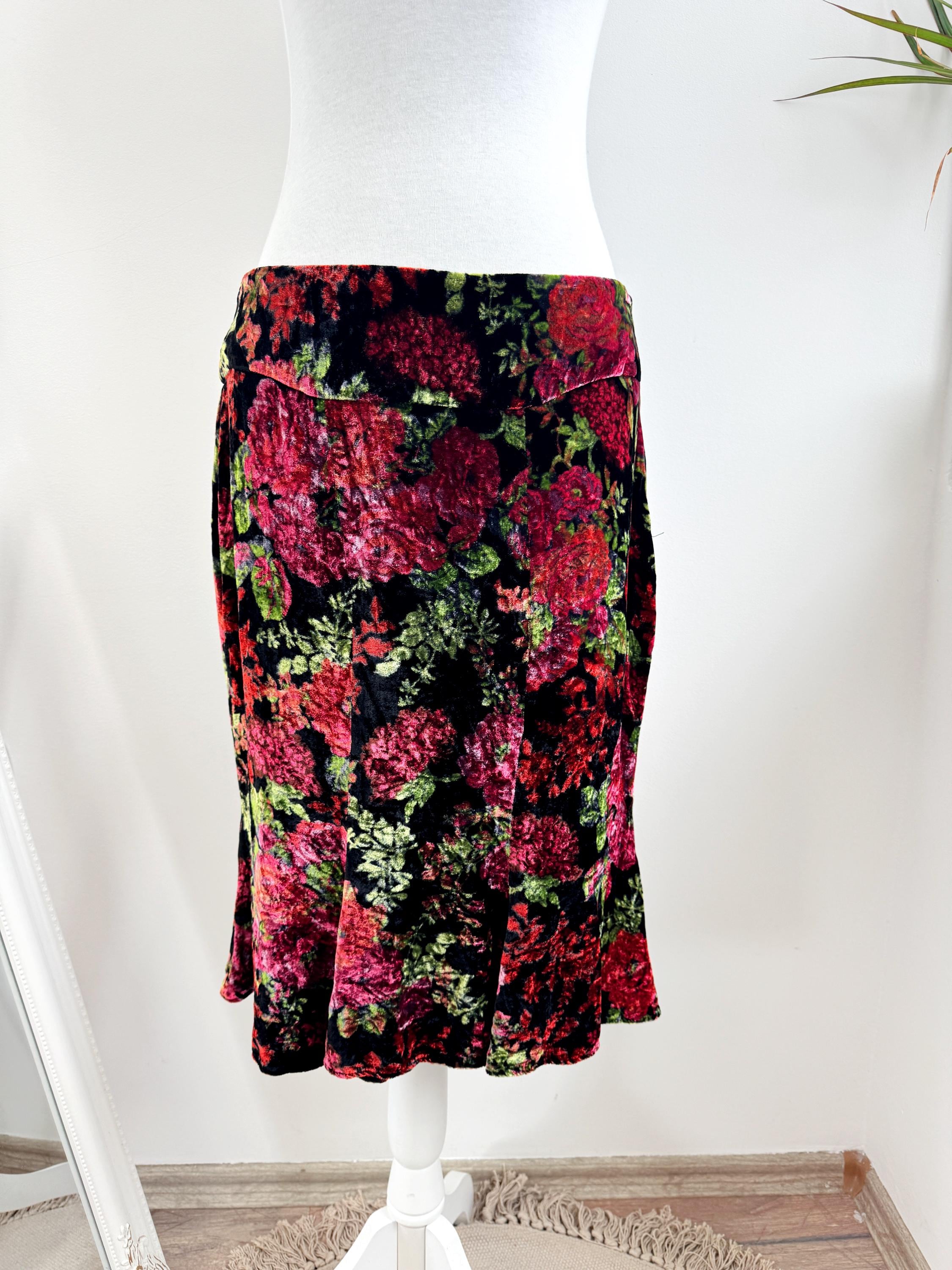 Make a glamorous statement with this exquisite vintage velvet midi skirt by the Italian brand Daniel & Mayer Milano in size Italy 46 which fits like L / large. This dark floral skirt perfectly embodies the dramatic, sensual style of the late 1990s and Y2K evening wear. Crafted from a plush, black velvet fabric, it features a stunning floral pattern in deep crimson reds, magenta pinks, and emerald greens, giving the fabric a beautiful, textured depth and shimmer as it moves.