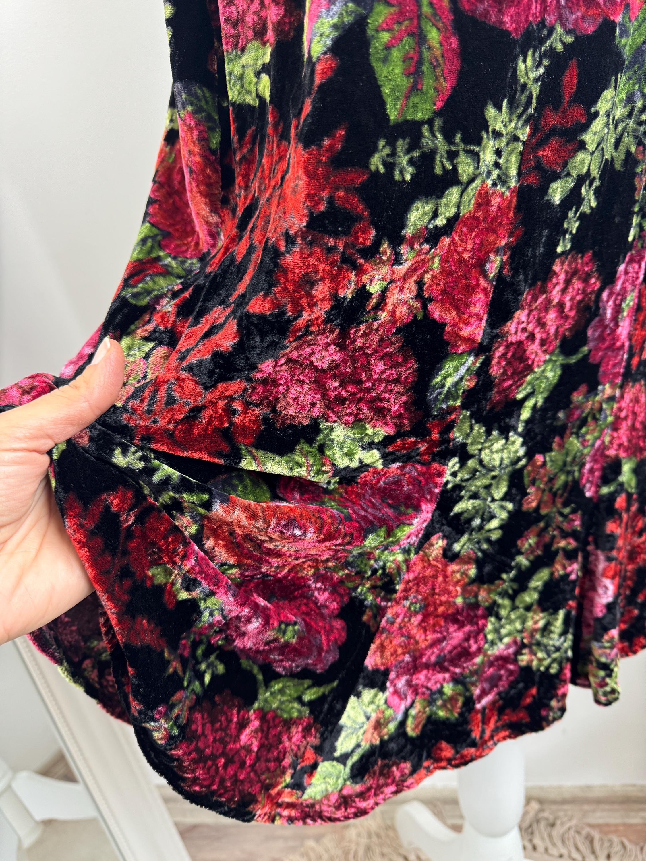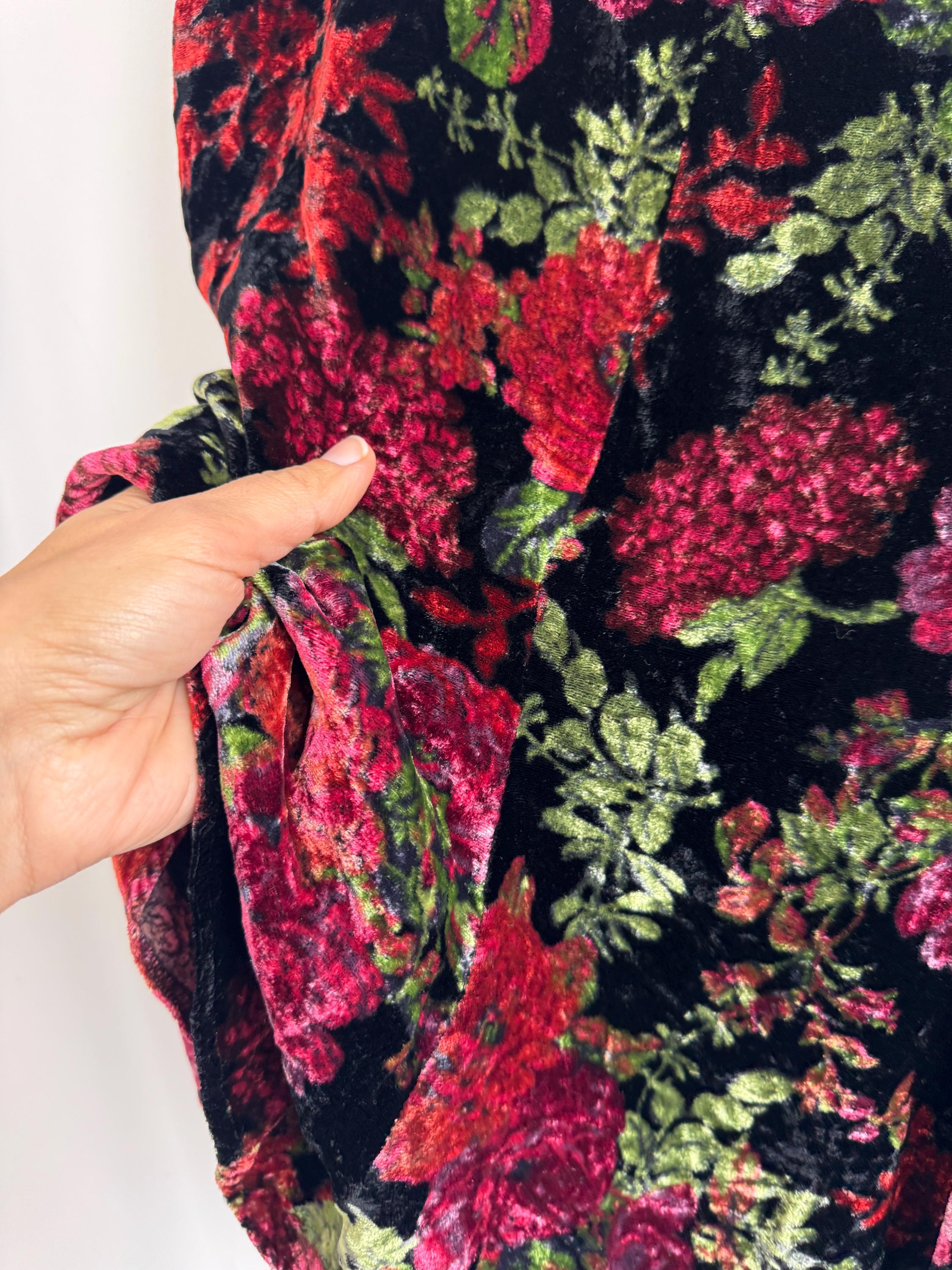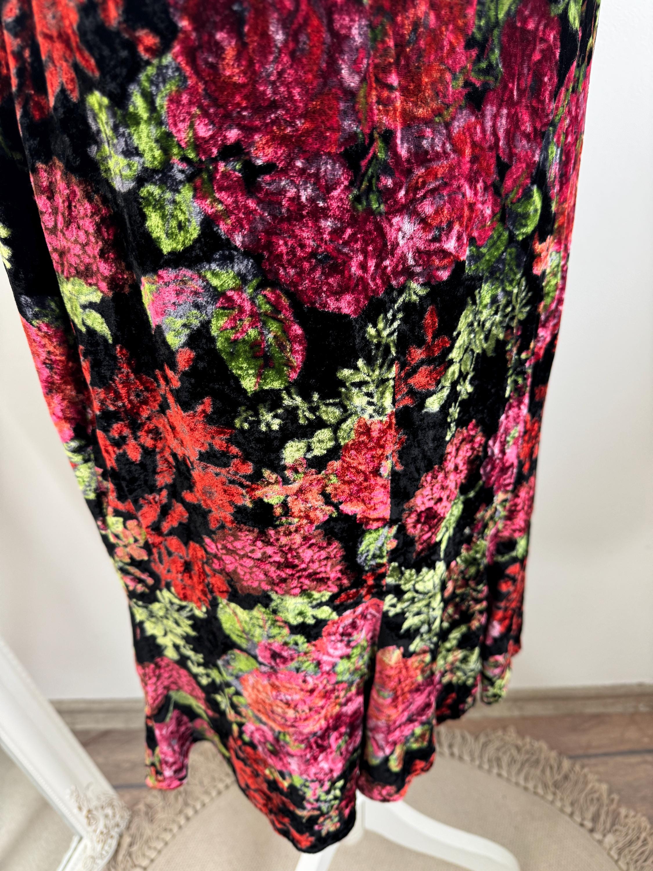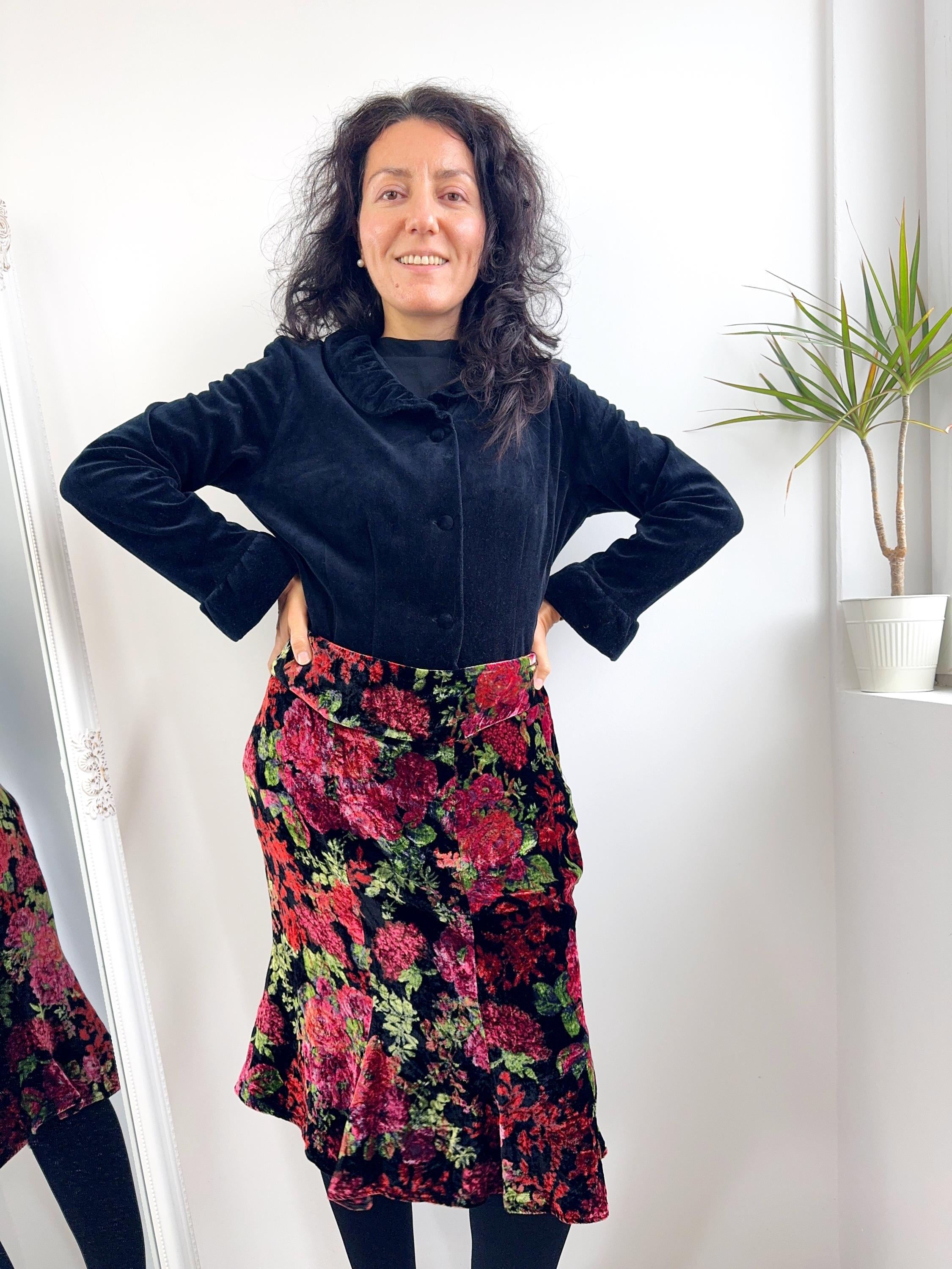 Make a glamorous statement with this exquisite vintage velvet midi skirt by the Italian brand Daniel & Mayer Milano in size Italy 46 which fits like L / large. This dark floral skirt perfectly embodies the dramatic, sensual style of the late 1990s and Y2K evening wear. Crafted from a plush, black velvet fabric, it features a stunning floral pattern in deep crimson reds, magenta pinks, and emerald greens, giving the fabric a beautiful, textured depth and shimmer as it moves.