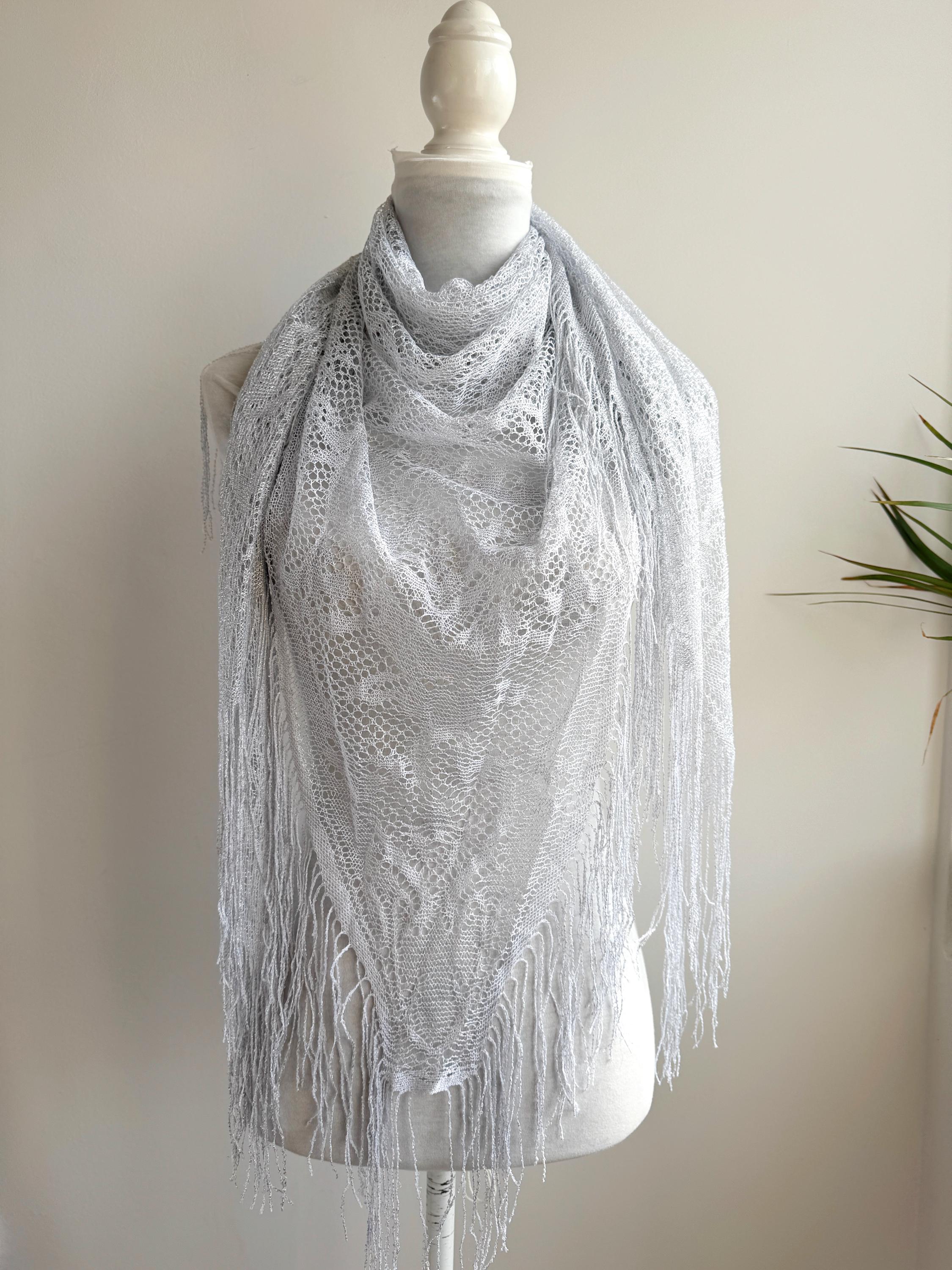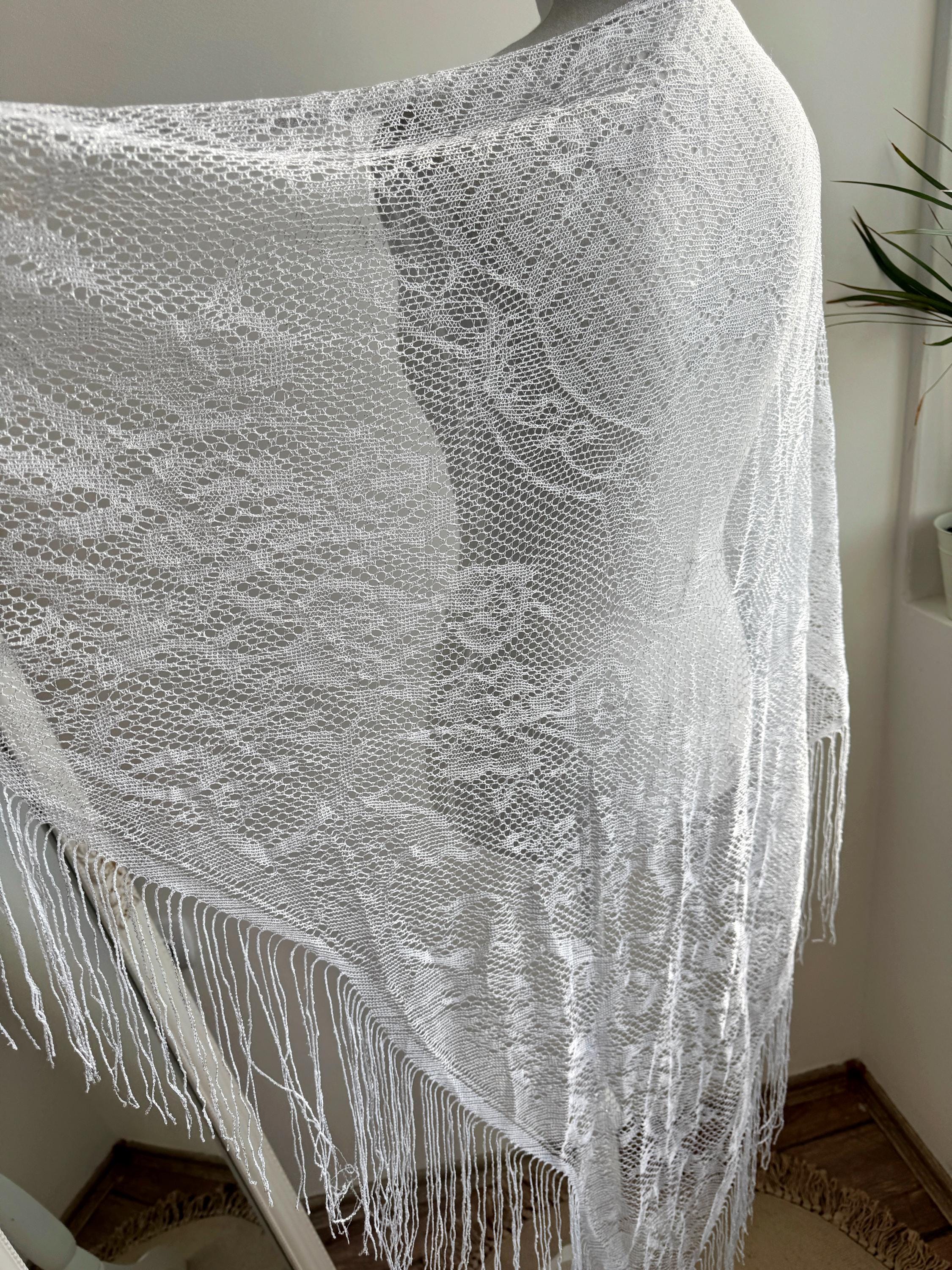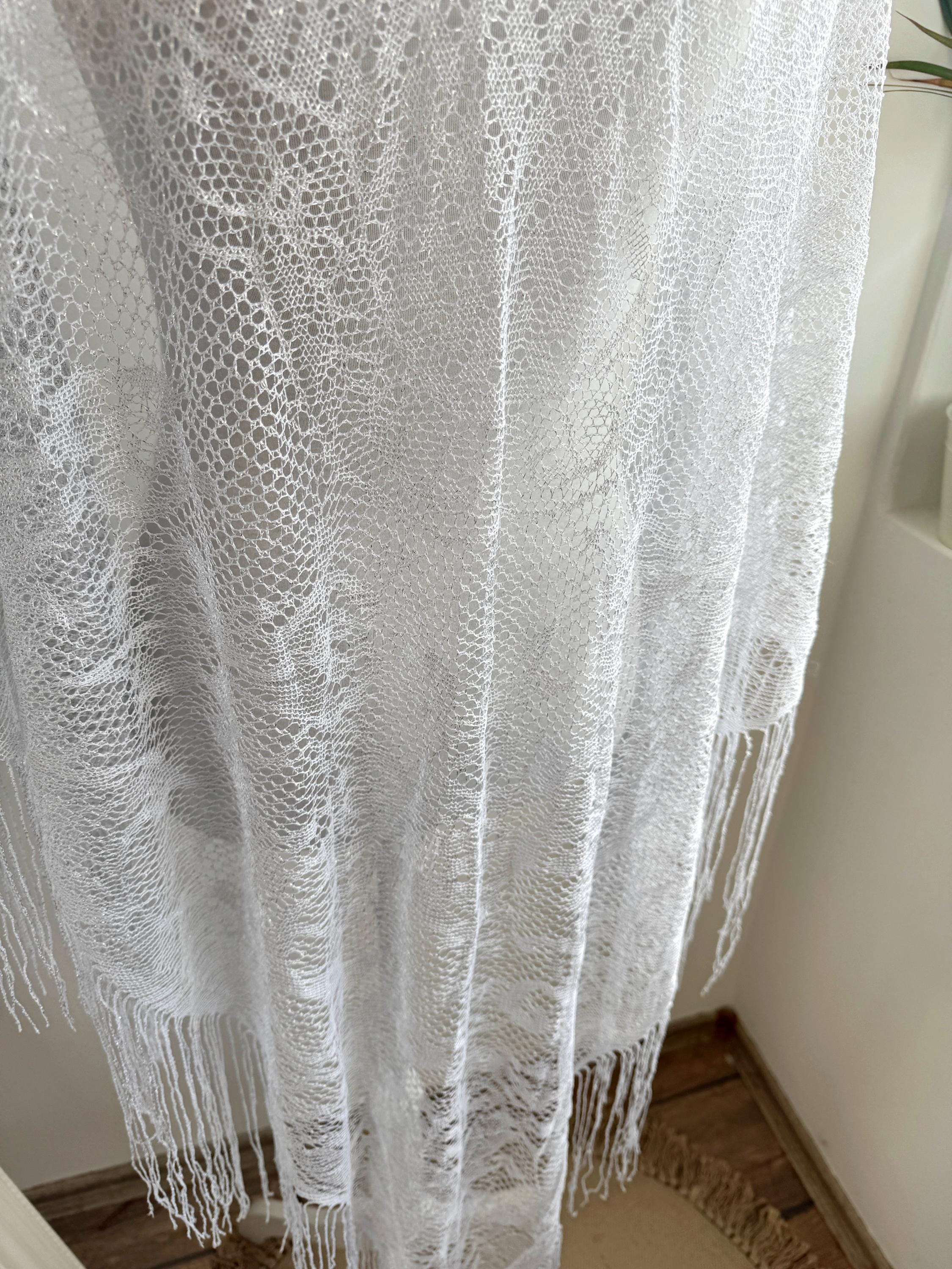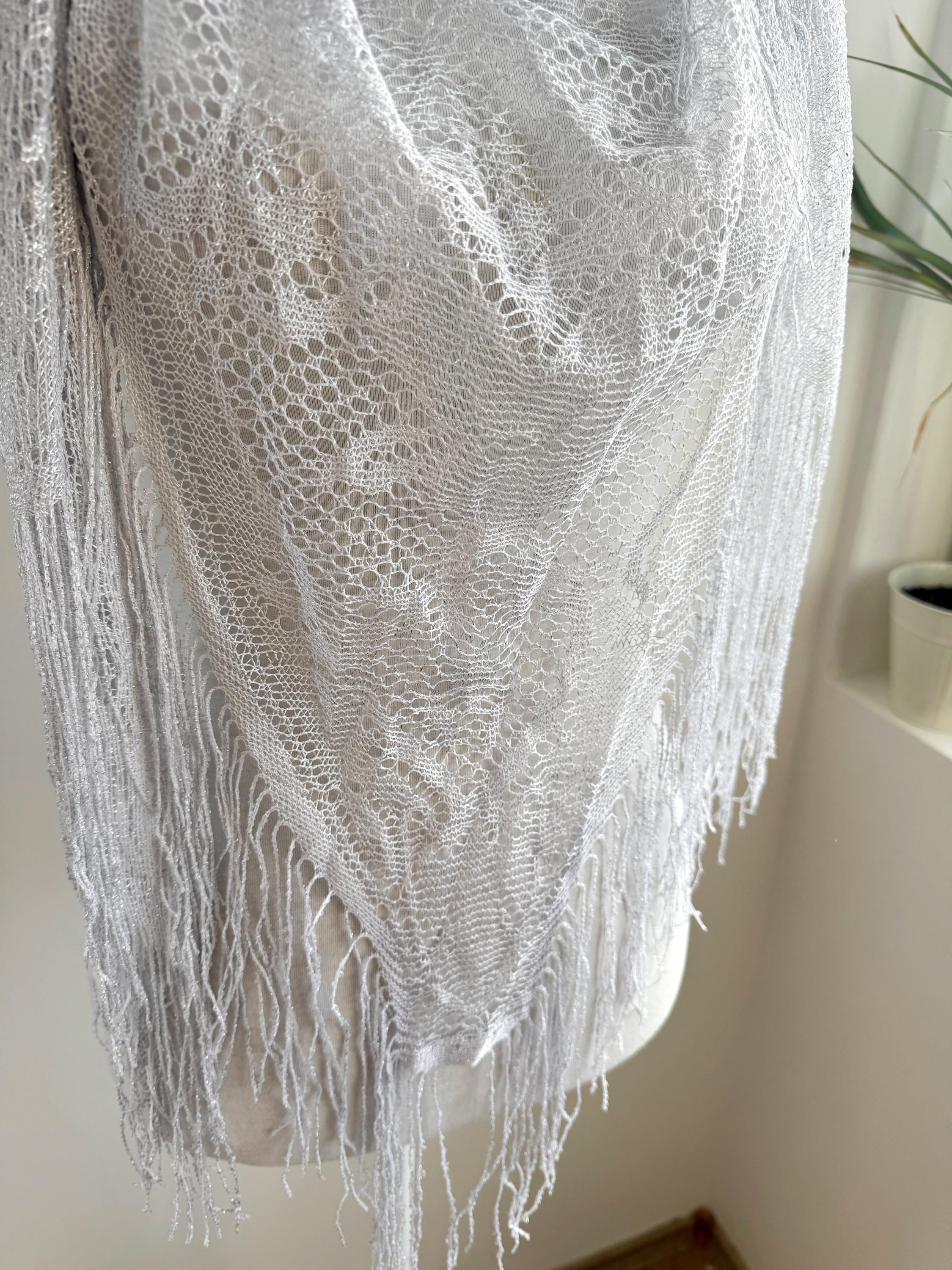 This is a vintage white bohemian lace shawl with silver lame and lovely floral decoration and fringed detailing around the edges. This see through scarf has a triangular shape. It is very delicate and lightweight. Perfect to wear over a dress, a solid color blouse or turtleneck. This white lace shawl will add a pop a style to your outfit.