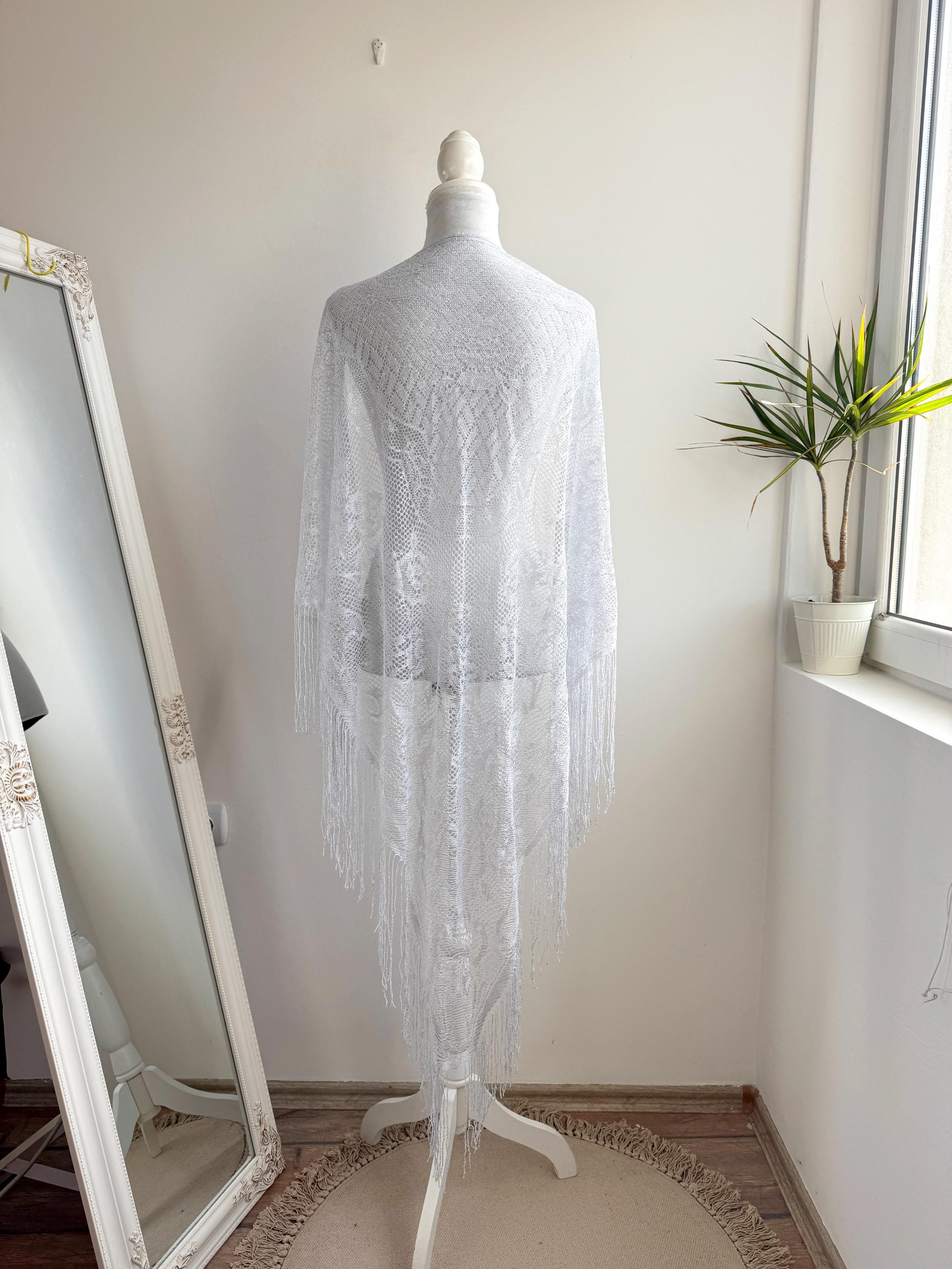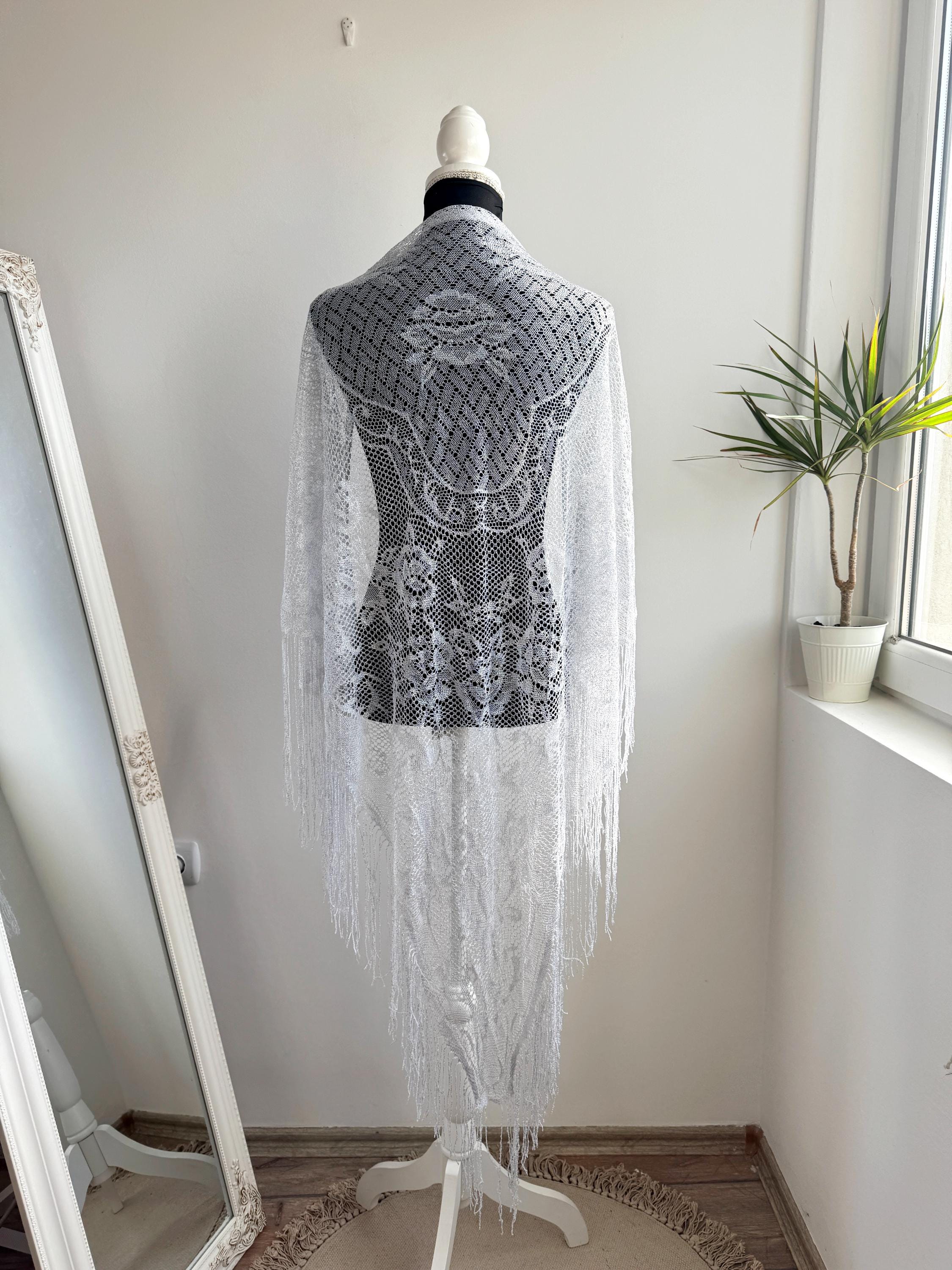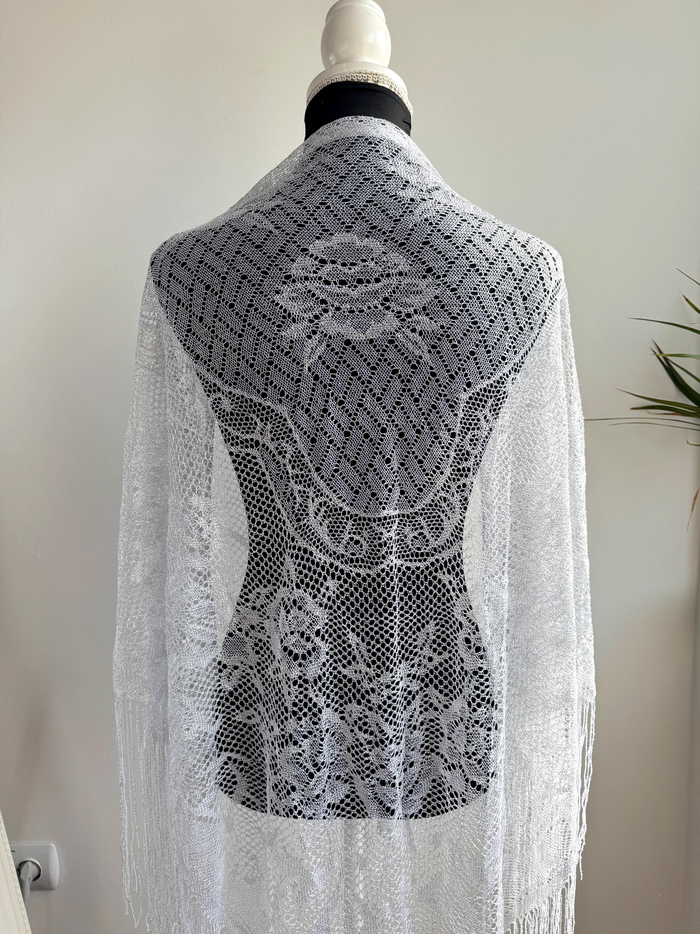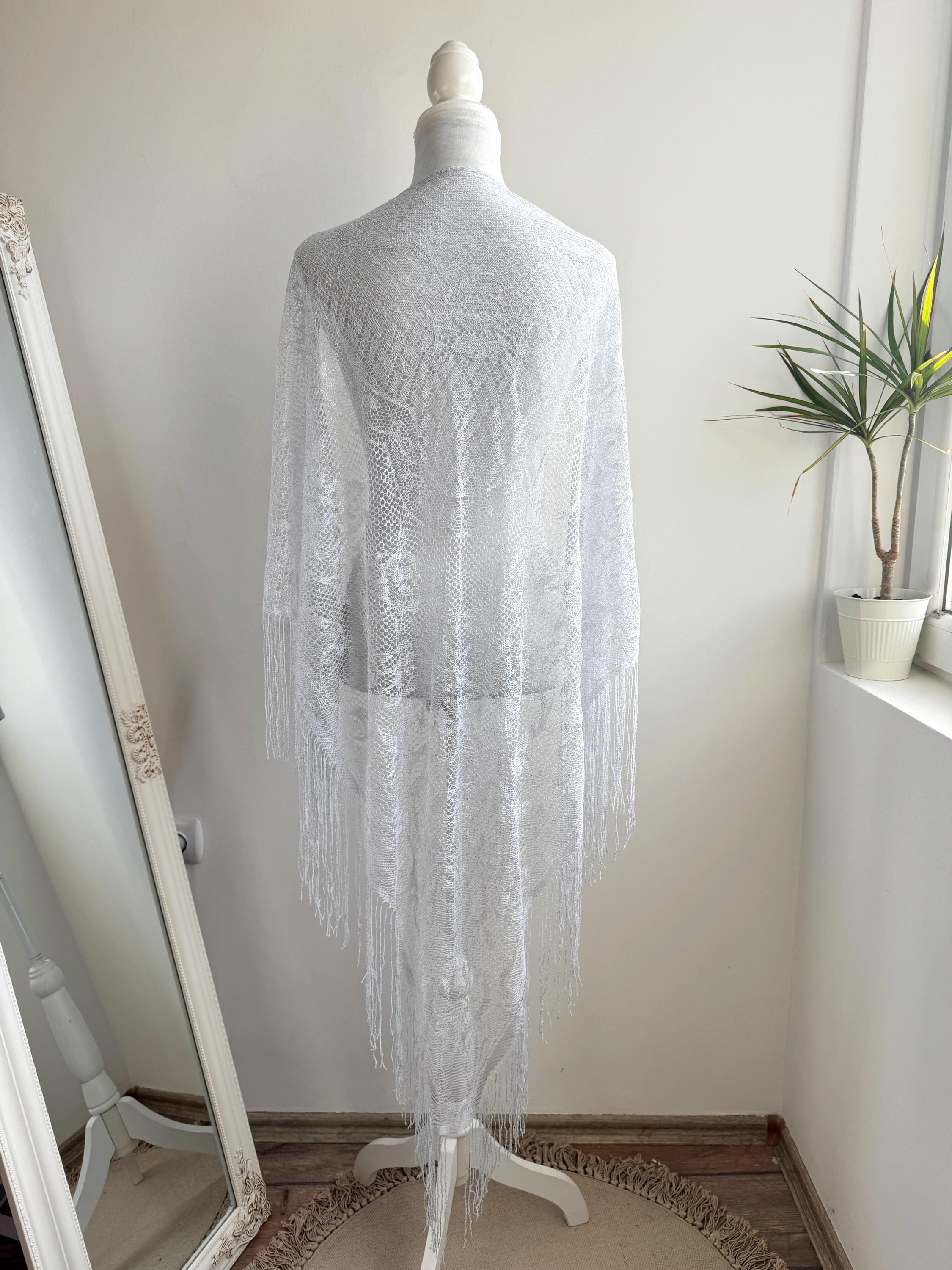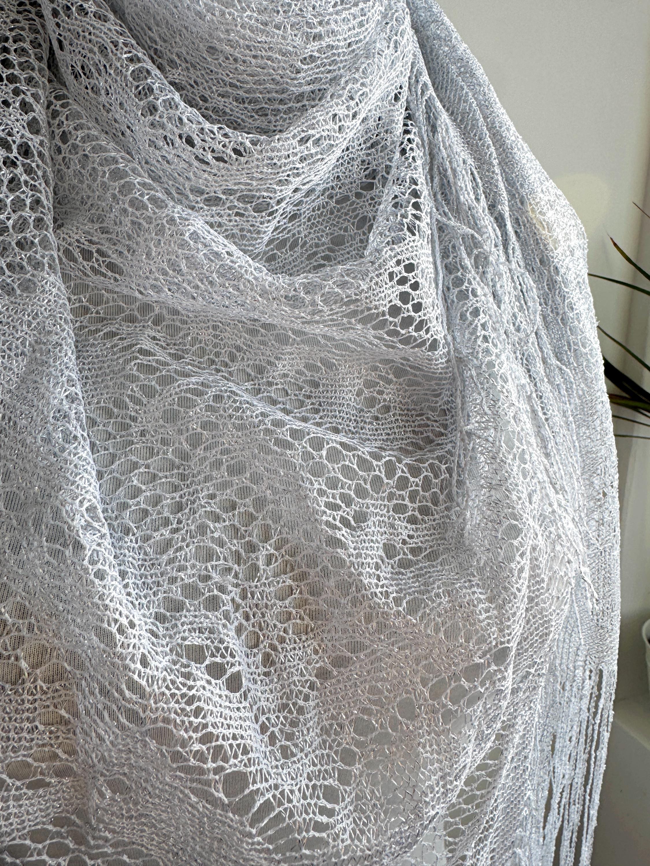 This is a vintage white bohemian lace shawl with silver lame and lovely floral decoration and fringed detailing around the edges. This see through scarf has a triangular shape. It is very delicate and lightweight. Perfect to wear over a dress, a solid color blouse or turtleneck. This white lace shawl will add a pop a style to your outfit.