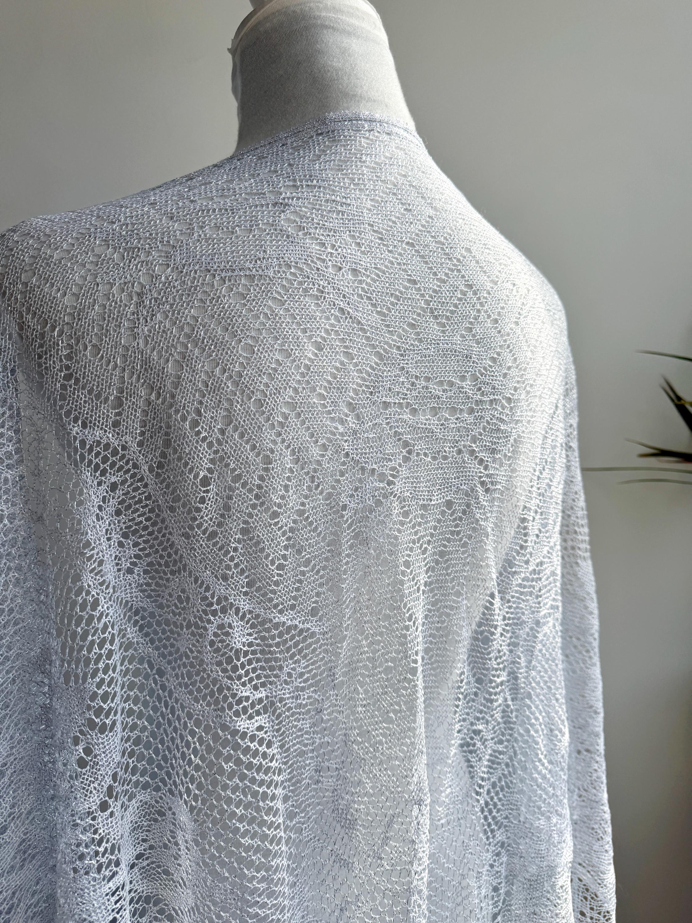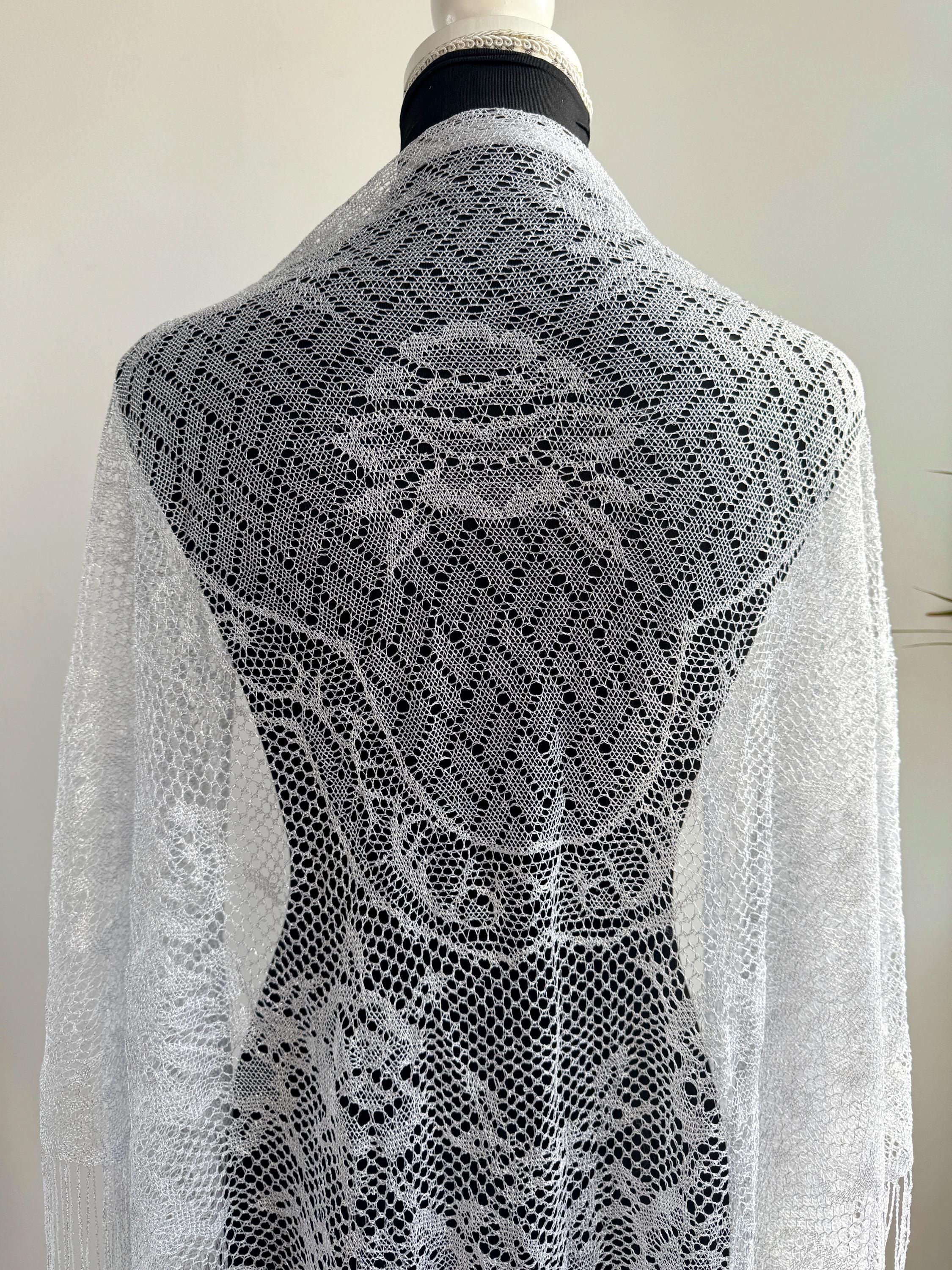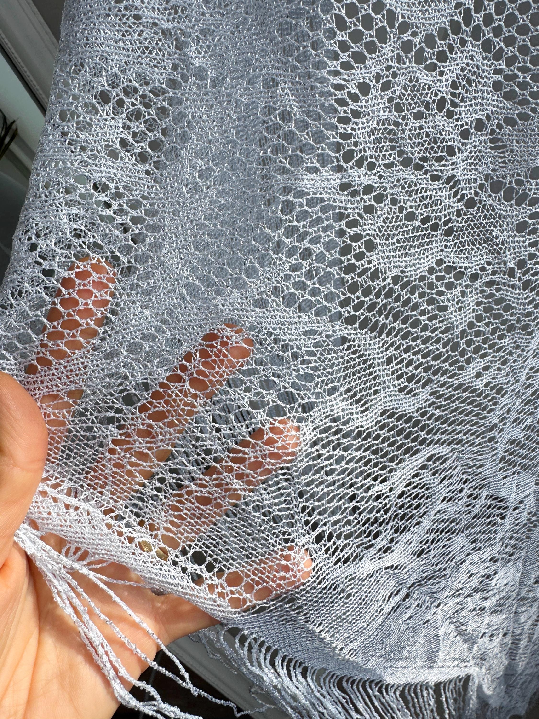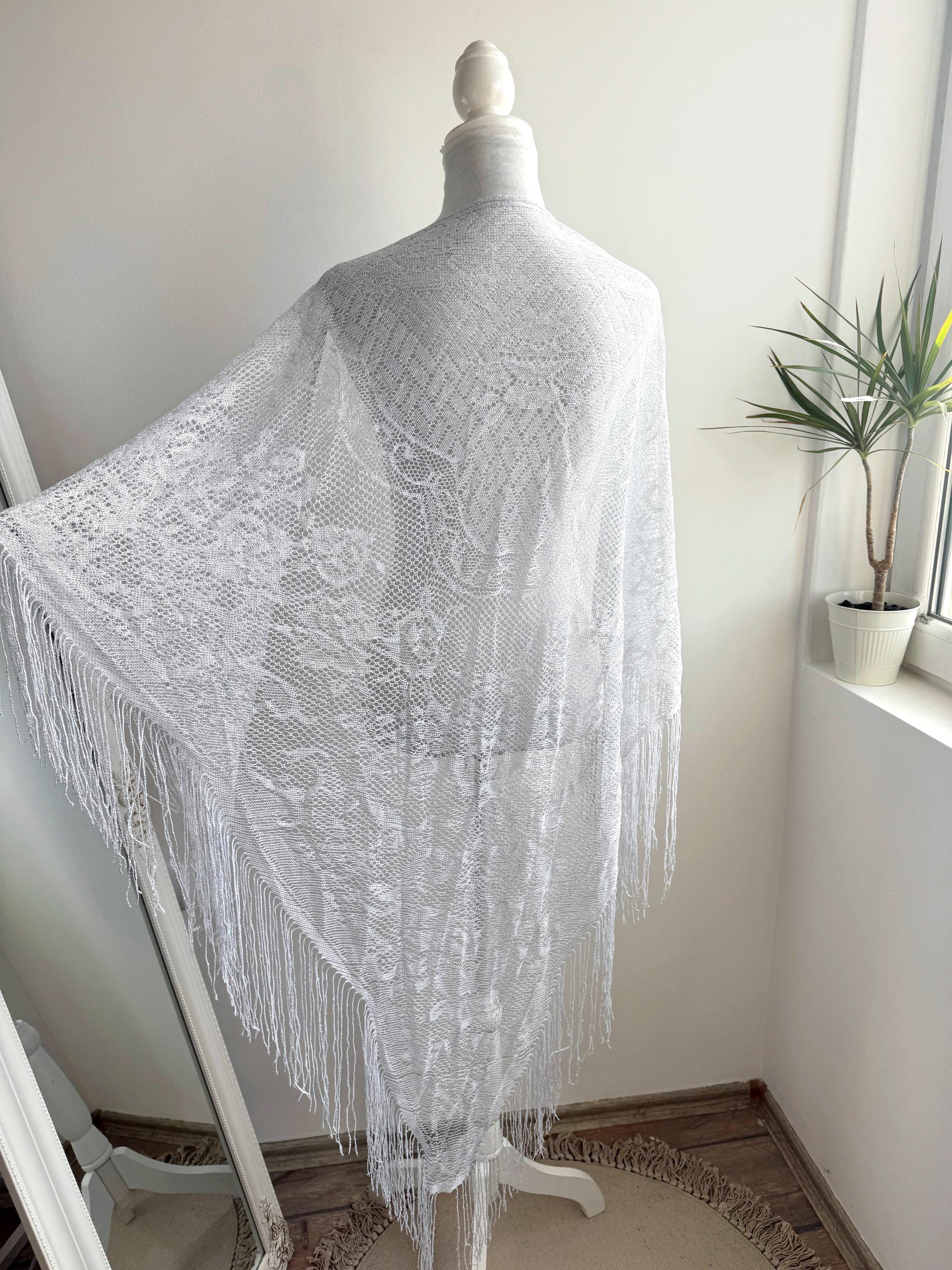 This is a vintage white bohemian lace shawl with silver lame and lovely floral decoration and fringed detailing around the edges. This see through scarf has a triangular shape. It is very delicate and lightweight. Perfect to wear over a dress, a solid color blouse or turtleneck. This white lace shawl will add a pop a style to your outfit.