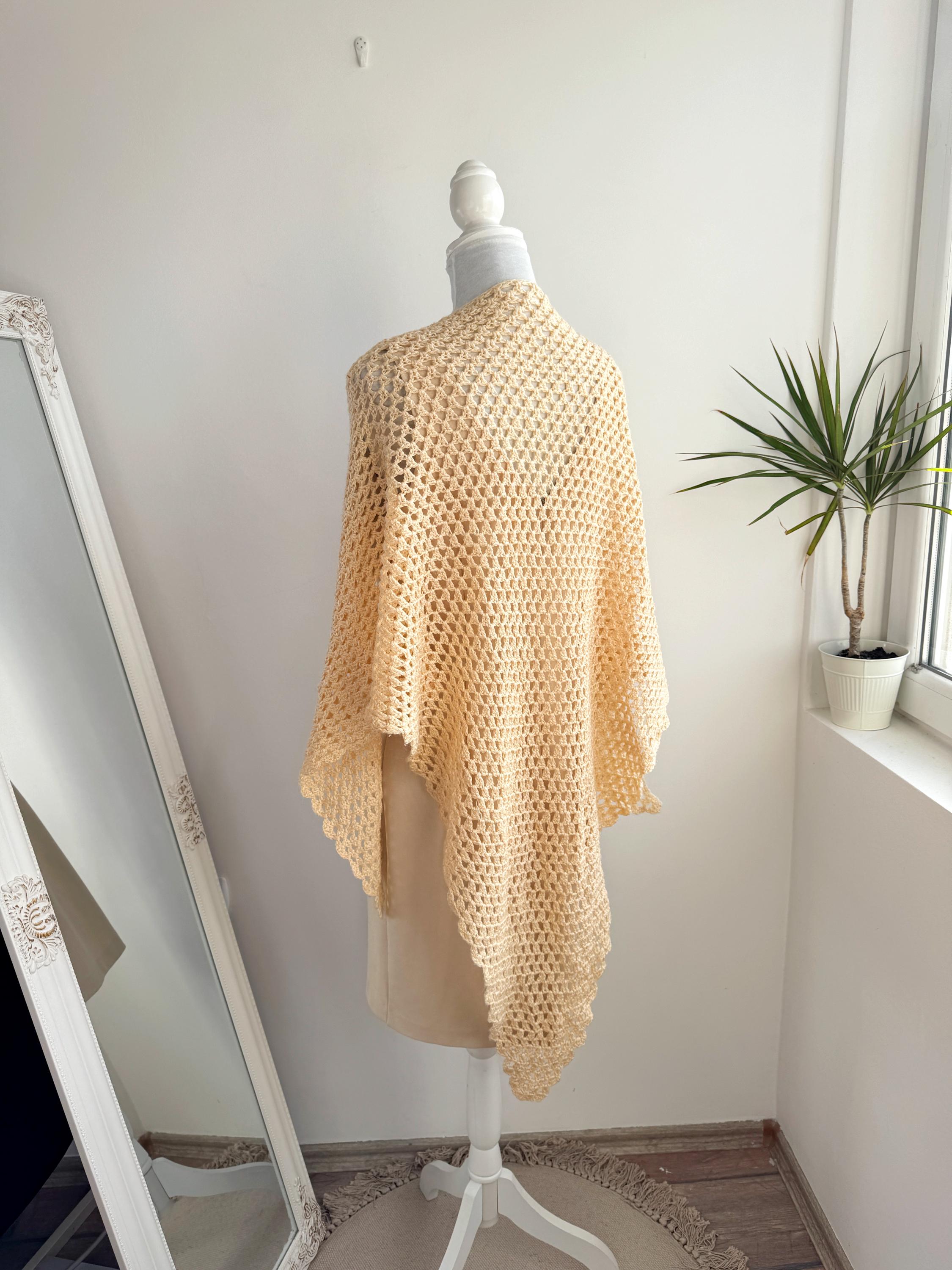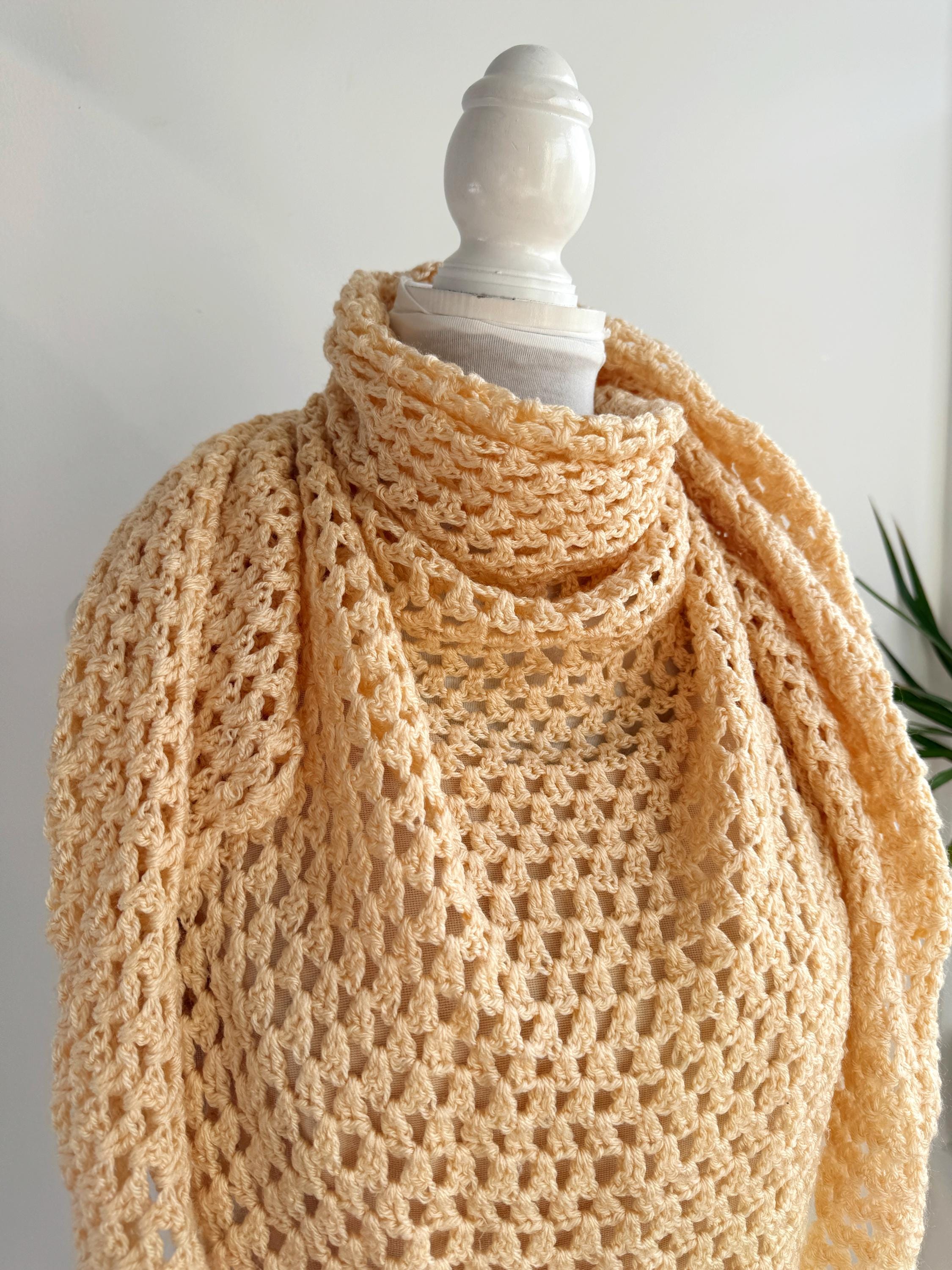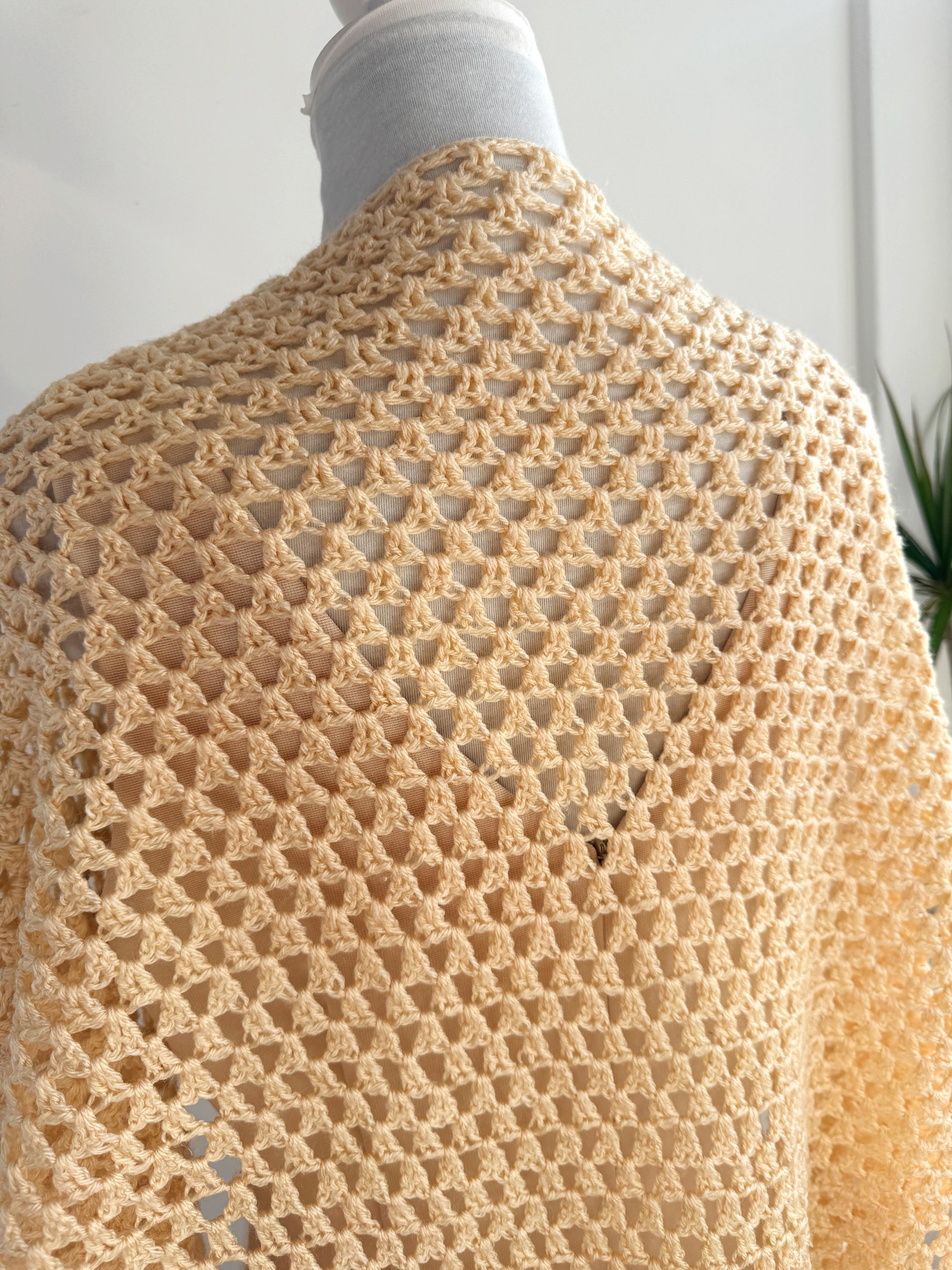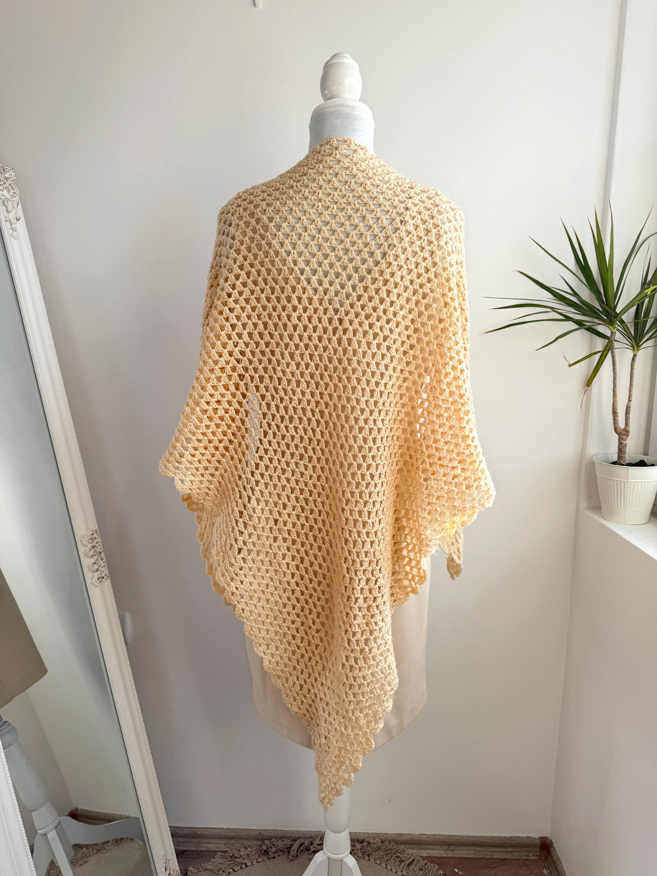 This beautiful vintage crochet triangle shawl is the perfect blend of bohemian charm and delicate craftsmanship. Hand-crafted with an intricate open-knit pattern, this airy wrap features a soft, pale yellow/cream hue that adds a touch of vintage elegance to any outfit. Its generous size makes it incredibly versatile—wear it as a classic shoulder wrap for a wedding or evening event, or style it as a cozy, oversized neck scarf for a more casual, retro-inspired look.