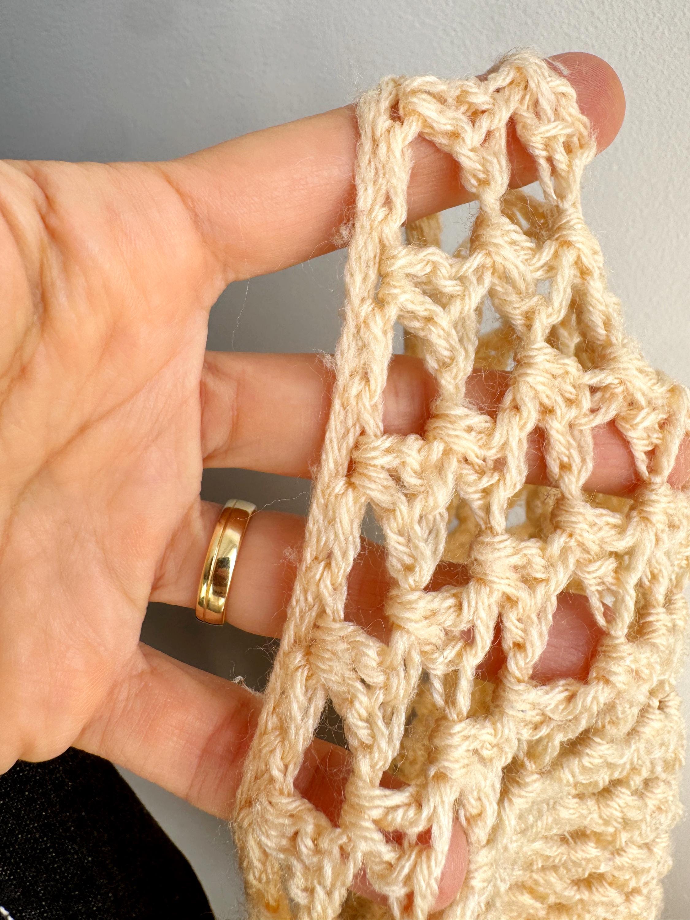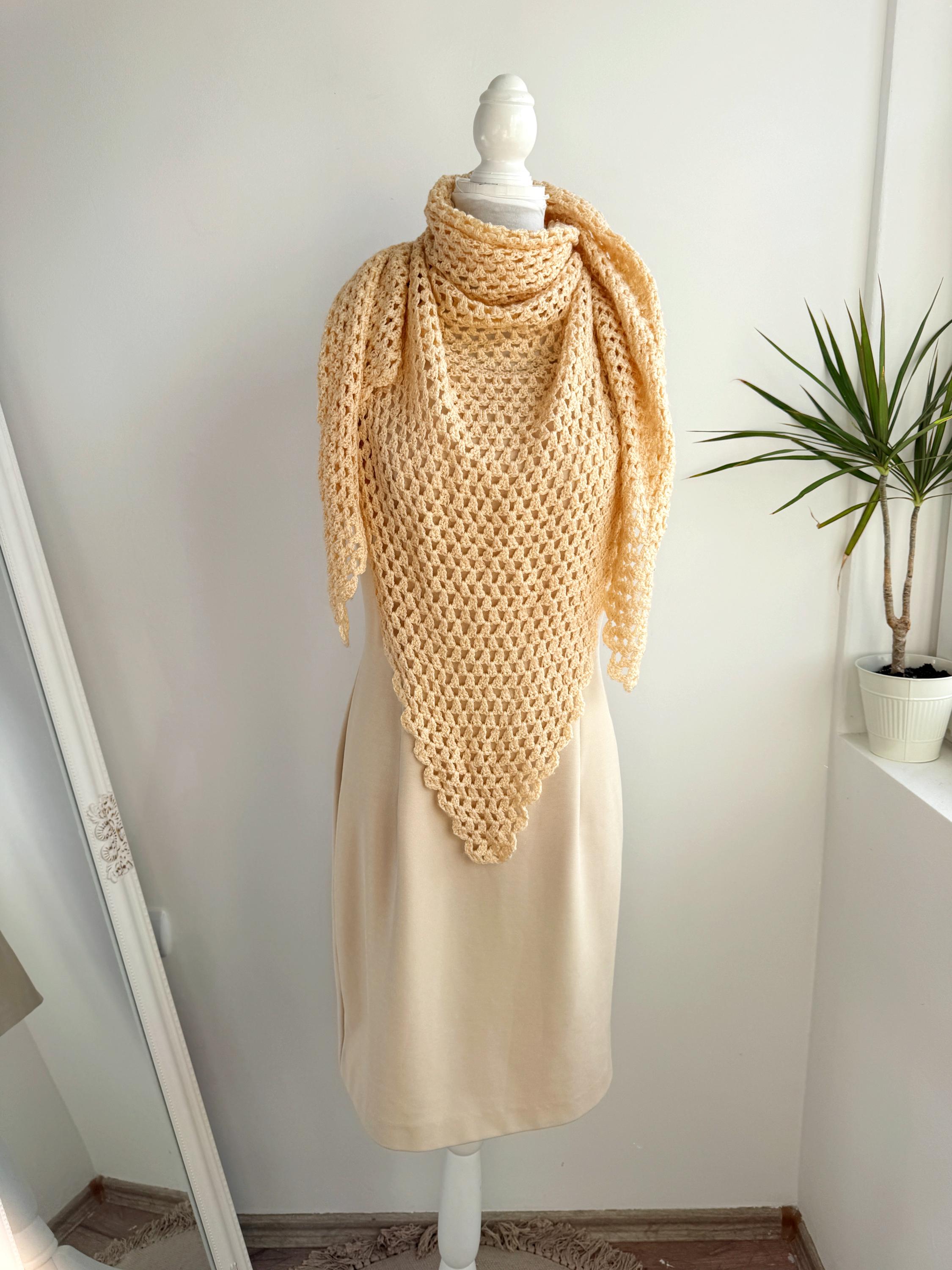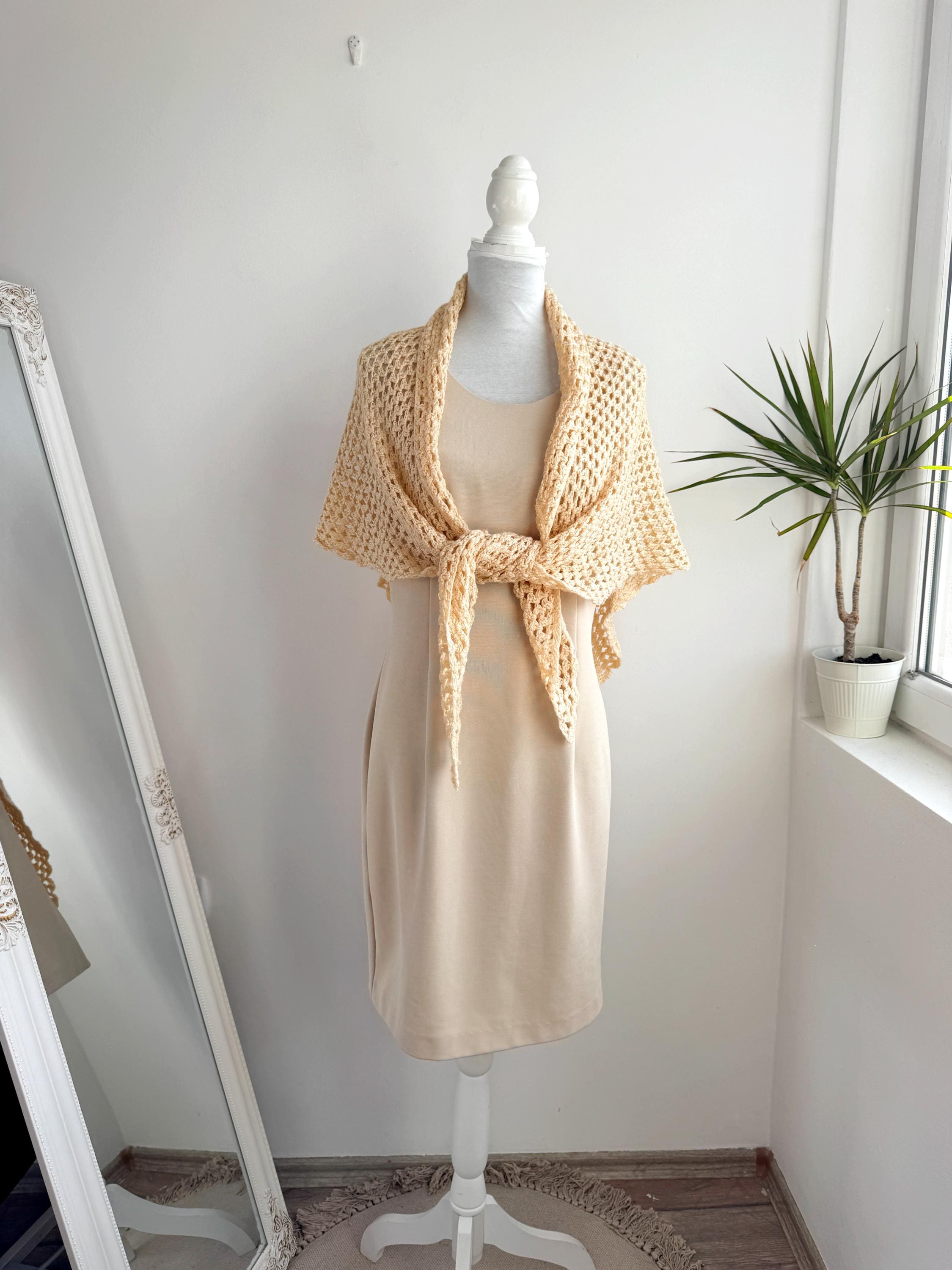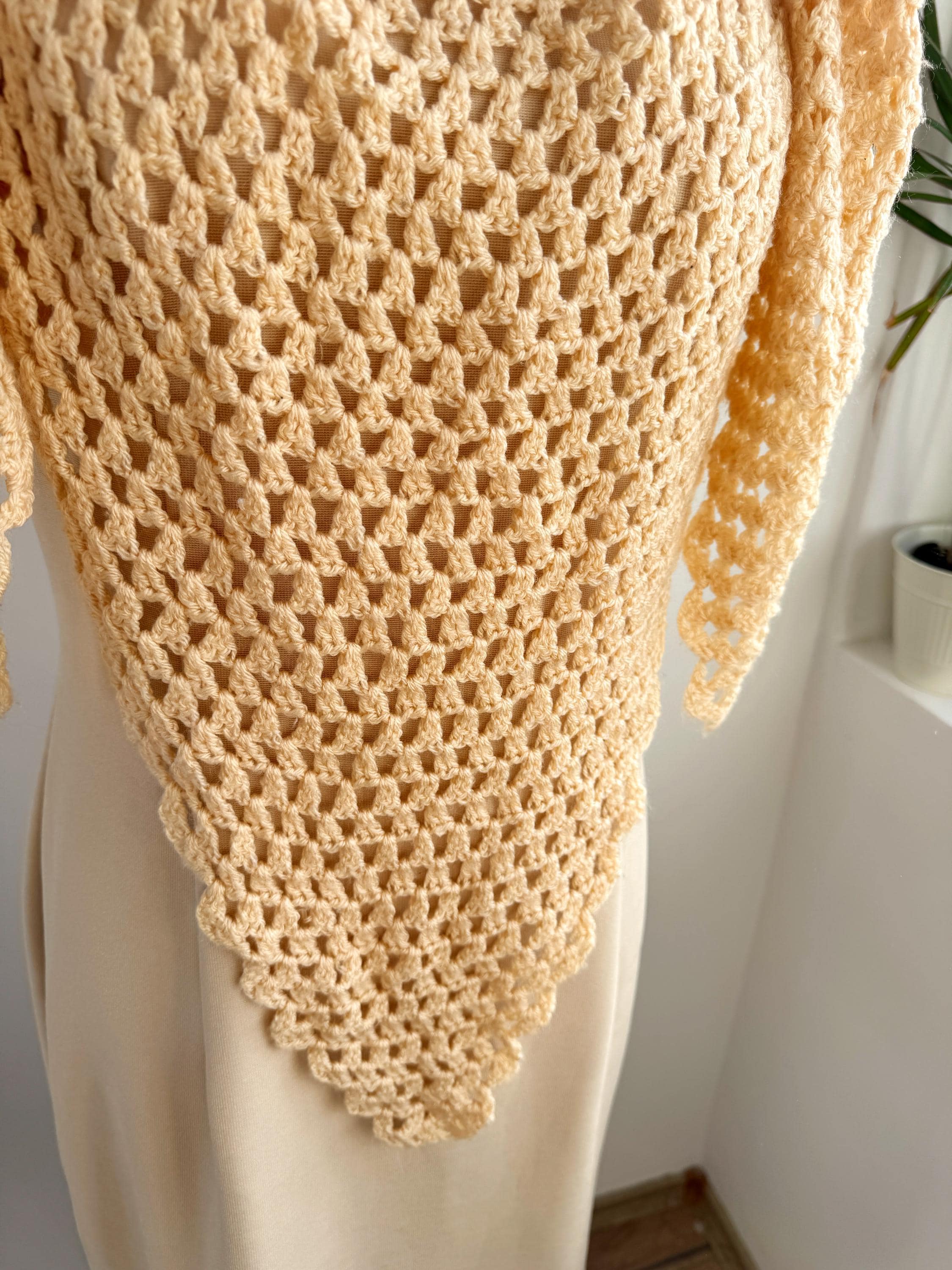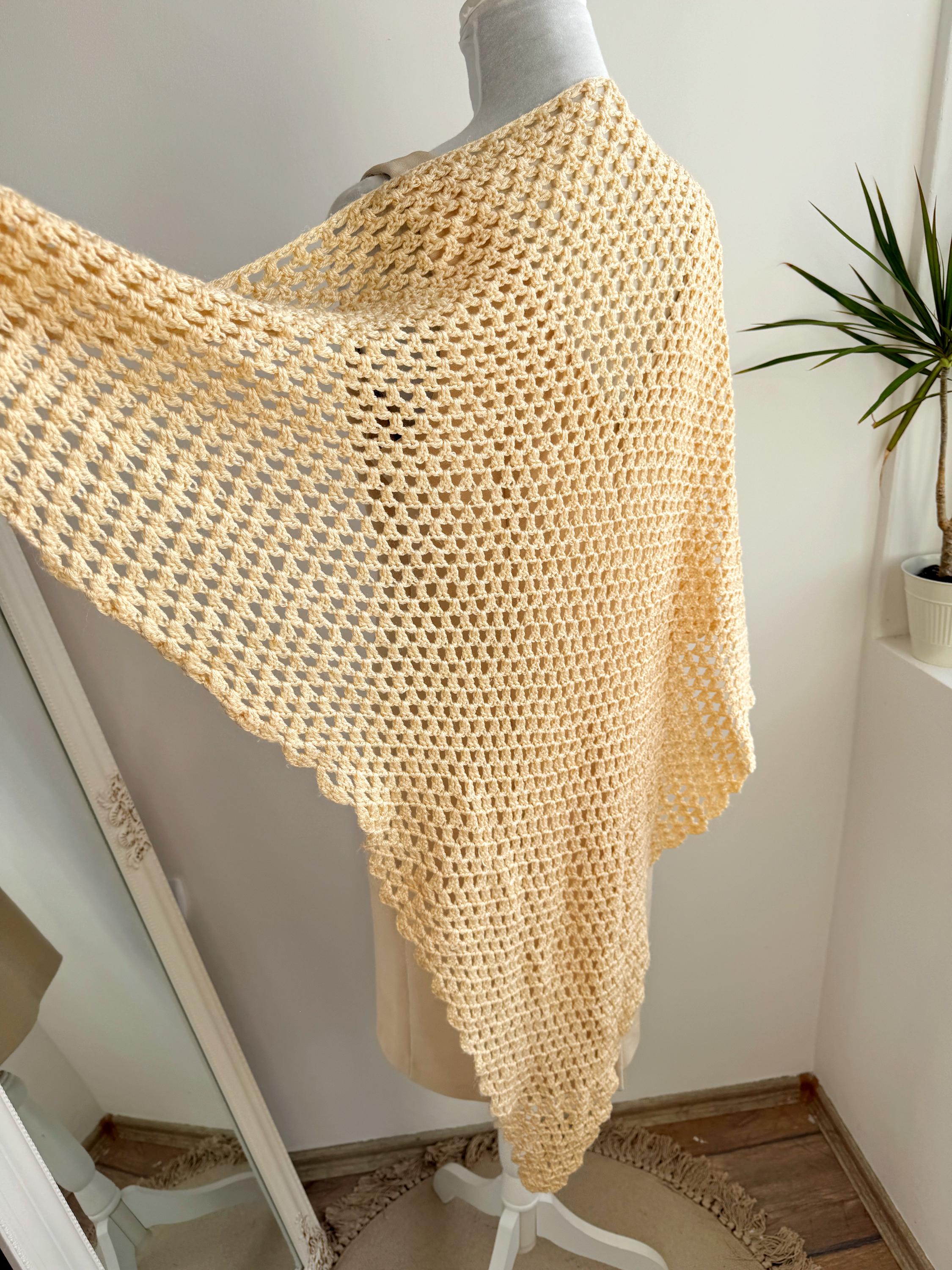 This beautiful vintage crochet triangle shawl is the perfect blend of bohemian charm and delicate craftsmanship. Hand-crafted with an intricate open-knit pattern, this airy wrap features a soft, pale yellow/cream hue that adds a touch of vintage elegance to any outfit. Its generous size makes it incredibly versatile—wear it as a classic shoulder wrap for a wedding or evening event, or style it as a cozy, oversized neck scarf for a more casual, retro-inspired look.