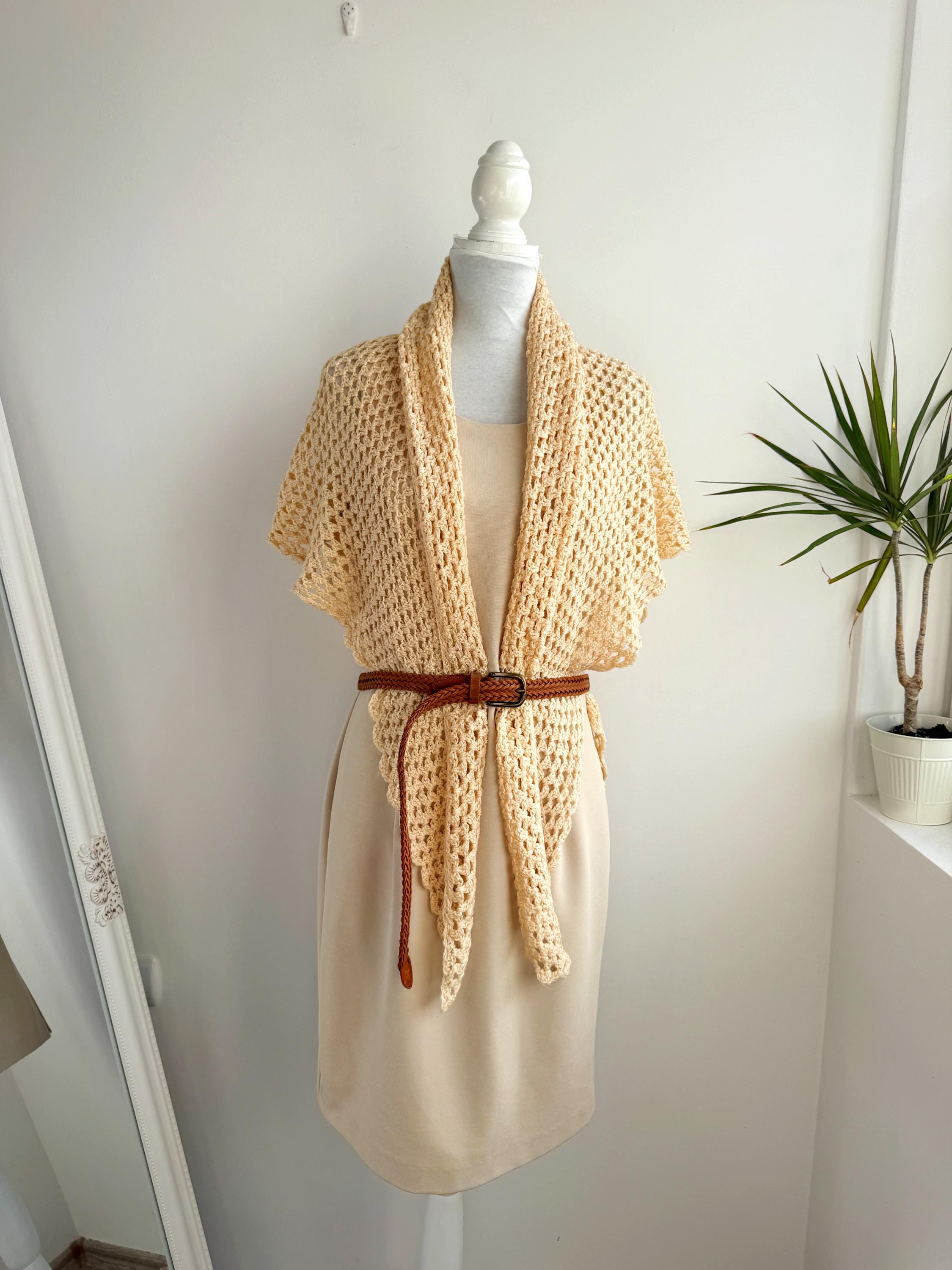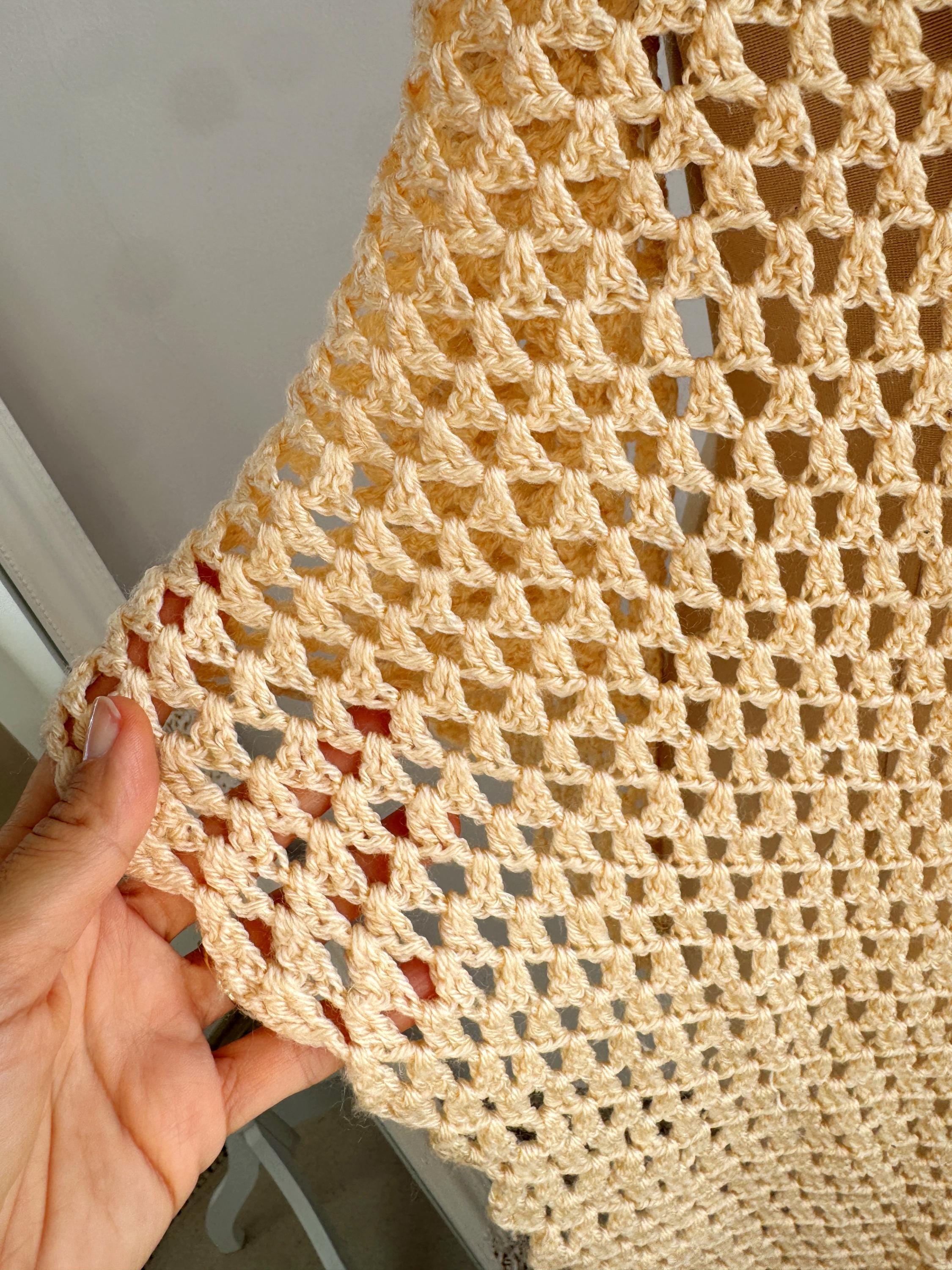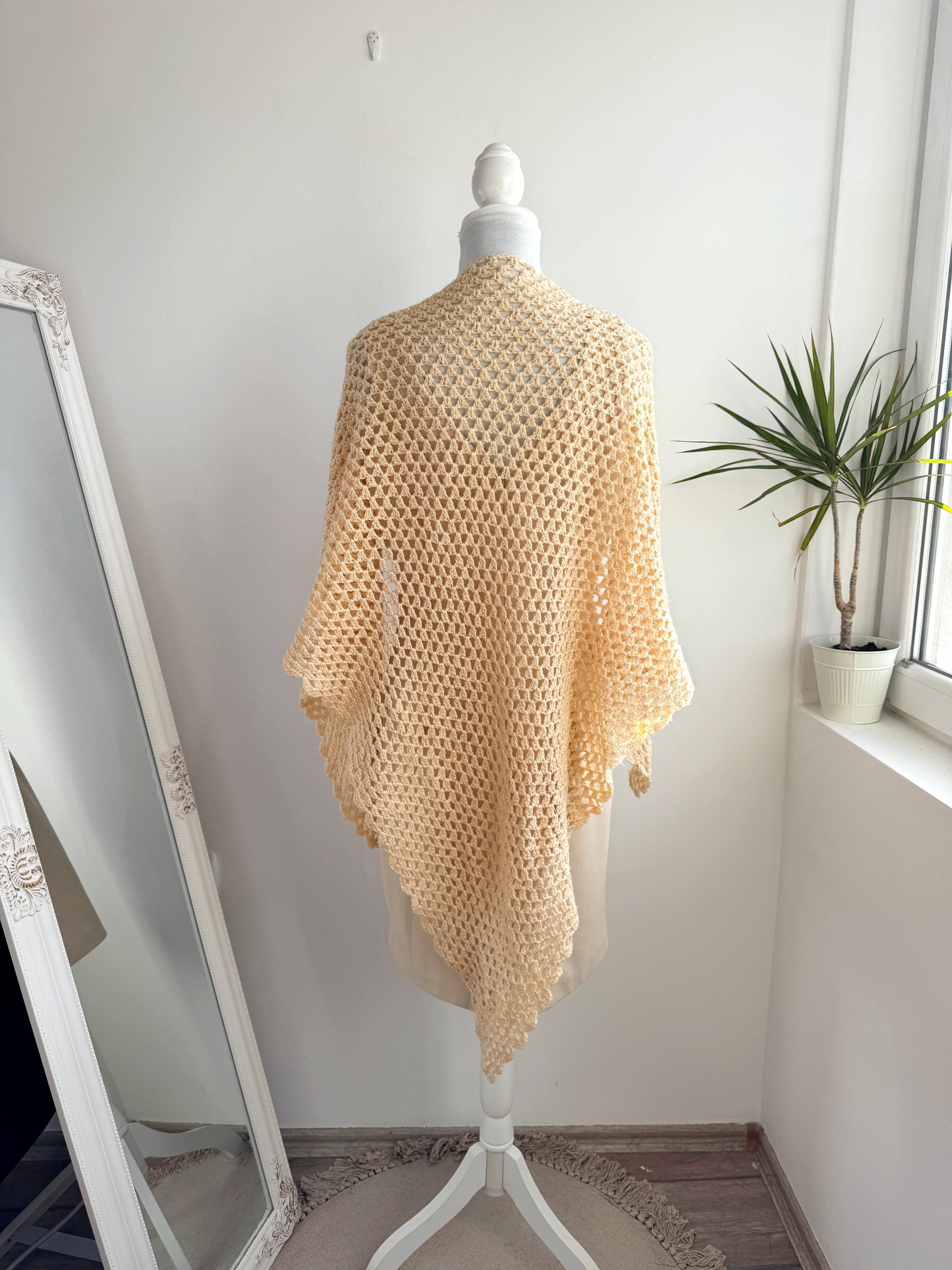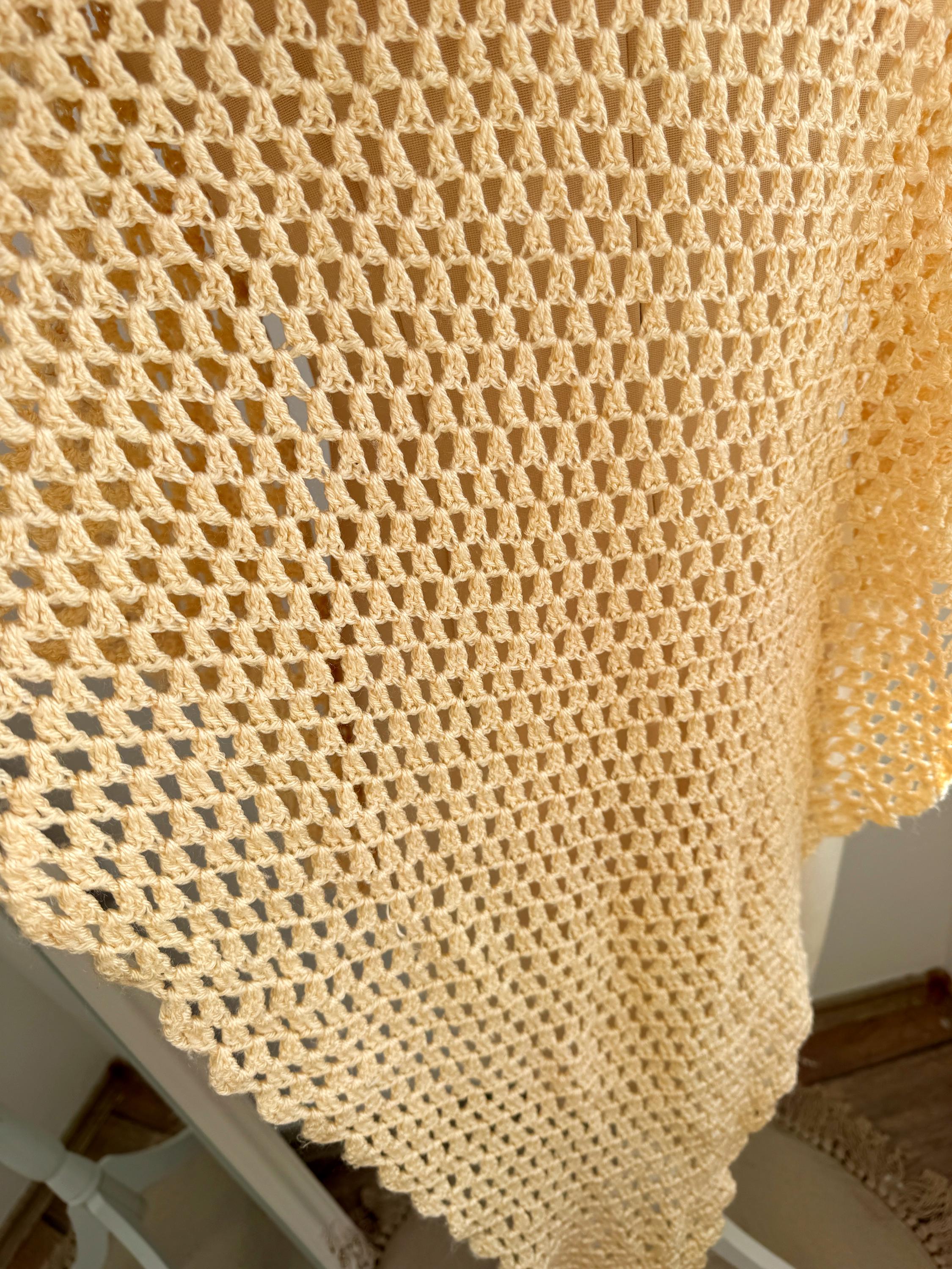 The lightweight texture and lace-like design capture the essence of 1970s boho-chic and modern cottagecore aesthetics. Whether you're a bride looking for a unique wedding wrap or a vintage lover seeking a standout accessory, this one-of-a-kind piece offers both comfort and style. Its timeless appeal and high-quality handmade construction ensure it will be a cherished addition to your wardrobe for years to come.