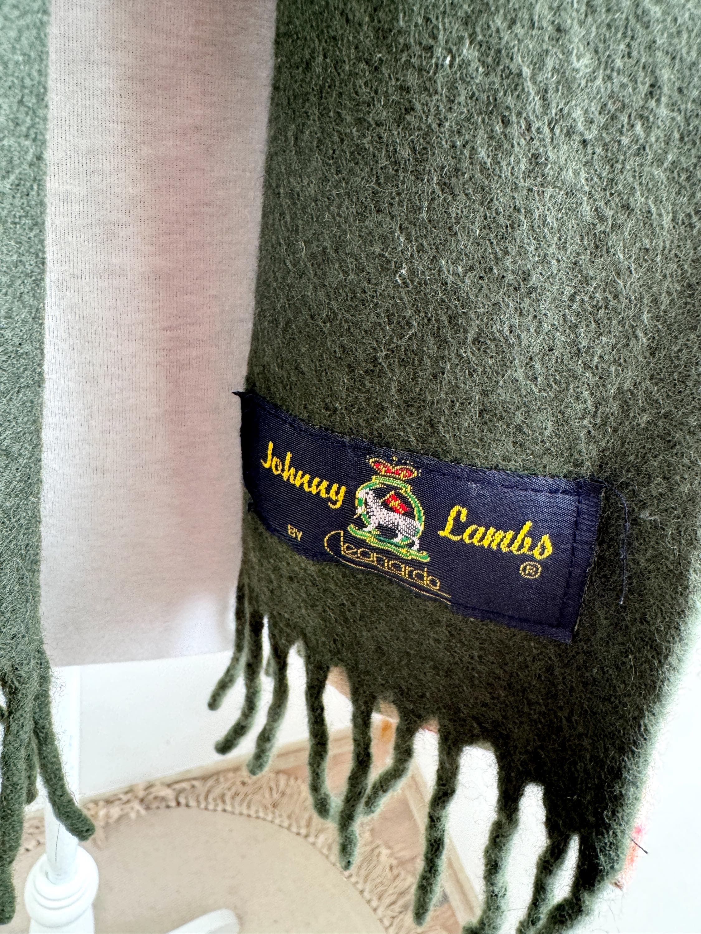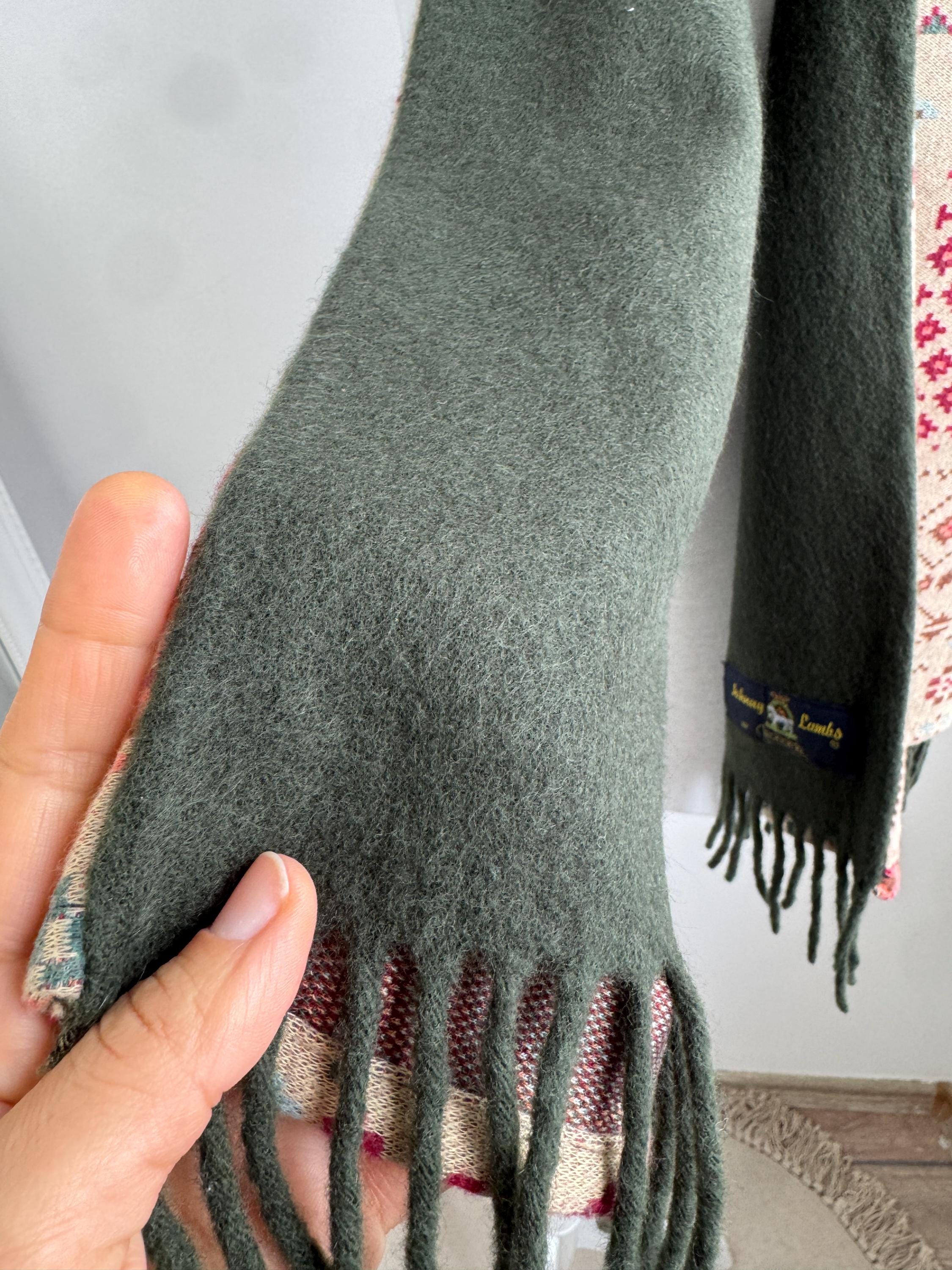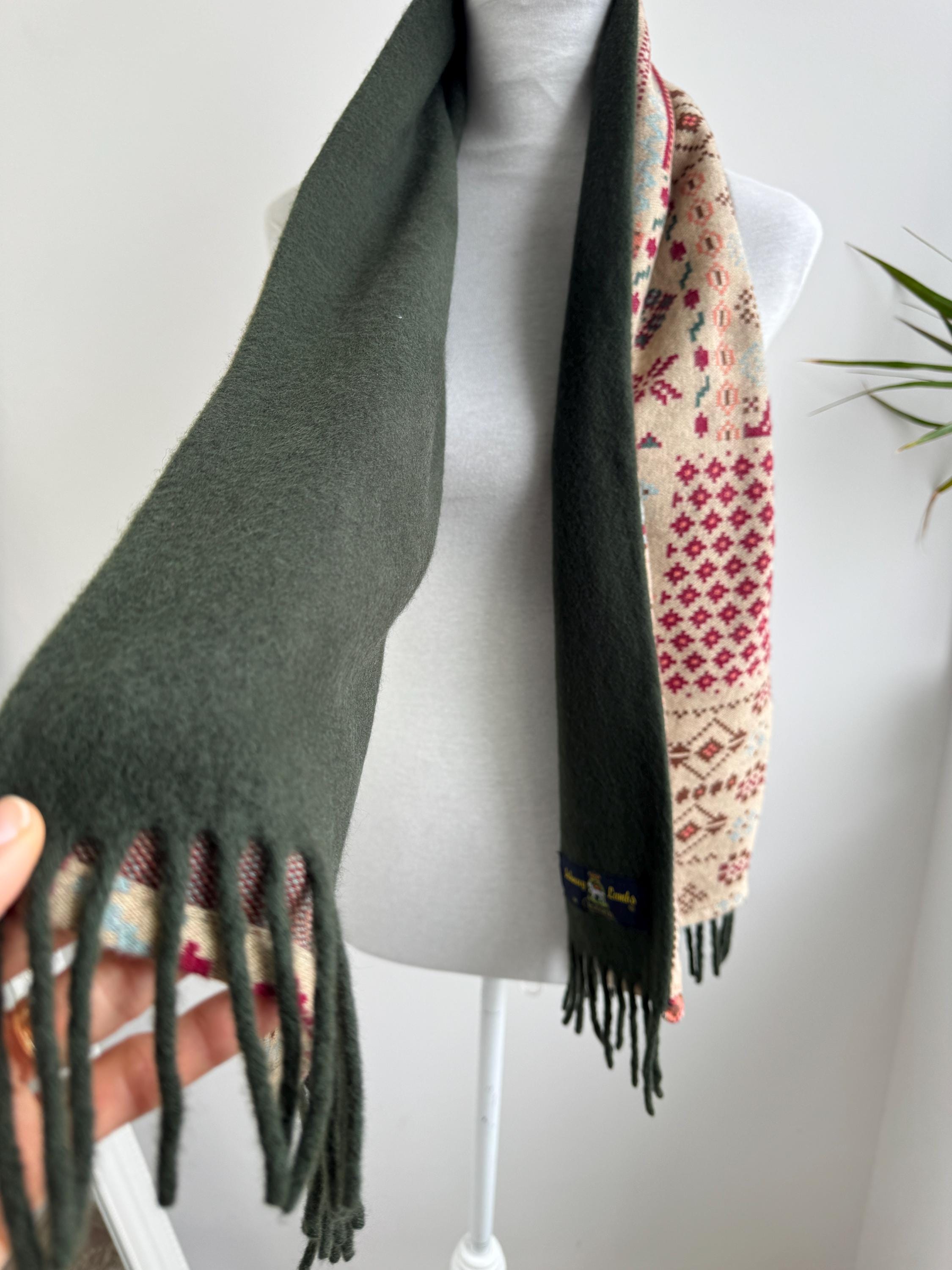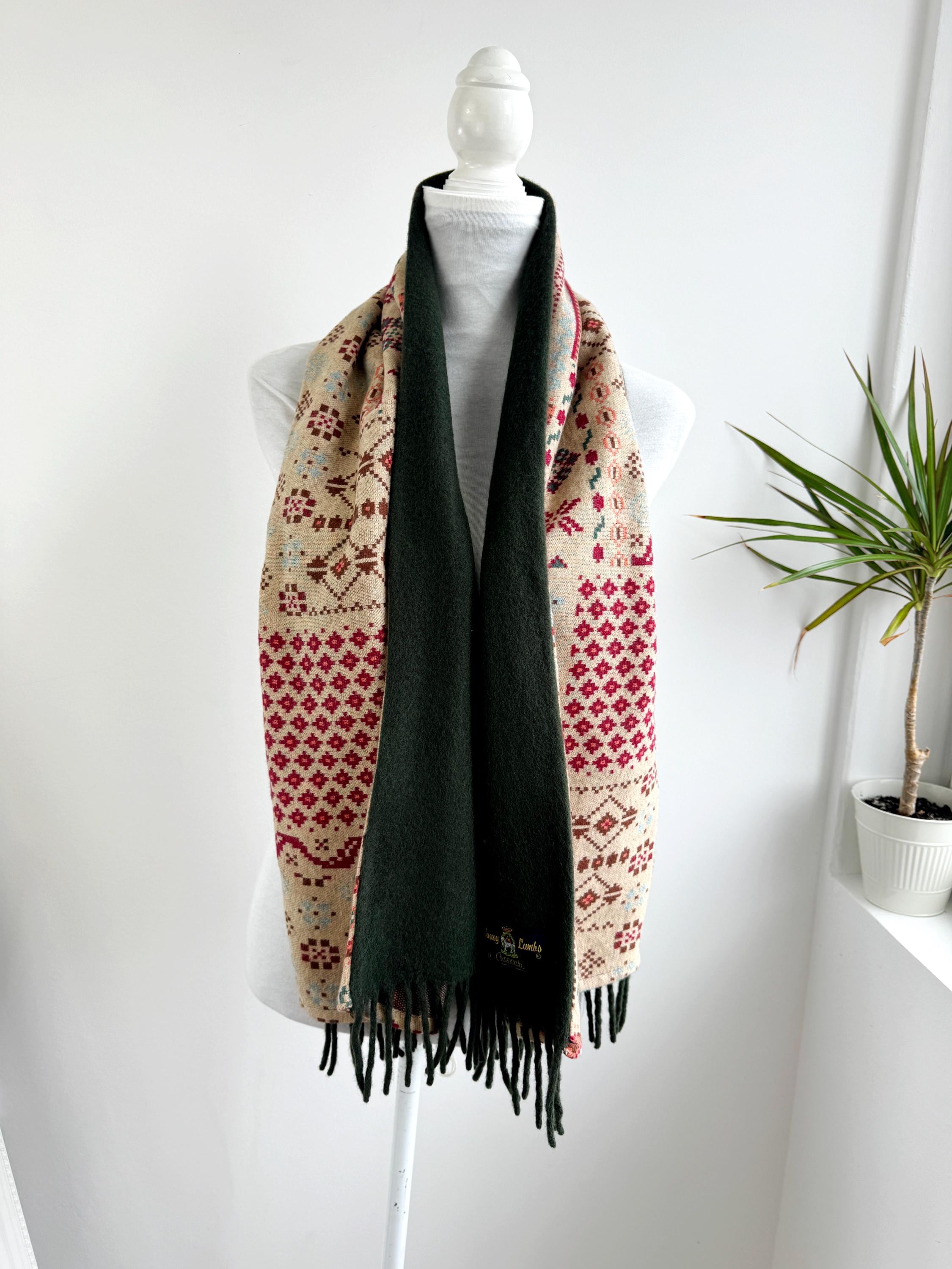 This stunning vintage Johnny Lambs by Leonardo scarf will add a touch of timeless Italian sophistication to your winter wardrobe. This isn't just a winter accessory; it's a piece of knitwear art. Featuring an intricate, multi-patterned design that blends traditional Fair Isle motifs, snowflakes, and geometric diamonds, this double sided wool scarf captures the perfect "Dark Academia" or "Grandpacore" aesthetic. The front side of this patchwork print scarf showcases a rich palette of burgundy, teal, and earth tones on a beige base, while the reverse side is a solid, incredibly soft forest green lambswool fleece fabric. Finished with classic knotted fringe, this scarf offers both luxury warmth and a unique vintage character.