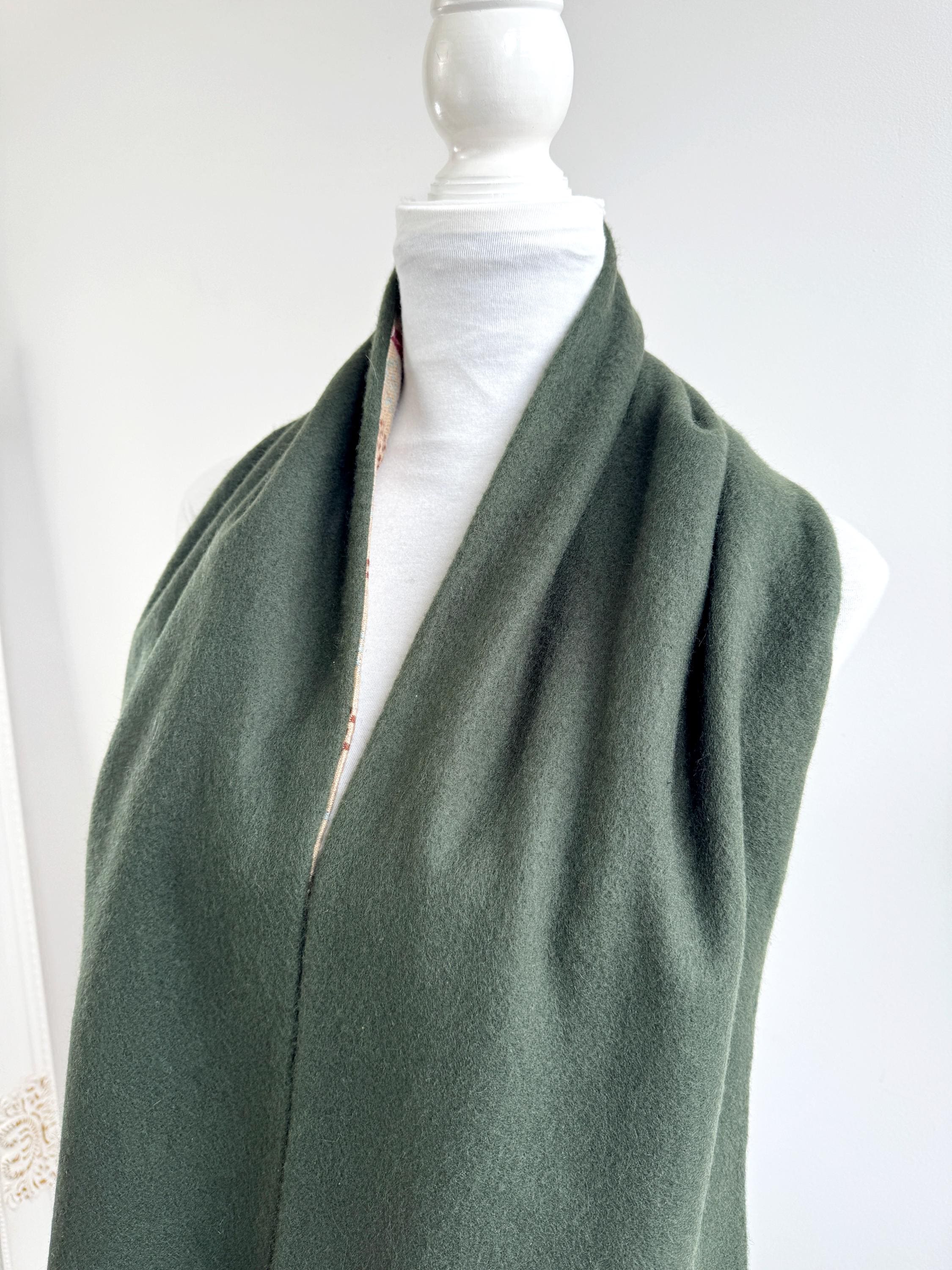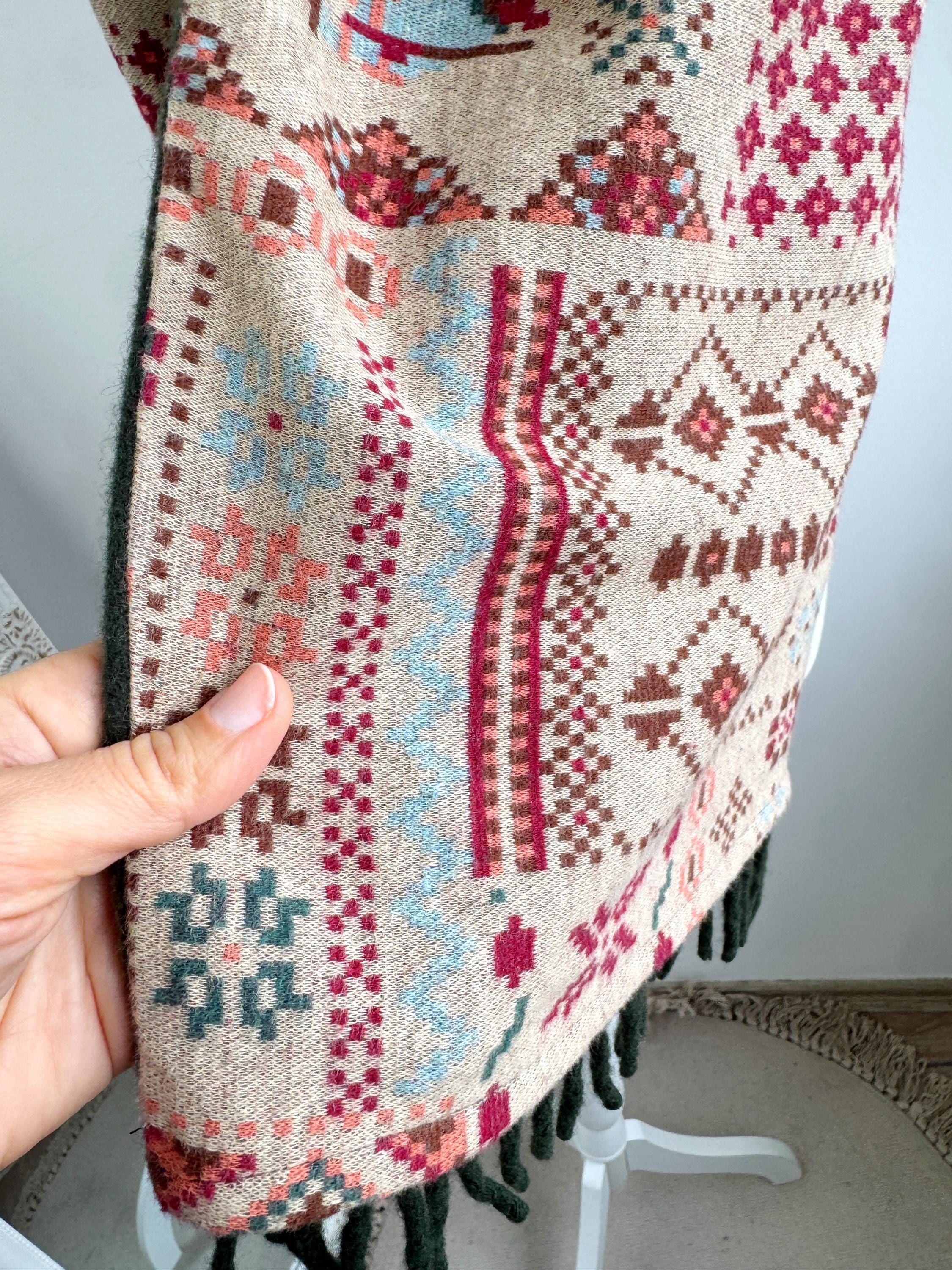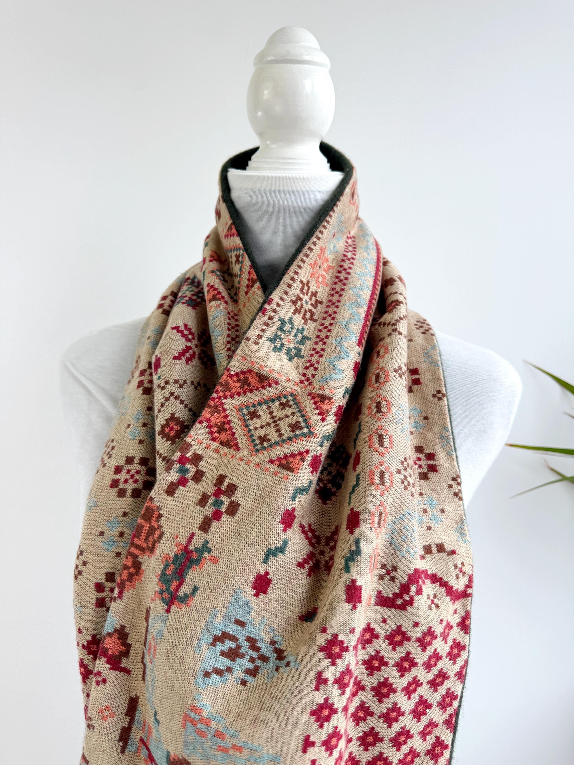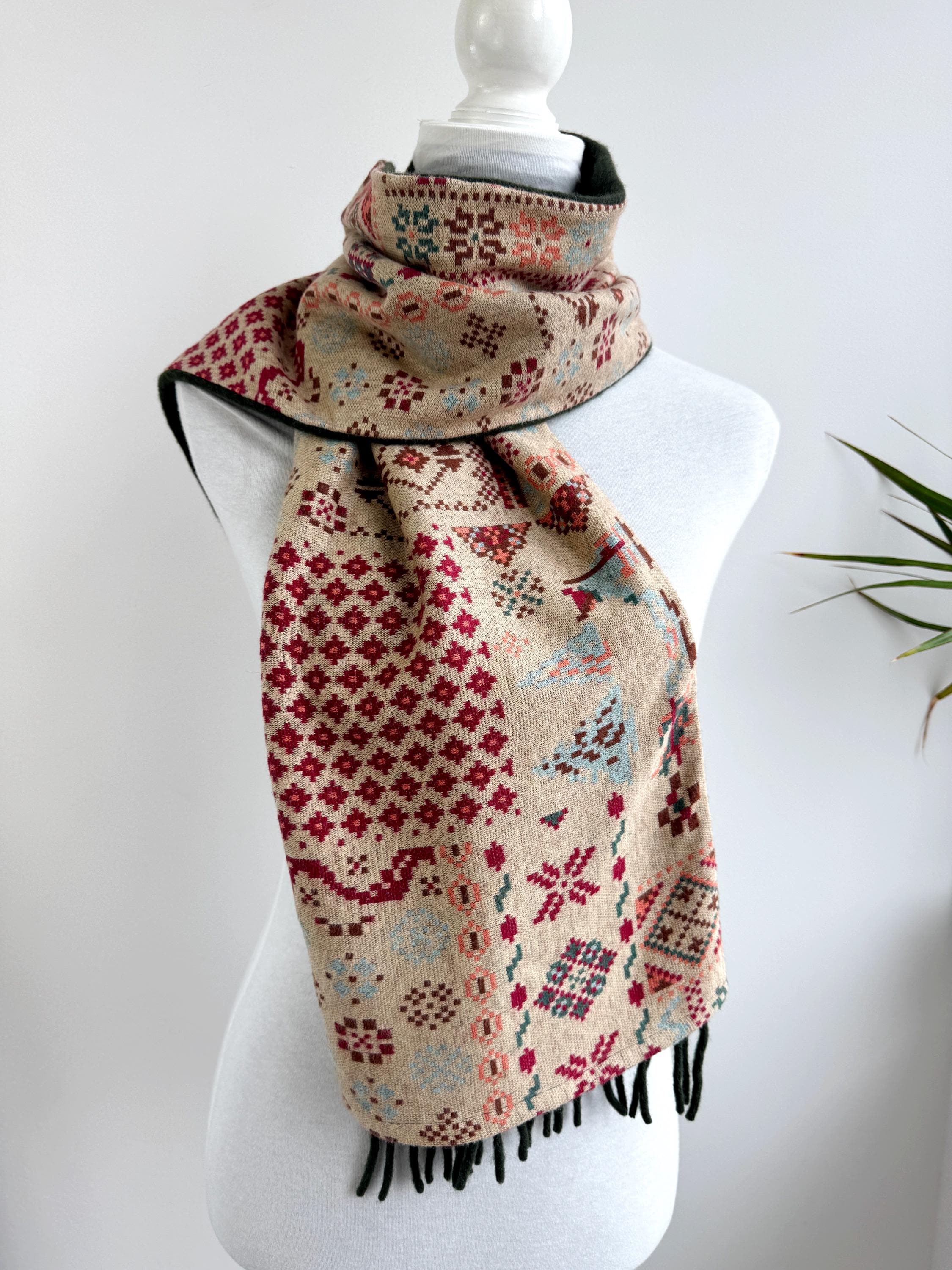 This stunning vintage Johnny Lambs by Leonardo scarf will add a touch of timeless Italian sophistication to your winter wardrobe. This isn't just a winter accessory; it's a piece of knitwear art. Featuring an intricate, multi-patterned design that blends traditional Fair Isle motifs, snowflakes, and geometric diamonds, this double sided wool scarf captures the perfect "Dark Academia" or "Grandpacore" aesthetic. The front side of this patchwork print scarf showcases a rich palette of burgundy, teal, and earth tones on a beige base, while the reverse side is a solid, incredibly soft forest green lambswool fleece fabric. Finished with classic knotted fringe, this scarf offers both luxury warmth and a unique vintage character.