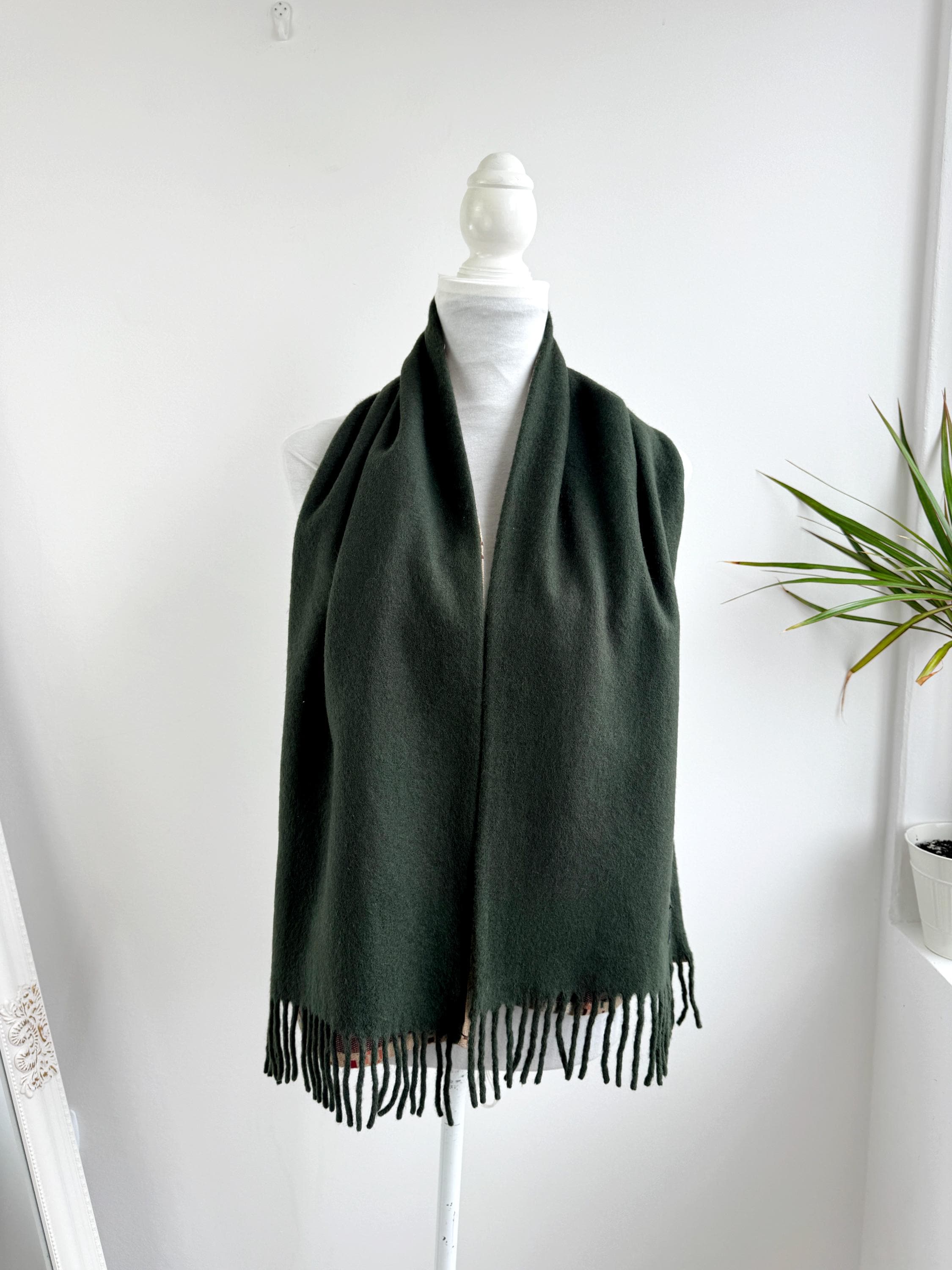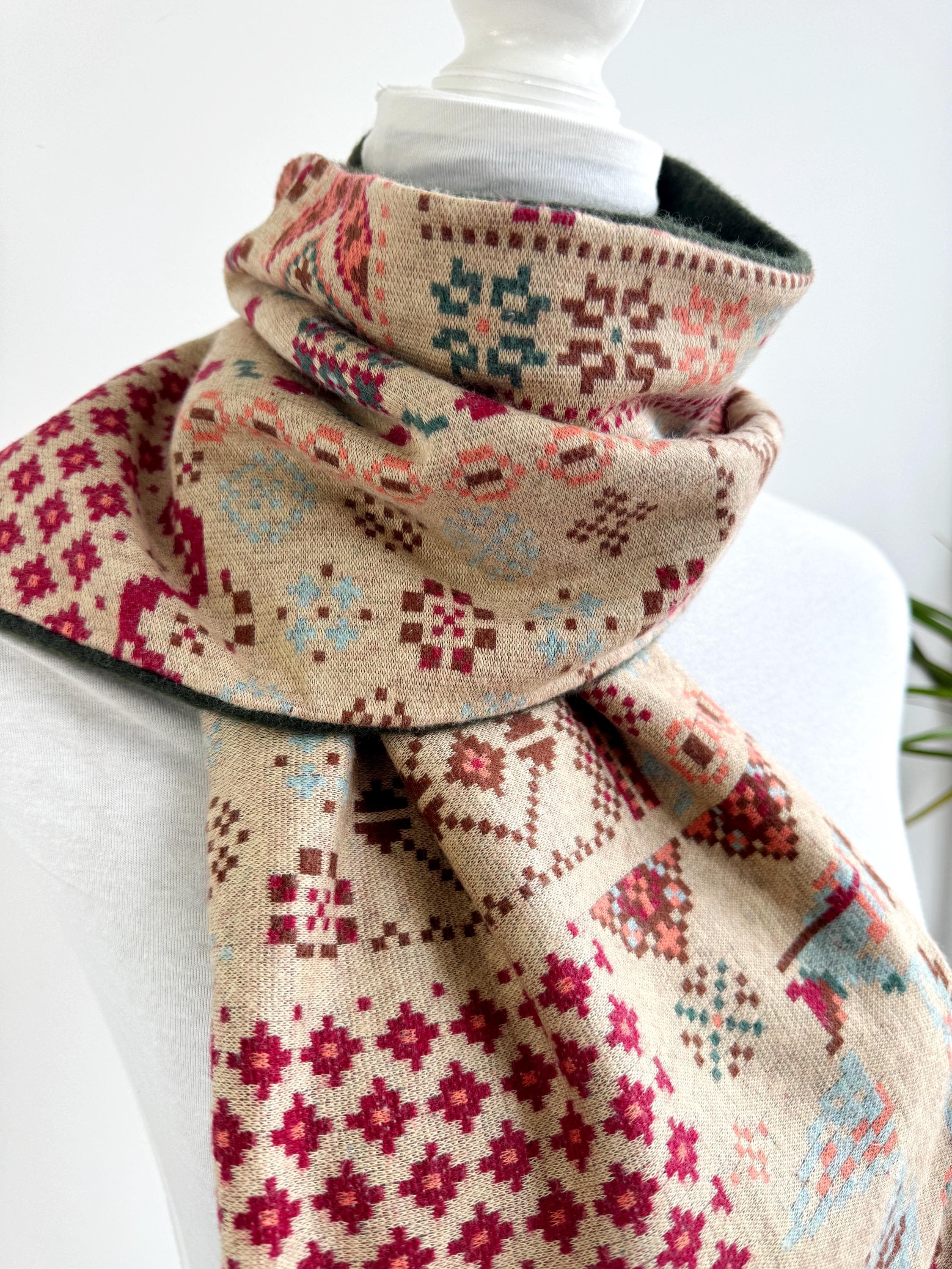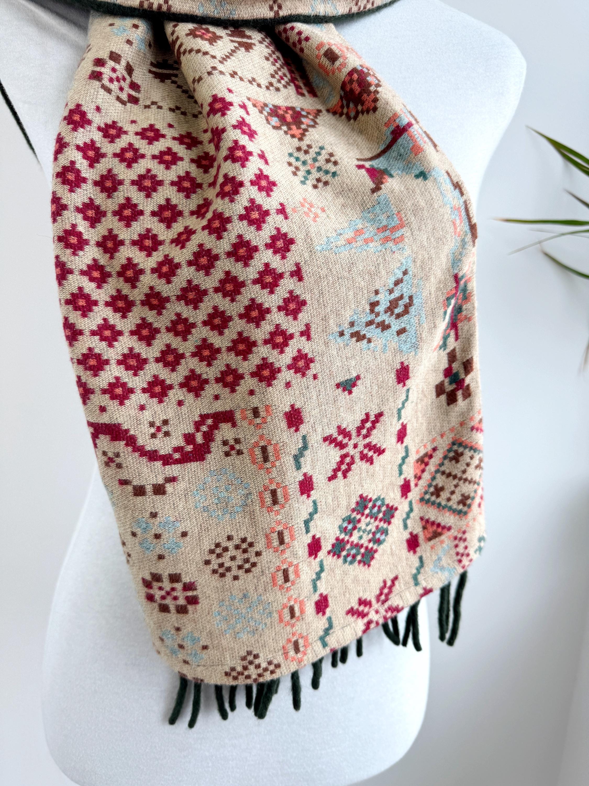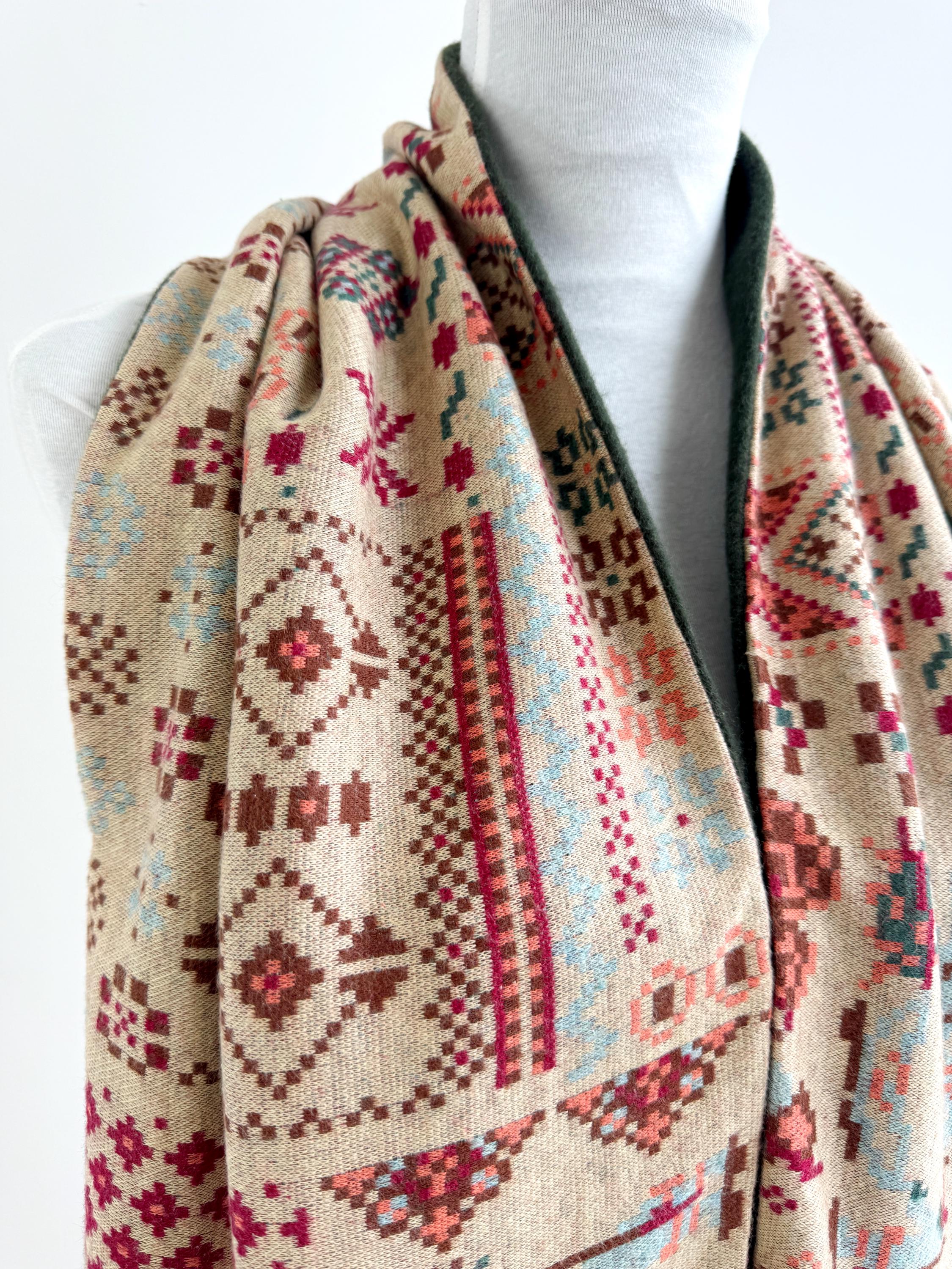 This stunning vintage Johnny Lambs by Leonardo scarf will add a touch of timeless Italian sophistication to your winter wardrobe. This isn't just a winter accessory; it's a piece of knitwear art. Featuring an intricate, multi-patterned design that blends traditional Fair Isle motifs, snowflakes, and geometric diamonds, this double sided wool scarf captures the perfect "Dark Academia" or "Grandpacore" aesthetic. The front side of this patchwork print scarf showcases a rich palette of burgundy, teal, and earth tones on a beige base, while the reverse side is a solid, incredibly soft forest green lambswool fleece fabric. Finished with classic knotted fringe, this scarf offers both luxury warmth and a unique vintage character.