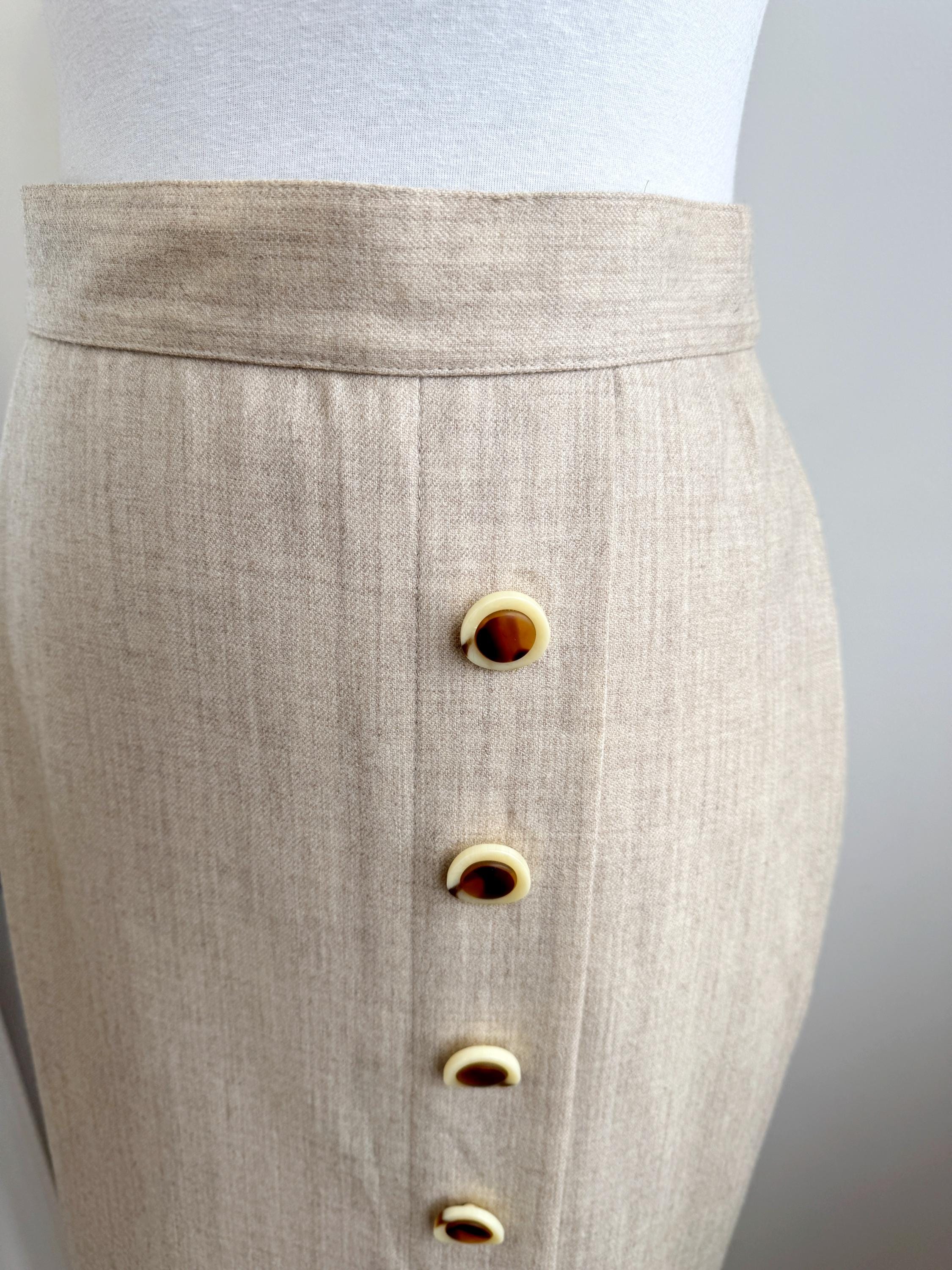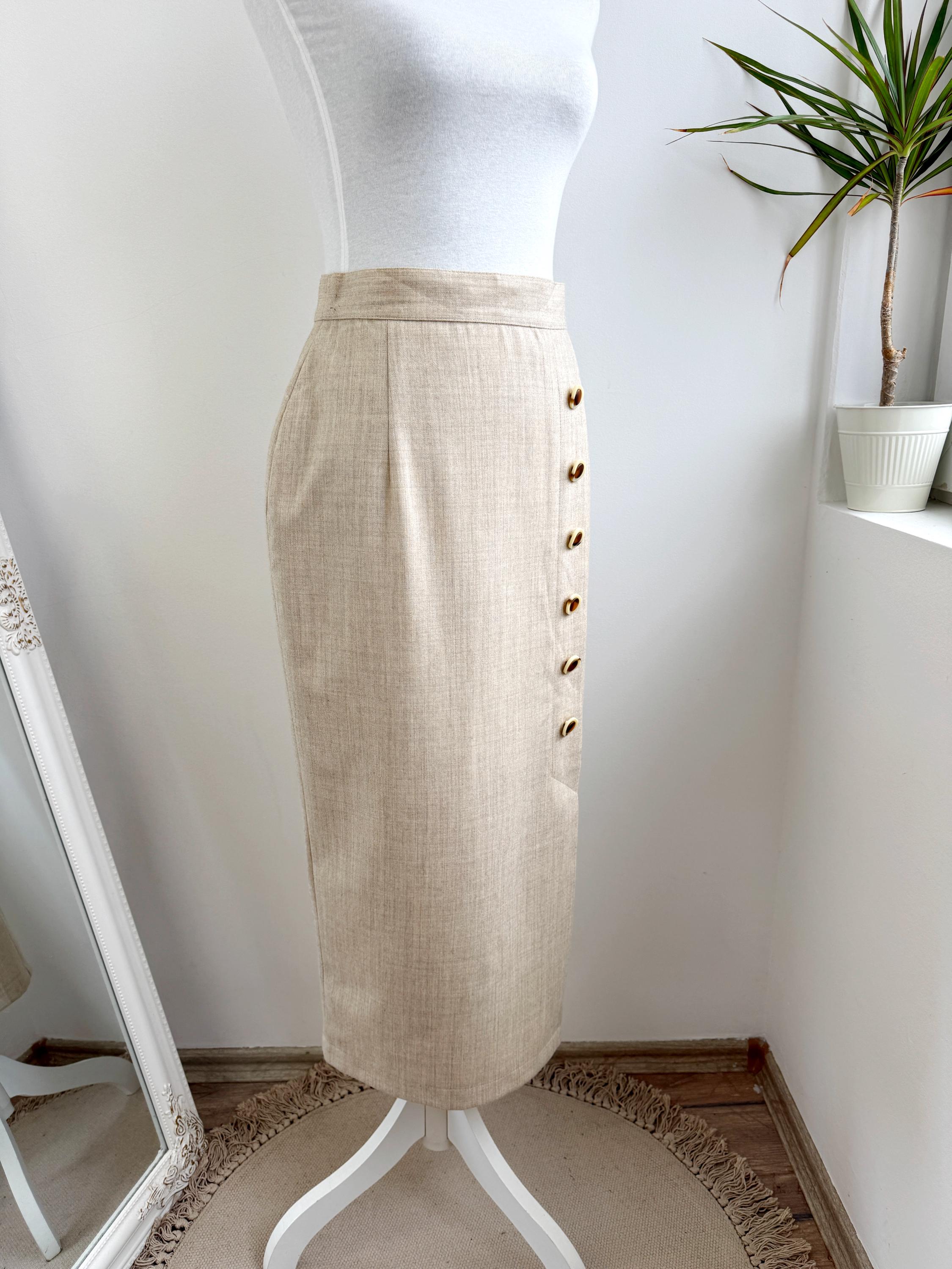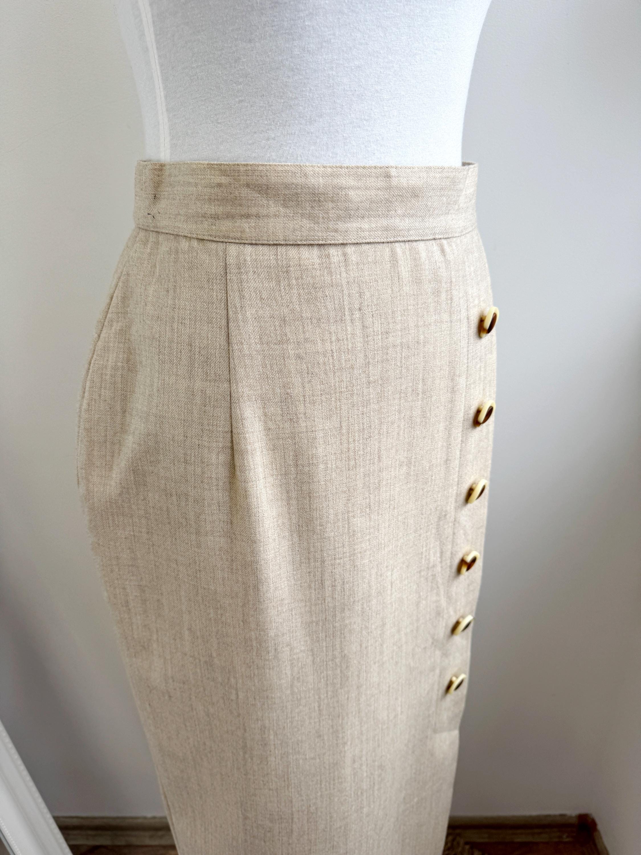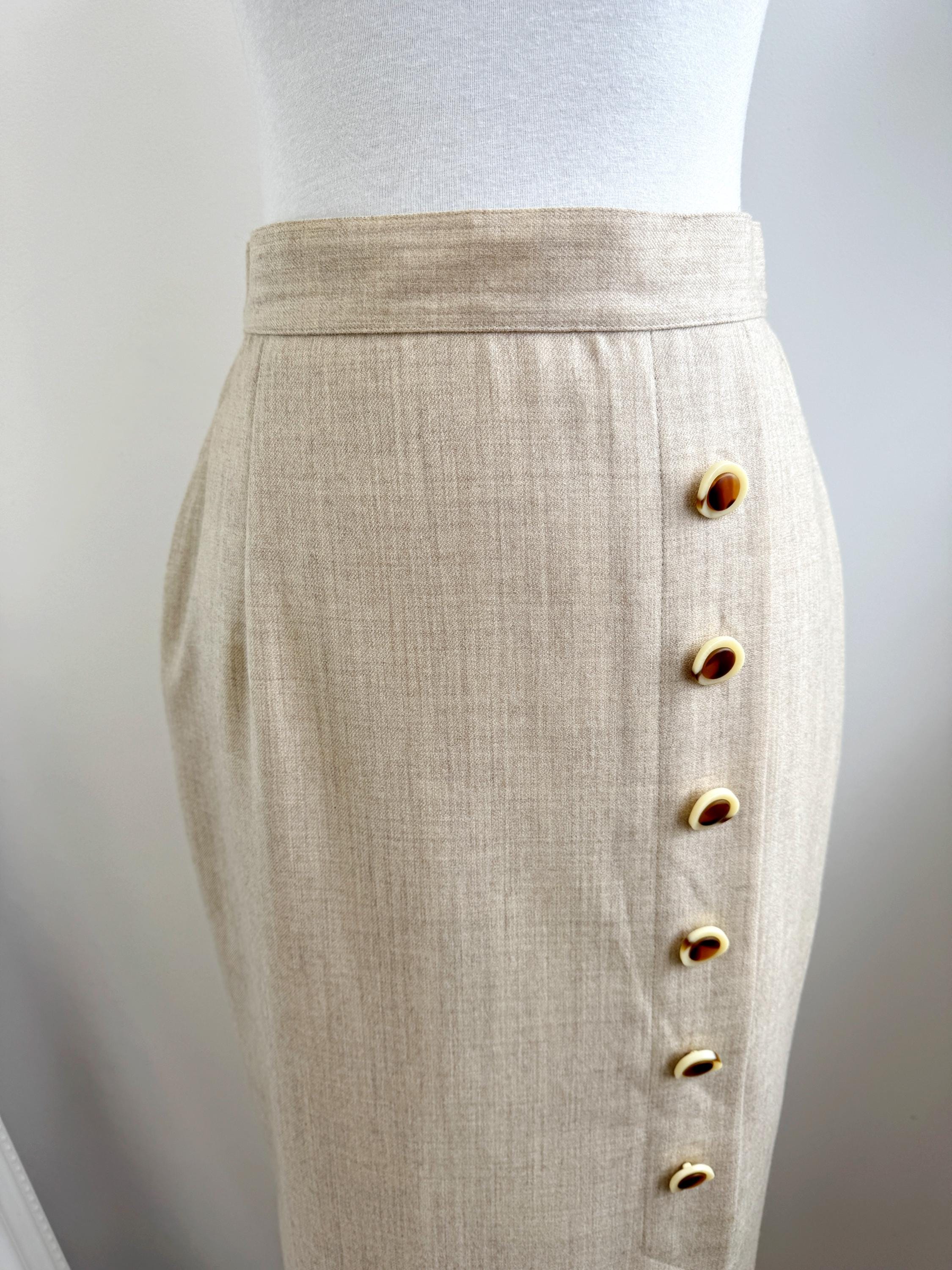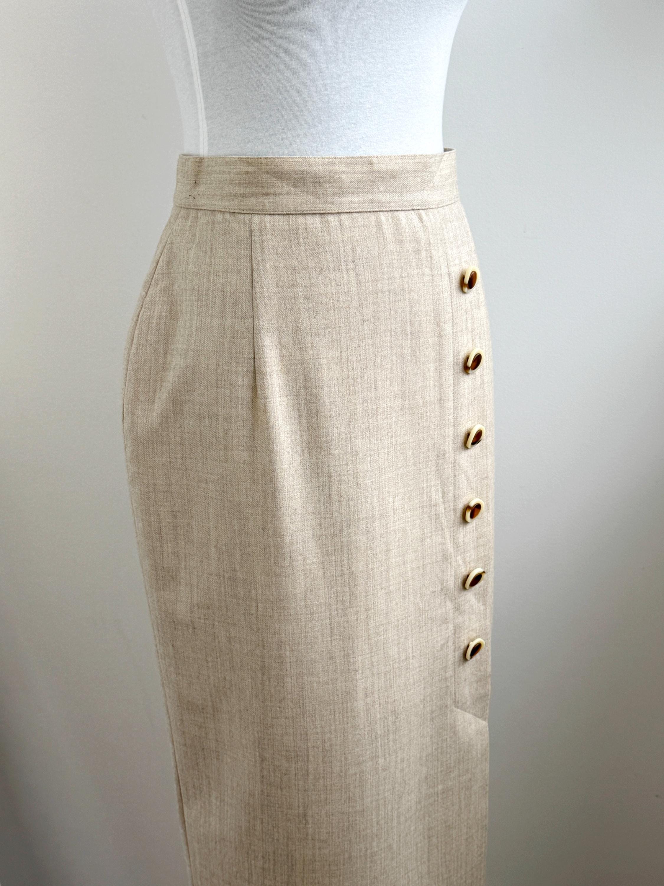 This elegant vintage 100% wool pencil skirt is the epitome of timeless Italian craftsmanship and sophisticated minimalism. Crafted from premium 100% Pure New Wool (Lana IWS), this skirt features a beautiful oatmeal beige hue that serves as a versatile staple for any wardrobe. Its flattering high-waisted silhouette is accentuated by a row of decorative buttons along the side, adding a touch of vintage charm to a sleek, modern cut.