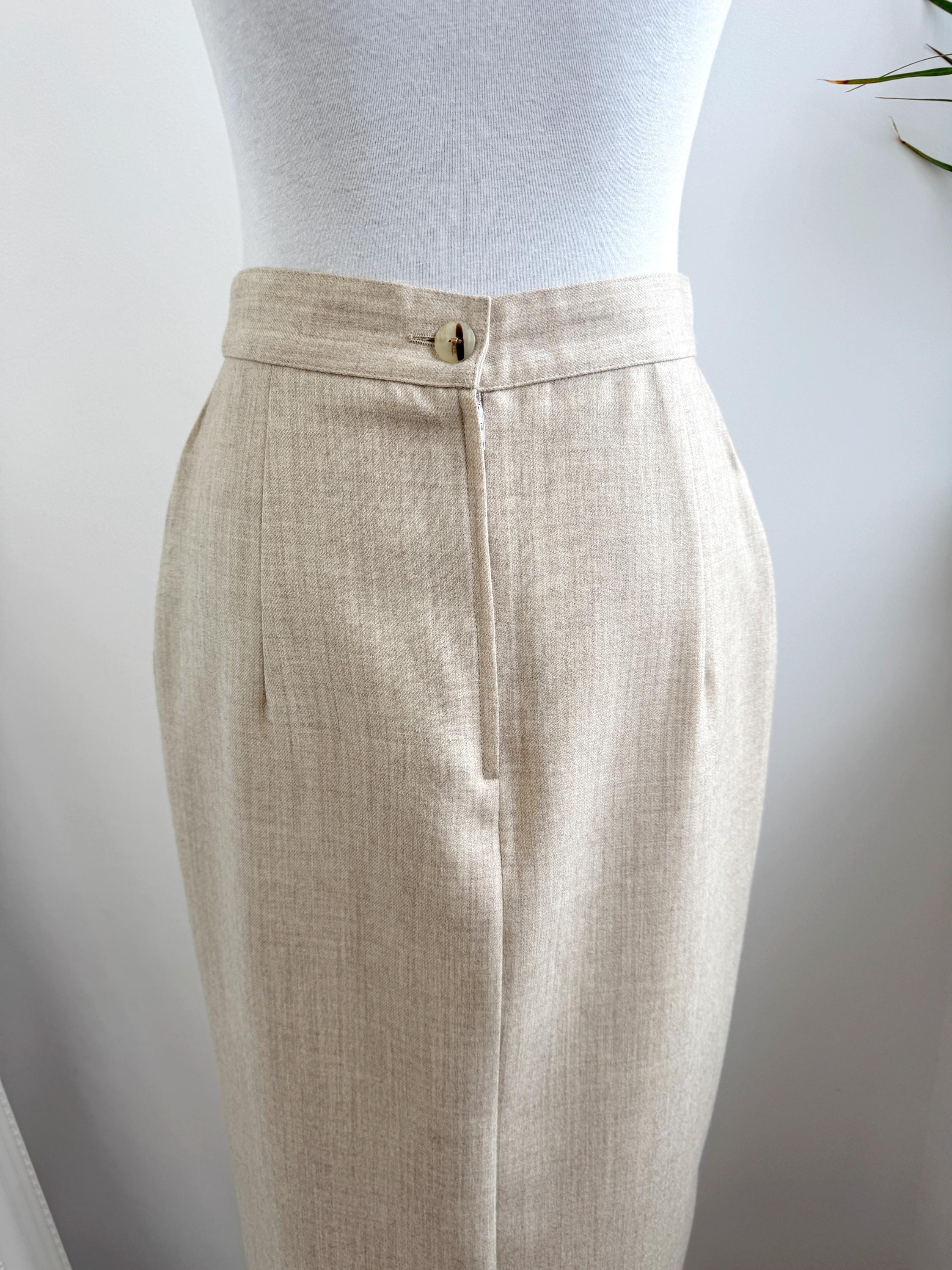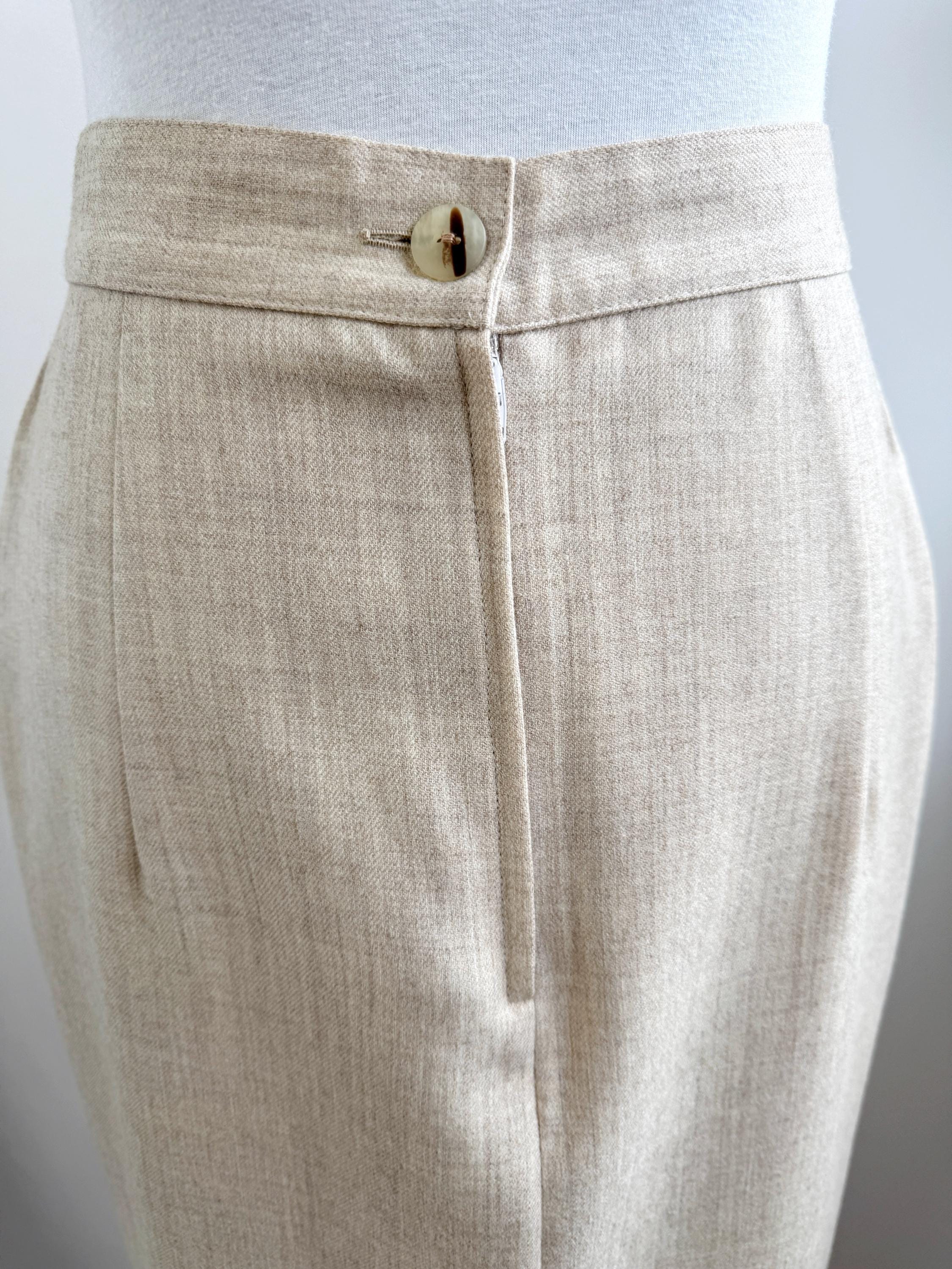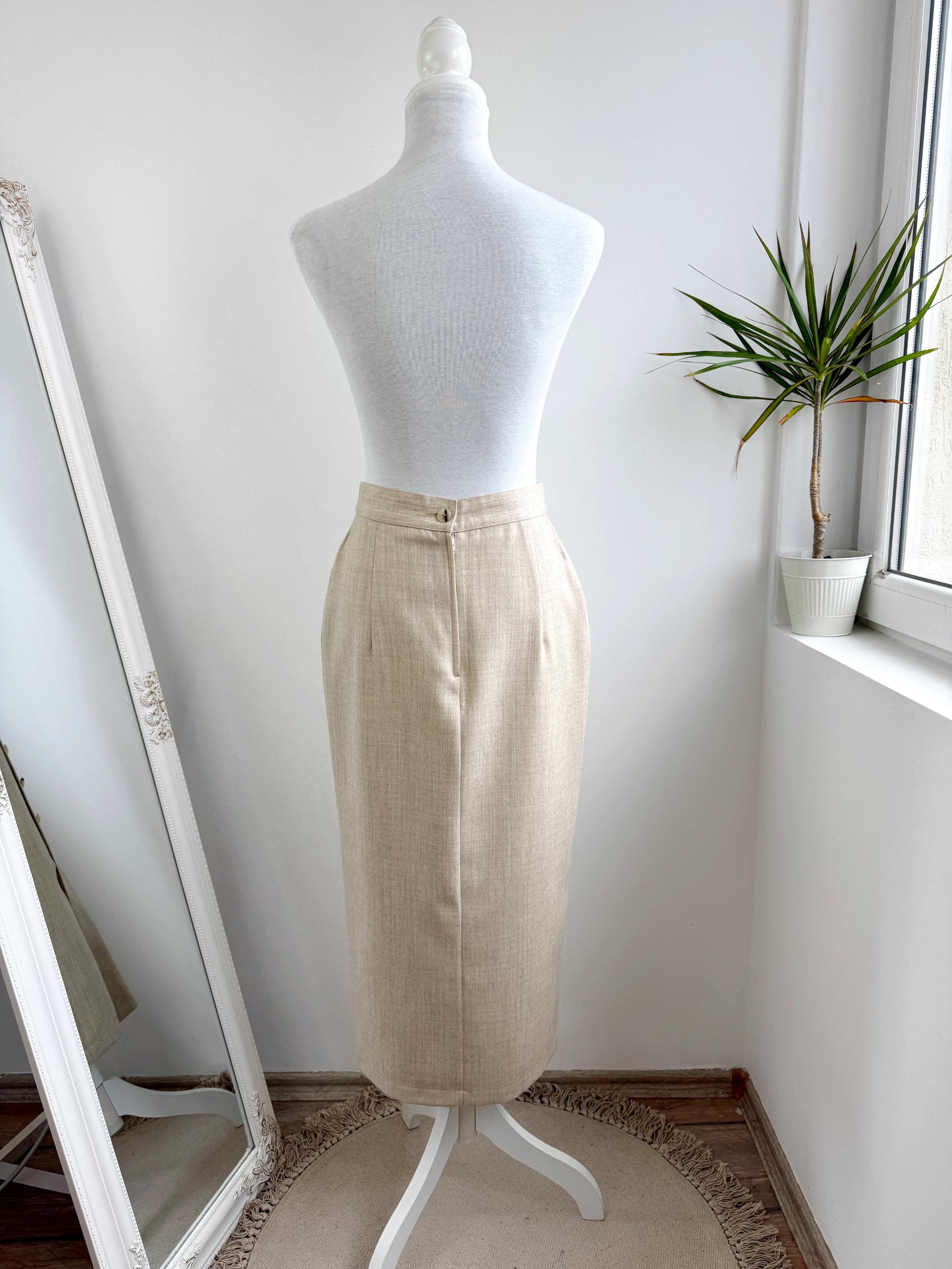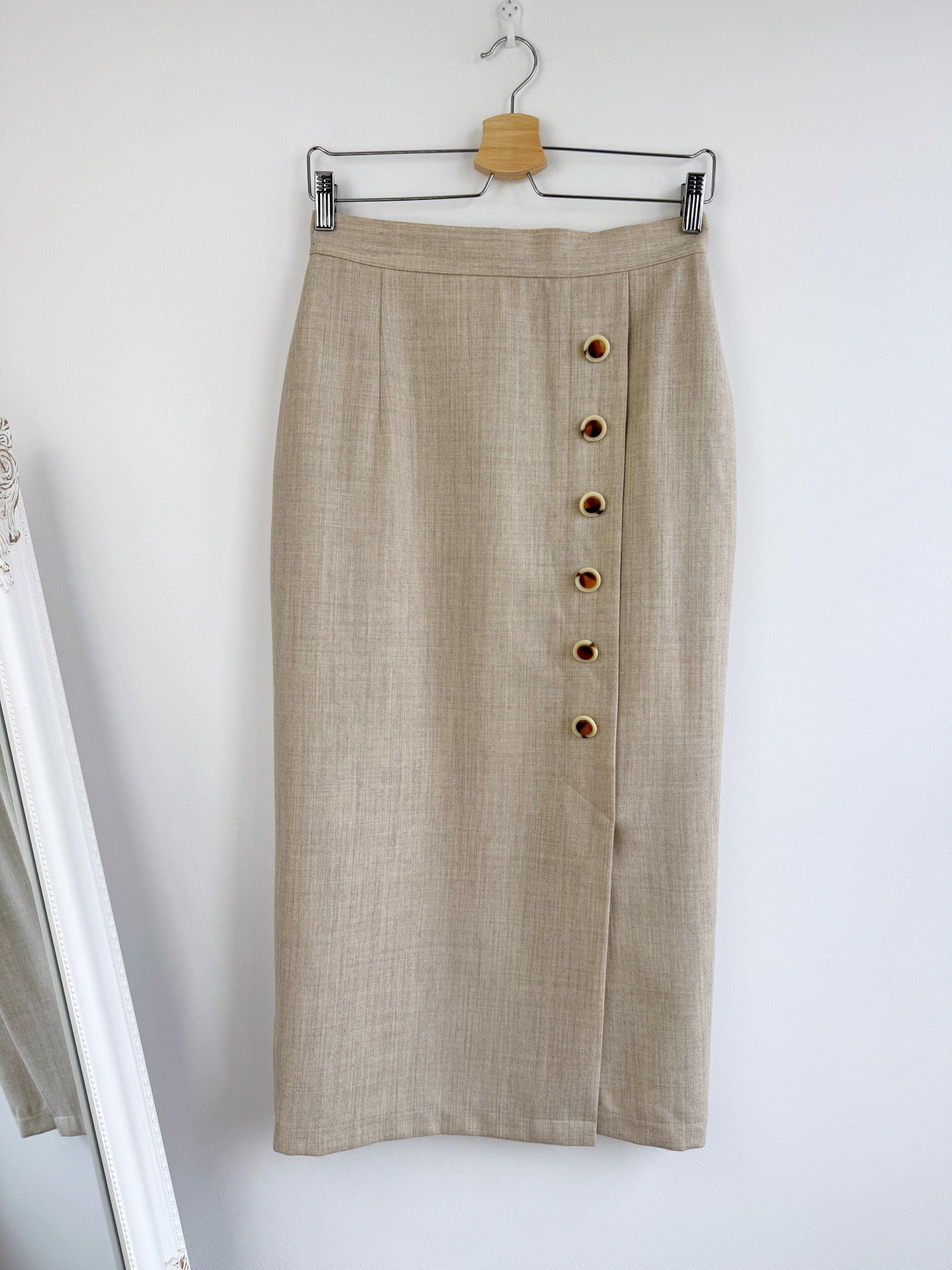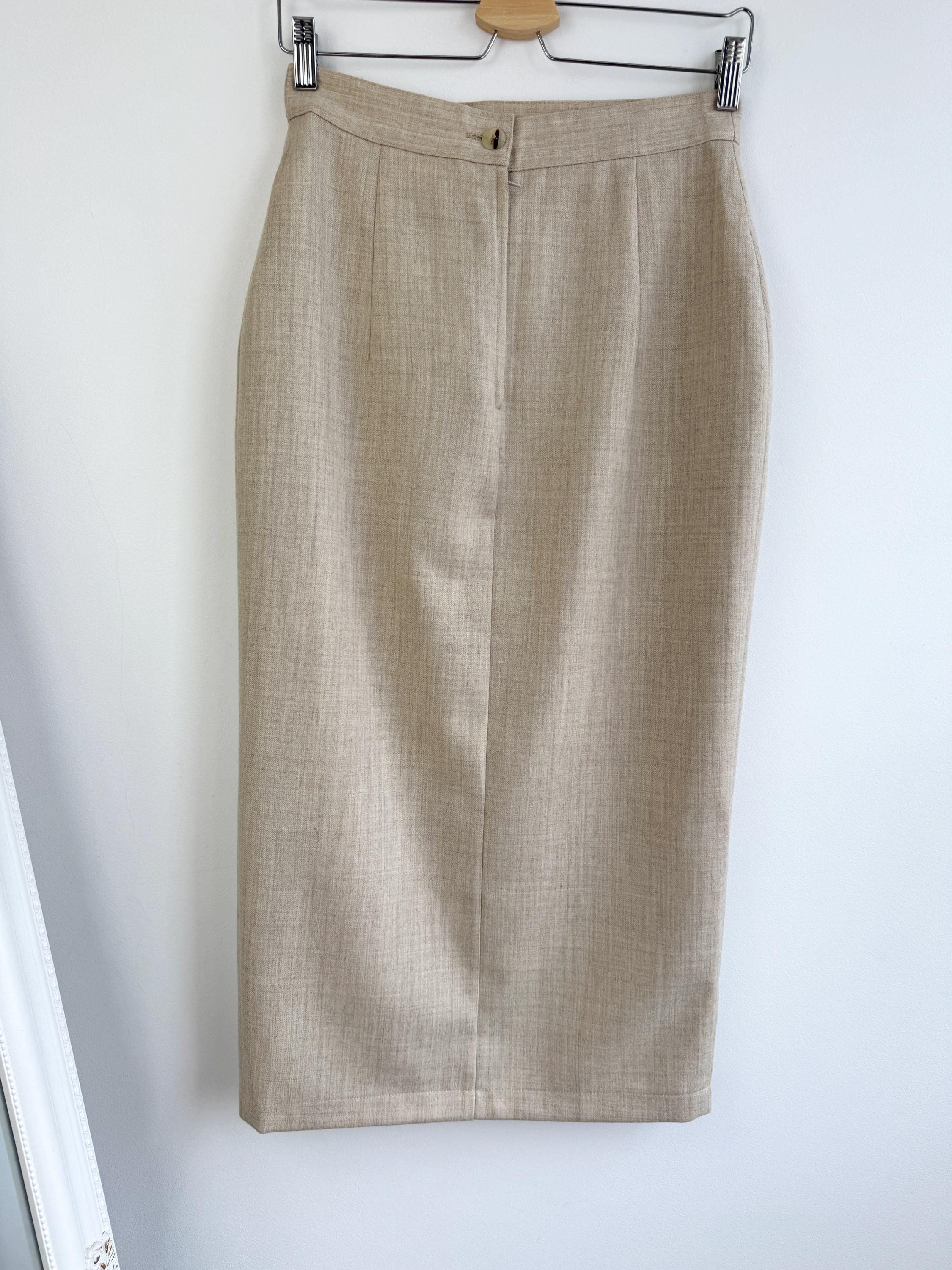 This elegant vintage 100% wool pencil skirt is the epitome of timeless Italian craftsmanship and sophisticated minimalism. Crafted from premium 100% Pure New Wool (Lana IWS), this skirt features a beautiful oatmeal beige hue that serves as a versatile staple for any wardrobe. Its flattering high-waisted silhouette is accentuated by a row of decorative buttons along the side, adding a touch of vintage charm to a sleek, modern cut.