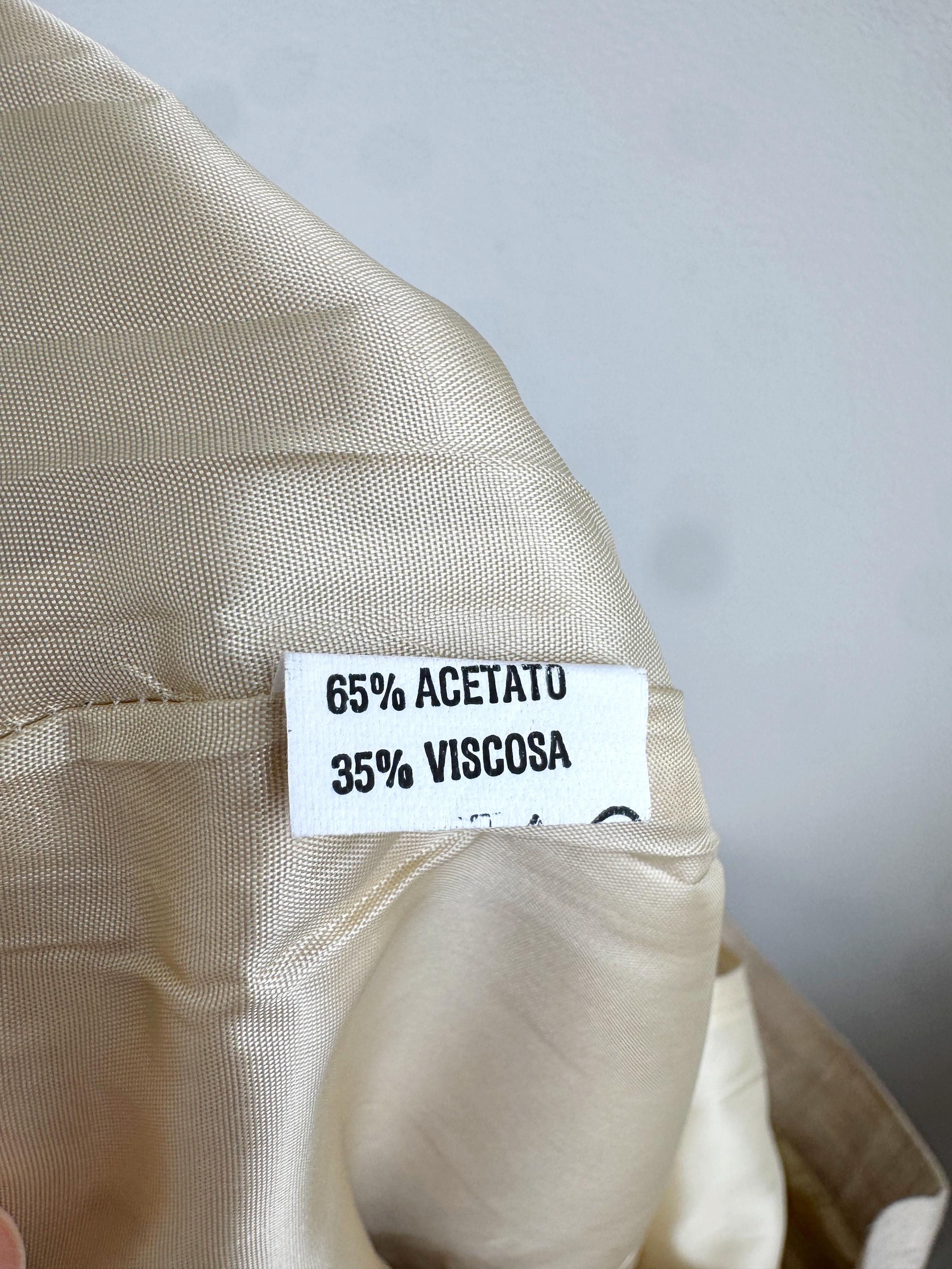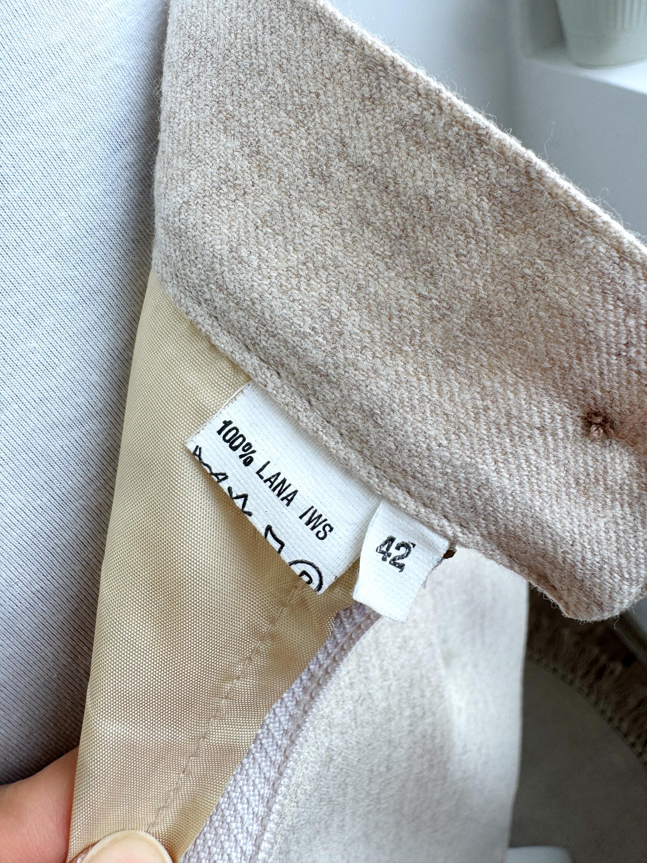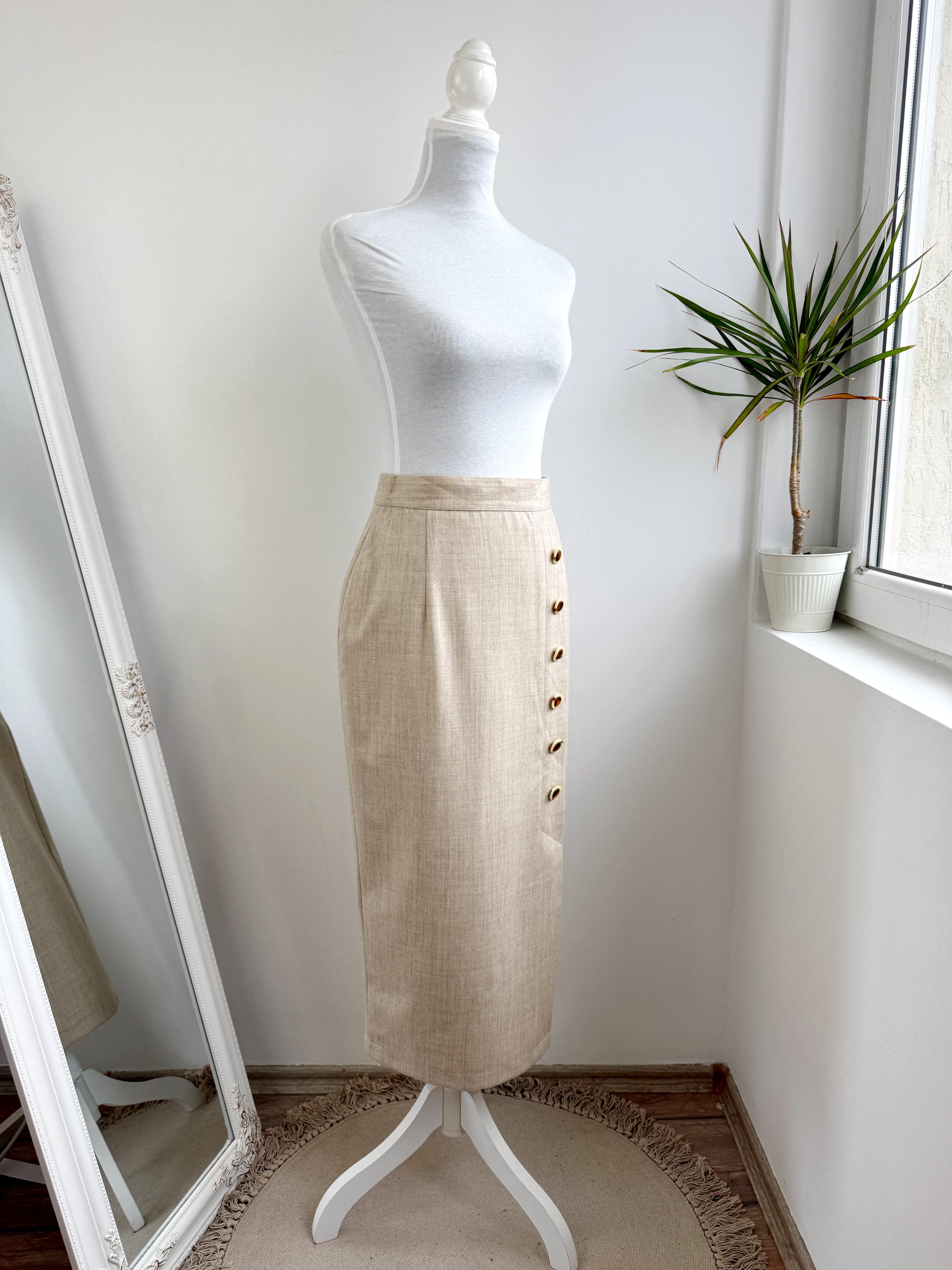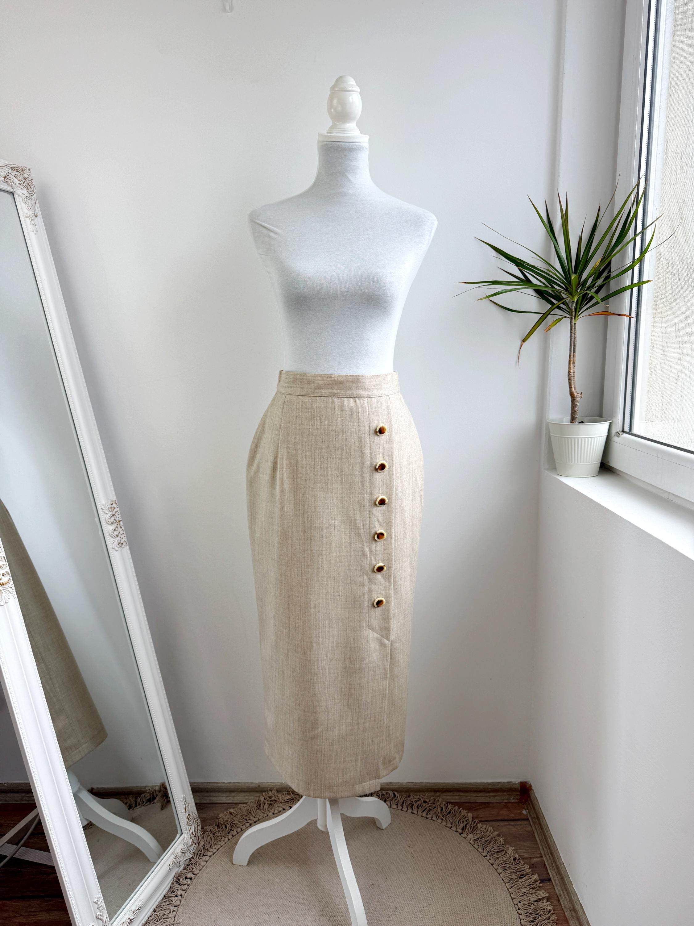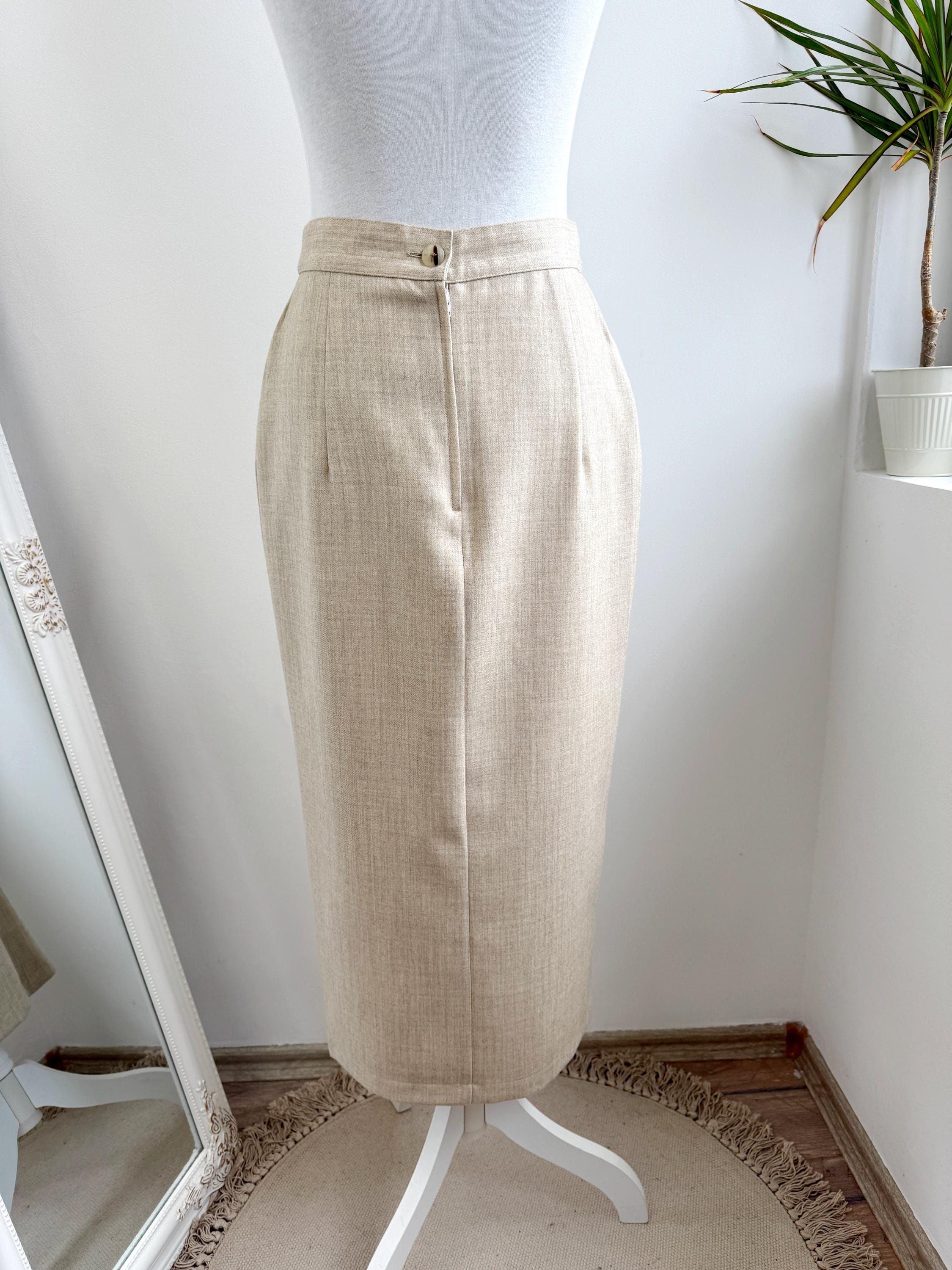 This elegant vintage 100% wool pencil skirt is the epitome of timeless Italian craftsmanship and sophisticated minimalism. Crafted from premium 100% Pure New Wool (Lana IWS), this skirt features a beautiful oatmeal beige hue that serves as a versatile staple for any wardrobe. Its flattering high-waisted silhouette is accentuated by a row of decorative buttons along the side, adding a touch of vintage charm to a sleek, modern cut.