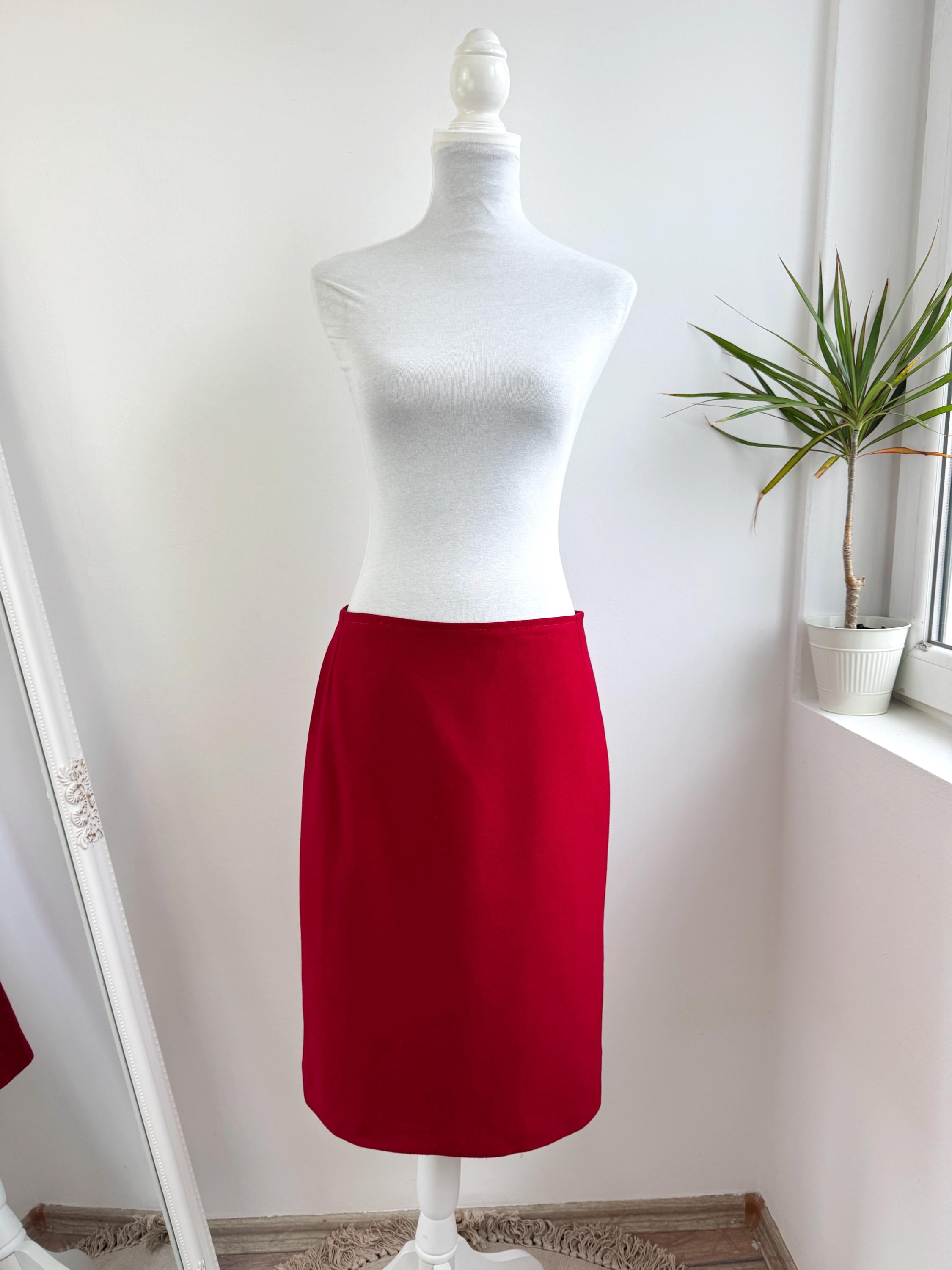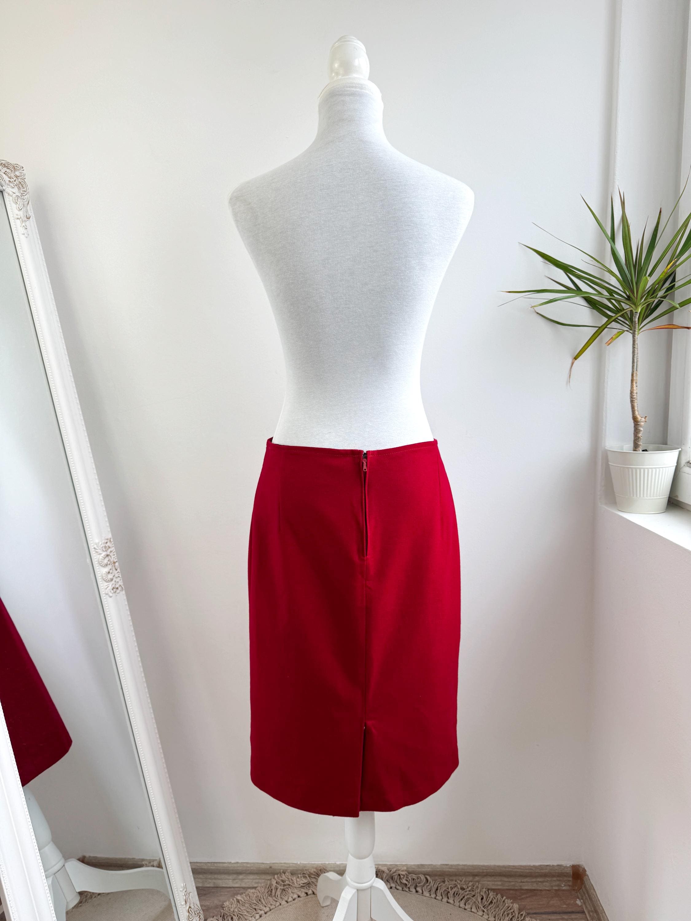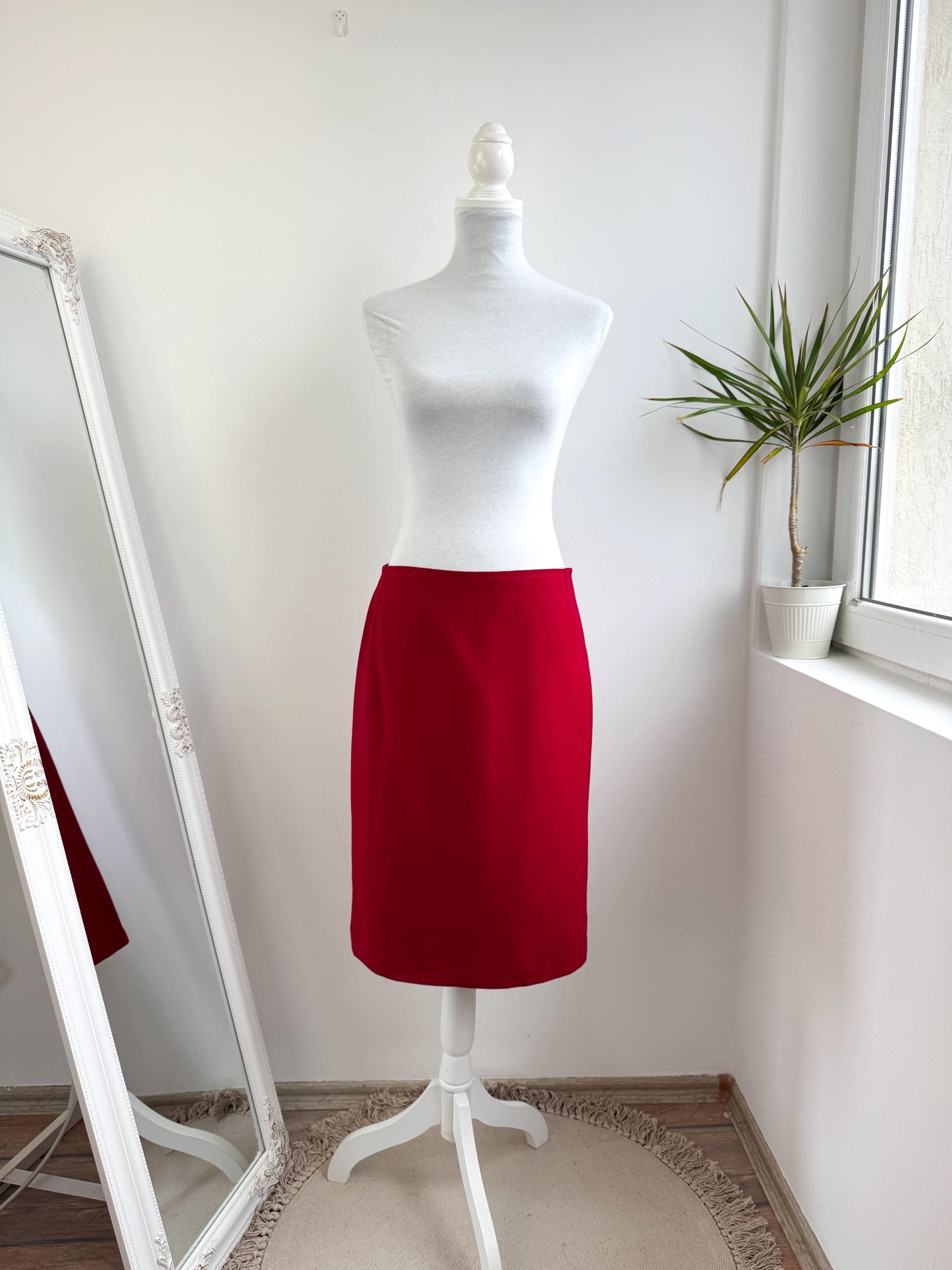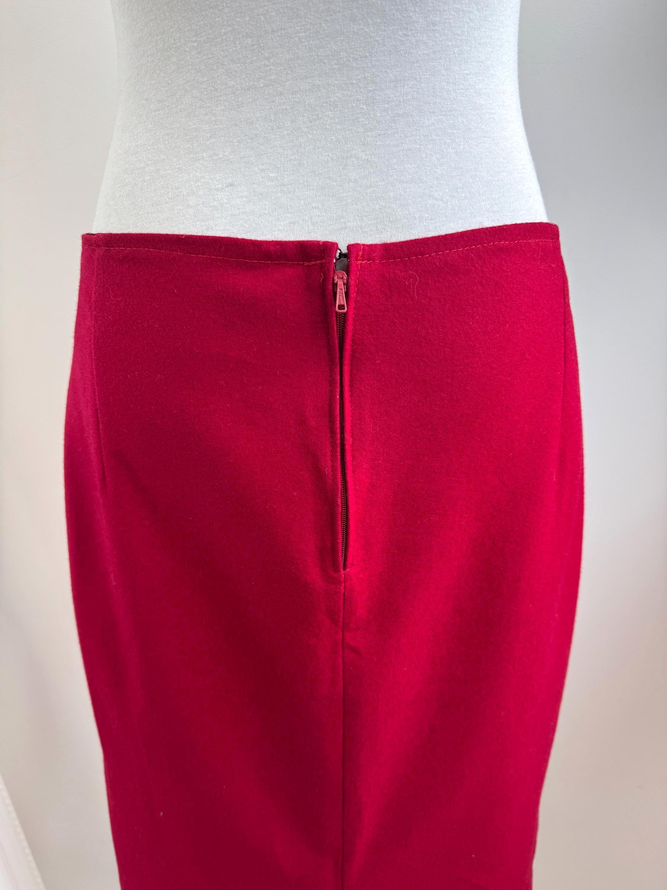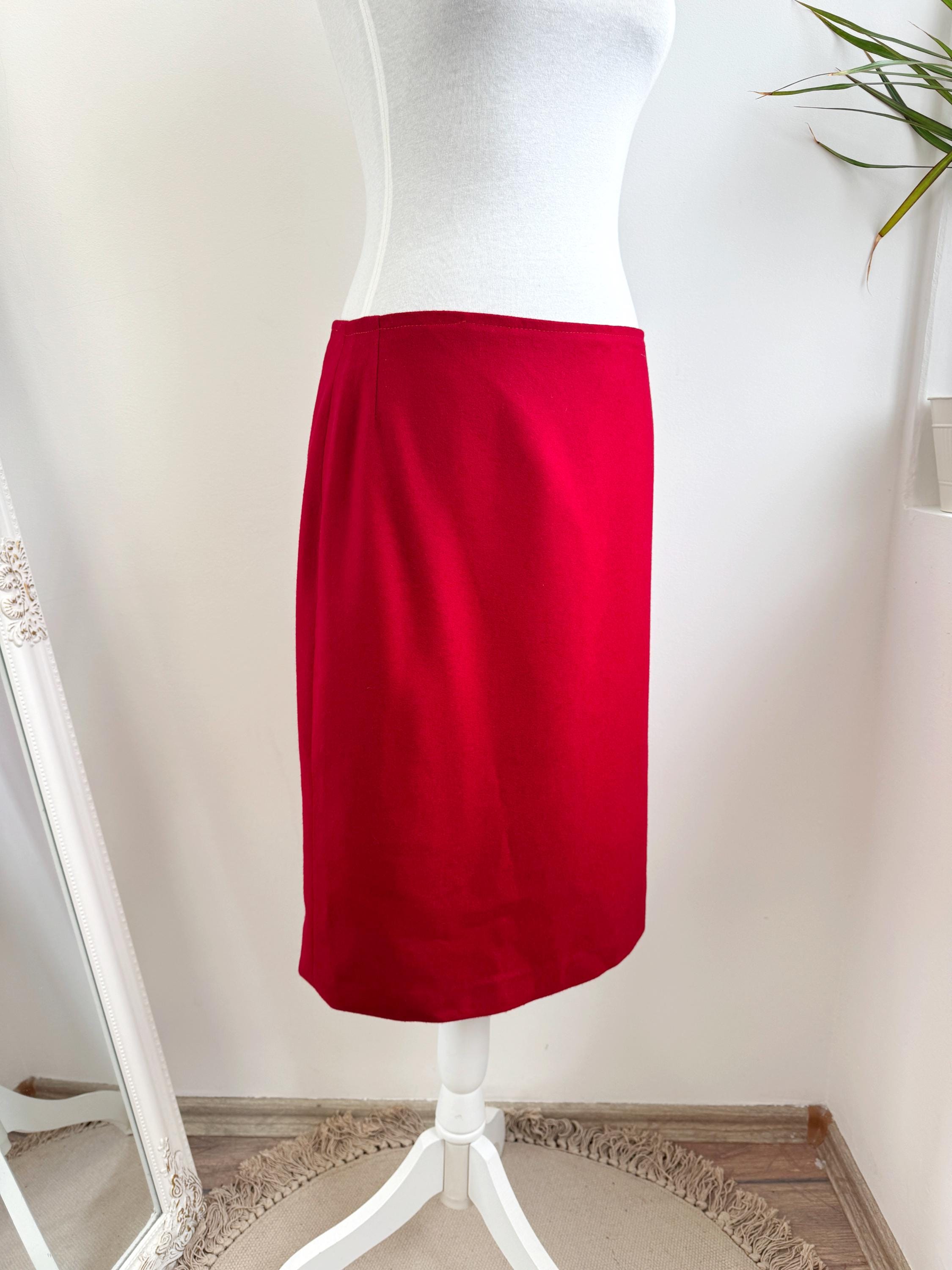 Elevate your wardrobe with this stunning vintage fine wool red pencil skirt in size M. Crafted with a clean, minimalist silhouette, this wool midi skirt features a mid waist, knee length fit that beautifully accentuates the figure. The vibrant cherry red hue is timeless, making it an easy match for crisp white shirts or cozy neutral knits. It features a sleek back zipper closure and a subtle kick pleat at the back for ease of movement and added sophistication. This red wool skirt is designed with front and back darts for a structured, tailored fit. The mid-weight fabric holds its shape perfectly, ensuring a polished look all day long.